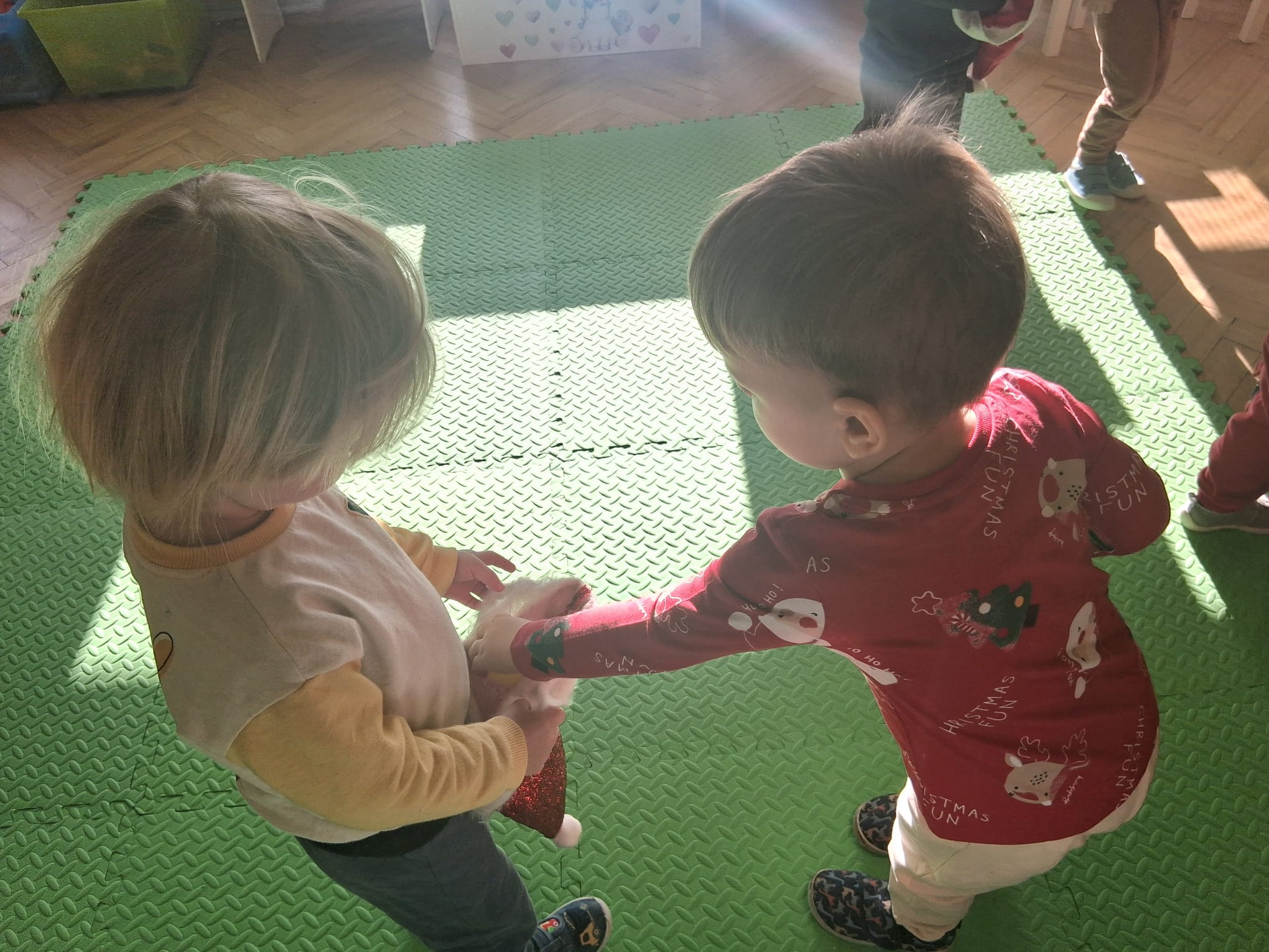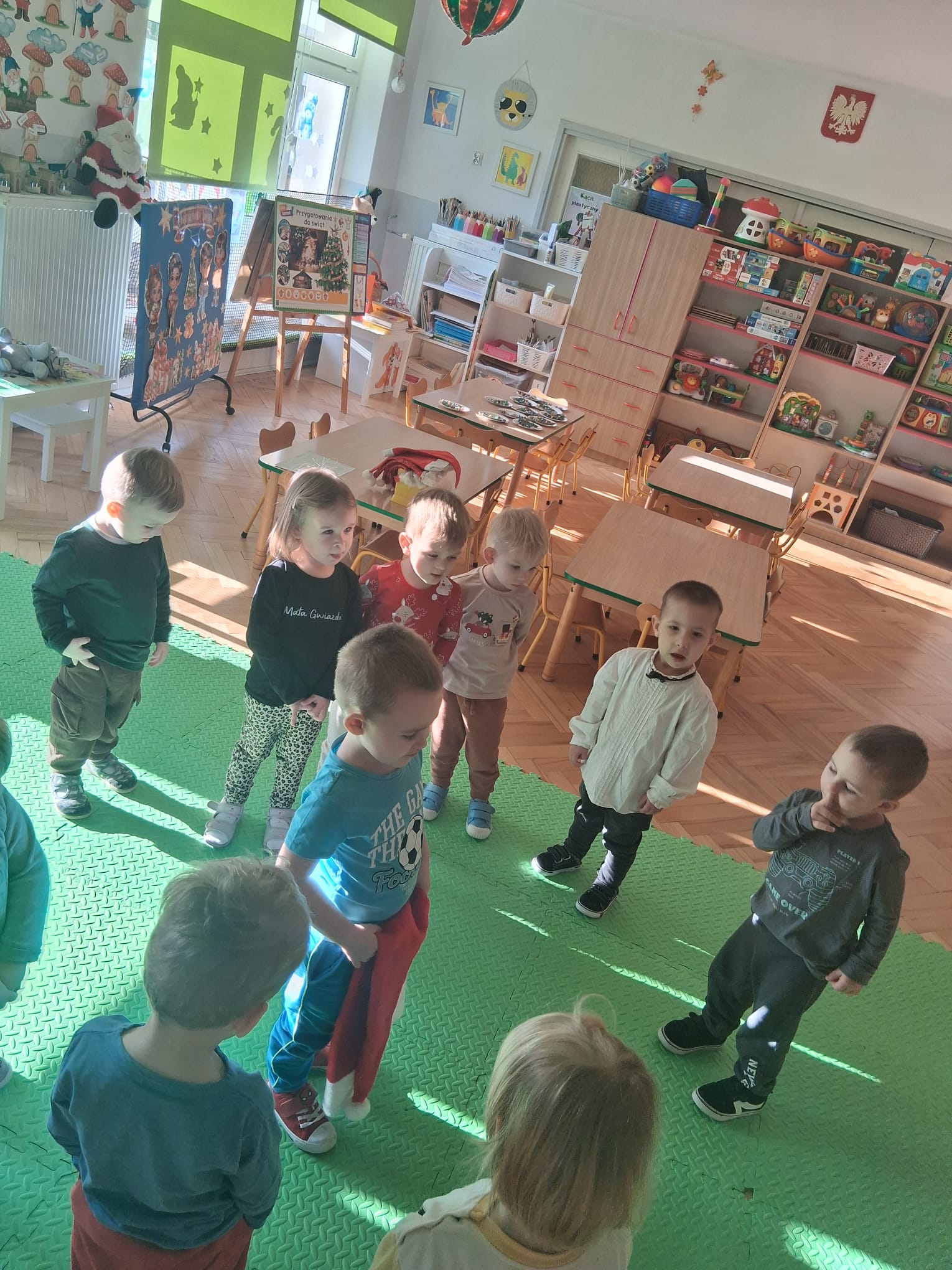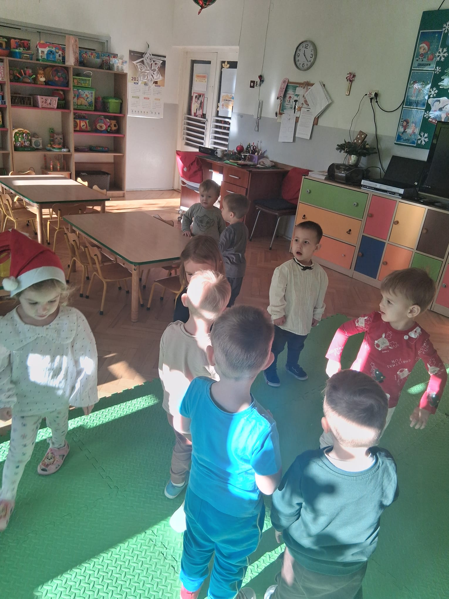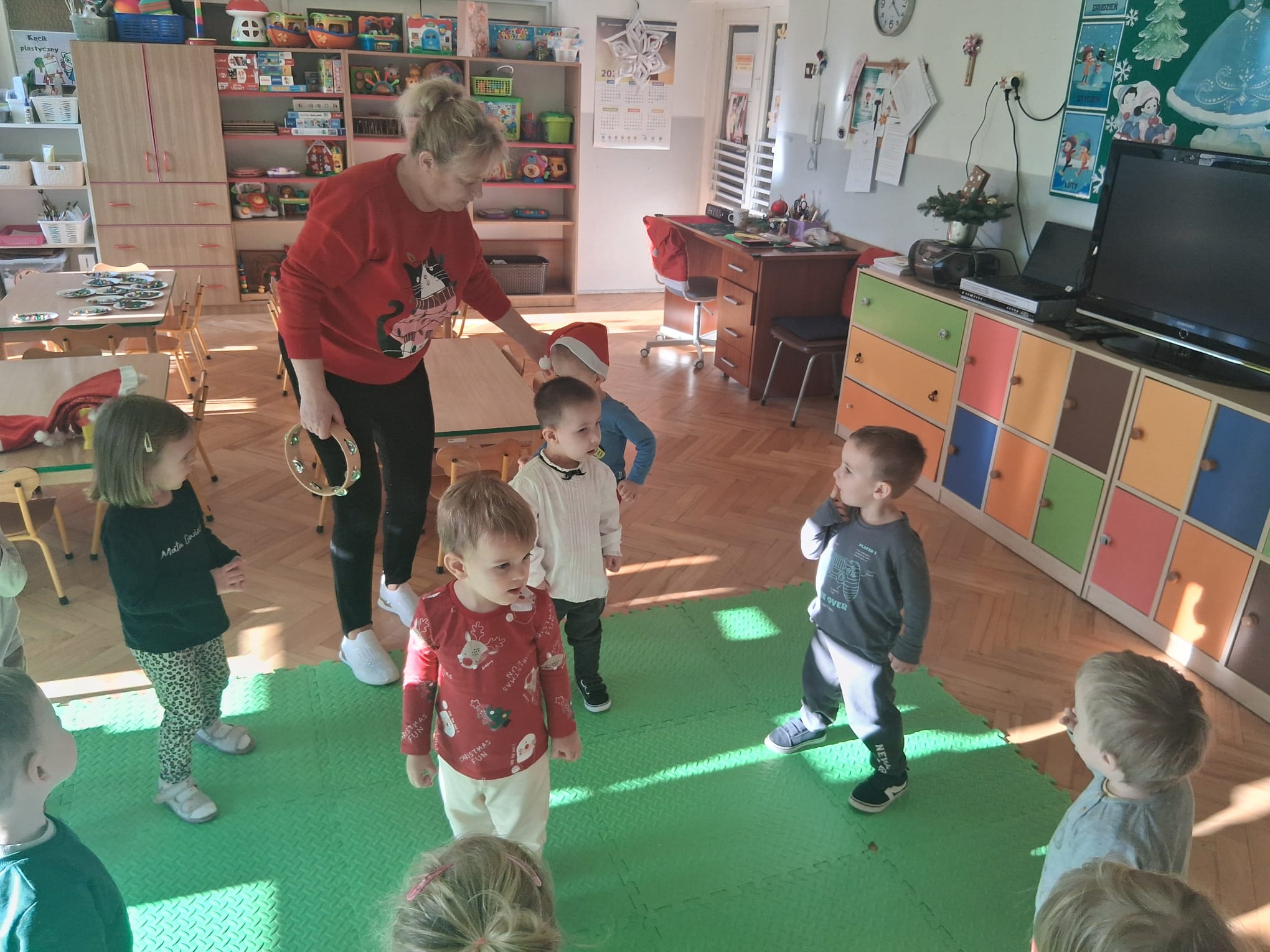 Krasnoludki zrealizowały kolejne zadania z Programu Edukacyjnego ,, W zdrowym ciele zdrowy duch, wie to każdy mały zuch''. W zabawach pomagały nam czapeczki mikołajowe.