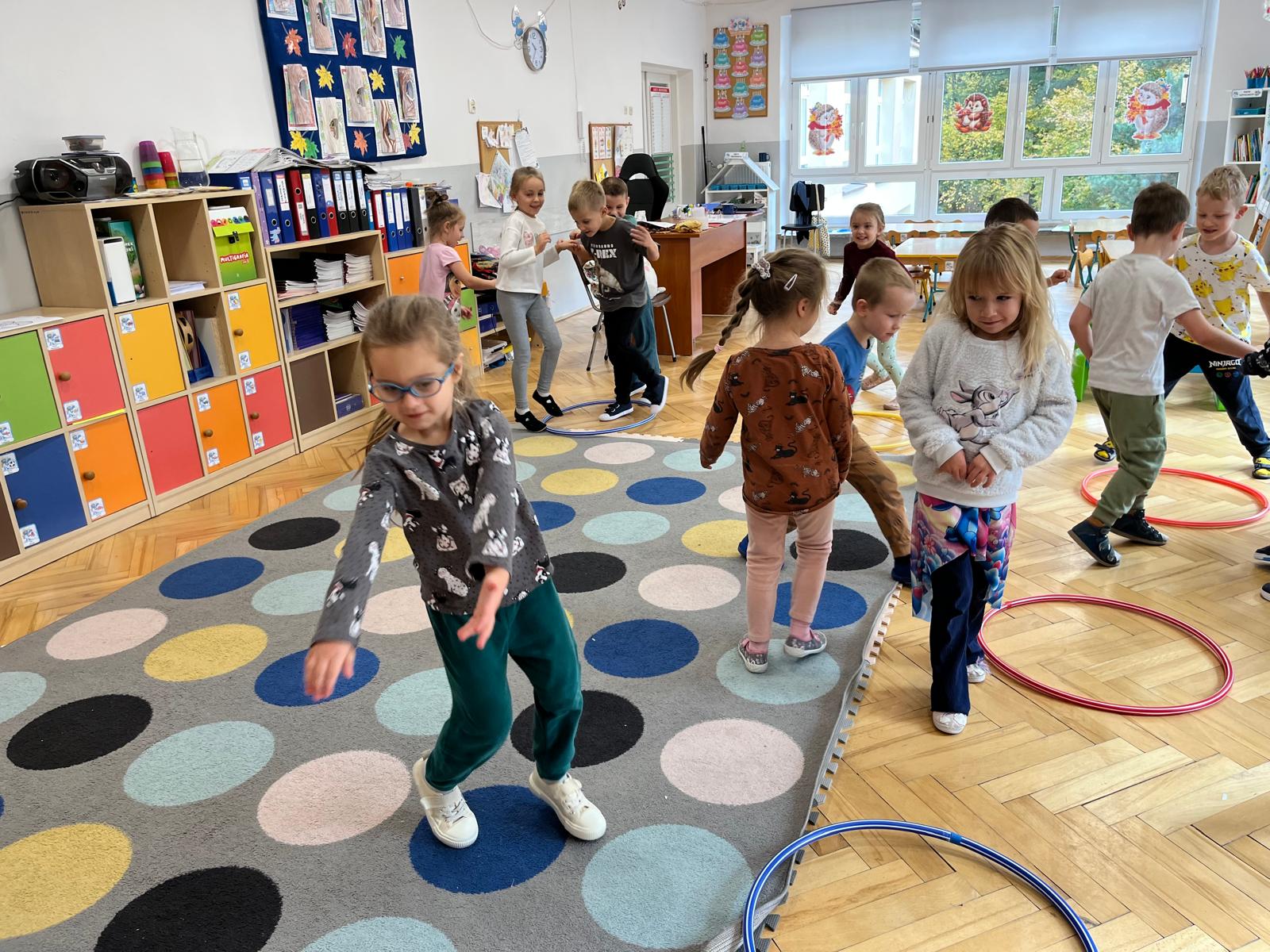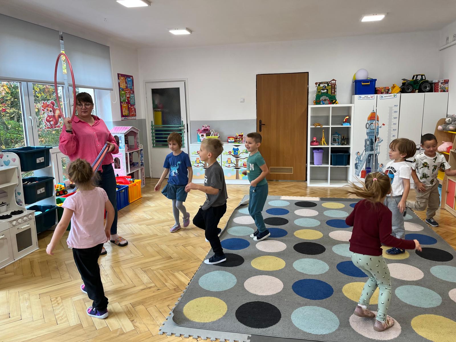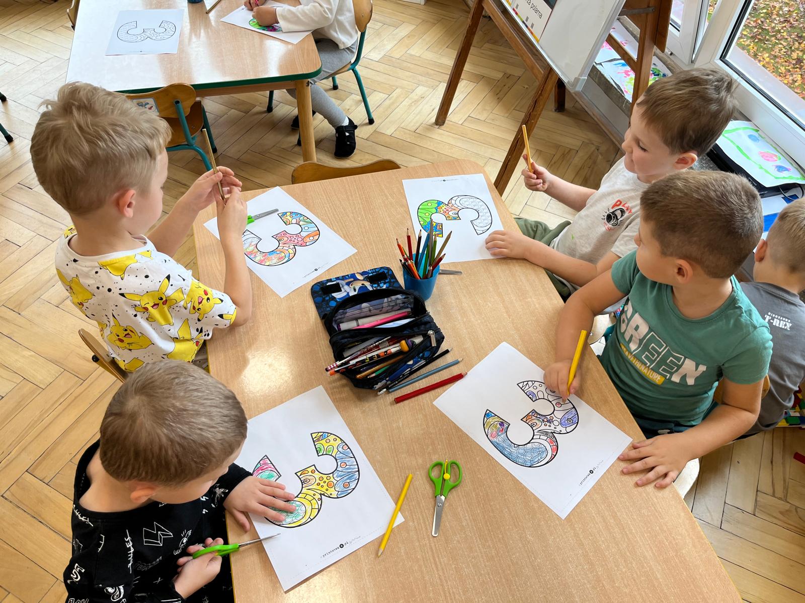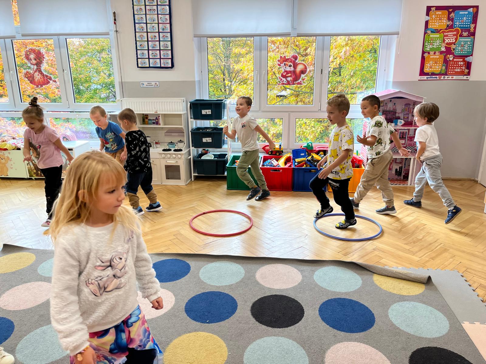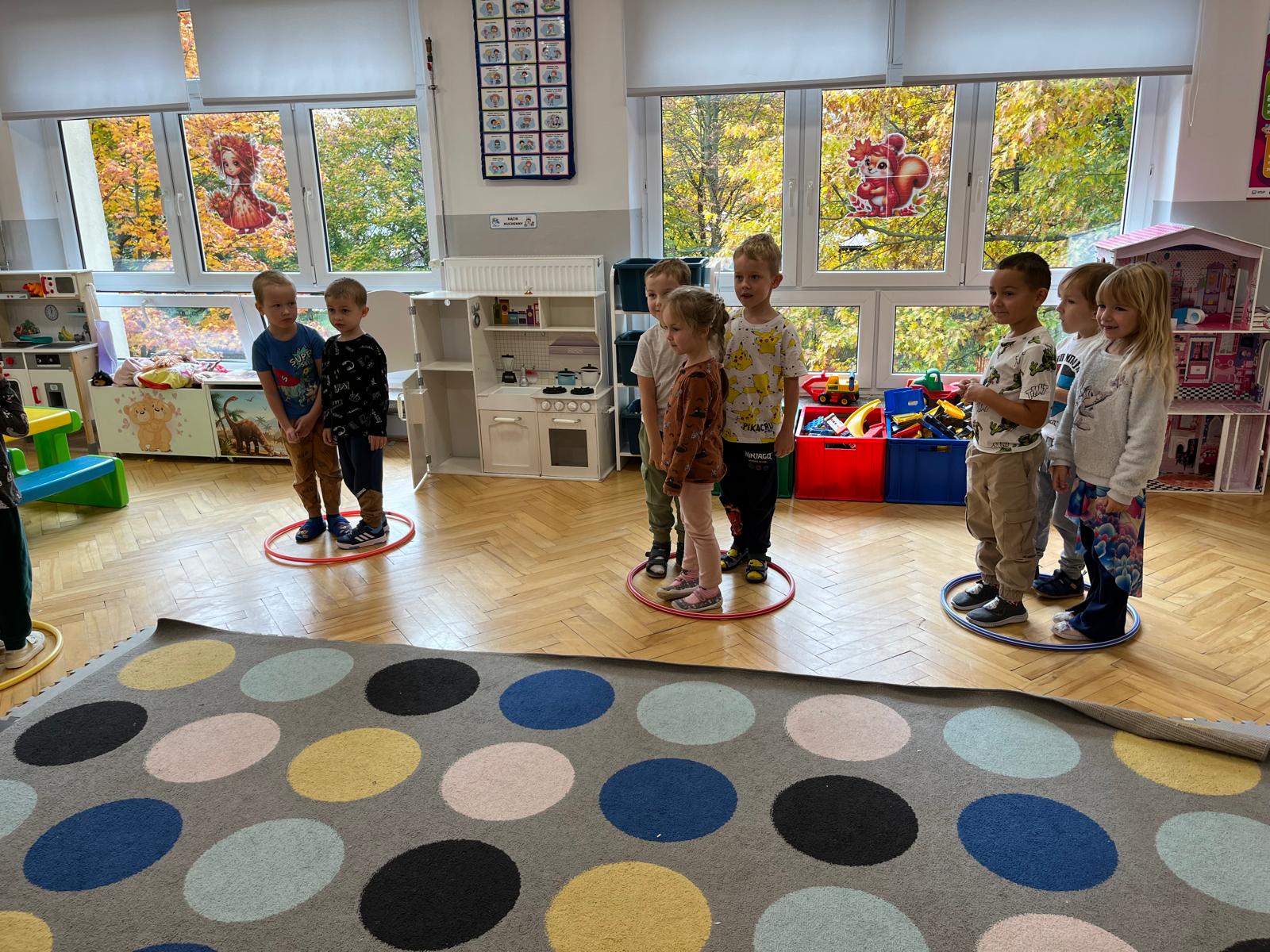 Poznaliśmy w tym tygodniu również cyferkę 3 - uczestnicząc w zabawach ruchowych, układając zabawki na dywanie po 3 sztuki, przeliczając je, dobieraliśmy się w trójki w zabawie z wykorzystaniem hula hop.