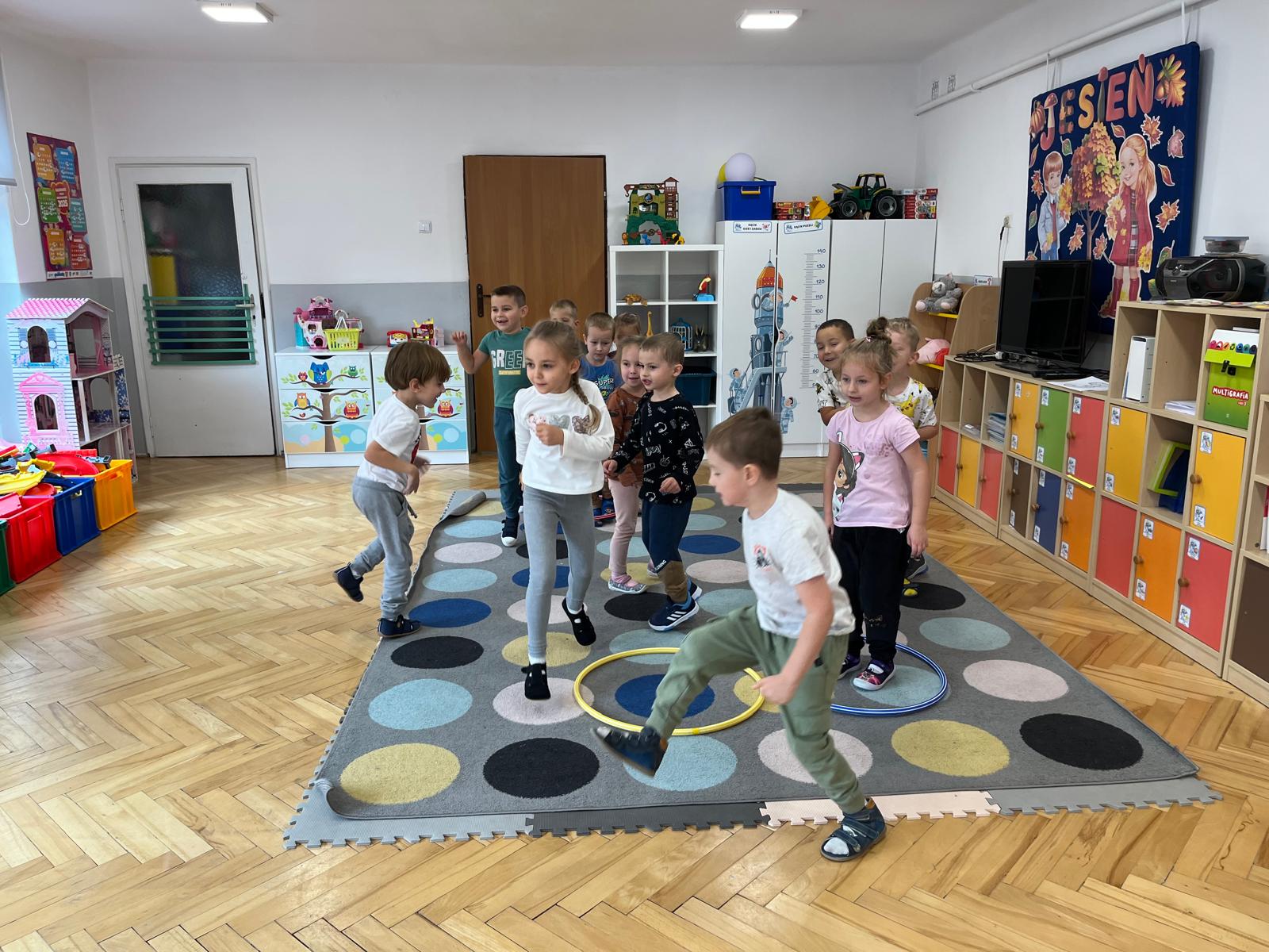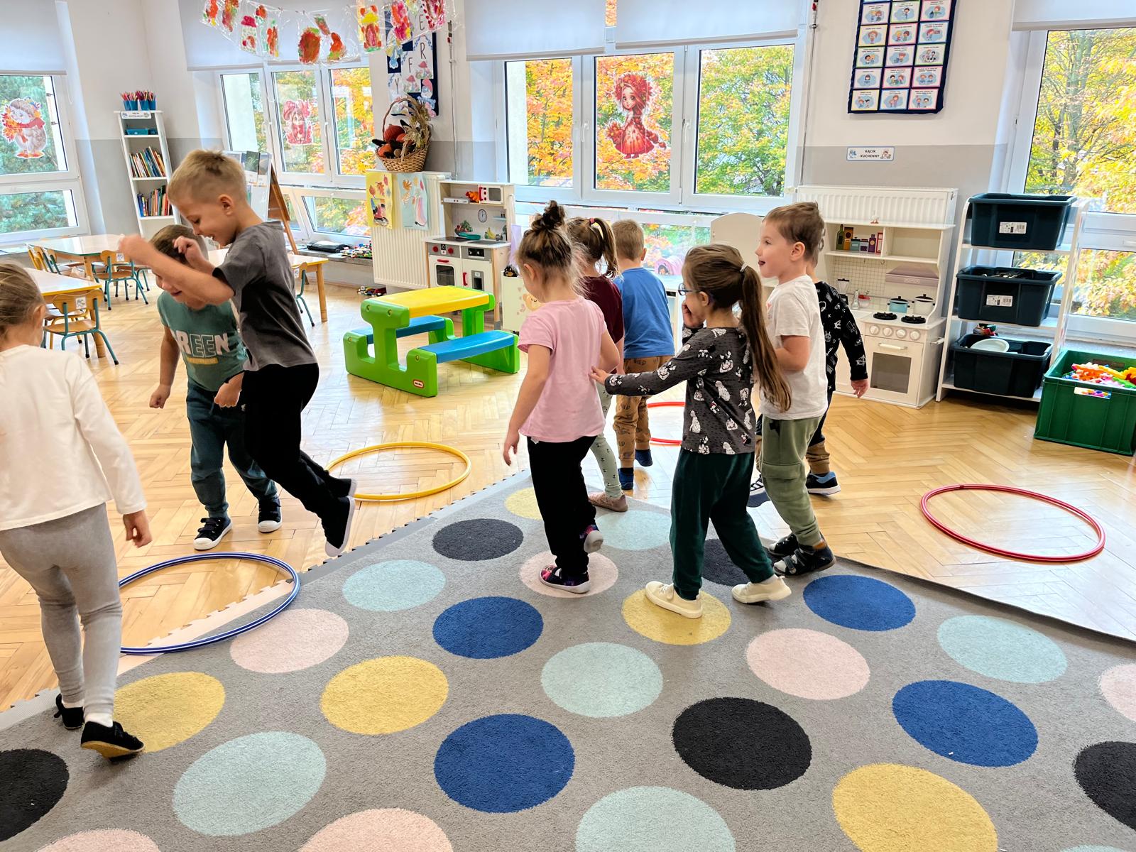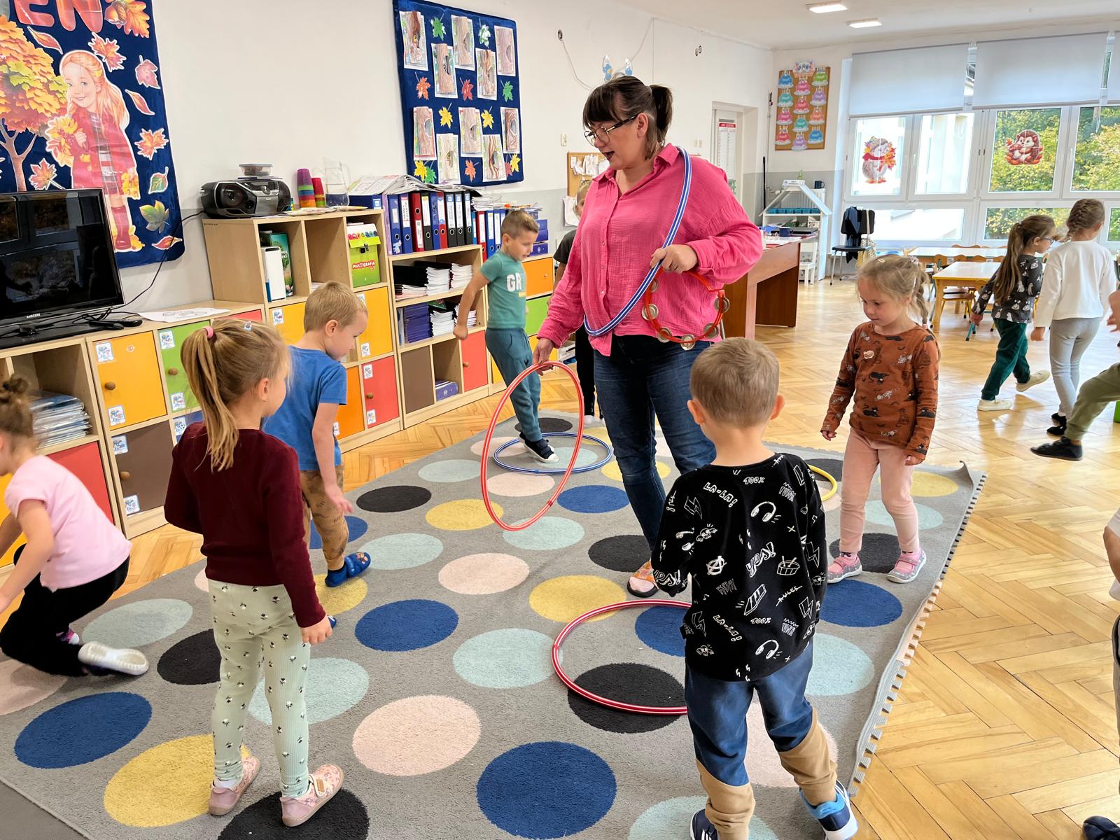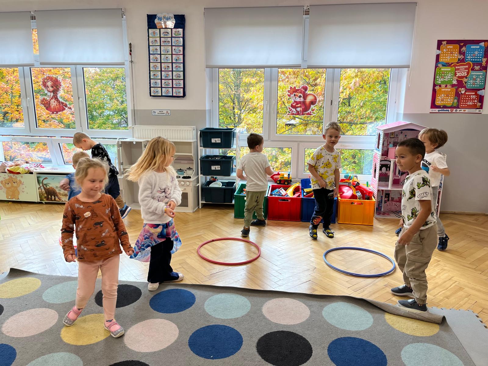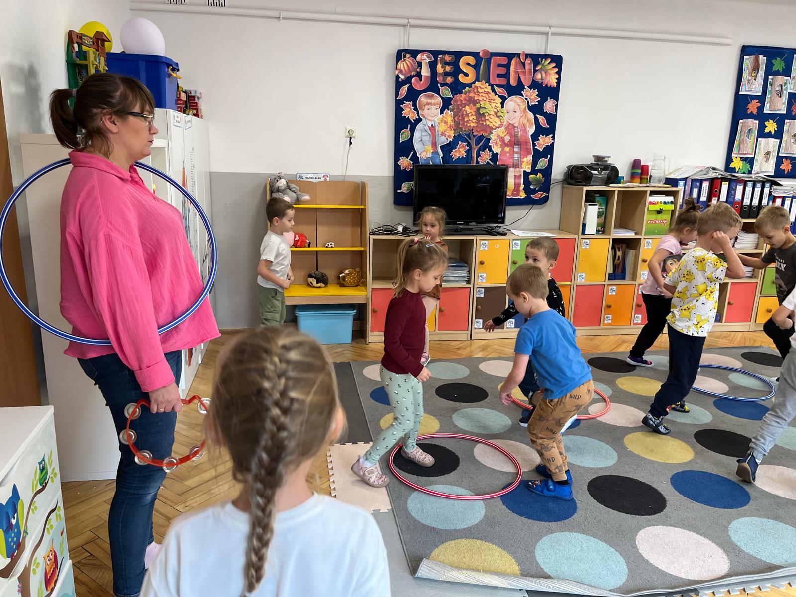 Poznaliśmy w tym tygodniu również cyferkę 3 - uczestnicząc w zabawach ruchowych, układając zabawki na dywanie po 3 sztuki, przeliczając je, dobieraliśmy się w trójki w zabawie z wykorzystaniem hula hop.