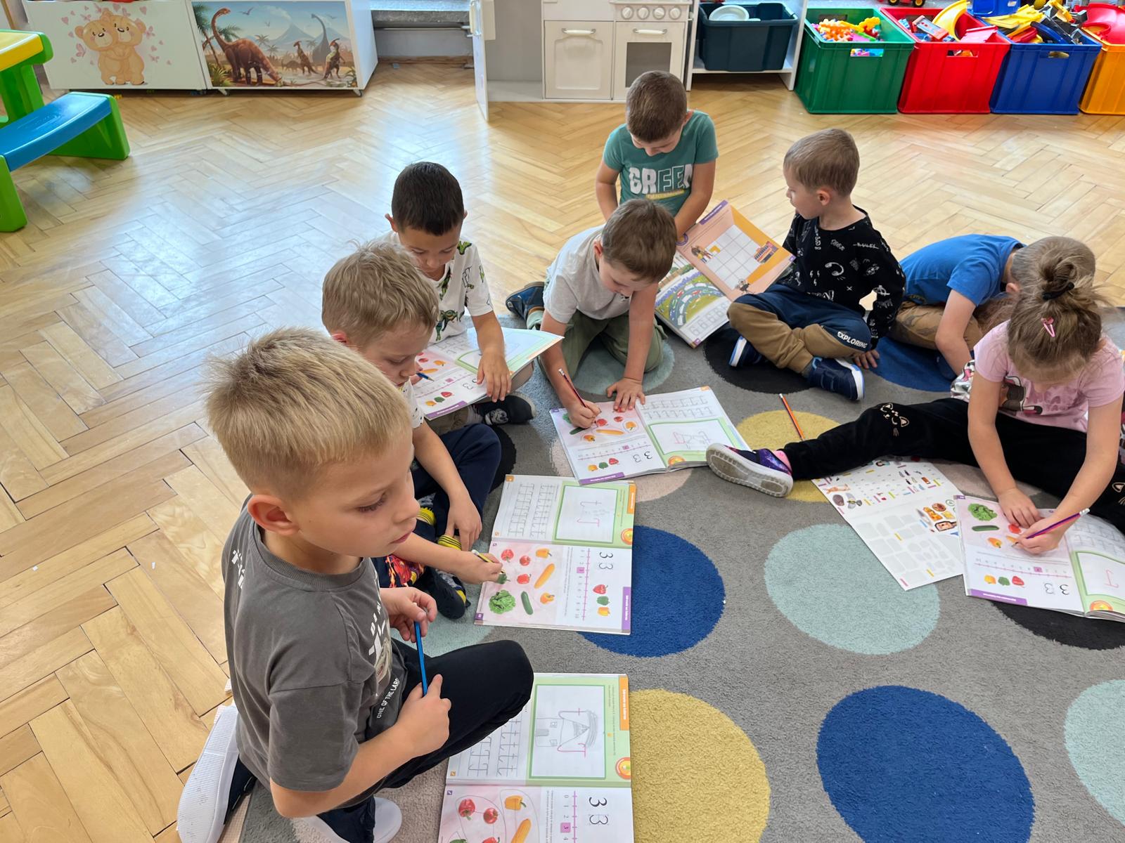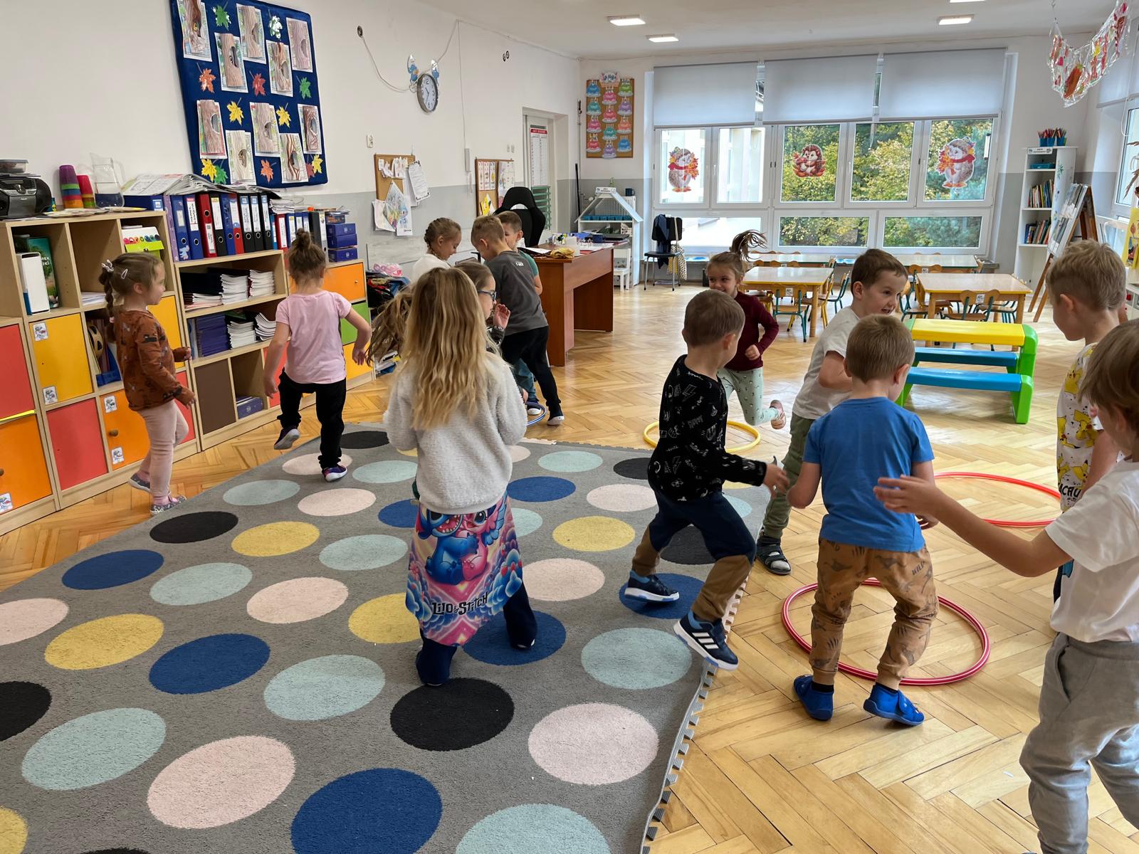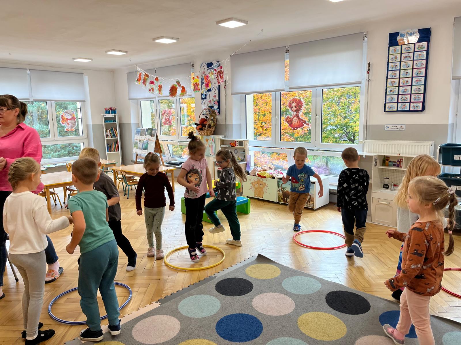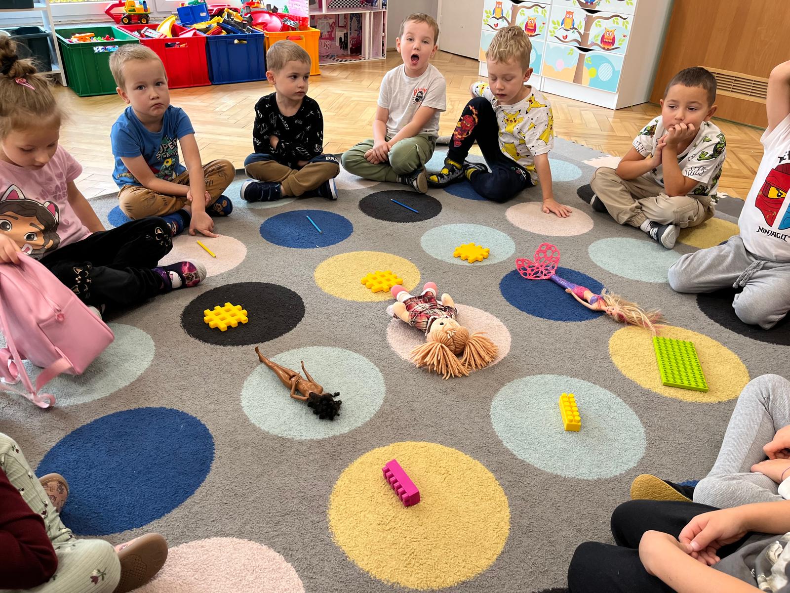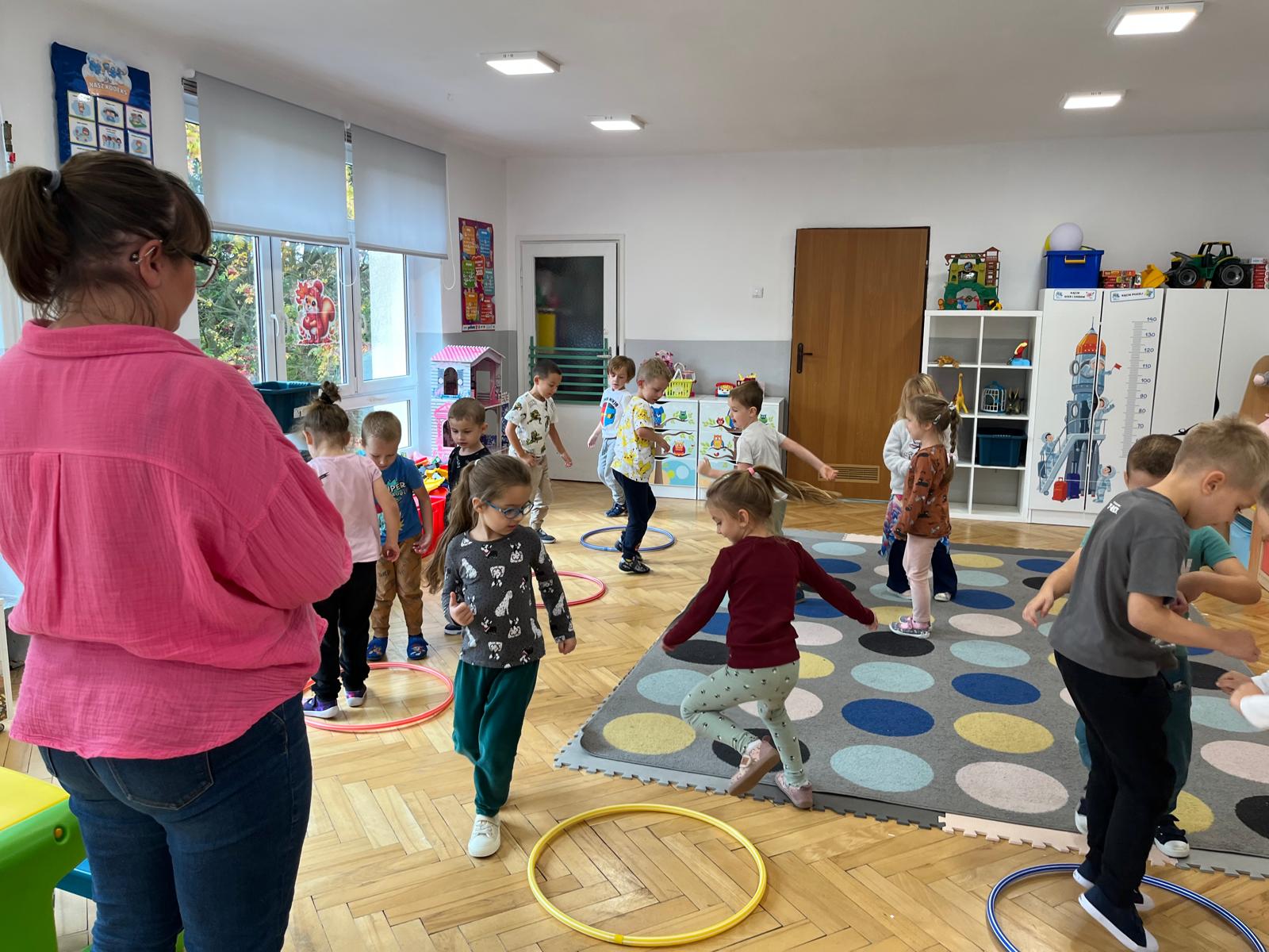 Poznaliśmy w tym tygodniu również cyferkę 3 - uczestnicząc w zabawach ruchowych, układając zabawki na dywanie po 3 sztuki, przeliczając je, dobieraliśmy się w trójki w zabawie z wykorzystaniem hula hop.