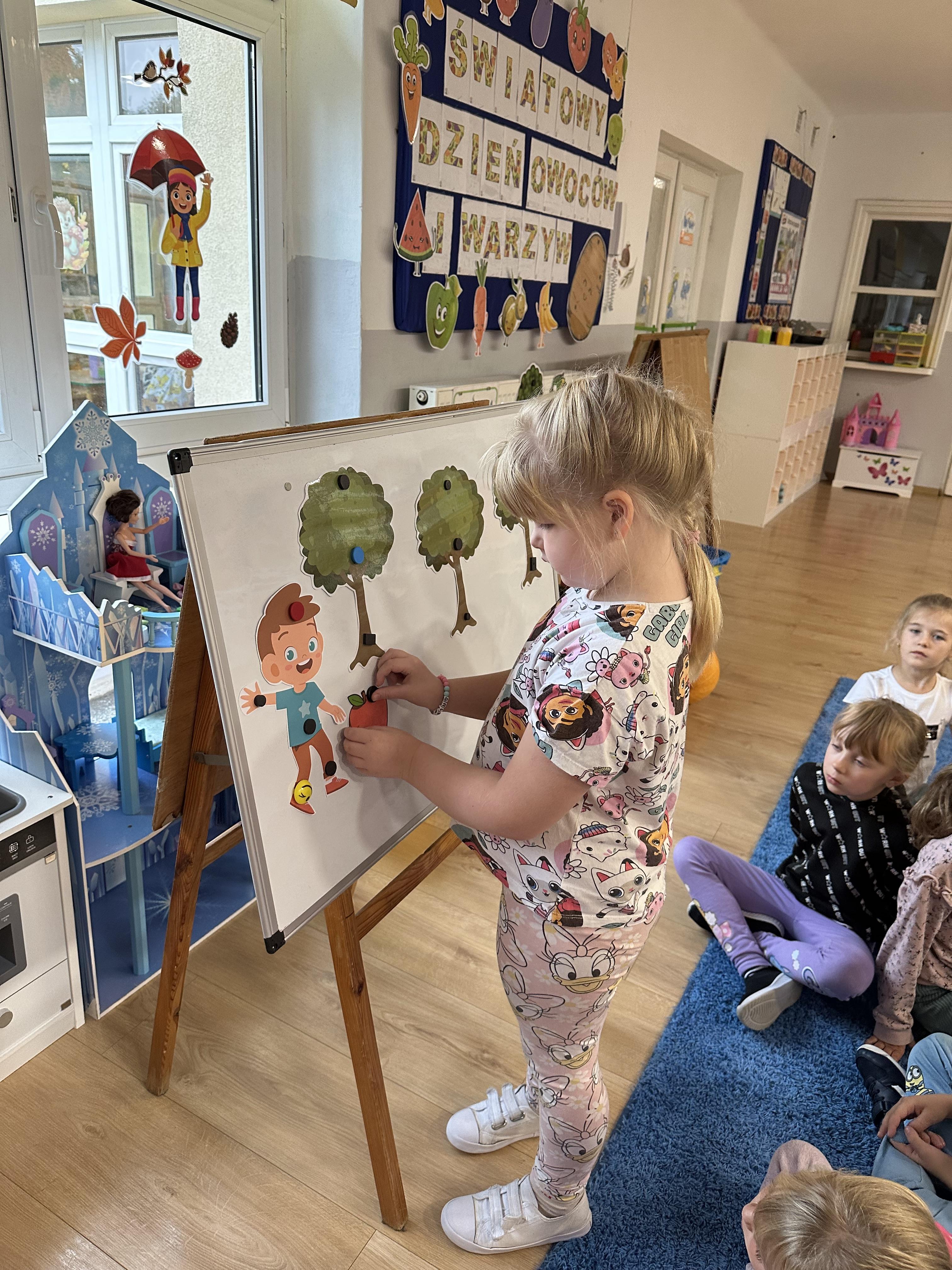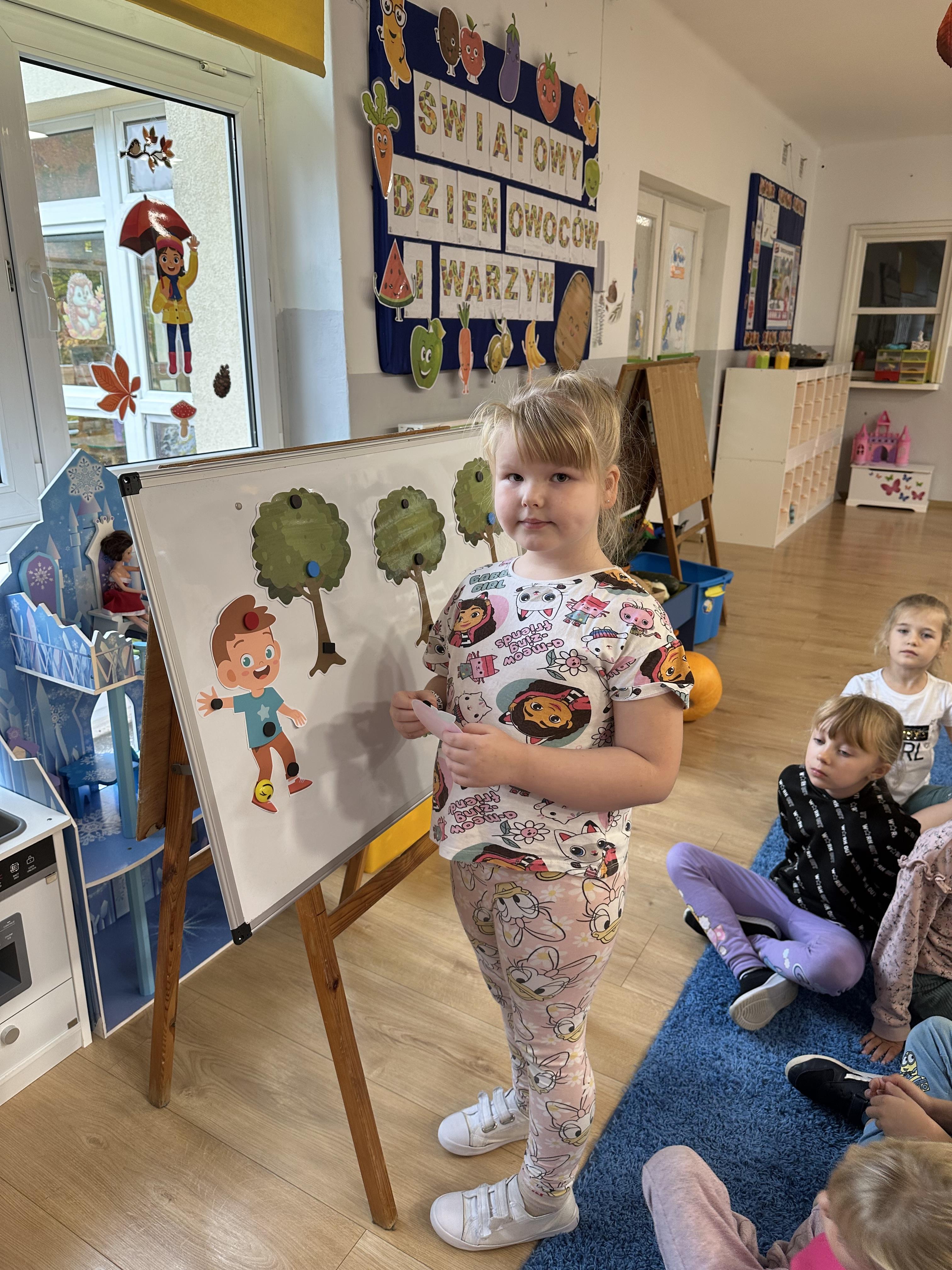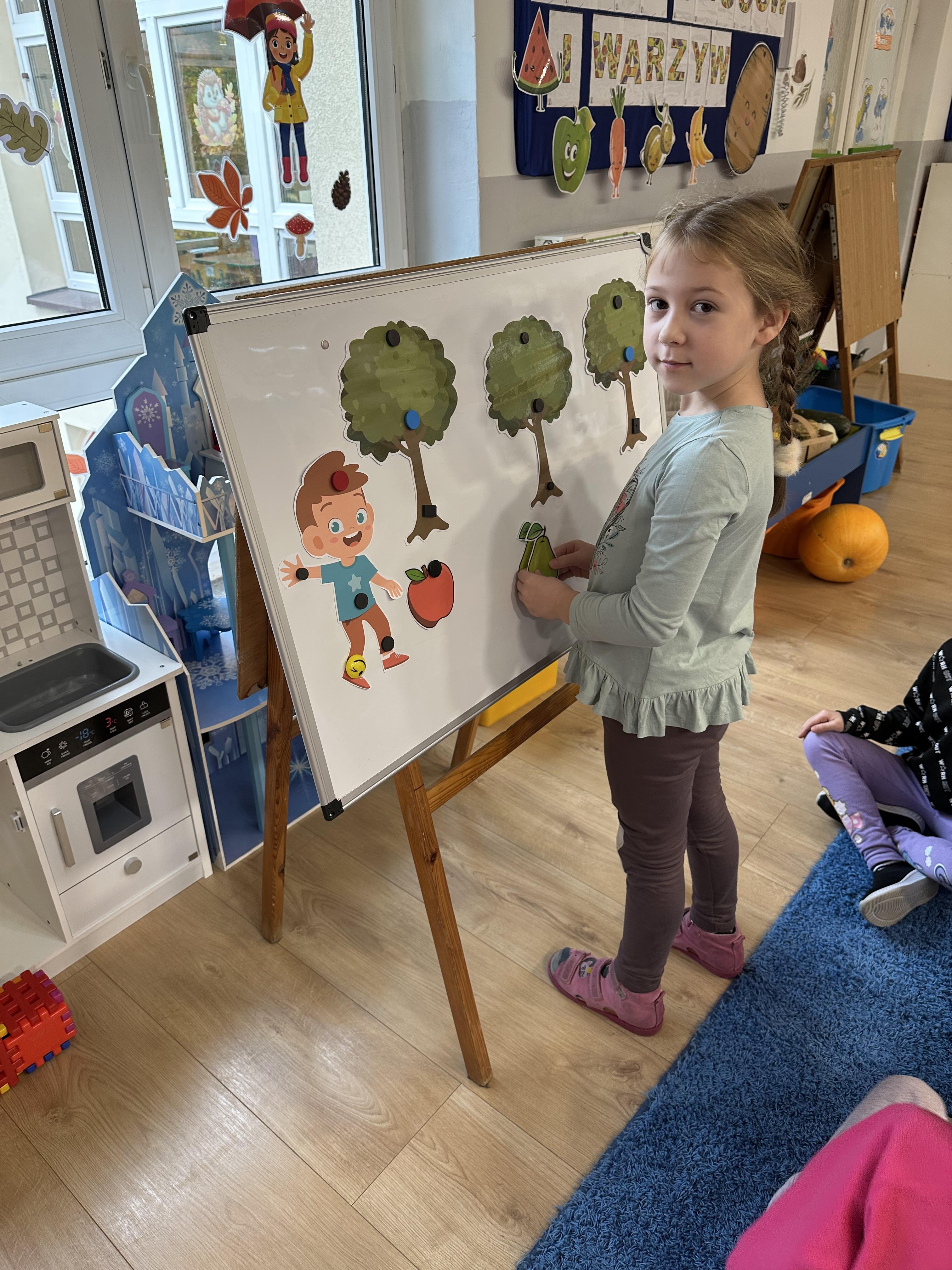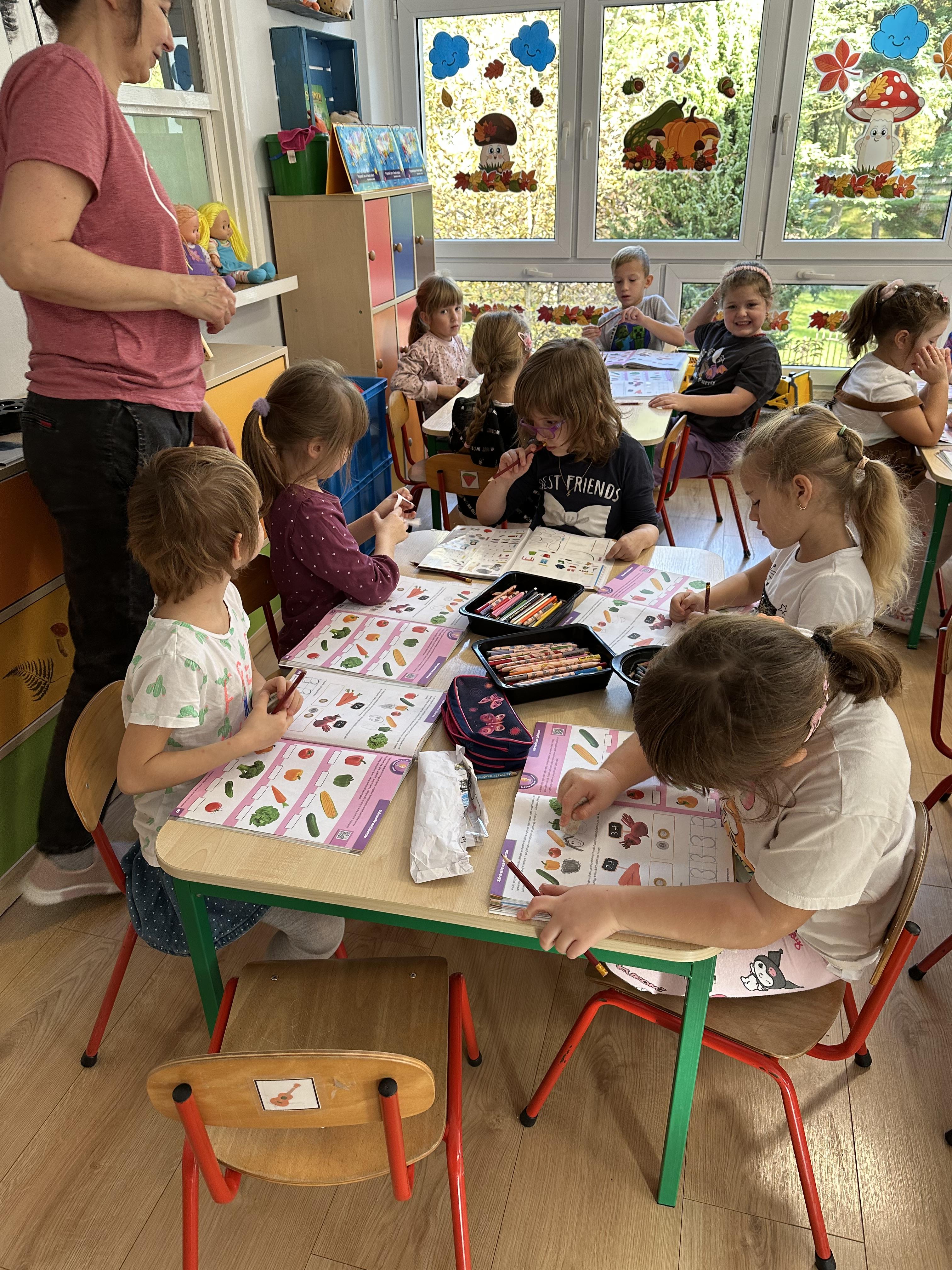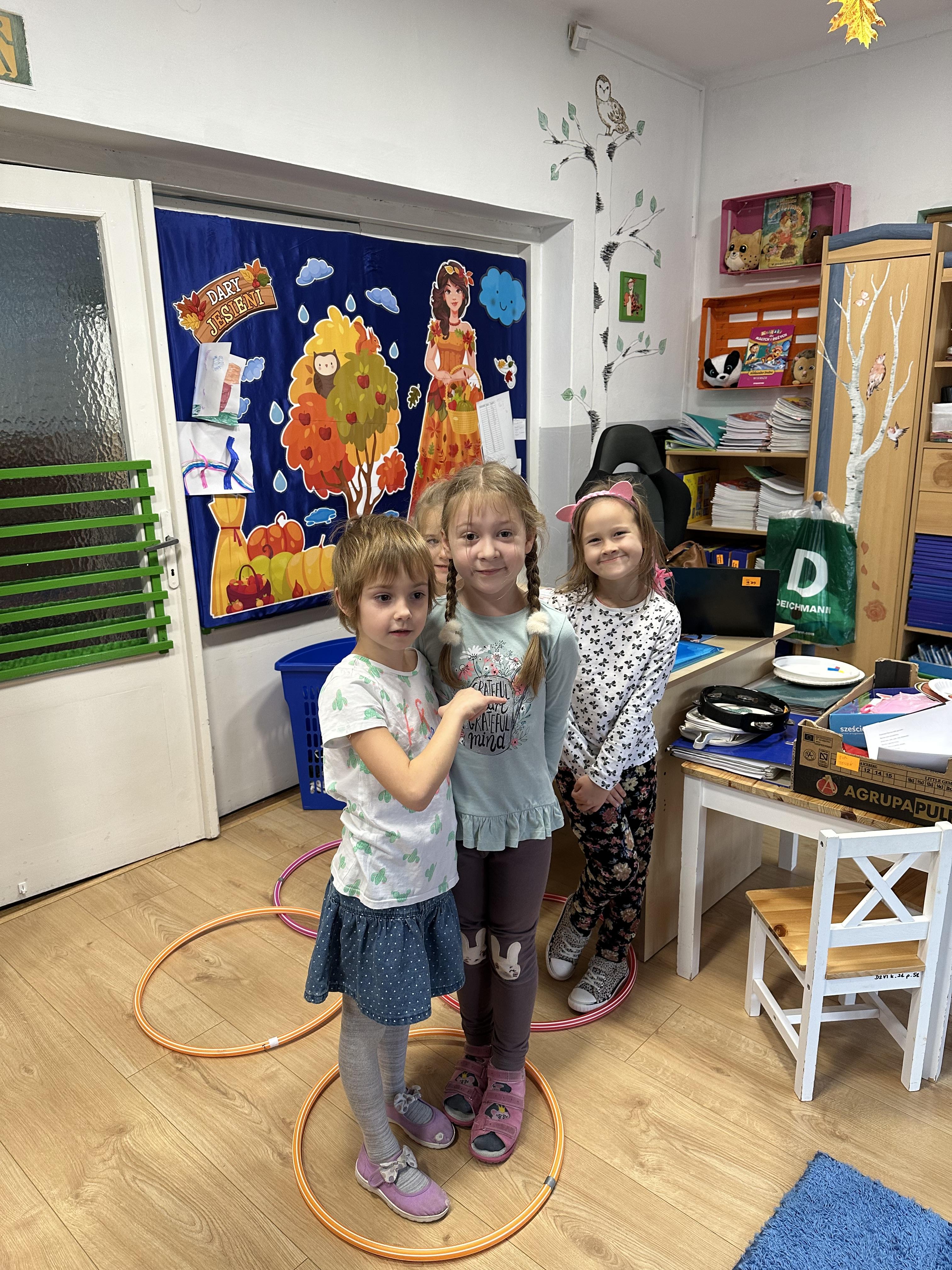 Poniedziałek był poświęcony kształtowaniu umiejętności wyrażania emocji oraz rozpoznawania uczucia smutku. Podczas porannej gimnastyki dzieci kształtowały sprawność fizyczną, wykonywały ćwiczenia rozciągające i wzmacniające mięśnie nóg. Opowiadanie Marii Pawlisz ,,Jesienne choroby” było punktem wyjścia do rozmowy o chorobach i samopoczuciu, które im towarzyszy. Dzieci dzieliły się swoimi doświadczeniami i sposobami na poprawę nastroju podczas przeziębienia. W trakcie zabawy „Lekarstwo na smutki” jedno z dzieci udawało smutne, pozostałe miały za zadanie je pocieszyć i rozweselić. Podczas zabawy dydaktycznej „W czasie choroby” inspirowanej opowiadaniem dzieci wspólnie zastanawiały się, jakie mogą być ,,lekarstwa” na smutki. Uczyły się uzasadniania swoich wyborów. Następnie poruszały się po sali do muzyki według wskazówek nauczyciela. Brały również udział w ćwiczeniach gimnastycznych, rozwijały szybkość i kształtowały mięśnie tułowia, wykonując skłony. Podczas zabawy „Tak się czuję, gdy…” uczyły się rozmawiać otwarcie o emocjach i o sytuacjach, które je powodują. We wtorek z samego rana ćwiczyły motorykę narządów mowy i wysłuchały piosenki ,,Smaczniejsze niż słodycze”. Następnie zastanawiały się nad przesłaniem utworu. Dzieci wspólnie doszły do wniosku, że warzywa i owoce są zdrowsze dla organizmu. Nauczyły się słów refrenu piosenki na pamięć. W kolejnej części dnia zapoznały się z wielką i małą literą T, t. Dzieliły słowo ,,tata” na sylaby i rytmicznie uderzały w instrument, przeliczając liczbę sylab. Podczas zabaw wymieniały dowolne słowa rozpoczynające się głoską t. Układały schemat słowa ,,tata” z kartoników i rysowały t palcem po dywanie, w powietrzu. Przy stolikach utrwalały znajomość poznanych liter, wykonując ćwiczenia. Po południu ozdobiły szablon litery T według własnego pomysłu. W środę dzieci poznały, czym są ceny i co oznacza słowo ,,cenny”. Po wysłuchaniu wiersza Barbary Lewandowskiej przedszkolaki sprawdzały umiejętność metaforycznego rozumienia sformułowań. Podczas zabawy ,,owoce jesieni” dzieci utrwalały znajomość darów jesieni i odróżniały owoce od warzyw. W czasie zabaw: „Ile warzyw dobrać?”, „Na straganie” i ,,Paski papryki” zapoznały się z liczbą 3 w aspekcie kardynalnym, porządkowym i miarowym. Nauczyły się zapisu graficznego 3 i dzieliły się spostrzeżeniami, jakie przedmioty przypominają im tę liczbę. Zakończyły dzień zabawami rozwijającymi pamięć i koncentrację oraz zabawą ruchową, integrującą grupę. W czwartek dzieci poznawały, jak wyglądają poszczególne warzywa po przekrojeniu ich na pół. Wiersz Elżbiety Śnieżowskiej-Bielak stanowił punkt wyjścia do rozmowy o grzankach i potrawach z warzyw i owoców, które jedzą dzieci. W dalszej części dnia przedszkolaki brały udział w zabawach rozwijających poczucie sprawstwa, kształtujących pamięć słuchową oraz ćwiczeniach językowych.