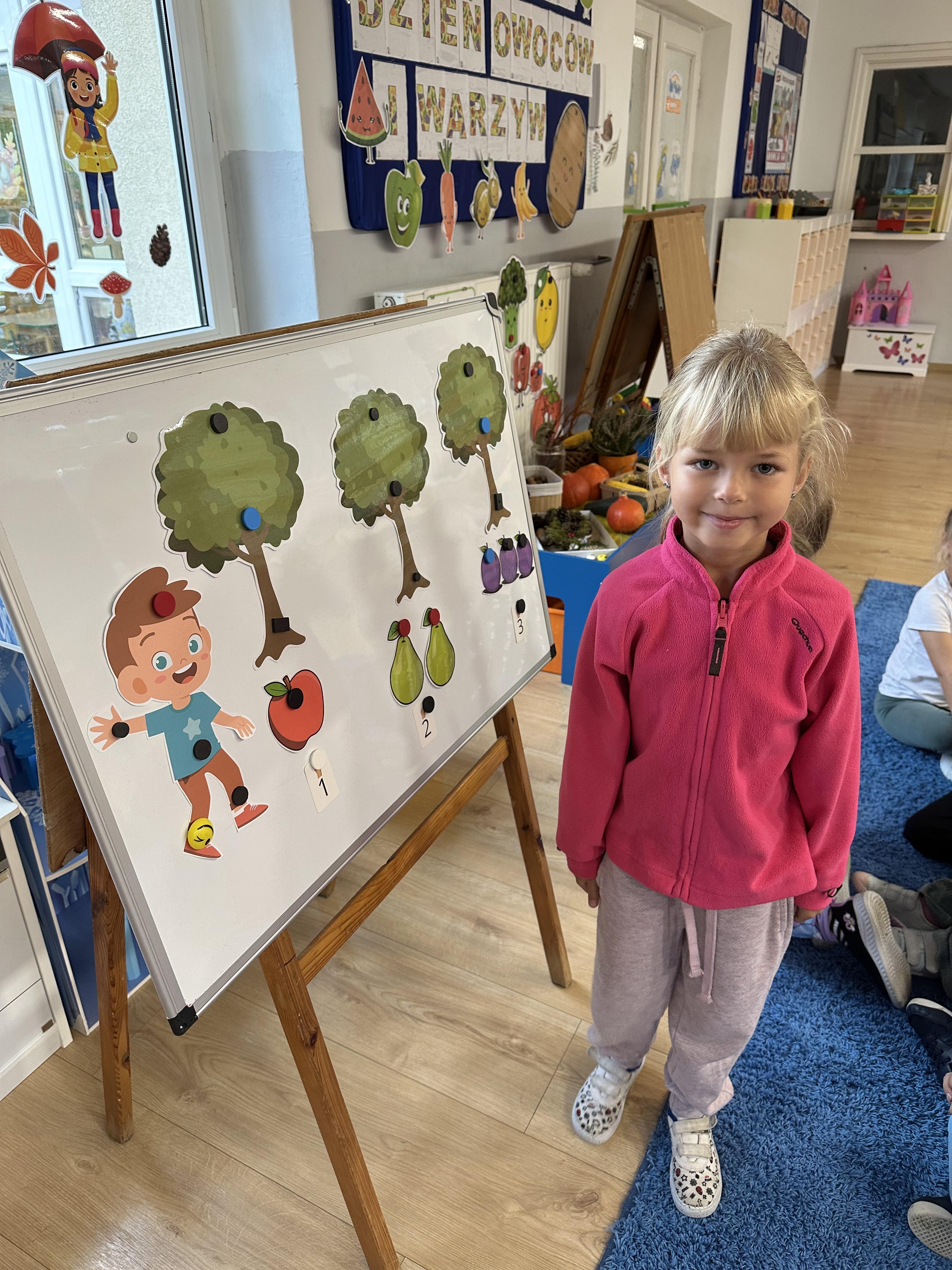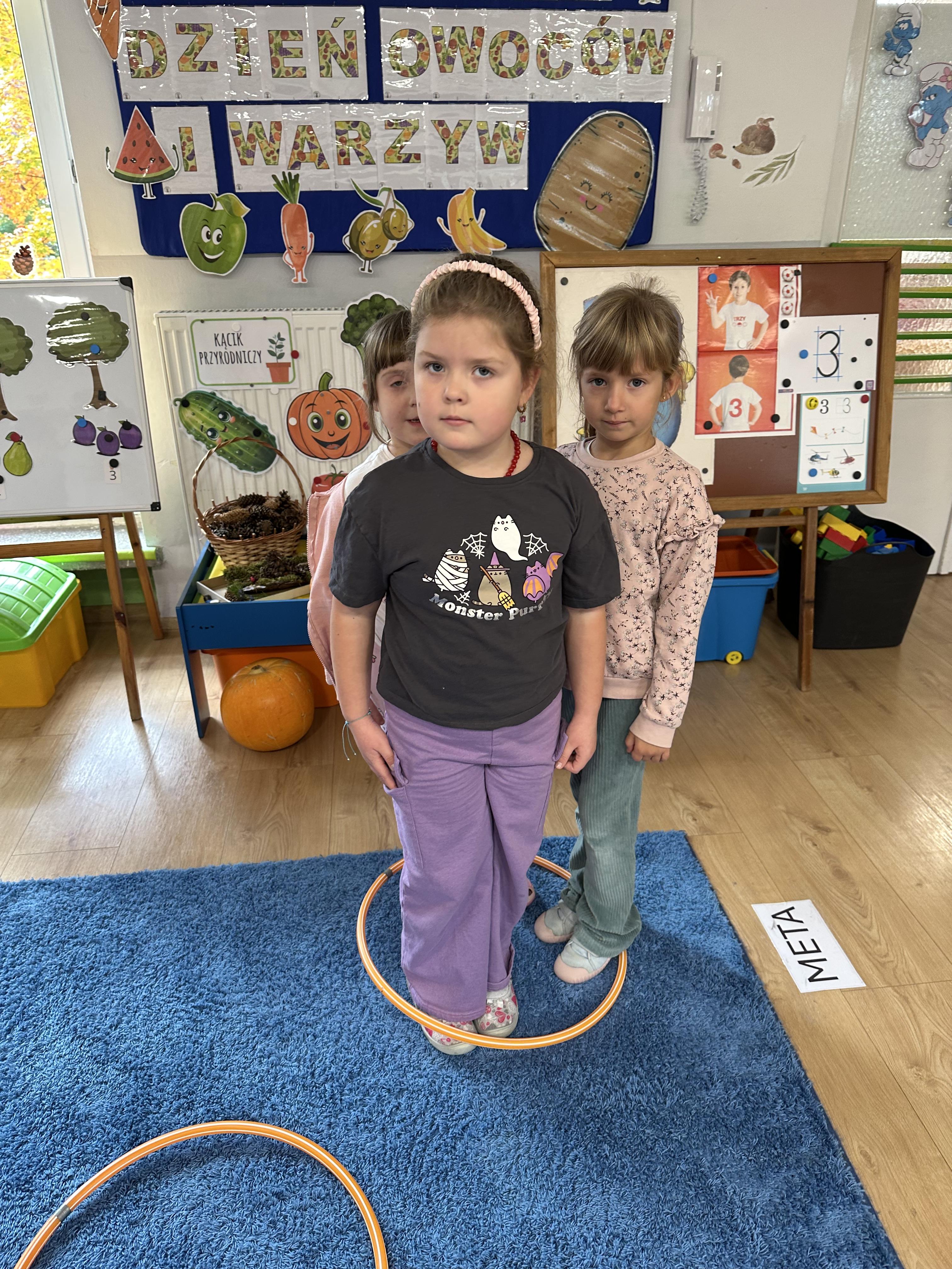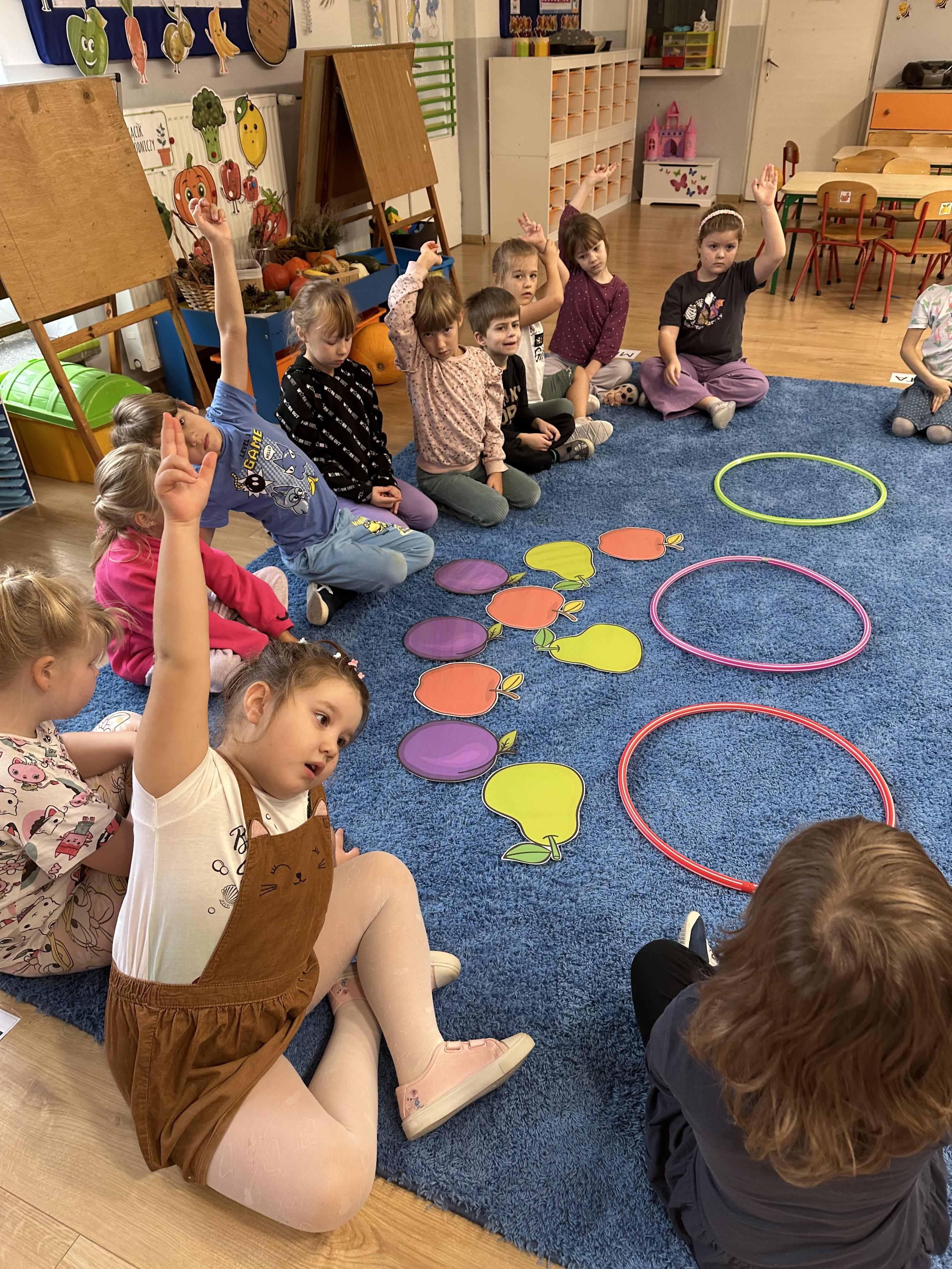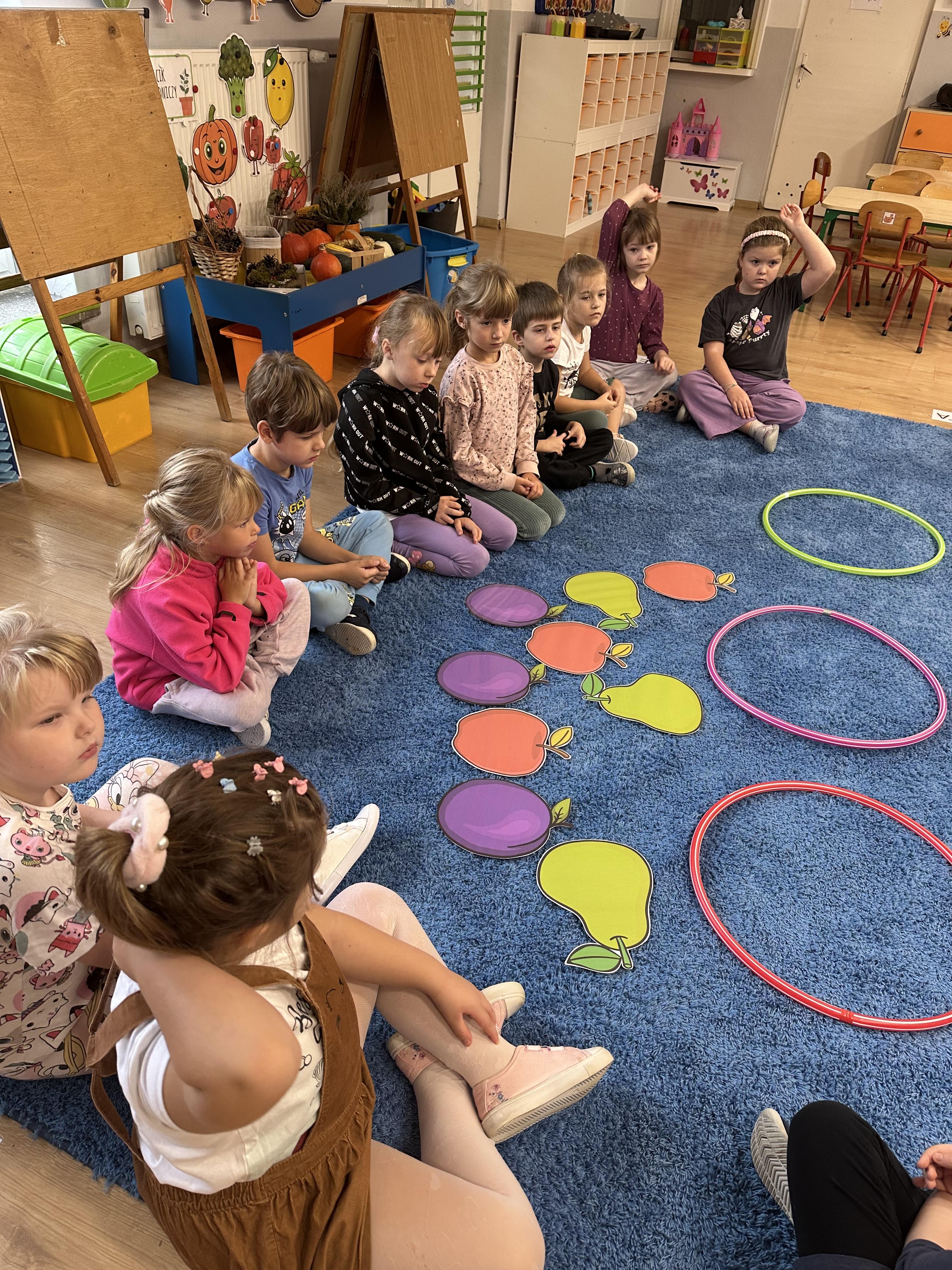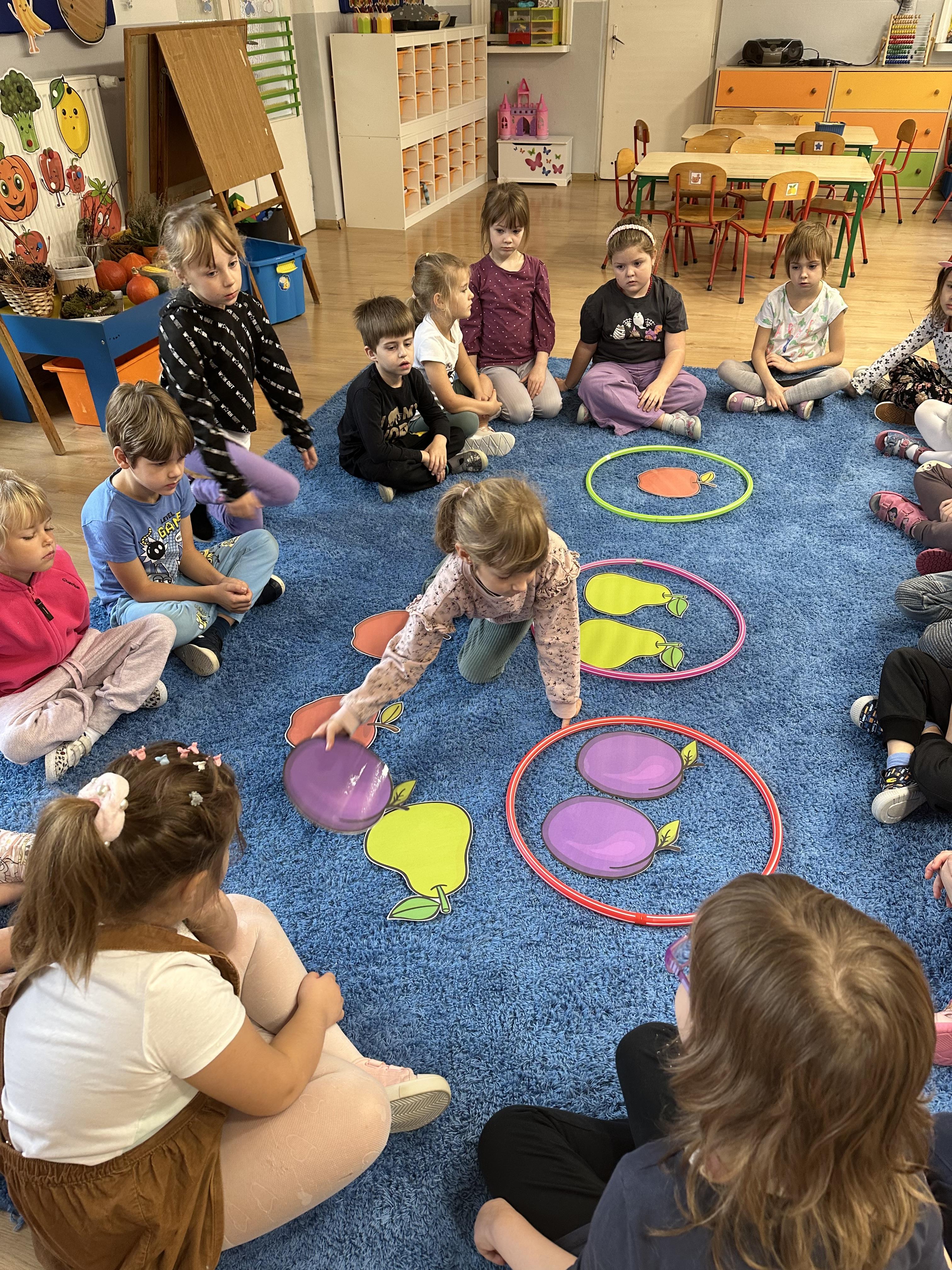 Poniedziałek był poświęcony kształtowaniu umiejętności wyrażania emocji oraz rozpoznawania uczucia smutku. Podczas porannej gimnastyki dzieci kształtowały sprawność fizyczną, wykonywały ćwiczenia rozciągające i wzmacniające mięśnie nóg. Opowiadanie Marii Pawlisz ,,Jesienne choroby” było punktem wyjścia do rozmowy o chorobach i samopoczuciu, które im towarzyszy. Dzieci dzieliły się swoimi doświadczeniami i sposobami na poprawę nastroju podczas przeziębienia. W trakcie zabawy „Lekarstwo na smutki” jedno z dzieci udawało smutne, pozostałe miały za zadanie je pocieszyć i rozweselić. Podczas zabawy dydaktycznej „W czasie choroby” inspirowanej opowiadaniem dzieci wspólnie zastanawiały się, jakie mogą być ,,lekarstwa” na smutki. Uczyły się uzasadniania swoich wyborów. Następnie poruszały się po sali do muzyki według wskazówek nauczyciela. Brały również udział w ćwiczeniach gimnastycznych, rozwijały szybkość i kształtowały mięśnie tułowia, wykonując skłony. Podczas zabawy „Tak się czuję, gdy…” uczyły się rozmawiać otwarcie o emocjach i o sytuacjach, które je powodują. We wtorek z samego rana ćwiczyły motorykę narządów mowy i wysłuchały piosenki ,,Smaczniejsze niż słodycze”. Następnie zastanawiały się nad przesłaniem utworu. Dzieci wspólnie doszły do wniosku, że warzywa i owoce są zdrowsze dla organizmu. Nauczyły się słów refrenu piosenki na pamięć. W kolejnej części dnia zapoznały się z wielką i małą literą T, t. Dzieliły słowo ,,tata” na sylaby i rytmicznie uderzały w instrument, przeliczając liczbę sylab. Podczas zabaw wymieniały dowolne słowa rozpoczynające się głoską t. Układały schemat słowa ,,tata” z kartoników i rysowały t palcem po dywanie, w powietrzu. Przy stolikach utrwalały znajomość poznanych liter, wykonując ćwiczenia. Po południu ozdobiły szablon litery T według własnego pomysłu. W środę dzieci poznały, czym są ceny i co oznacza słowo ,,cenny”. Po wysłuchaniu wiersza Barbary Lewandowskiej przedszkolaki sprawdzały umiejętność metaforycznego rozumienia sformułowań. Podczas zabawy ,,owoce jesieni” dzieci utrwalały znajomość darów jesieni i odróżniały owoce od warzyw. W czasie zabaw: „Ile warzyw dobrać?”, „Na straganie” i ,,Paski papryki” zapoznały się z liczbą 3 w aspekcie kardynalnym, porządkowym i miarowym. Nauczyły się zapisu graficznego 3 i dzieliły się spostrzeżeniami, jakie przedmioty przypominają im tę liczbę. Zakończyły dzień zabawami rozwijającymi pamięć i koncentrację oraz zabawą ruchową, integrującą grupę. W czwartek dzieci poznawały, jak wyglądają poszczególne warzywa po przekrojeniu ich na pół. Wiersz Elżbiety Śnieżowskiej-Bielak stanowił punkt wyjścia do rozmowy o grzankach i potrawach z warzyw i owoców, które jedzą dzieci. W dalszej części dnia przedszkolaki brały udział w zabawach rozwijających poczucie sprawstwa, kształtujących pamięć słuchową oraz ćwiczeniach językowych.