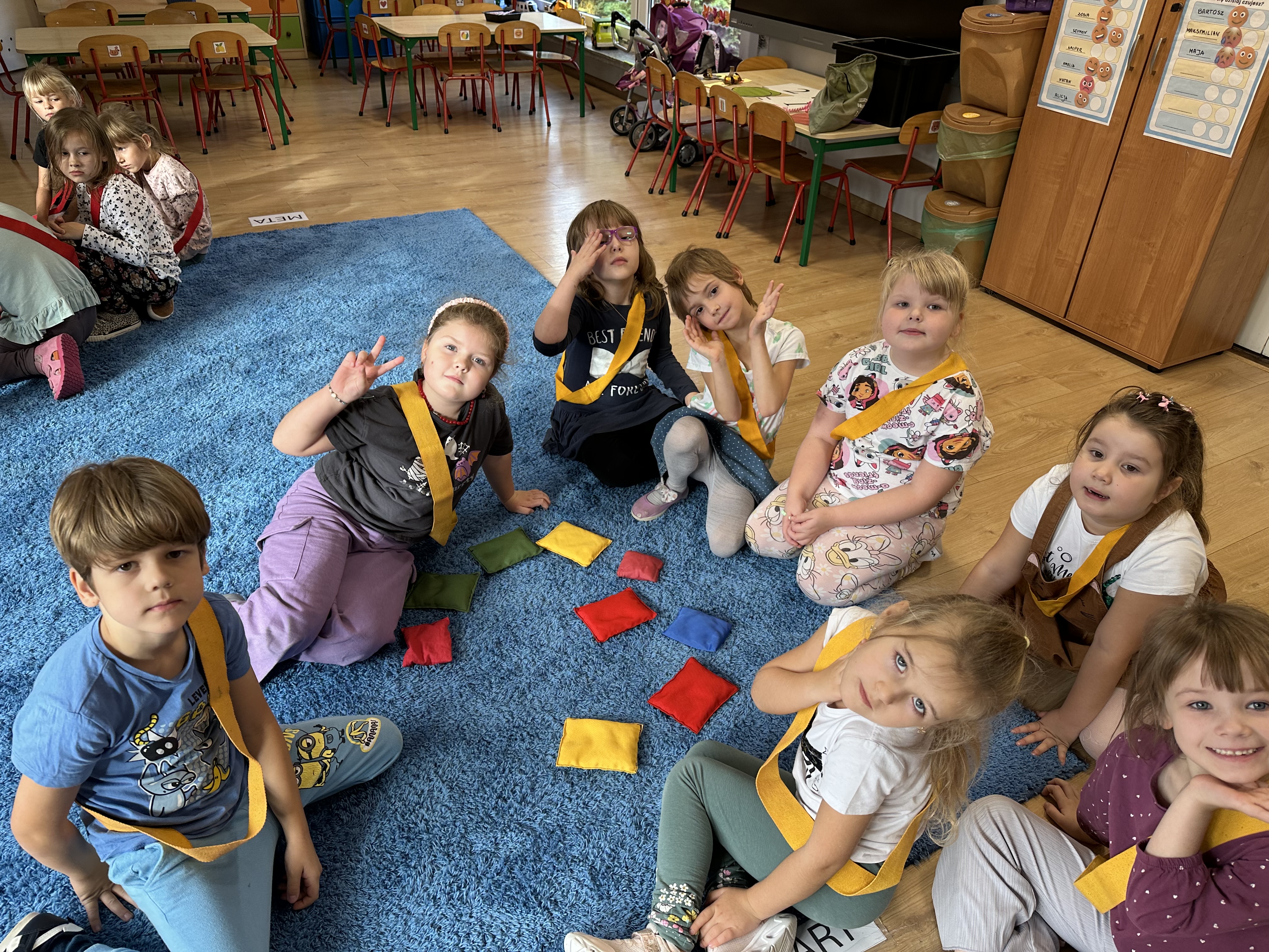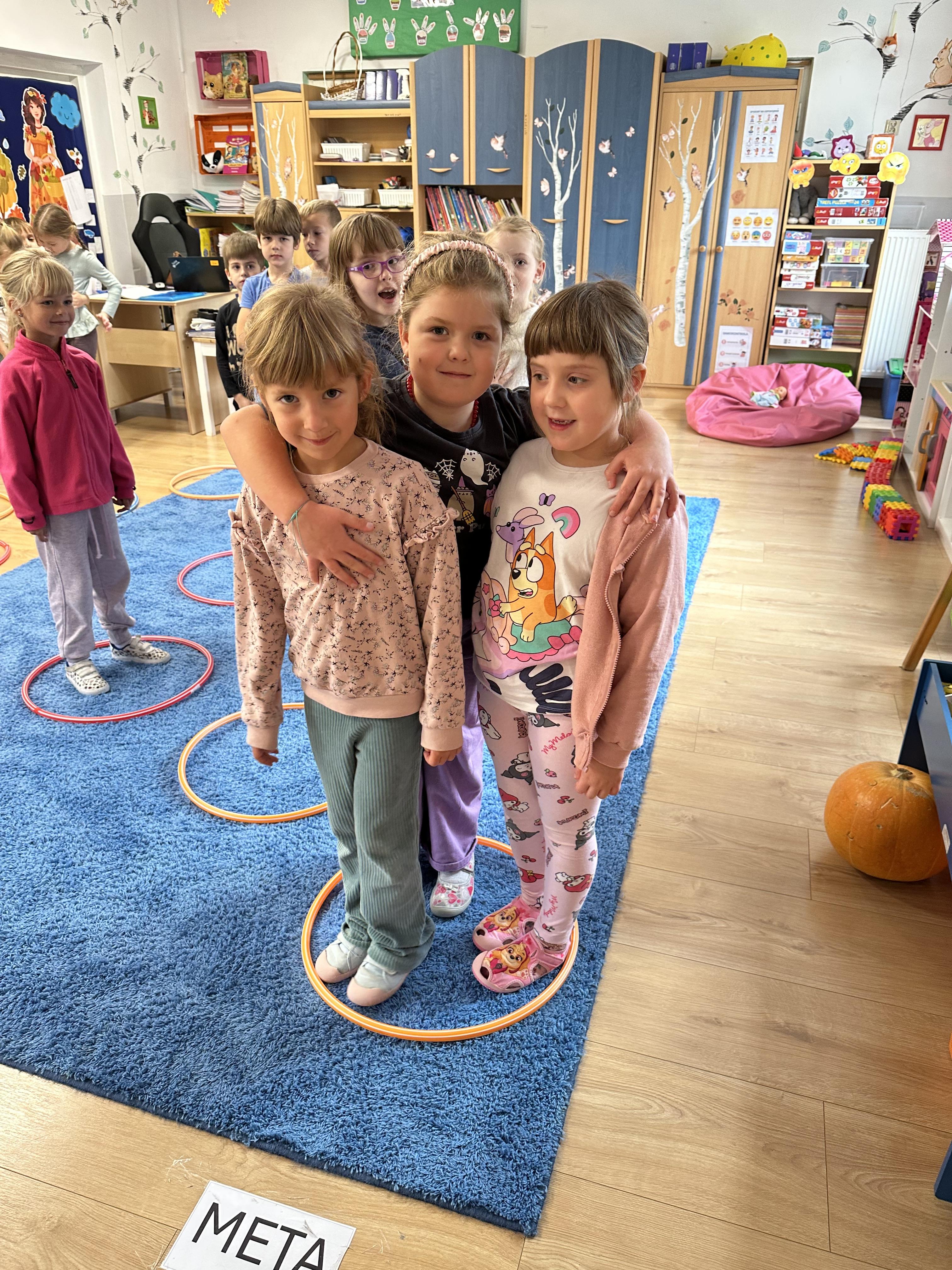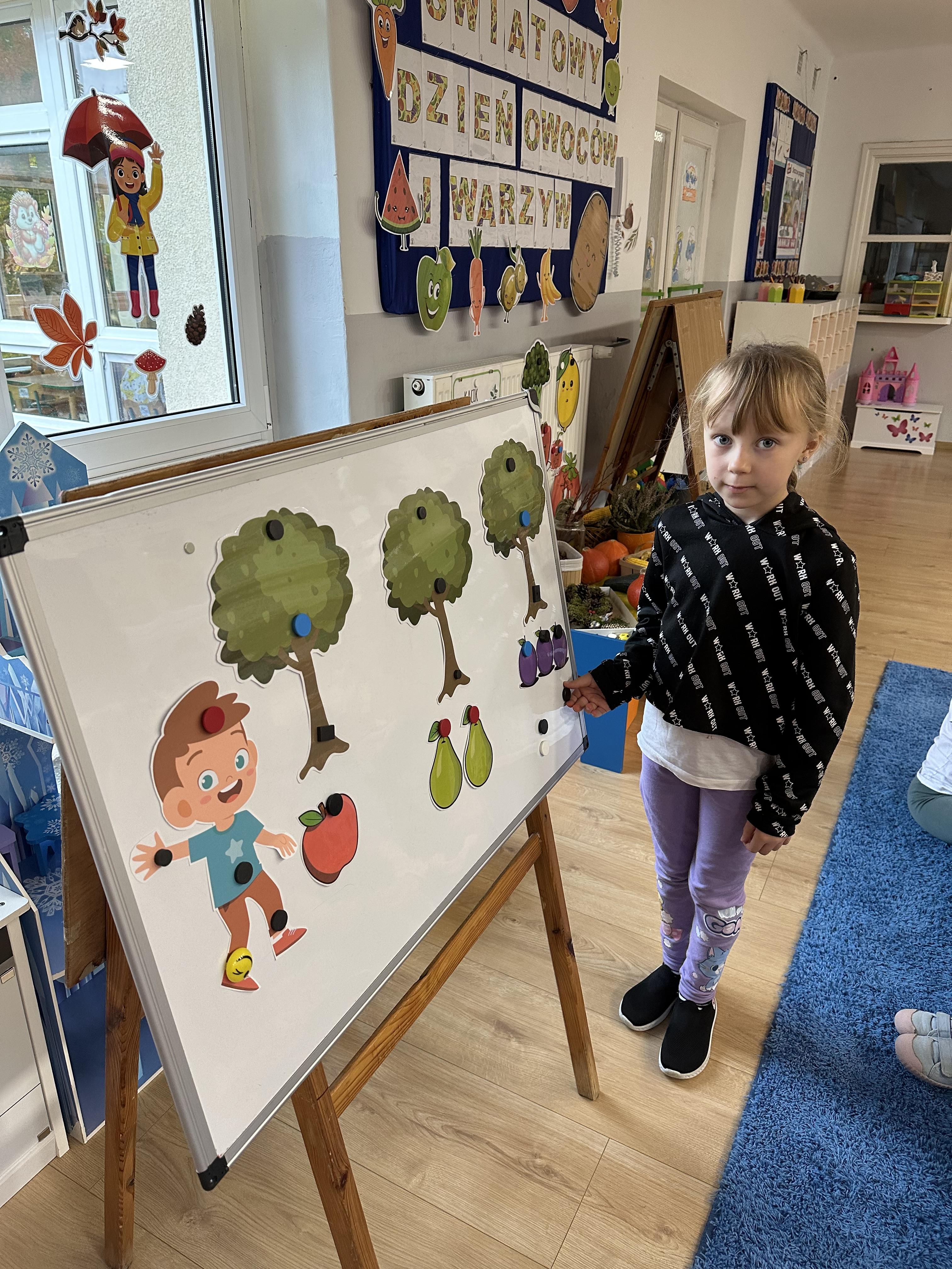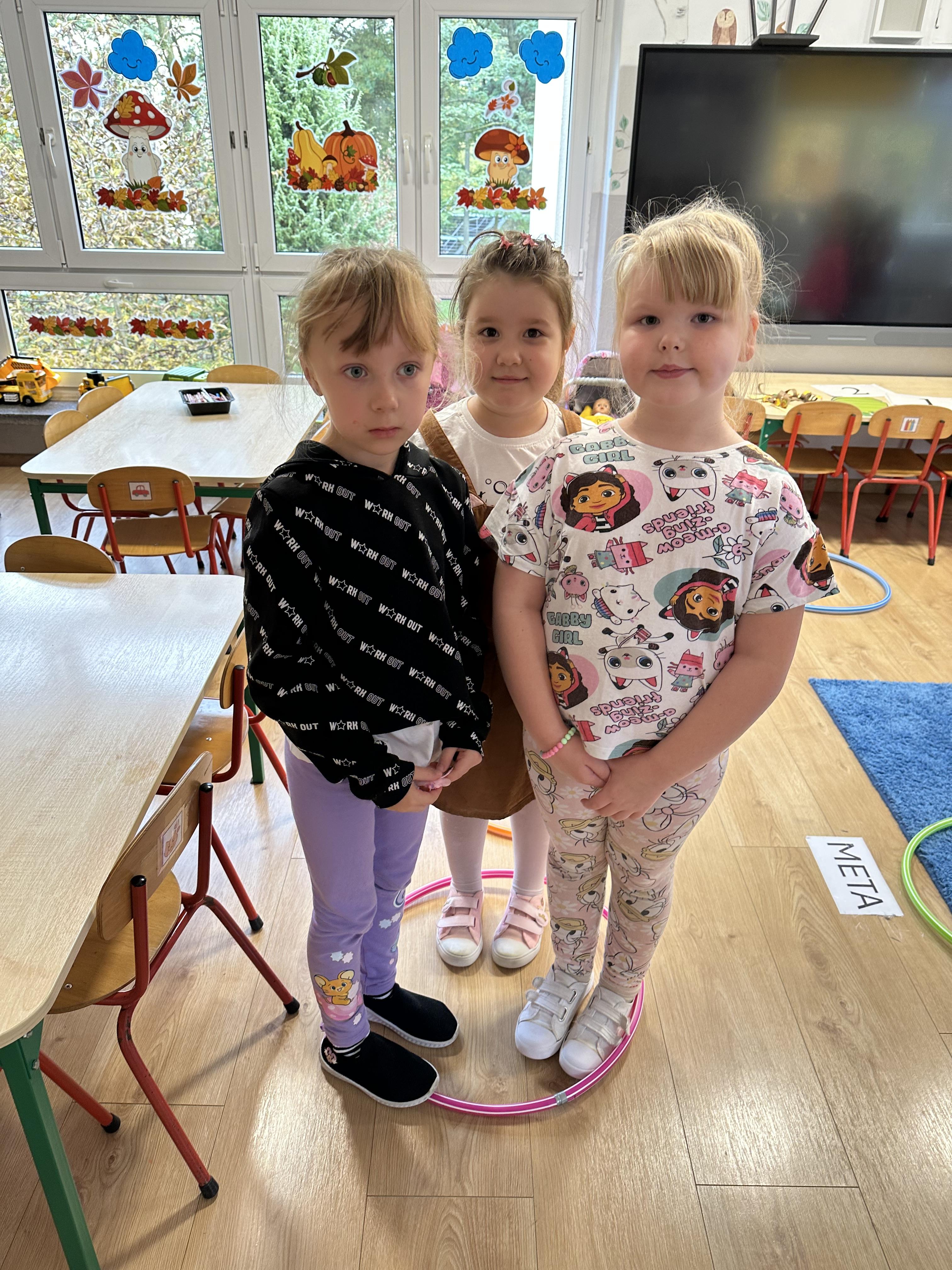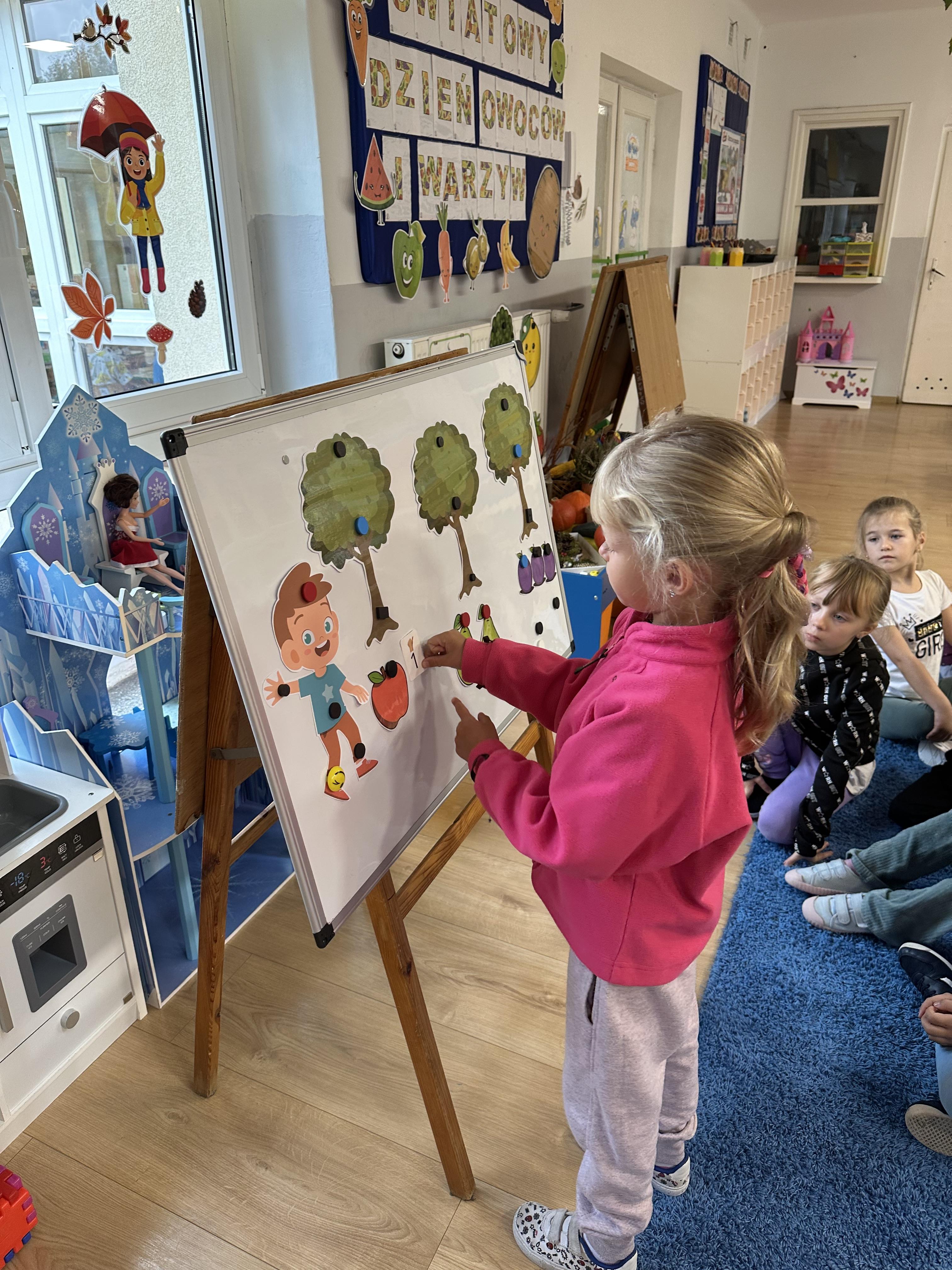 Poniedziałek był poświęcony kształtowaniu umiejętności wyrażania emocji oraz rozpoznawania uczucia smutku. Podczas porannej gimnastyki dzieci kształtowały sprawność fizyczną, wykonywały ćwiczenia rozciągające i wzmacniające mięśnie nóg. Opowiadanie Marii Pawlisz ,,Jesienne choroby” było punktem wyjścia do rozmowy o chorobach i samopoczuciu, które im towarzyszy. Dzieci dzieliły się swoimi doświadczeniami i sposobami na poprawę nastroju podczas przeziębienia. W trakcie zabawy „Lekarstwo na smutki” jedno z dzieci udawało smutne, pozostałe miały za zadanie je pocieszyć i rozweselić. Podczas zabawy dydaktycznej „W czasie choroby” inspirowanej opowiadaniem dzieci wspólnie zastanawiały się, jakie mogą być ,,lekarstwa” na smutki. Uczyły się uzasadniania swoich wyborów. Następnie poruszały się po sali do muzyki według wskazówek nauczyciela. Brały również udział w ćwiczeniach gimnastycznych, rozwijały szybkość i kształtowały mięśnie tułowia, wykonując skłony. Podczas zabawy „Tak się czuję, gdy…” uczyły się rozmawiać otwarcie o emocjach i o sytuacjach, które je powodują. We wtorek z samego rana ćwiczyły motorykę narządów mowy i wysłuchały piosenki ,,Smaczniejsze niż słodycze”. Następnie zastanawiały się nad przesłaniem utworu. Dzieci wspólnie doszły do wniosku, że warzywa i owoce są zdrowsze dla organizmu. Nauczyły się słów refrenu piosenki na pamięć. W kolejnej części dnia zapoznały się z wielką i małą literą T, t. Dzieliły słowo ,,tata” na sylaby i rytmicznie uderzały w instrument, przeliczając liczbę sylab. Podczas zabaw wymieniały dowolne słowa rozpoczynające się głoską t. Układały schemat słowa ,,tata” z kartoników i rysowały t palcem po dywanie, w powietrzu. Przy stolikach utrwalały znajomość poznanych liter, wykonując ćwiczenia. Po południu ozdobiły szablon litery T według własnego pomysłu. W środę dzieci poznały, czym są ceny i co oznacza słowo ,,cenny”. Po wysłuchaniu wiersza Barbary Lewandowskiej przedszkolaki sprawdzały umiejętność metaforycznego rozumienia sformułowań. Podczas zabawy ,,owoce jesieni” dzieci utrwalały znajomość darów jesieni i odróżniały owoce od warzyw. W czasie zabaw: „Ile warzyw dobrać?”, „Na straganie” i ,,Paski papryki” zapoznały się z liczbą 3 w aspekcie kardynalnym, porządkowym i miarowym. Nauczyły się zapisu graficznego 3 i dzieliły się spostrzeżeniami, jakie przedmioty przypominają im tę liczbę. Zakończyły dzień zabawami rozwijającymi pamięć i koncentrację oraz zabawą ruchową, integrującą grupę. W czwartek dzieci poznawały, jak wyglądają poszczególne warzywa po przekrojeniu ich na pół. Wiersz Elżbiety Śnieżowskiej-Bielak stanowił punkt wyjścia do rozmowy o grzankach i potrawach z warzyw i owoców, które jedzą dzieci. W dalszej części dnia przedszkolaki brały udział w zabawach rozwijających poczucie sprawstwa, kształtujących pamięć słuchową oraz ćwiczeniach językowych.