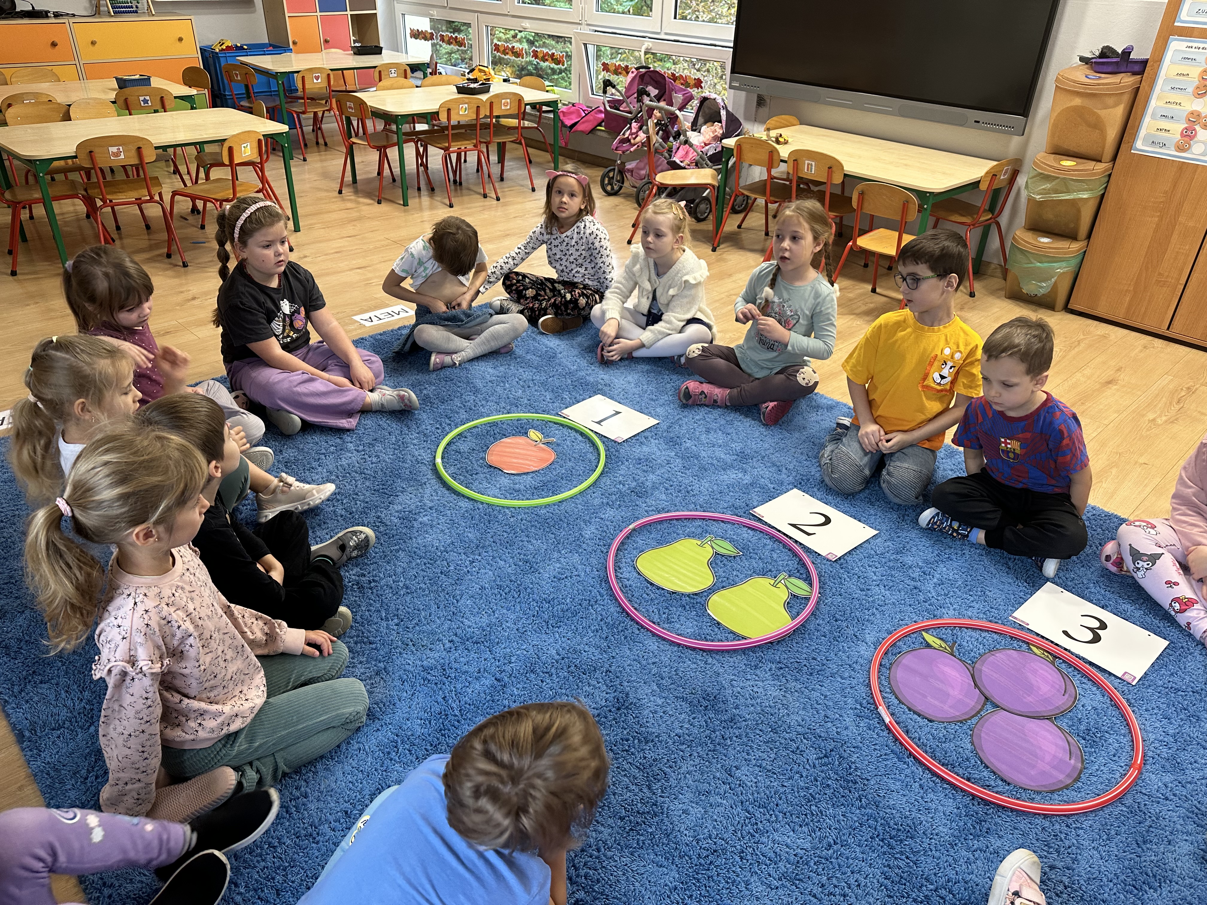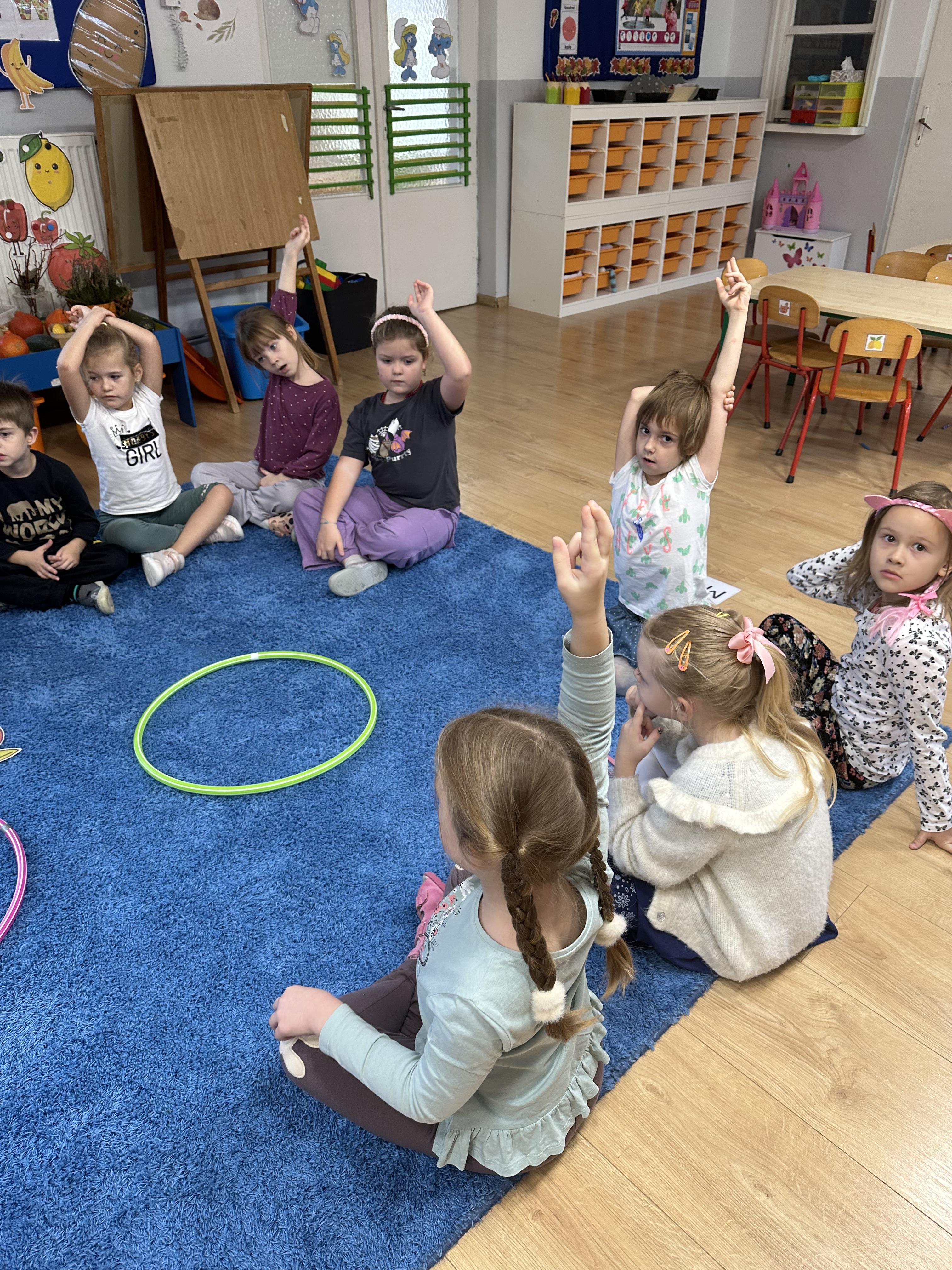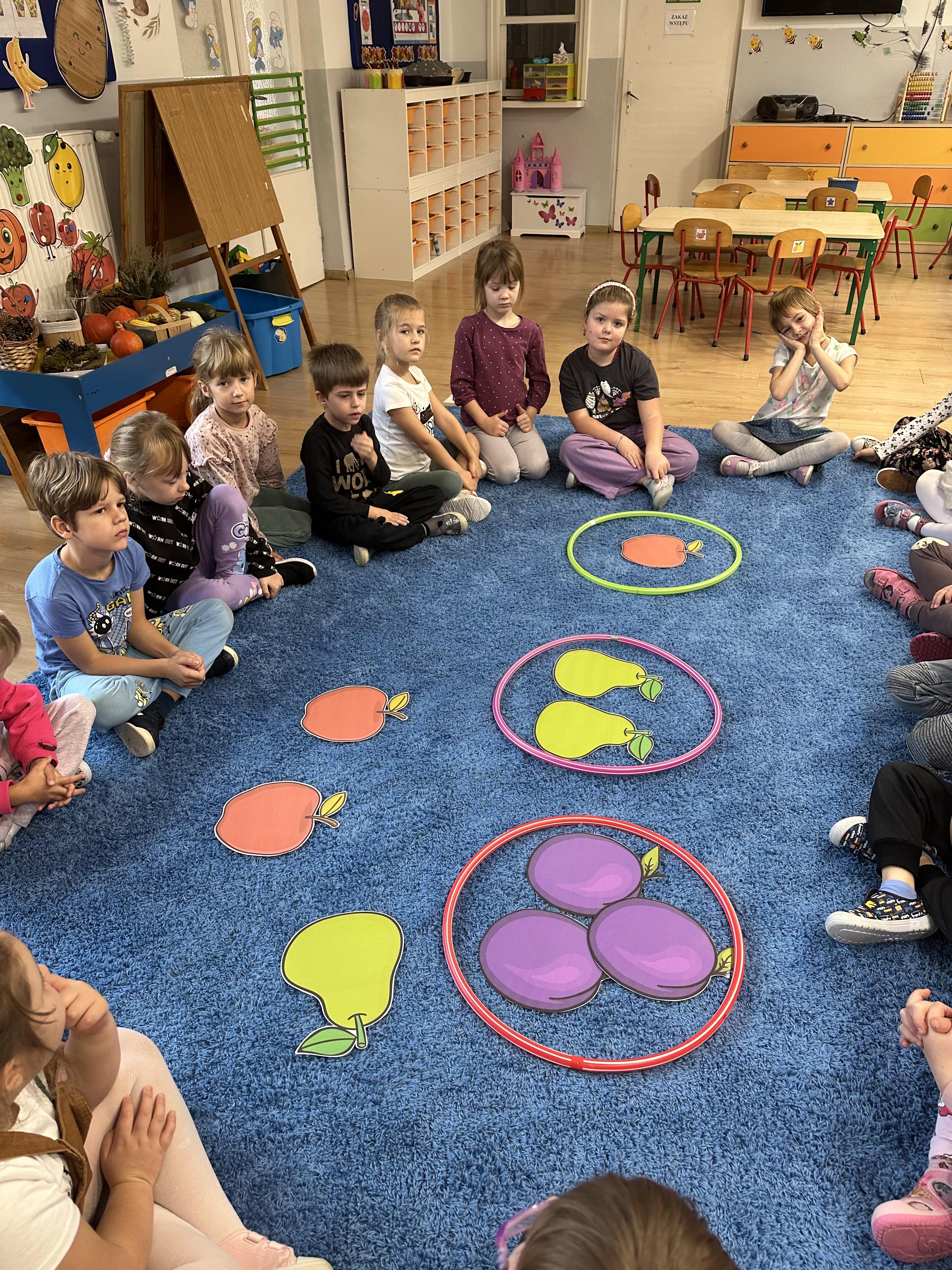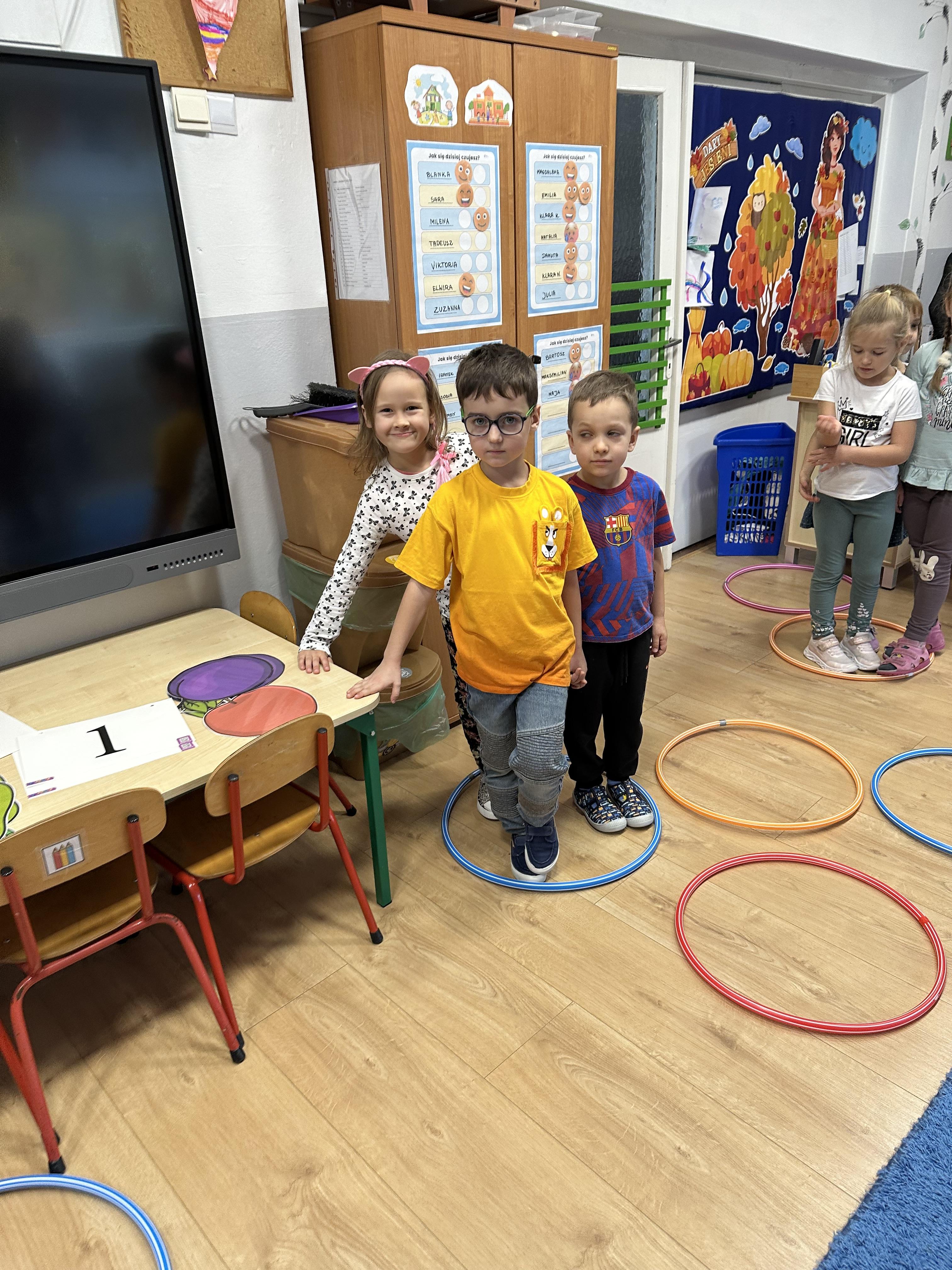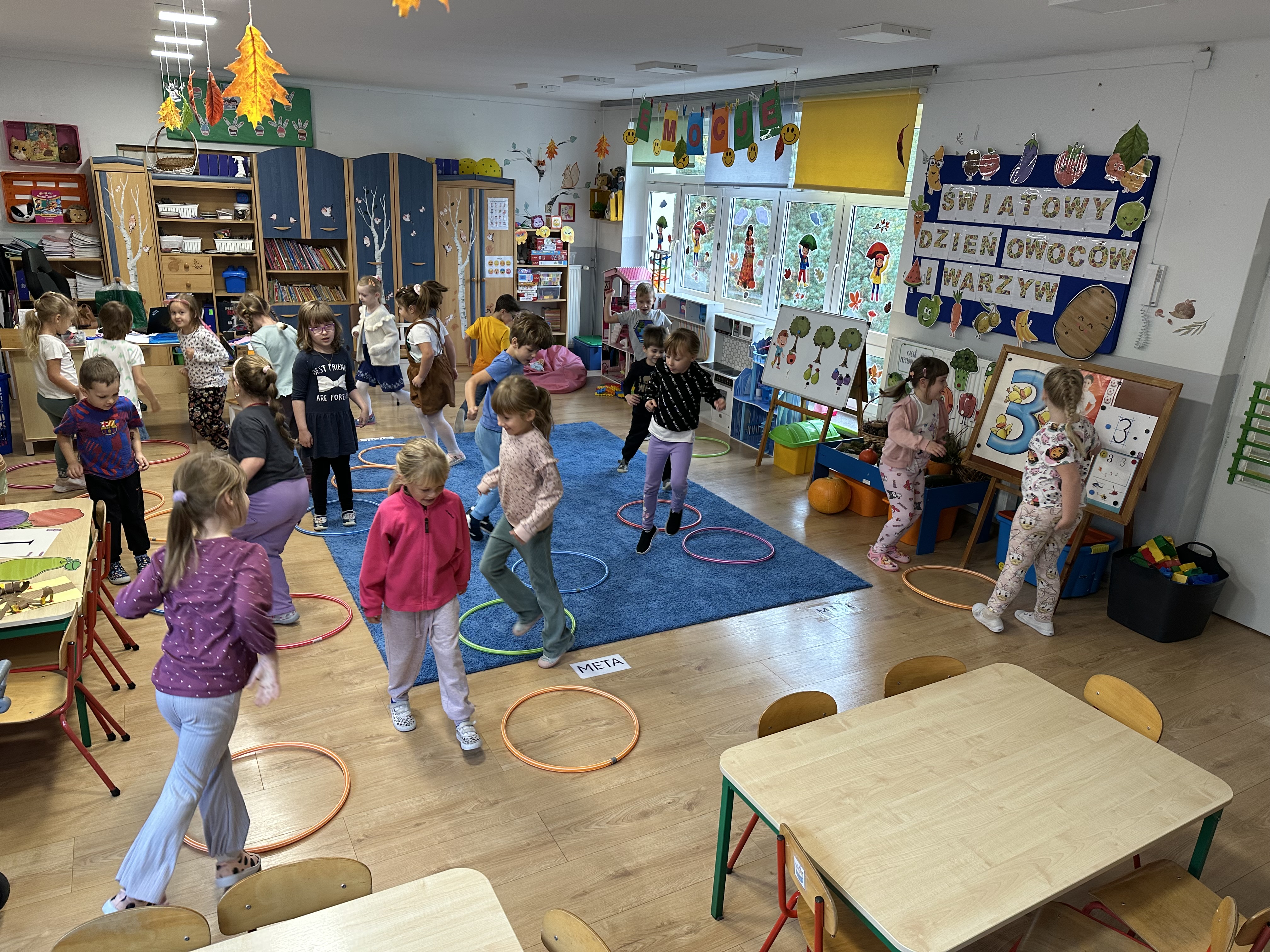 Poniedziałek był poświęcony kształtowaniu umiejętności wyrażania emocji oraz rozpoznawania uczucia smutku. Podczas porannej gimnastyki dzieci kształtowały sprawność fizyczną, wykonywały ćwiczenia rozciągające i wzmacniające mięśnie nóg. Opowiadanie Marii Pawlisz ,,Jesienne choroby” było punktem wyjścia do rozmowy o chorobach i samopoczuciu, które im towarzyszy. Dzieci dzieliły się swoimi doświadczeniami i sposobami na poprawę nastroju podczas przeziębienia. W trakcie zabawy „Lekarstwo na smutki” jedno z dzieci udawało smutne, pozostałe miały za zadanie je pocieszyć i rozweselić. Podczas zabawy dydaktycznej „W czasie choroby” inspirowanej opowiadaniem dzieci wspólnie zastanawiały się, jakie mogą być ,,lekarstwa” na smutki. Uczyły się uzasadniania swoich wyborów. Następnie poruszały się po sali do muzyki według wskazówek nauczyciela. Brały również udział w ćwiczeniach gimnastycznych, rozwijały szybkość i kształtowały mięśnie tułowia, wykonując skłony. Podczas zabawy „Tak się czuję, gdy…” uczyły się rozmawiać otwarcie o emocjach i o sytuacjach, które je powodują. We wtorek z samego rana ćwiczyły motorykę narządów mowy i wysłuchały piosenki ,,Smaczniejsze niż słodycze”. Następnie zastanawiały się nad przesłaniem utworu. Dzieci wspólnie doszły do wniosku, że warzywa i owoce są zdrowsze dla organizmu. Nauczyły się słów refrenu piosenki na pamięć. W kolejnej części dnia zapoznały się z wielką i małą literą T, t. Dzieliły słowo ,,tata” na sylaby i rytmicznie uderzały w instrument, przeliczając liczbę sylab. Podczas zabaw wymieniały dowolne słowa rozpoczynające się głoską t. Układały schemat słowa ,,tata” z kartoników i rysowały t palcem po dywanie, w powietrzu. Przy stolikach utrwalały znajomość poznanych liter, wykonując ćwiczenia. Po południu ozdobiły szablon litery T według własnego pomysłu. W środę dzieci poznały, czym są ceny i co oznacza słowo ,,cenny”. Po wysłuchaniu wiersza Barbary Lewandowskiej przedszkolaki sprawdzały umiejętność metaforycznego rozumienia sformułowań. Podczas zabawy ,,owoce jesieni” dzieci utrwalały znajomość darów jesieni i odróżniały owoce od warzyw. W czasie zabaw: „Ile warzyw dobrać?”, „Na straganie” i ,,Paski papryki” zapoznały się z liczbą 3 w aspekcie kardynalnym, porządkowym i miarowym. Nauczyły się zapisu graficznego 3 i dzieliły się spostrzeżeniami, jakie przedmioty przypominają im tę liczbę. Zakończyły dzień zabawami rozwijającymi pamięć i koncentrację oraz zabawą ruchową, integrującą grupę. W czwartek dzieci poznawały, jak wyglądają poszczególne warzywa po przekrojeniu ich na pół. Wiersz Elżbiety Śnieżowskiej-Bielak stanowił punkt wyjścia do rozmowy o grzankach i potrawach z warzyw i owoców, które jedzą dzieci. W dalszej części dnia przedszkolaki brały udział w zabawach rozwijających poczucie sprawstwa, kształtujących pamięć słuchową oraz ćwiczeniach językowych.