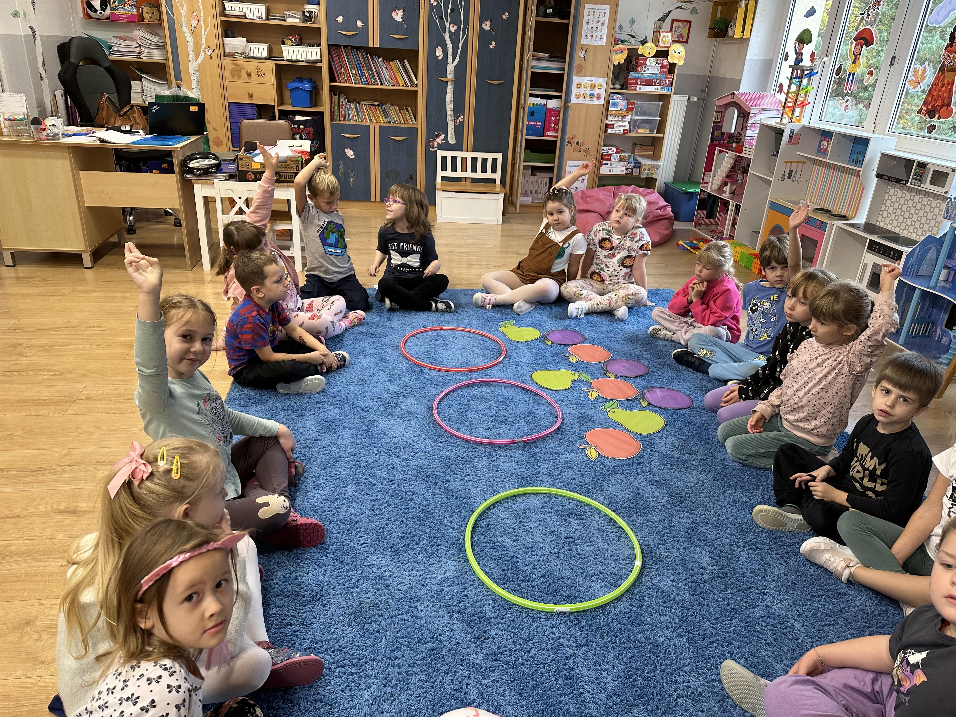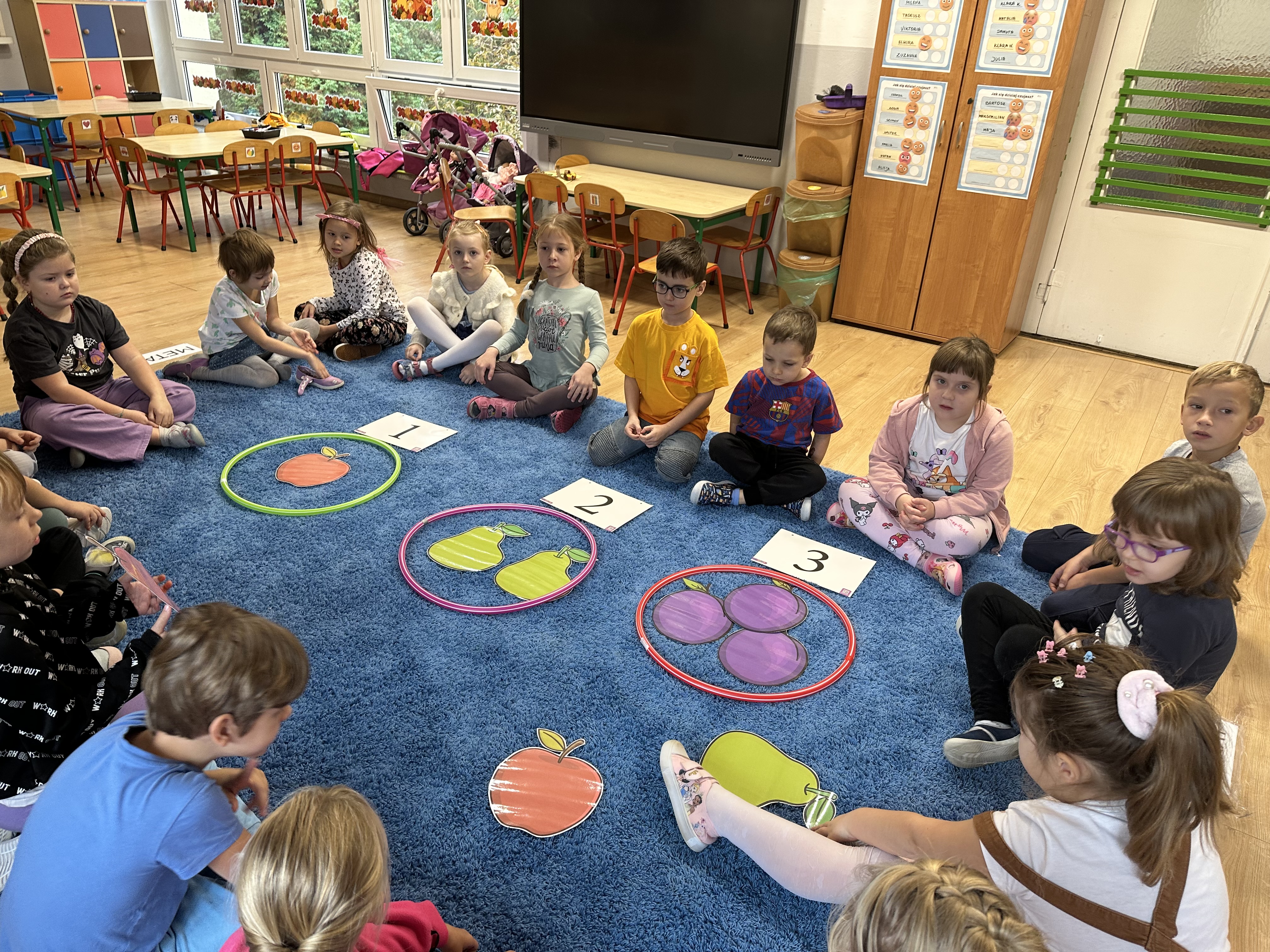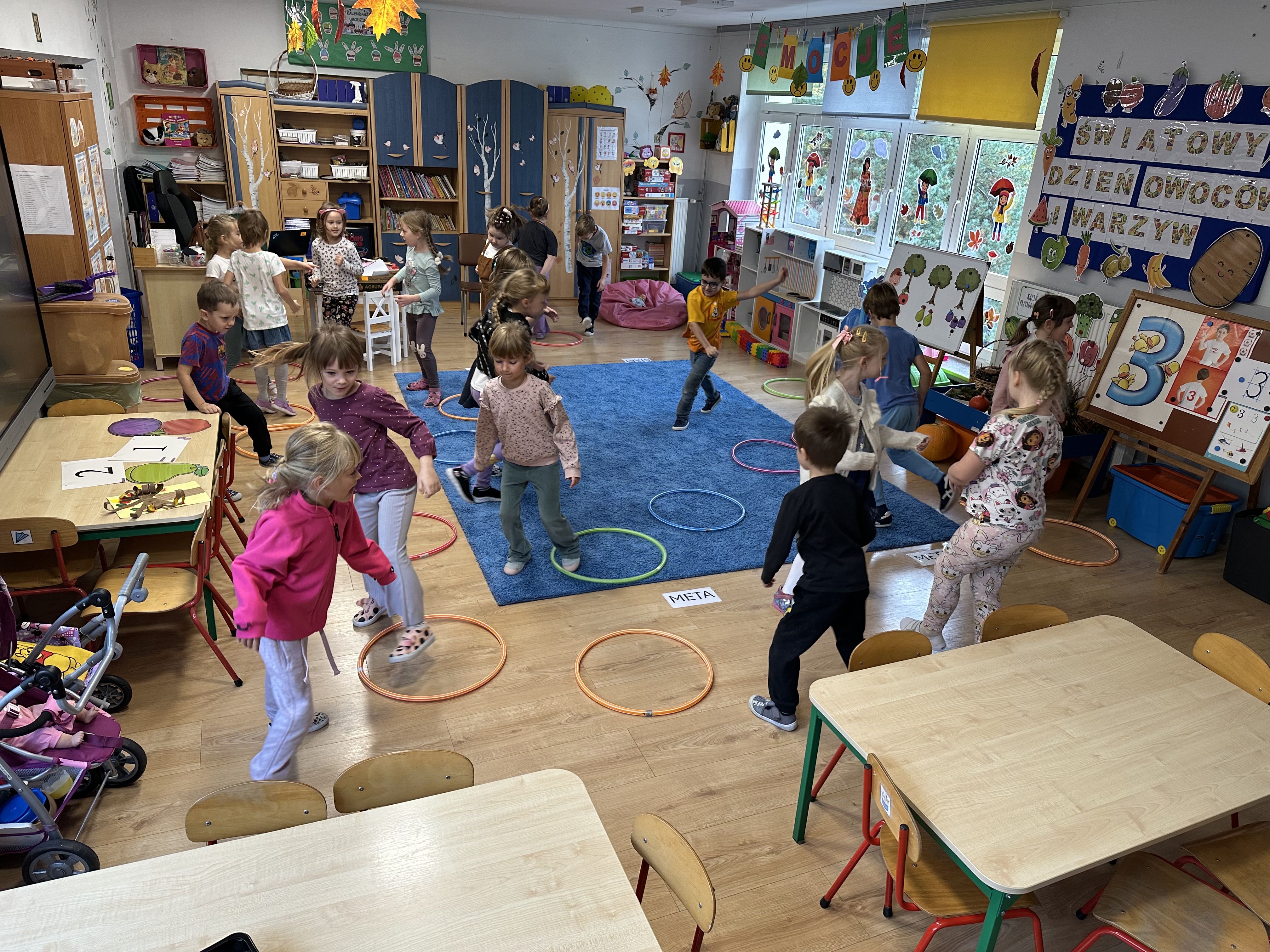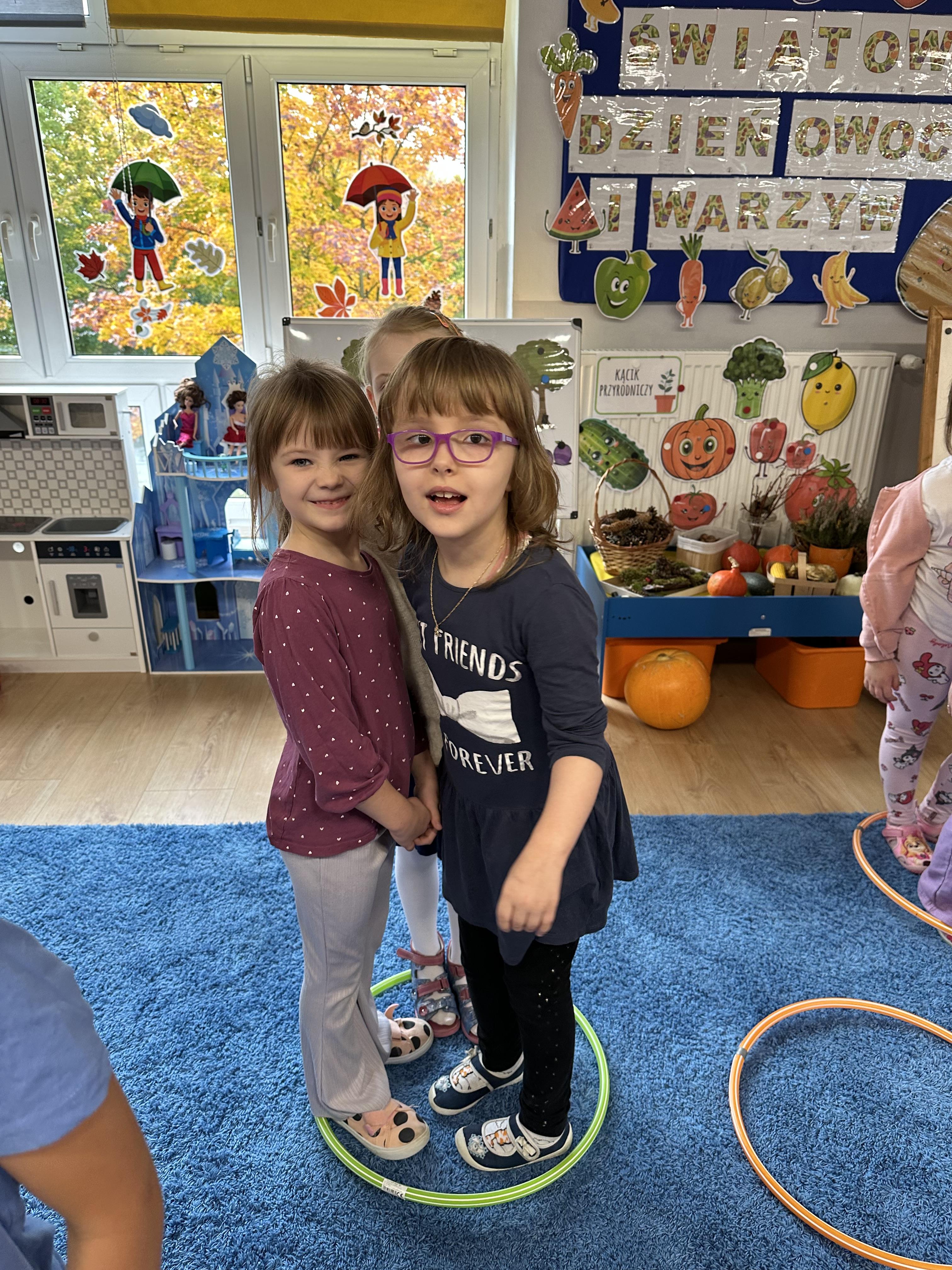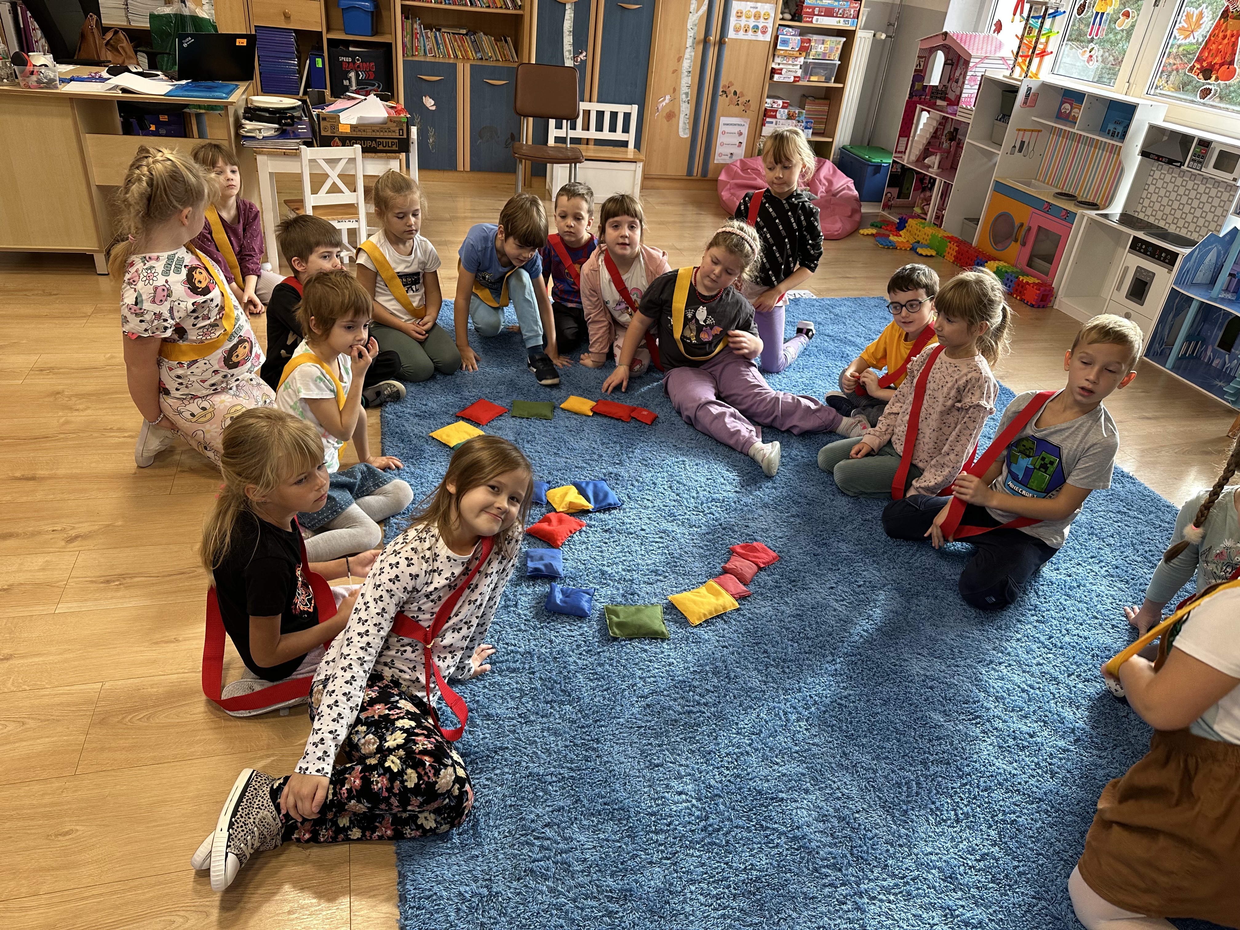 Poniedziałek był poświęcony kształtowaniu umiejętności wyrażania emocji oraz rozpoznawania uczucia smutku. Podczas porannej gimnastyki dzieci kształtowały sprawność fizyczną, wykonywały ćwiczenia rozciągające i wzmacniające mięśnie nóg. Opowiadanie Marii Pawlisz ,,Jesienne choroby” było punktem wyjścia do rozmowy o chorobach i samopoczuciu, które im towarzyszy. Dzieci dzieliły się swoimi doświadczeniami i sposobami na poprawę nastroju podczas przeziębienia. W trakcie zabawy „Lekarstwo na smutki” jedno z dzieci udawało smutne, pozostałe miały za zadanie je pocieszyć i rozweselić. Podczas zabawy dydaktycznej „W czasie choroby” inspirowanej opowiadaniem dzieci wspólnie zastanawiały się, jakie mogą być ,,lekarstwa” na smutki. Uczyły się uzasadniania swoich wyborów. Następnie poruszały się po sali do muzyki według wskazówek nauczyciela. Brały również udział w ćwiczeniach gimnastycznych, rozwijały szybkość i kształtowały mięśnie tułowia, wykonując skłony. Podczas zabawy „Tak się czuję, gdy…” uczyły się rozmawiać otwarcie o emocjach i o sytuacjach, które je powodują. We wtorek z samego rana ćwiczyły motorykę narządów mowy i wysłuchały piosenki ,,Smaczniejsze niż słodycze”. Następnie zastanawiały się nad przesłaniem utworu. Dzieci wspólnie doszły do wniosku, że warzywa i owoce są zdrowsze dla organizmu. Nauczyły się słów refrenu piosenki na pamięć. W kolejnej części dnia zapoznały się z wielką i małą literą T, t. Dzieliły słowo ,,tata” na sylaby i rytmicznie uderzały w instrument, przeliczając liczbę sylab. Podczas zabaw wymieniały dowolne słowa rozpoczynające się głoską t. Układały schemat słowa ,,tata” z kartoników i rysowały t palcem po dywanie, w powietrzu. Przy stolikach utrwalały znajomość poznanych liter, wykonując ćwiczenia. Po południu ozdobiły szablon litery T według własnego pomysłu. W środę dzieci poznały, czym są ceny i co oznacza słowo ,,cenny”. Po wysłuchaniu wiersza Barbary Lewandowskiej przedszkolaki sprawdzały umiejętność metaforycznego rozumienia sformułowań. Podczas zabawy ,,owoce jesieni” dzieci utrwalały znajomość darów jesieni i odróżniały owoce od warzyw. W czasie zabaw: „Ile warzyw dobrać?”, „Na straganie” i ,,Paski papryki” zapoznały się z liczbą 3 w aspekcie kardynalnym, porządkowym i miarowym. Nauczyły się zapisu graficznego 3 i dzieliły się spostrzeżeniami, jakie przedmioty przypominają im tę liczbę. Zakończyły dzień zabawami rozwijającymi pamięć i koncentrację oraz zabawą ruchową, integrującą grupę. W czwartek dzieci poznawały, jak wyglądają poszczególne warzywa po przekrojeniu ich na pół. Wiersz Elżbiety Śnieżowskiej-Bielak stanowił punkt wyjścia do rozmowy o grzankach i potrawach z warzyw i owoców, które jedzą dzieci. W dalszej części dnia przedszkolaki brały udział w zabawach rozwijających poczucie sprawstwa, kształtujących pamięć słuchową oraz ćwiczeniach językowych.