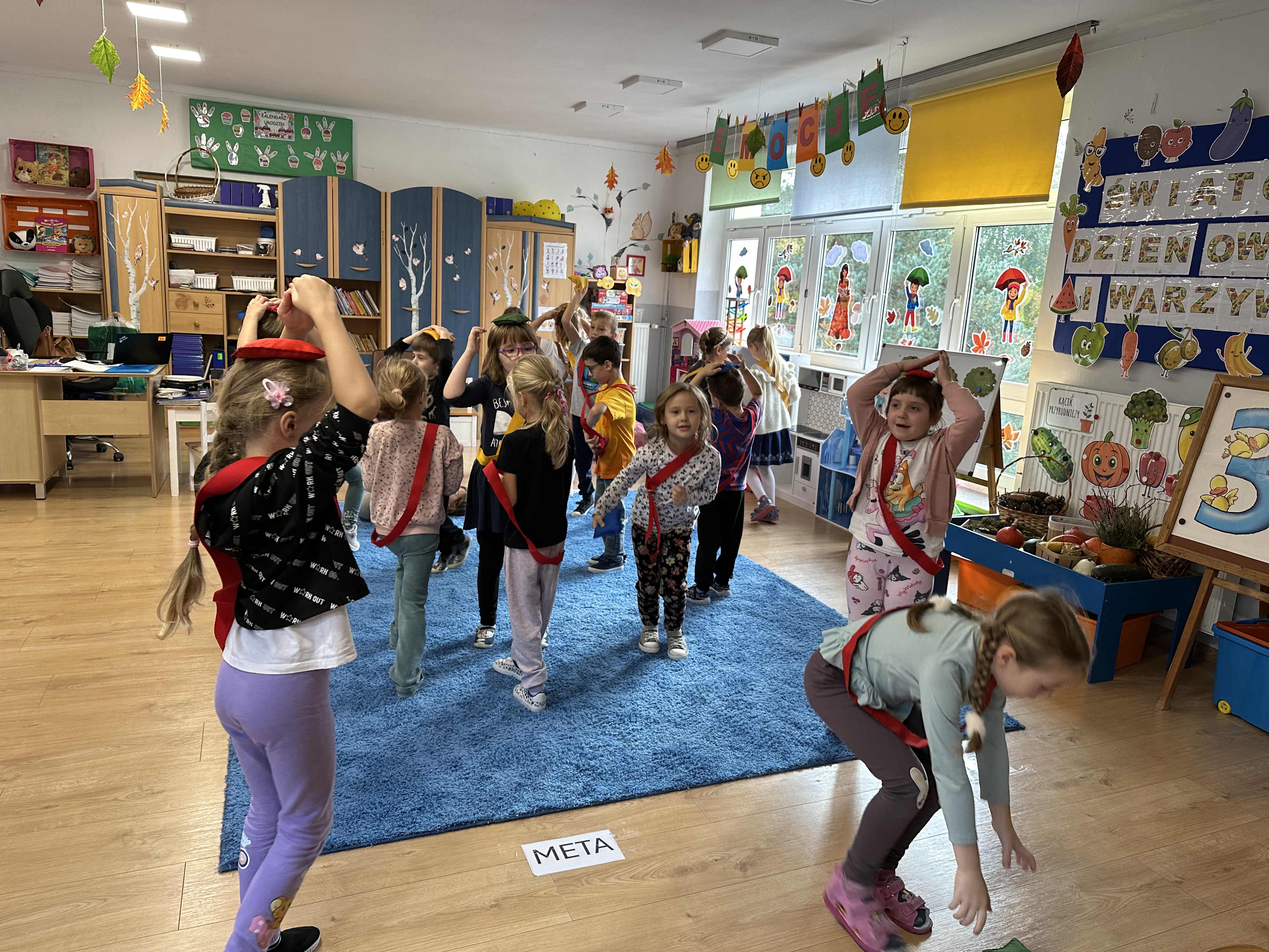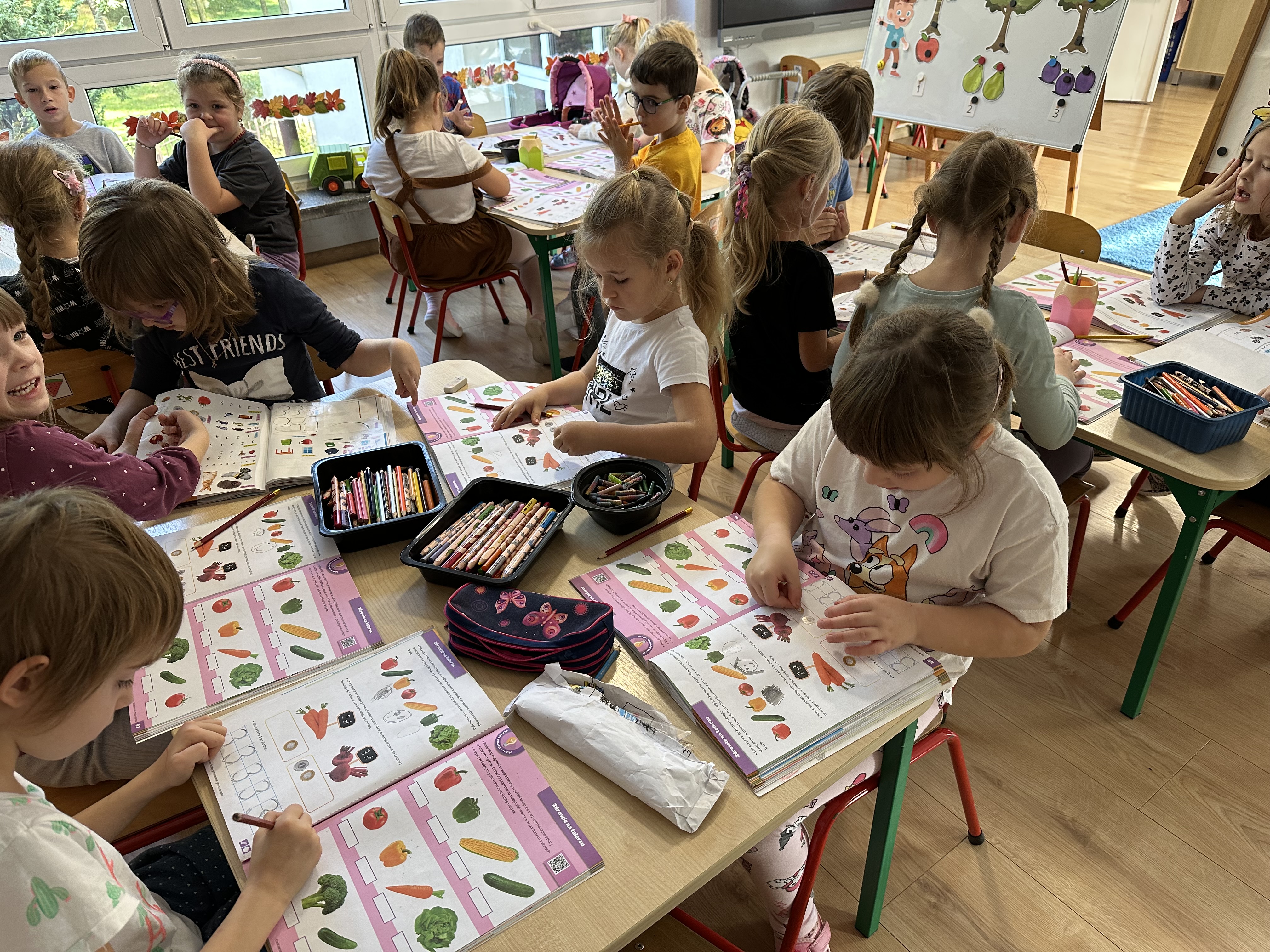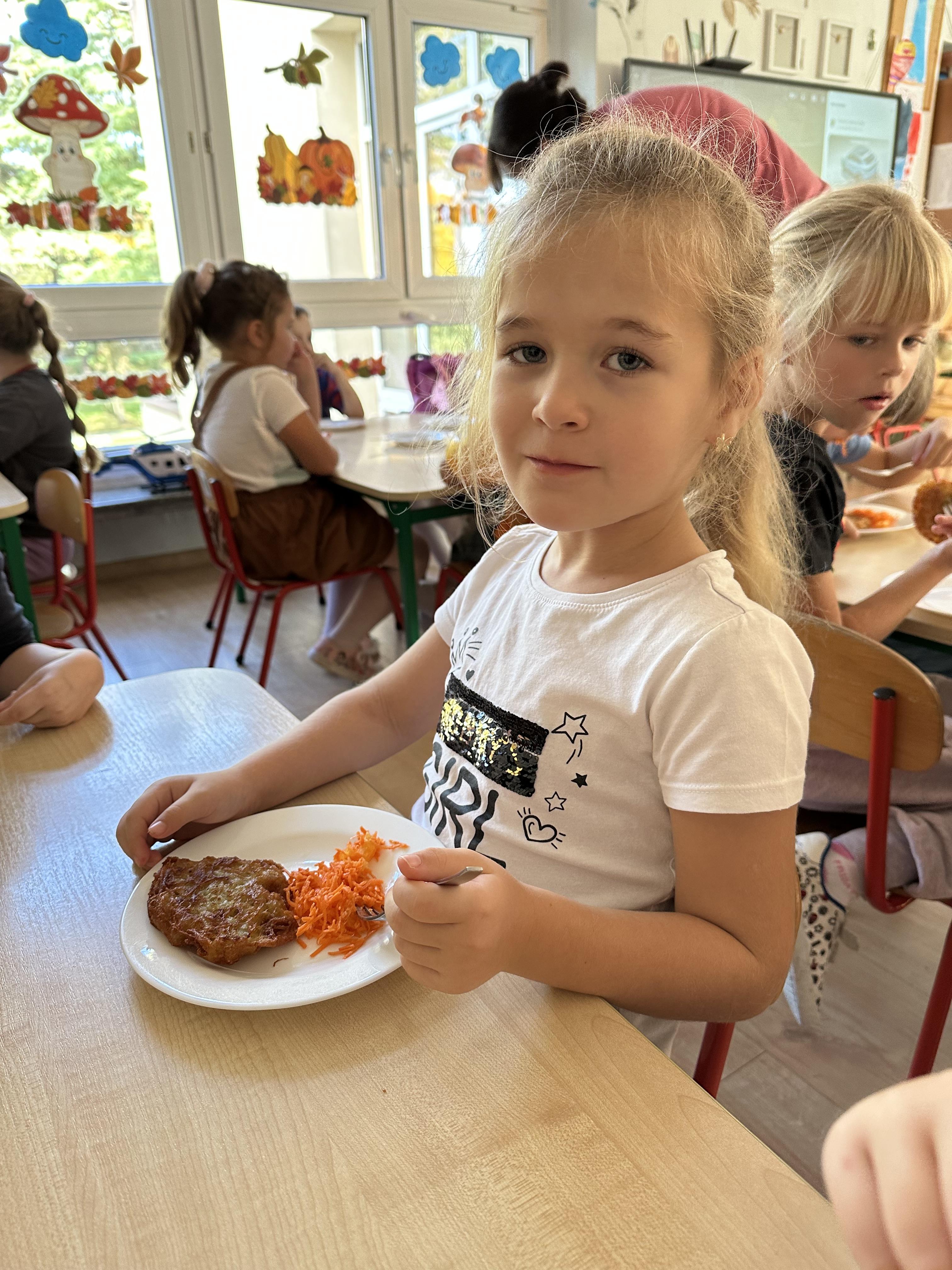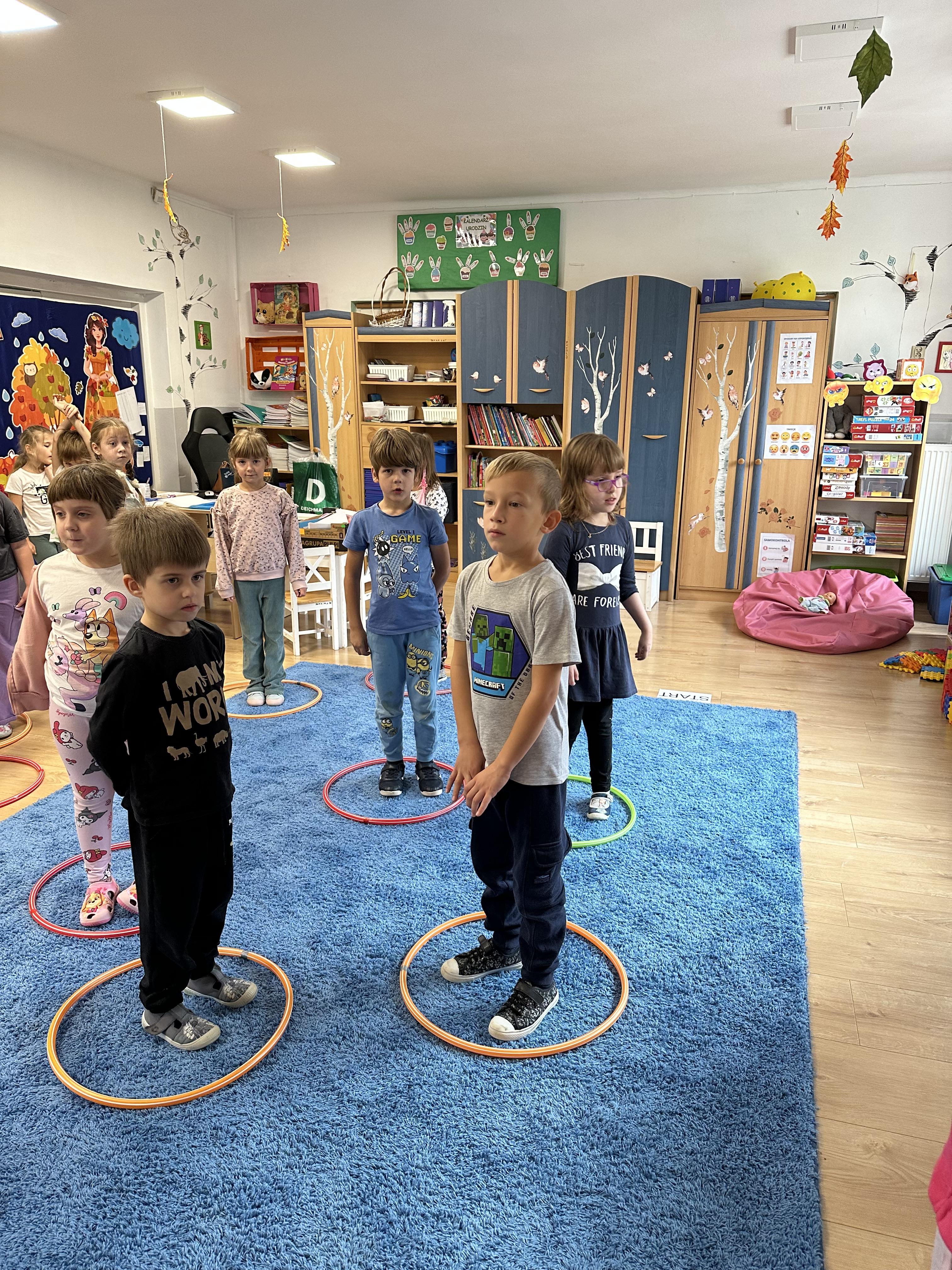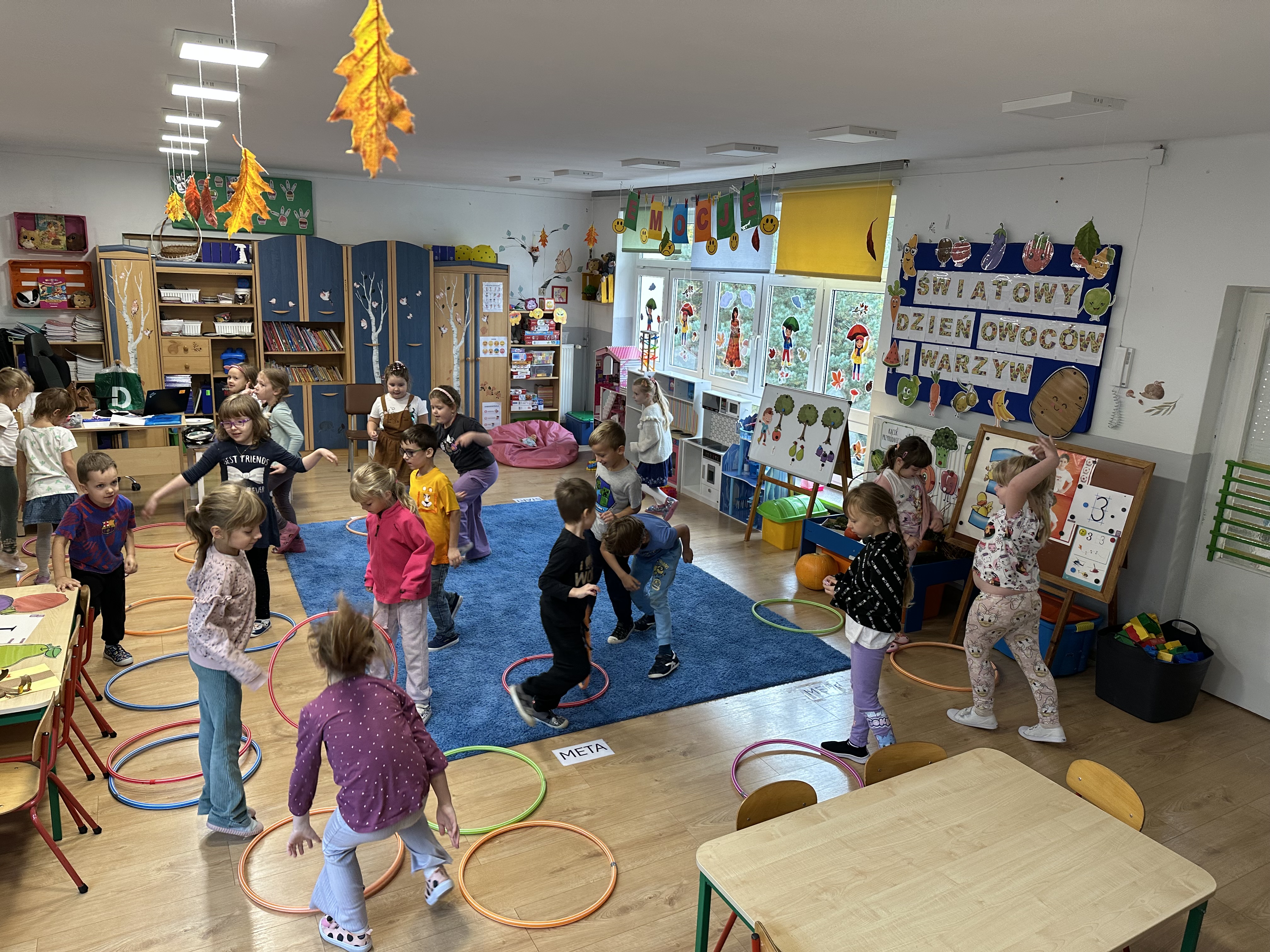 Poniedziałek był poświęcony kształtowaniu umiejętności wyrażania emocji oraz rozpoznawania uczucia smutku. Podczas porannej gimnastyki dzieci kształtowały sprawność fizyczną, wykonywały ćwiczenia rozciągające i wzmacniające mięśnie nóg. Opowiadanie Marii Pawlisz ,,Jesienne choroby” było punktem wyjścia do rozmowy o chorobach i samopoczuciu, które im towarzyszy. Dzieci dzieliły się swoimi doświadczeniami i sposobami na poprawę nastroju podczas przeziębienia. W trakcie zabawy „Lekarstwo na smutki” jedno z dzieci udawało smutne, pozostałe miały za zadanie je pocieszyć i rozweselić. Podczas zabawy dydaktycznej „W czasie choroby” inspirowanej opowiadaniem dzieci wspólnie zastanawiały się, jakie mogą być ,,lekarstwa” na smutki. Uczyły się uzasadniania swoich wyborów. Następnie poruszały się po sali do muzyki według wskazówek nauczyciela. Brały również udział w ćwiczeniach gimnastycznych, rozwijały szybkość i kształtowały mięśnie tułowia, wykonując skłony. Podczas zabawy „Tak się czuję, gdy…” uczyły się rozmawiać otwarcie o emocjach i o sytuacjach, które je powodują. We wtorek z samego rana ćwiczyły motorykę narządów mowy i wysłuchały piosenki ,,Smaczniejsze niż słodycze”. Następnie zastanawiały się nad przesłaniem utworu. Dzieci wspólnie doszły do wniosku, że warzywa i owoce są zdrowsze dla organizmu. Nauczyły się słów refrenu piosenki na pamięć. W kolejnej części dnia zapoznały się z wielką i małą literą T, t. Dzieliły słowo ,,tata” na sylaby i rytmicznie uderzały w instrument, przeliczając liczbę sylab. Podczas zabaw wymieniały dowolne słowa rozpoczynające się głoską t. Układały schemat słowa ,,tata” z kartoników i rysowały t palcem po dywanie, w powietrzu. Przy stolikach utrwalały znajomość poznanych liter, wykonując ćwiczenia. Po południu ozdobiły szablon litery T według własnego pomysłu. W środę dzieci poznały, czym są ceny i co oznacza słowo ,,cenny”. Po wysłuchaniu wiersza Barbary Lewandowskiej przedszkolaki sprawdzały umiejętność metaforycznego rozumienia sformułowań. Podczas zabawy ,,owoce jesieni” dzieci utrwalały znajomość darów jesieni i odróżniały owoce od warzyw. W czasie zabaw: „Ile warzyw dobrać?”, „Na straganie” i ,,Paski papryki” zapoznały się z liczbą 3 w aspekcie kardynalnym, porządkowym i miarowym. Nauczyły się zapisu graficznego 3 i dzieliły się spostrzeżeniami, jakie przedmioty przypominają im tę liczbę. Zakończyły dzień zabawami rozwijającymi pamięć i koncentrację oraz zabawą ruchową, integrującą grupę. W czwartek dzieci poznawały, jak wyglądają poszczególne warzywa po przekrojeniu ich na pół. Wiersz Elżbiety Śnieżowskiej-Bielak stanowił punkt wyjścia do rozmowy o grzankach i potrawach z warzyw i owoców, które jedzą dzieci. W dalszej części dnia przedszkolaki brały udział w zabawach rozwijających poczucie sprawstwa, kształtujących pamięć słuchową oraz ćwiczeniach językowych.