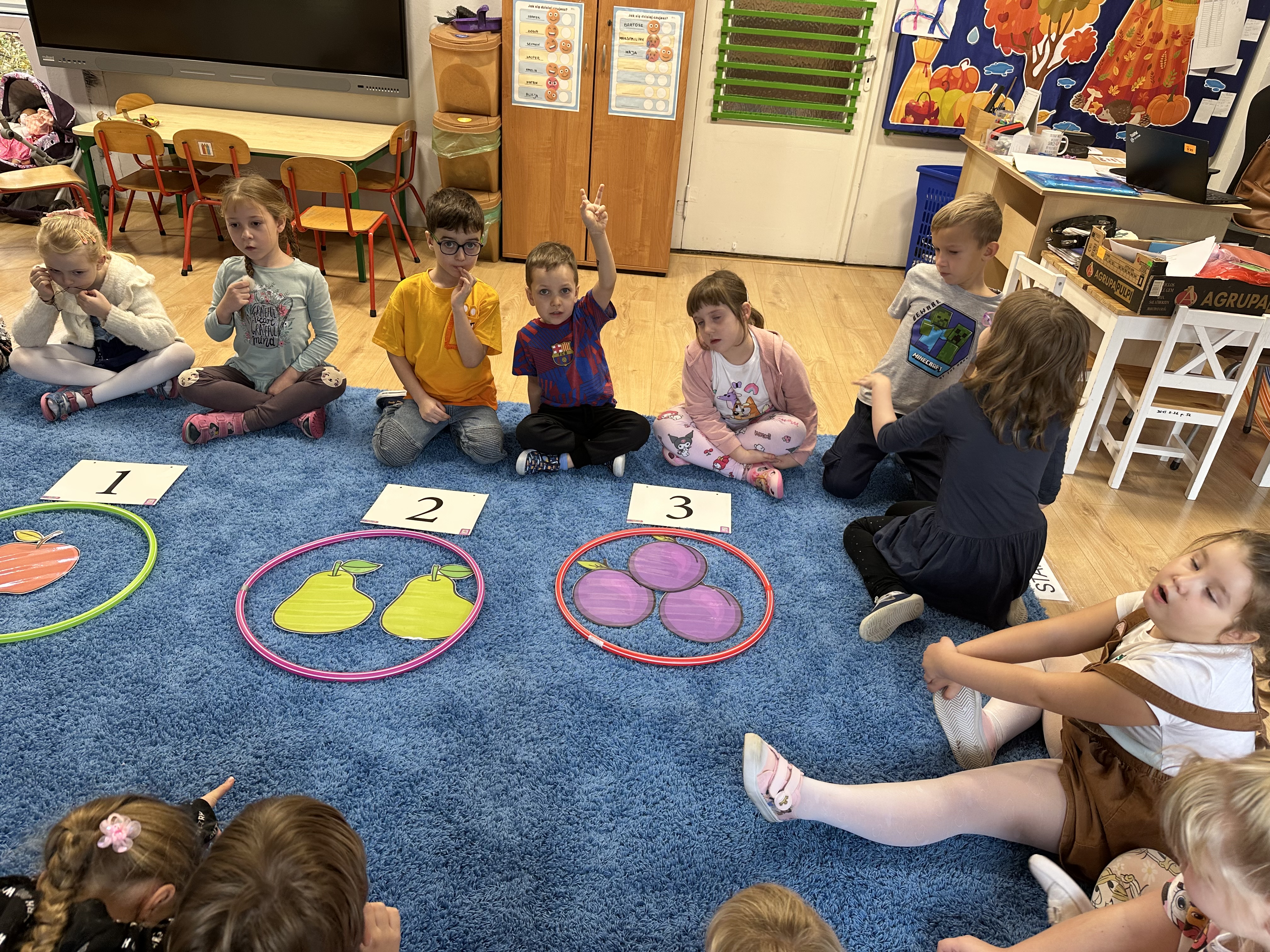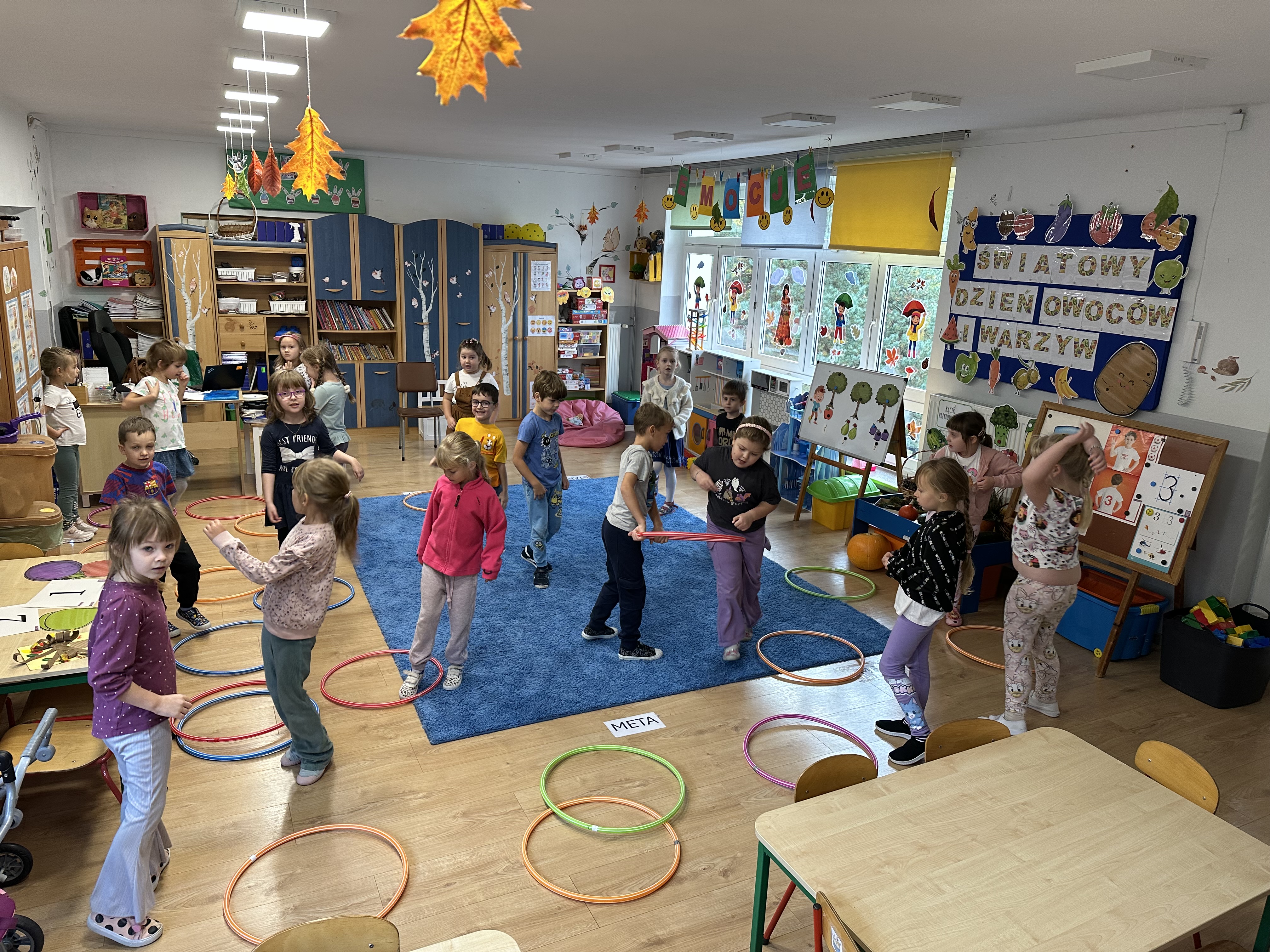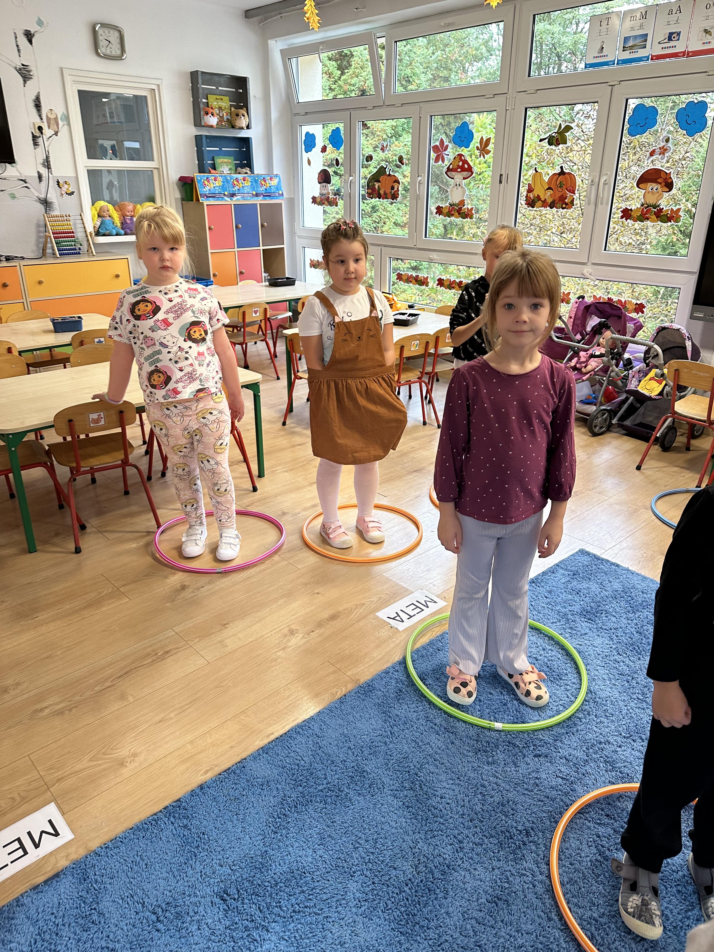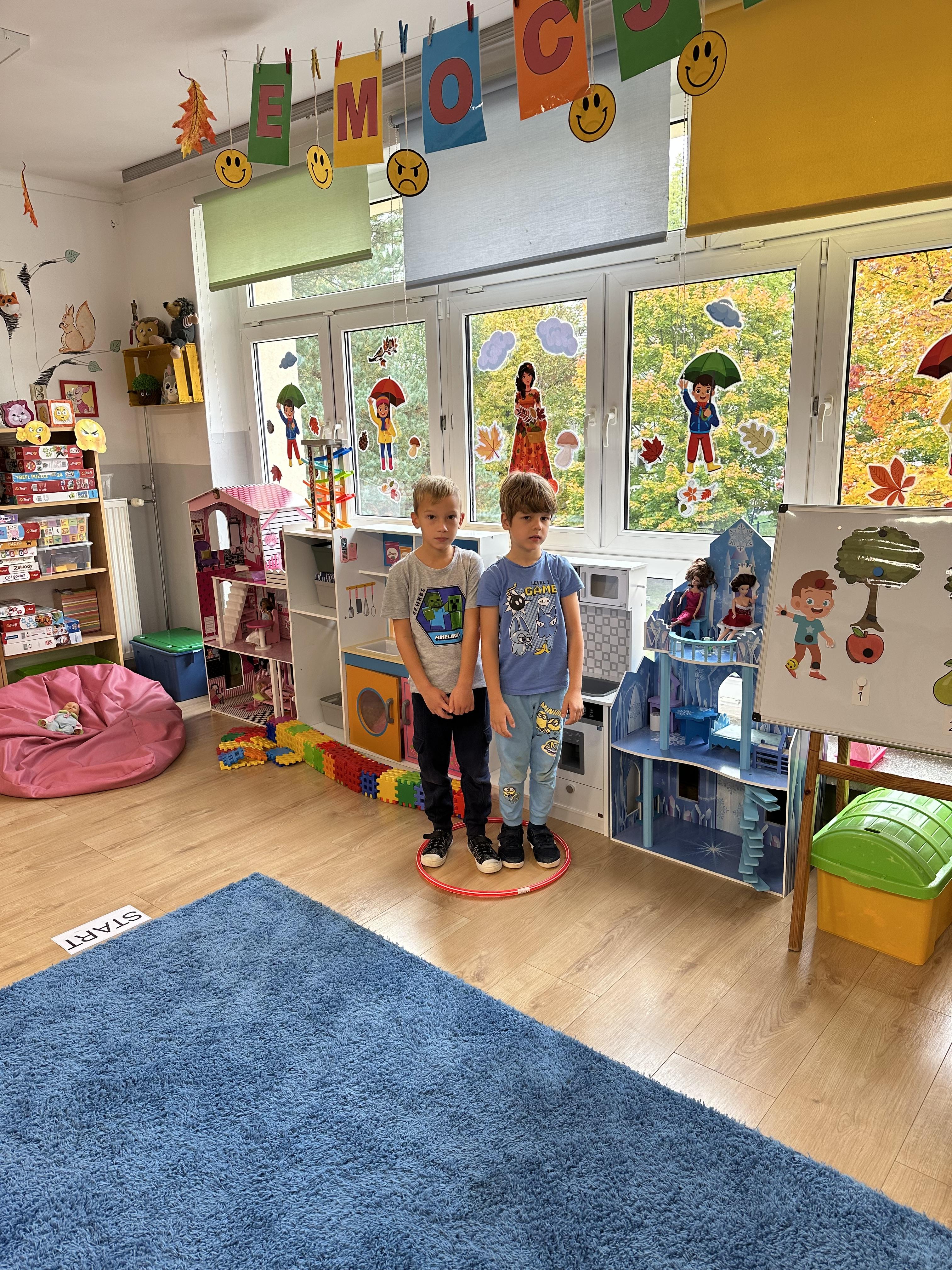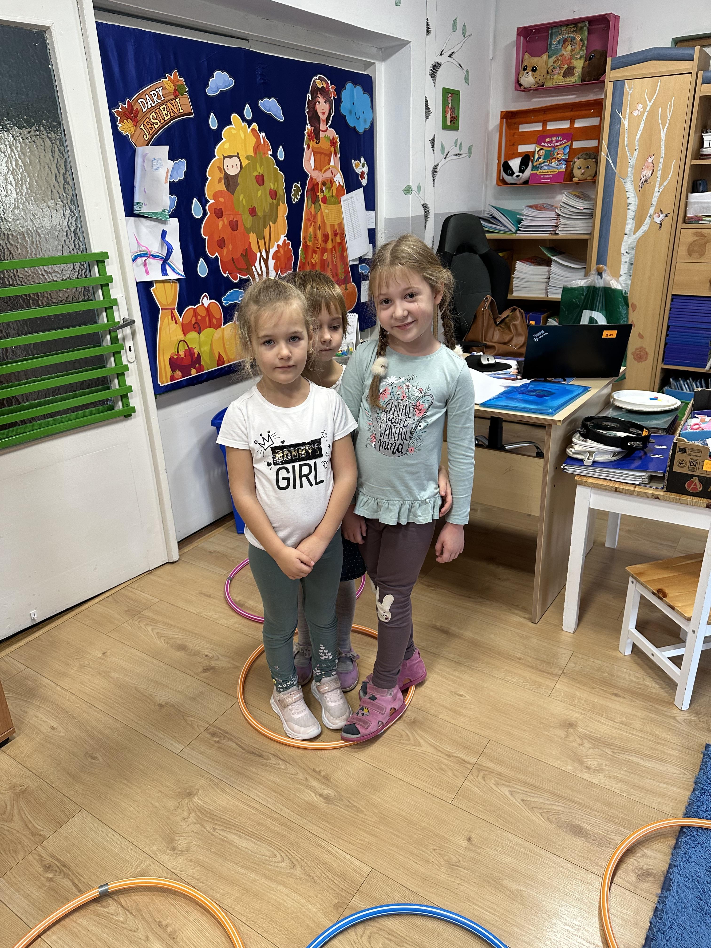 Poniedziałek był poświęcony kształtowaniu umiejętności wyrażania emocji oraz rozpoznawania uczucia smutku. Podczas porannej gimnastyki dzieci kształtowały sprawność fizyczną, wykonywały ćwiczenia rozciągające i wzmacniające mięśnie nóg. Opowiadanie Marii Pawlisz ,,Jesienne choroby” było punktem wyjścia do rozmowy o chorobach i samopoczuciu, które im towarzyszy. Dzieci dzieliły się swoimi doświadczeniami i sposobami na poprawę nastroju podczas przeziębienia. W trakcie zabawy „Lekarstwo na smutki” jedno z dzieci udawało smutne, pozostałe miały za zadanie je pocieszyć i rozweselić. Podczas zabawy dydaktycznej „W czasie choroby” inspirowanej opowiadaniem dzieci wspólnie zastanawiały się, jakie mogą być ,,lekarstwa” na smutki. Uczyły się uzasadniania swoich wyborów. Następnie poruszały się po sali do muzyki według wskazówek nauczyciela. Brały również udział w ćwiczeniach gimnastycznych, rozwijały szybkość i kształtowały mięśnie tułowia, wykonując skłony. Podczas zabawy „Tak się czuję, gdy…” uczyły się rozmawiać otwarcie o emocjach i o sytuacjach, które je powodują. We wtorek z samego rana ćwiczyły motorykę narządów mowy i wysłuchały piosenki ,,Smaczniejsze niż słodycze”. Następnie zastanawiały się nad przesłaniem utworu. Dzieci wspólnie doszły do wniosku, że warzywa i owoce są zdrowsze dla organizmu. Nauczyły się słów refrenu piosenki na pamięć. W kolejnej części dnia zapoznały się z wielką i małą literą T, t. Dzieliły słowo ,,tata” na sylaby i rytmicznie uderzały w instrument, przeliczając liczbę sylab. Podczas zabaw wymieniały dowolne słowa rozpoczynające się głoską t. Układały schemat słowa ,,tata” z kartoników i rysowały t palcem po dywanie, w powietrzu. Przy stolikach utrwalały znajomość poznanych liter, wykonując ćwiczenia. Po południu ozdobiły szablon litery T według własnego pomysłu. W środę dzieci poznały, czym są ceny i co oznacza słowo ,,cenny”. Po wysłuchaniu wiersza Barbary Lewandowskiej przedszkolaki sprawdzały umiejętność metaforycznego rozumienia sformułowań. Podczas zabawy ,,owoce jesieni” dzieci utrwalały znajomość darów jesieni i odróżniały owoce od warzyw. W czasie zabaw: „Ile warzyw dobrać?”, „Na straganie” i ,,Paski papryki” zapoznały się z liczbą 3 w aspekcie kardynalnym, porządkowym i miarowym. Nauczyły się zapisu graficznego 3 i dzieliły się spostrzeżeniami, jakie przedmioty przypominają im tę liczbę. Zakończyły dzień zabawami rozwijającymi pamięć i koncentrację oraz zabawą ruchową, integrującą grupę. W czwartek dzieci poznawały, jak wyglądają poszczególne warzywa po przekrojeniu ich na pół. Wiersz Elżbiety Śnieżowskiej-Bielak stanowił punkt wyjścia do rozmowy o grzankach i potrawach z warzyw i owoców, które jedzą dzieci. W dalszej części dnia przedszkolaki brały udział w zabawach rozwijających poczucie sprawstwa, kształtujących pamięć słuchową oraz ćwiczeniach językowych.