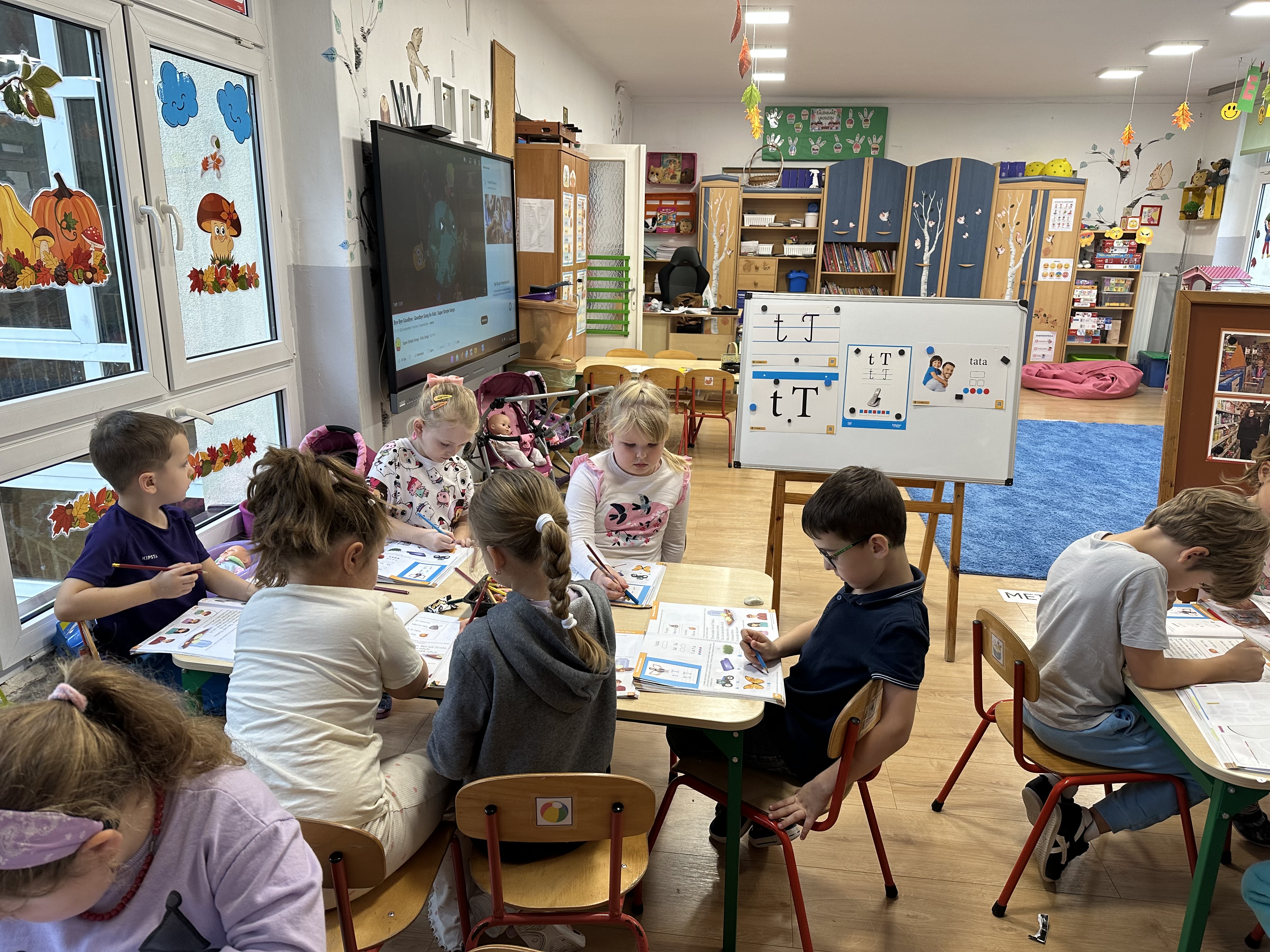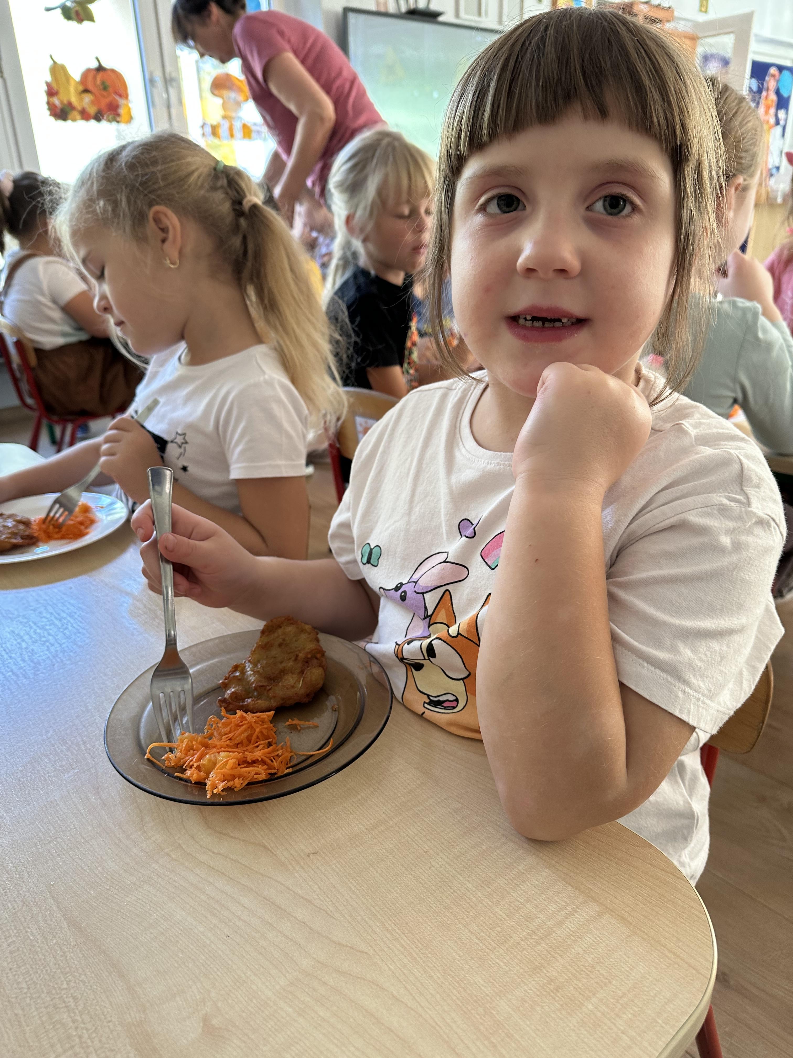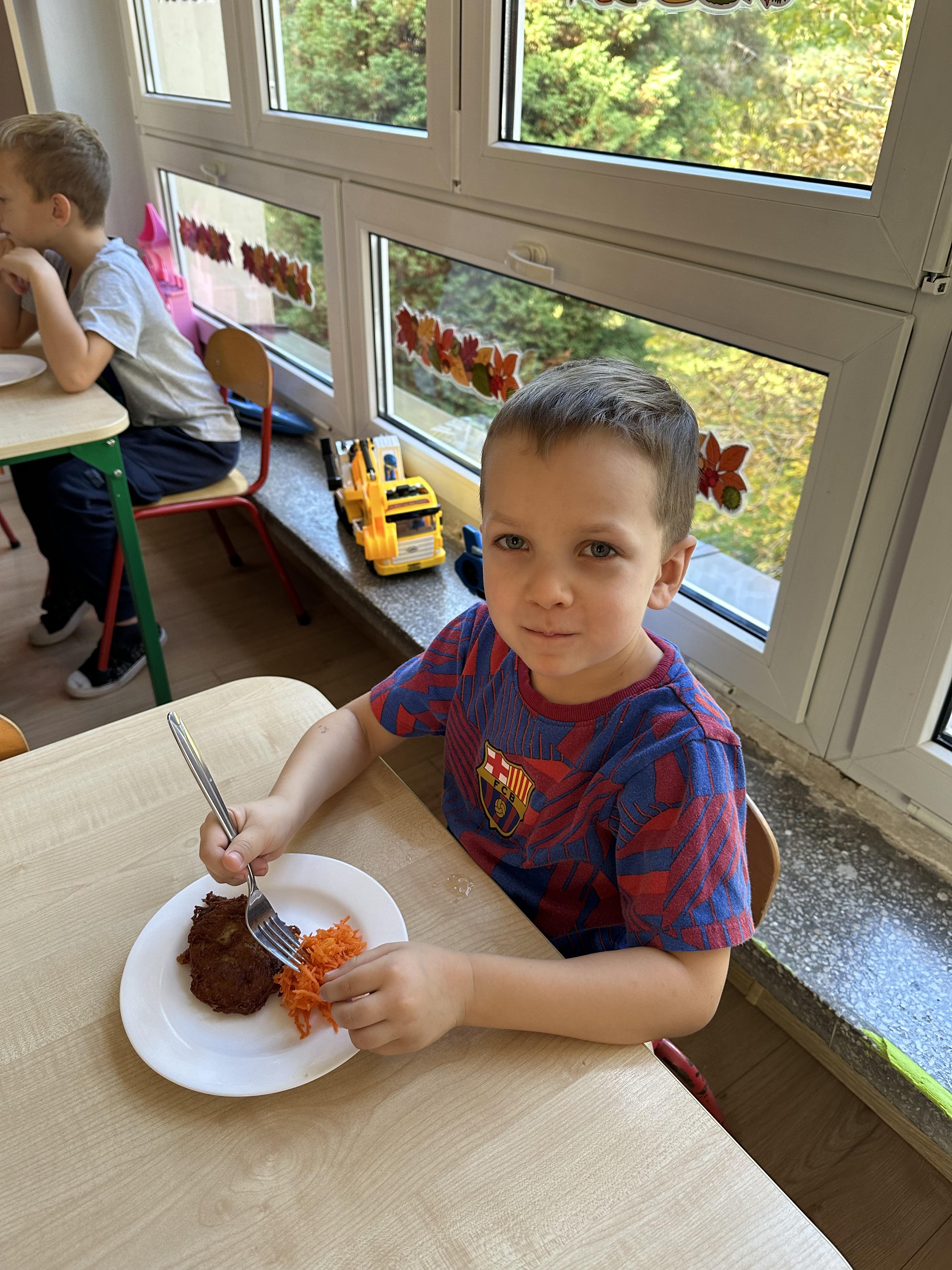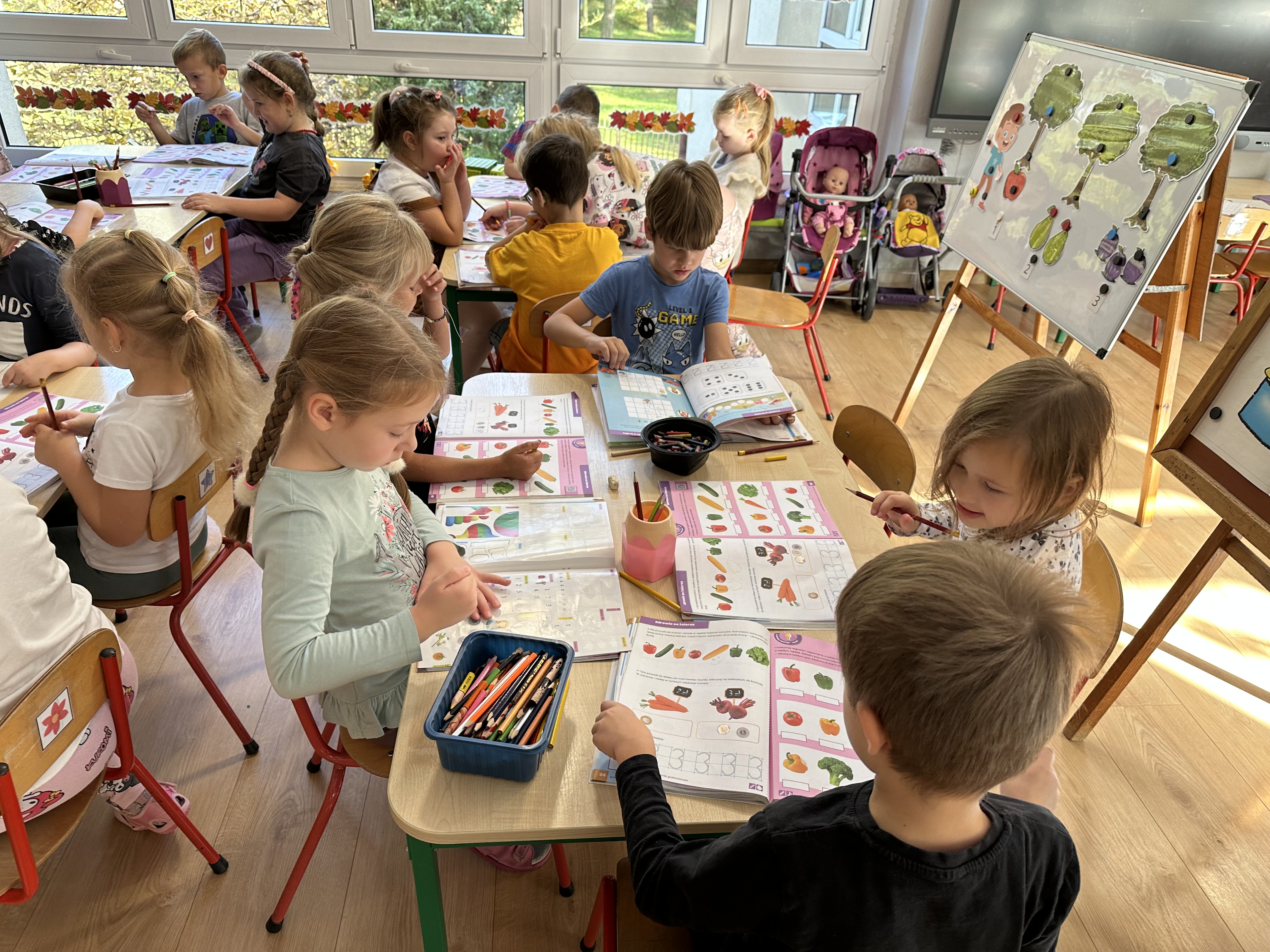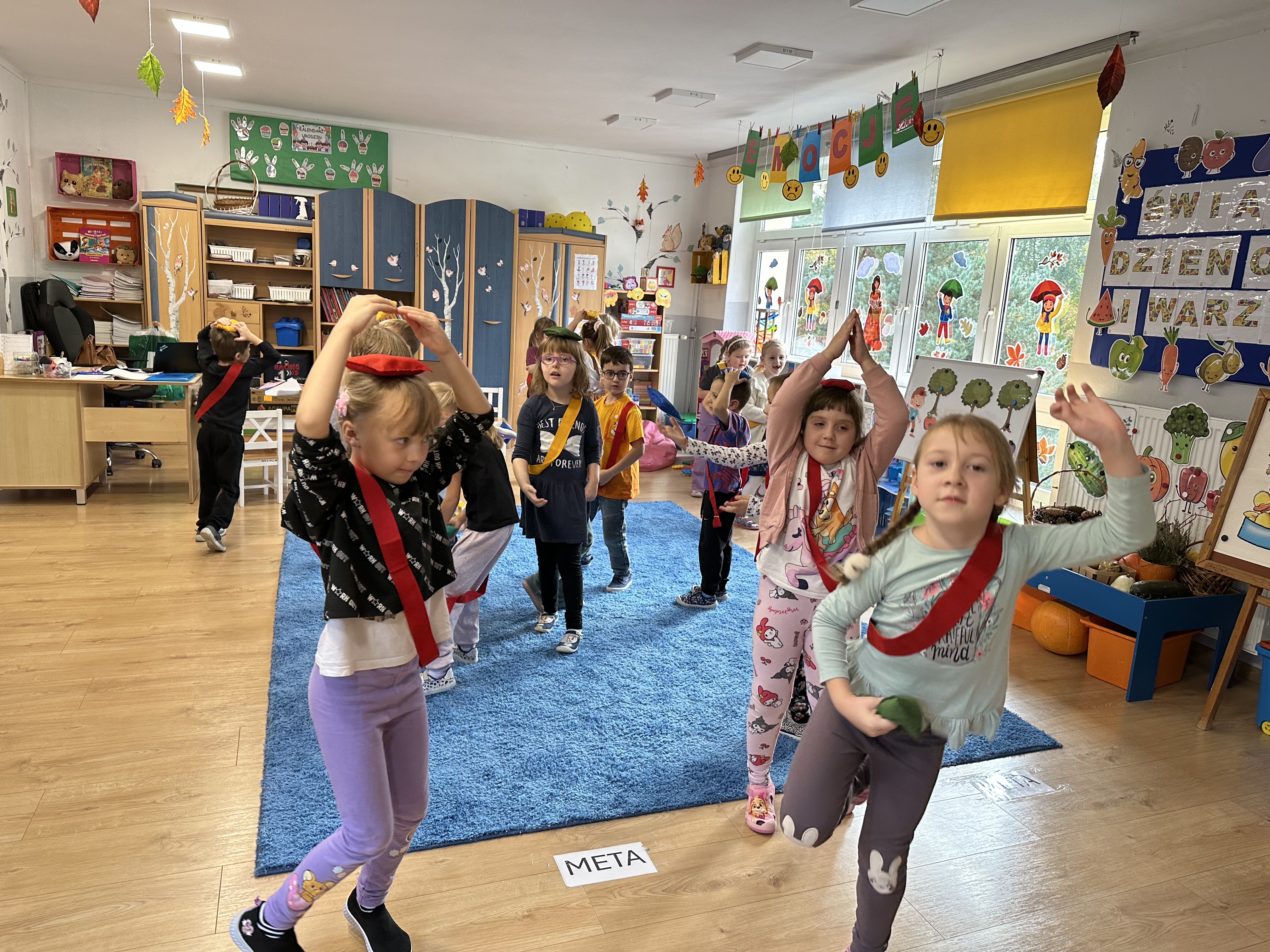Poniedziałek był poświęcony kształtowaniu umiejętności wyrażania emocji oraz rozpoznawania uczucia smutku. Podczas porannej gimnastyki dzieci kształtowały sprawność fizyczną, wykonywały ćwiczenia rozciągające i wzmacniające mięśnie nóg. Opowiadanie Marii Pawlisz ,,Jesienne choroby” było punktem wyjścia do rozmowy o chorobach i samopoczuciu, które im towarzyszy. Dzieci dzieliły się swoimi doświadczeniami i sposobami na poprawę nastroju podczas przeziębienia. W trakcie zabawy „Lekarstwo na smutki” jedno z dzieci udawało smutne, pozostałe miały za zadanie je pocieszyć i rozweselić. Podczas zabawy dydaktycznej „W czasie choroby” inspirowanej opowiadaniem dzieci wspólnie zastanawiały się, jakie mogą być ,,lekarstwa” na smutki. Uczyły się uzasadniania swoich wyborów. Następnie poruszały się po sali do muzyki według wskazówek nauczyciela. Brały również udział w ćwiczeniach gimnastycznych, rozwijały szybkość i kształtowały mięśnie tułowia, wykonując skłony. Podczas zabawy „Tak się czuję, gdy…” uczyły się rozmawiać otwarcie o emocjach i o sytuacjach, które je powodują. We wtorek z samego rana ćwiczyły motorykę narządów mowy i wysłuchały piosenki ,,Smaczniejsze niż słodycze”. Następnie zastanawiały się nad przesłaniem utworu. Dzieci wspólnie doszły do wniosku, że warzywa i owoce są zdrowsze dla organizmu. Nauczyły się słów refrenu piosenki na pamięć. W kolejnej części dnia zapoznały się z wielką i małą literą T, t. Dzieliły słowo ,,tata” na sylaby i rytmicznie uderzały w instrument, przeliczając liczbę sylab. Podczas zabaw wymieniały dowolne słowa rozpoczynające się głoską t. Układały schemat słowa ,,tata” z kartoników i rysowały t palcem po dywanie, w powietrzu. Przy stolikach utrwalały znajomość poznanych liter, wykonując ćwiczenia. Po południu ozdobiły szablon litery T według własnego pomysłu. W środę dzieci poznały, czym są ceny i co oznacza słowo ,,cenny”. Po wysłuchaniu wiersza Barbary Lewandowskiej przedszkolaki sprawdzały umiejętność metaforycznego rozumienia sformułowań. Podczas zabawy ,,owoce jesieni” dzieci utrwalały znajomość darów jesieni i odróżniały owoce od warzyw. W czasie zabaw: „Ile warzyw dobrać?”, „Na straganie” i ,,Paski papryki” zapoznały się z liczbą 3 w aspekcie kardynalnym, porządkowym i miarowym. Nauczyły się zapisu graficznego 3 i dzieliły się spostrzeżeniami, jakie przedmioty przypominają im tę liczbę. Zakończyły dzień zabawami rozwijającymi pamięć i koncentrację oraz zabawą ruchową, integrującą grupę. W czwartek dzieci poznawały, jak wyglądają poszczególne warzywa po przekrojeniu ich na pół. Wiersz Elżbiety Śnieżowskiej-Bielak stanowił punkt wyjścia do rozmowy o grzankach i potrawach z warzyw i owoców, które jedzą dzieci. W dalszej części dnia przedszkolaki brały udział w zabawach rozwijających poczucie sprawstwa, kształtujących pamięć słuchową oraz ćwiczeniach językowych.