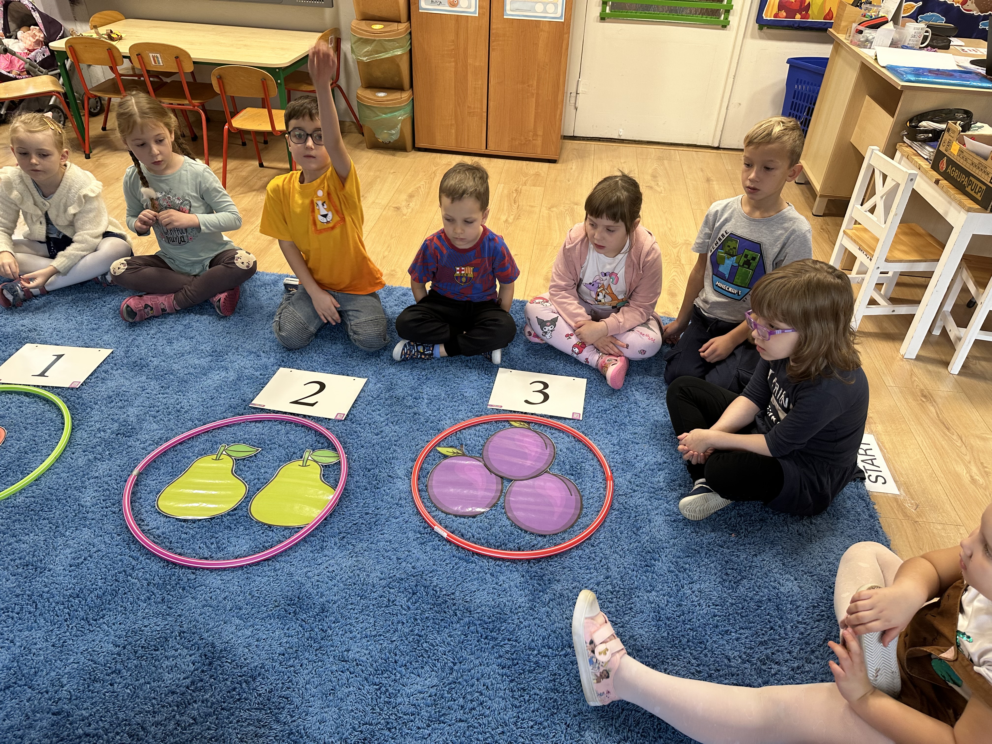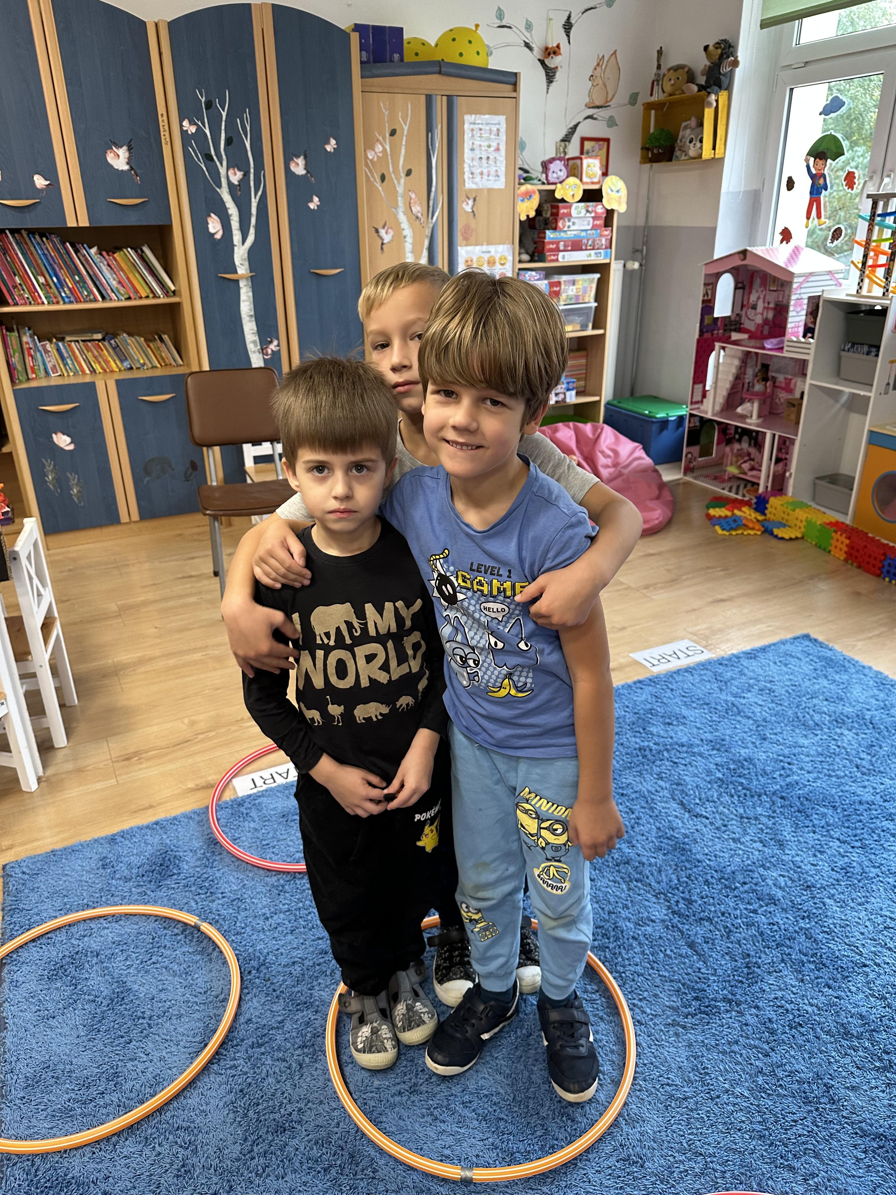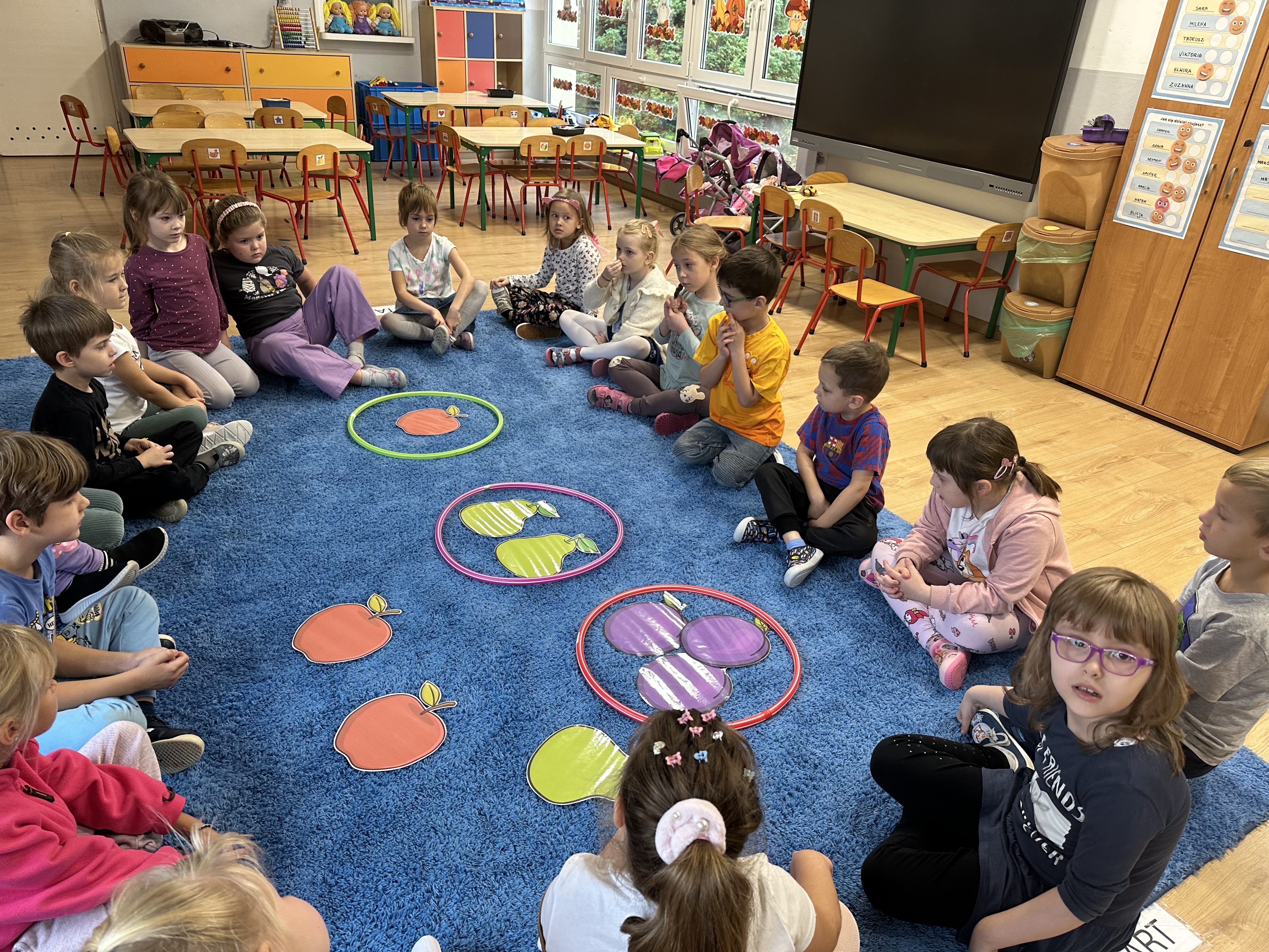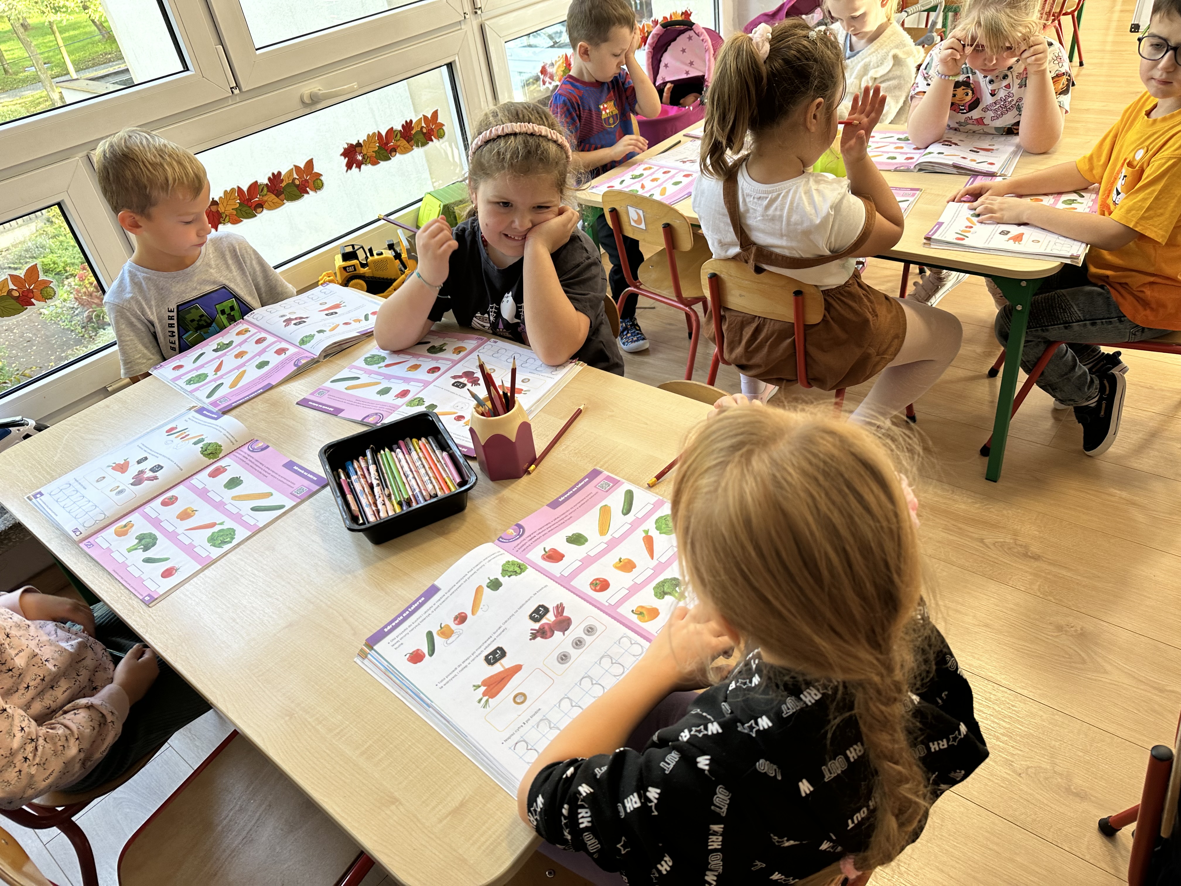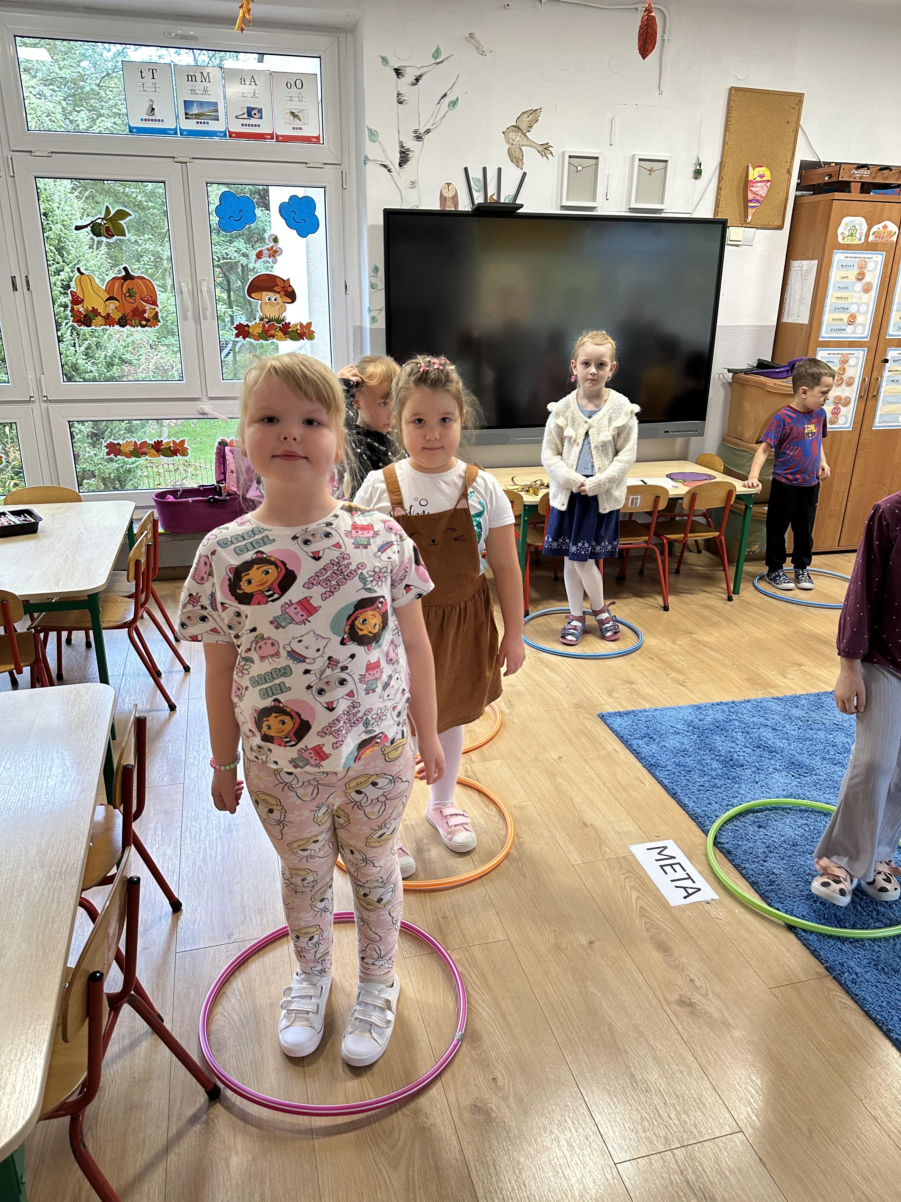 Poniedziałek był poświęcony kształtowaniu umiejętności wyrażania emocji oraz rozpoznawania uczucia smutku. Podczas porannej gimnastyki dzieci kształtowały sprawność fizyczną, wykonywały ćwiczenia rozciągające i wzmacniające mięśnie nóg. Opowiadanie Marii Pawlisz ,,Jesienne choroby” było punktem wyjścia do rozmowy o chorobach i samopoczuciu, które im towarzyszy. Dzieci dzieliły się swoimi doświadczeniami i sposobami na poprawę nastroju podczas przeziębienia. W trakcie zabawy „Lekarstwo na smutki” jedno z dzieci udawało smutne, pozostałe miały za zadanie je pocieszyć i rozweselić. Podczas zabawy dydaktycznej „W czasie choroby” inspirowanej opowiadaniem dzieci wspólnie zastanawiały się, jakie mogą być ,,lekarstwa” na smutki. Uczyły się uzasadniania swoich wyborów. Następnie poruszały się po sali do muzyki według wskazówek nauczyciela. Brały również udział w ćwiczeniach gimnastycznych, rozwijały szybkość i kształtowały mięśnie tułowia, wykonując skłony. Podczas zabawy „Tak się czuję, gdy…” uczyły się rozmawiać otwarcie o emocjach i o sytuacjach, które je powodują. We wtorek z samego rana ćwiczyły motorykę narządów mowy i wysłuchały piosenki ,,Smaczniejsze niż słodycze”. Następnie zastanawiały się nad przesłaniem utworu. Dzieci wspólnie doszły do wniosku, że warzywa i owoce są zdrowsze dla organizmu. Nauczyły się słów refrenu piosenki na pamięć. W kolejnej części dnia zapoznały się z wielką i małą literą T, t. Dzieliły słowo ,,tata” na sylaby i rytmicznie uderzały w instrument, przeliczając liczbę sylab. Podczas zabaw wymieniały dowolne słowa rozpoczynające się głoską t. Układały schemat słowa ,,tata” z kartoników i rysowały t palcem po dywanie, w powietrzu. Przy stolikach utrwalały znajomość poznanych liter, wykonując ćwiczenia. Po południu ozdobiły szablon litery T według własnego pomysłu. W środę dzieci poznały, czym są ceny i co oznacza słowo ,,cenny”. Po wysłuchaniu wiersza Barbary Lewandowskiej przedszkolaki sprawdzały umiejętność metaforycznego rozumienia sformułowań. Podczas zabawy ,,owoce jesieni” dzieci utrwalały znajomość darów jesieni i odróżniały owoce od warzyw. W czasie zabaw: „Ile warzyw dobrać?”, „Na straganie” i ,,Paski papryki” zapoznały się z liczbą 3 w aspekcie kardynalnym, porządkowym i miarowym. Nauczyły się zapisu graficznego 3 i dzieliły się spostrzeżeniami, jakie przedmioty przypominają im tę liczbę. Zakończyły dzień zabawami rozwijającymi pamięć i koncentrację oraz zabawą ruchową, integrującą grupę. W czwartek dzieci poznawały, jak wyglądają poszczególne warzywa po przekrojeniu ich na pół. Wiersz Elżbiety Śnieżowskiej-Bielak stanowił punkt wyjścia do rozmowy o grzankach i potrawach z warzyw i owoców, które jedzą dzieci. W dalszej części dnia przedszkolaki brały udział w zabawach rozwijających poczucie sprawstwa, kształtujących pamięć słuchową oraz ćwiczeniach językowych.