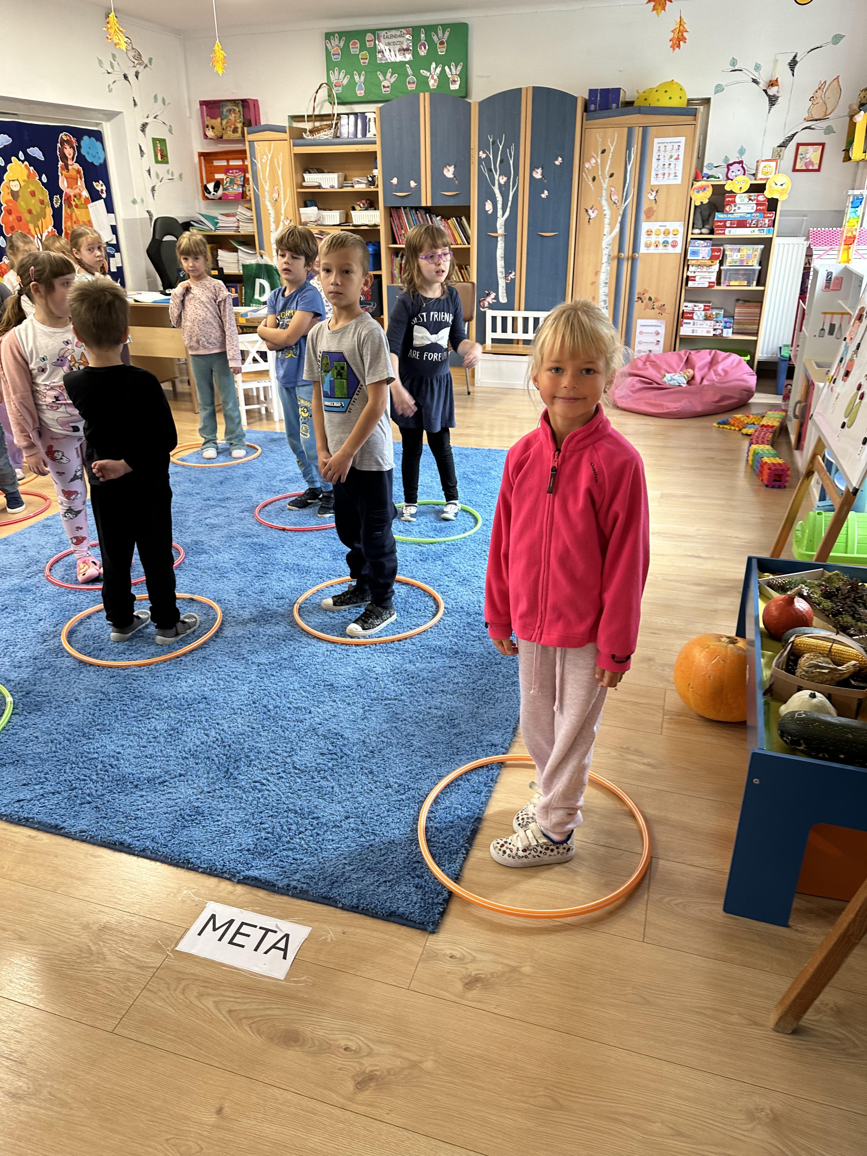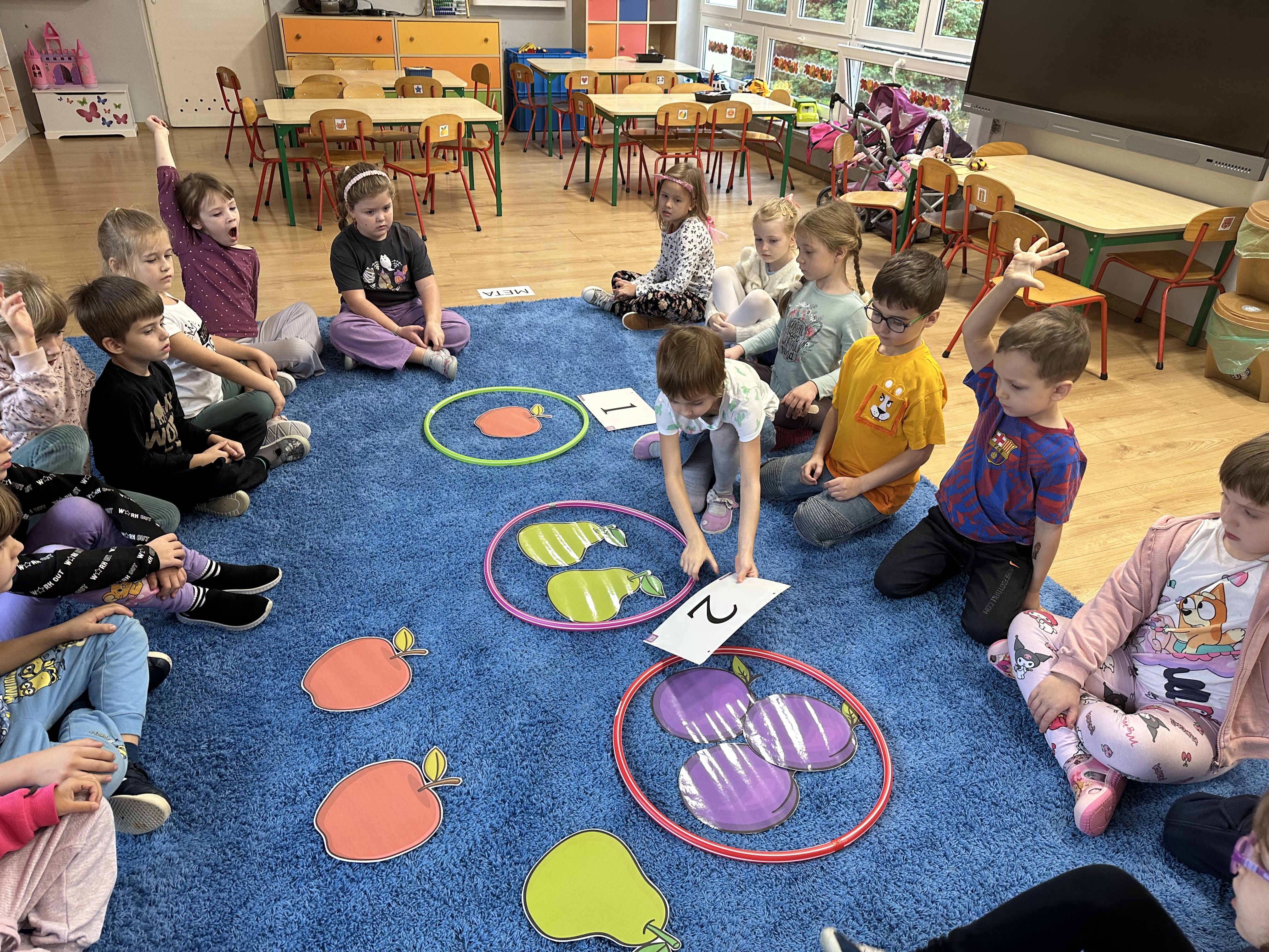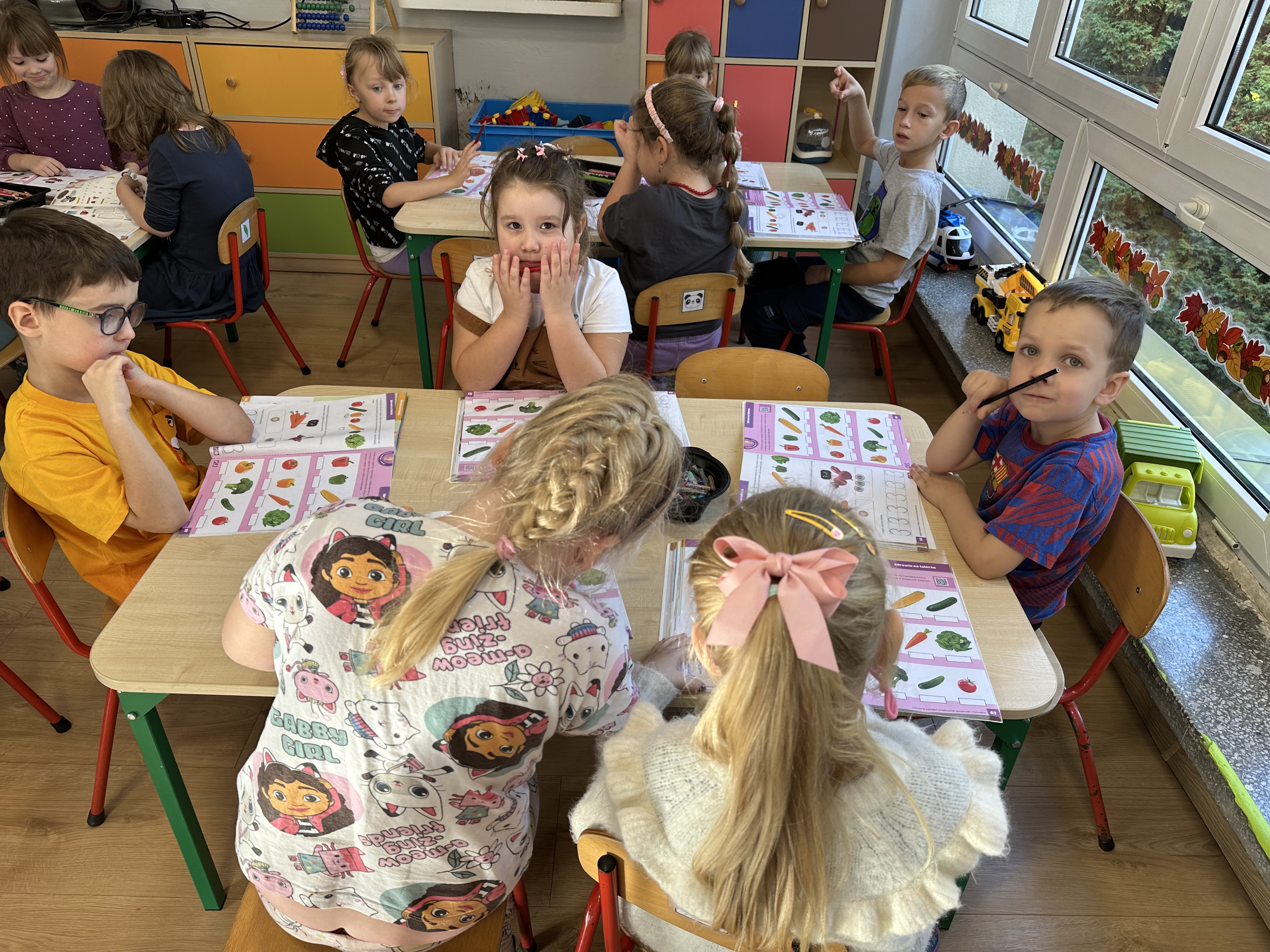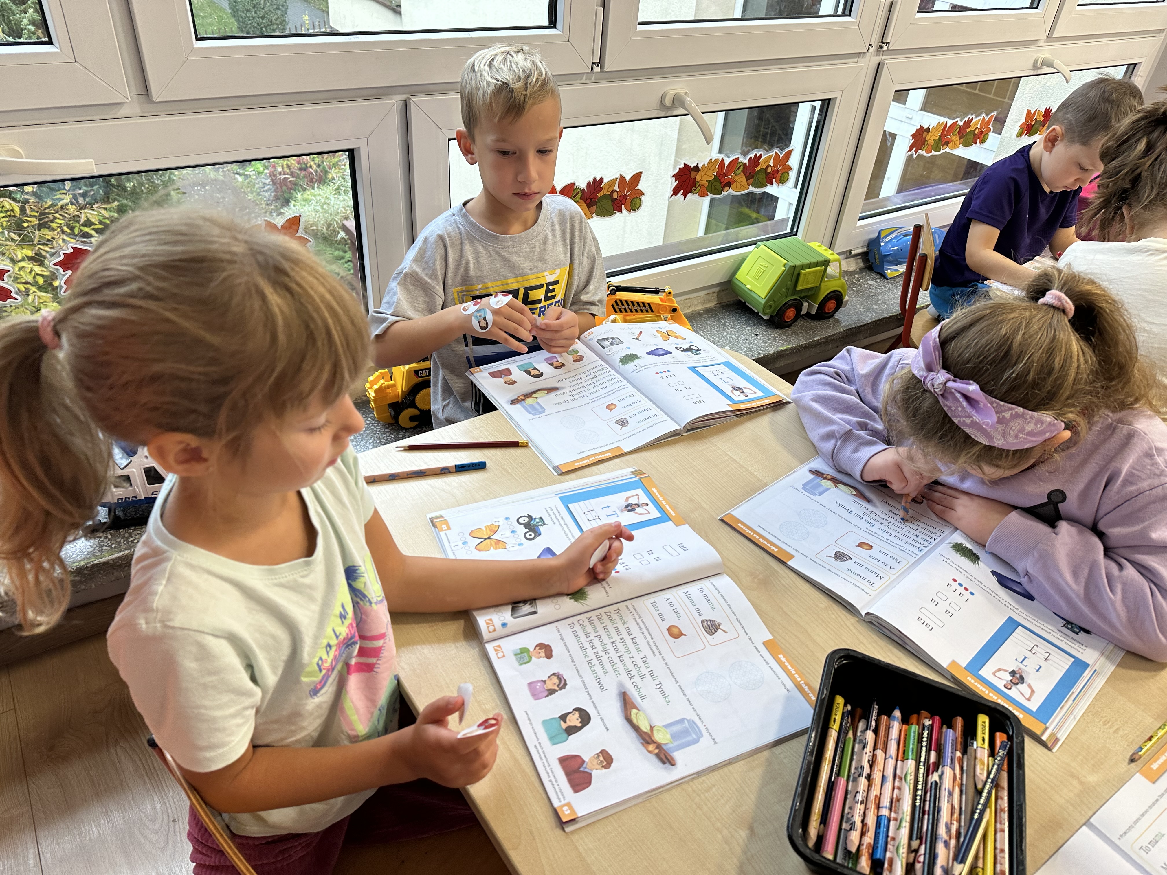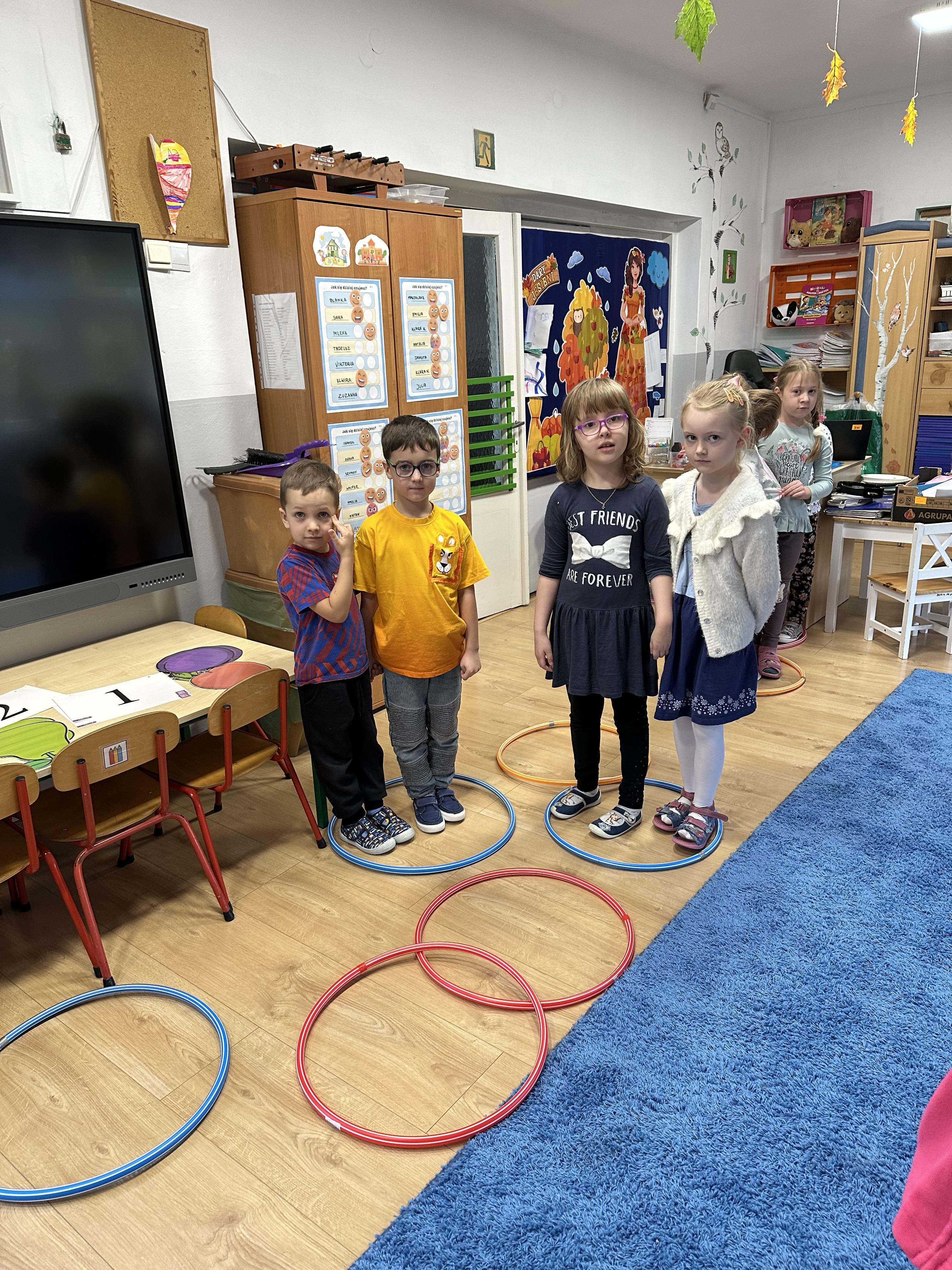 Poniedziałek był poświęcony kształtowaniu umiejętności wyrażania emocji oraz rozpoznawania uczucia smutku. Podczas porannej gimnastyki dzieci kształtowały sprawność fizyczną, wykonywały ćwiczenia rozciągające i wzmacniające mięśnie nóg. Opowiadanie Marii Pawlisz ,,Jesienne choroby” było punktem wyjścia do rozmowy o chorobach i samopoczuciu, które im towarzyszy. Dzieci dzieliły się swoimi doświadczeniami i sposobami na poprawę nastroju podczas przeziębienia. W trakcie zabawy „Lekarstwo na smutki” jedno z dzieci udawało smutne, pozostałe miały za zadanie je pocieszyć i rozweselić. Podczas zabawy dydaktycznej „W czasie choroby” inspirowanej opowiadaniem dzieci wspólnie zastanawiały się, jakie mogą być ,,lekarstwa” na smutki. Uczyły się uzasadniania swoich wyborów. Następnie poruszały się po sali do muzyki według wskazówek nauczyciela. Brały również udział w ćwiczeniach gimnastycznych, rozwijały szybkość i kształtowały mięśnie tułowia, wykonując skłony. Podczas zabawy „Tak się czuję, gdy…” uczyły się rozmawiać otwarcie o emocjach i o sytuacjach, które je powodują. We wtorek z samego rana ćwiczyły motorykę narządów mowy i wysłuchały piosenki ,,Smaczniejsze niż słodycze”. Następnie zastanawiały się nad przesłaniem utworu. Dzieci wspólnie doszły do wniosku, że warzywa i owoce są zdrowsze dla organizmu. Nauczyły się słów refrenu piosenki na pamięć. W kolejnej części dnia zapoznały się z wielką i małą literą T, t. Dzieliły słowo ,,tata” na sylaby i rytmicznie uderzały w instrument, przeliczając liczbę sylab. Podczas zabaw wymieniały dowolne słowa rozpoczynające się głoską t. Układały schemat słowa ,,tata” z kartoników i rysowały t palcem po dywanie, w powietrzu. Przy stolikach utrwalały znajomość poznanych liter, wykonując ćwiczenia. Po południu ozdobiły szablon litery T według własnego pomysłu. W środę dzieci poznały, czym są ceny i co oznacza słowo ,,cenny”. Po wysłuchaniu wiersza Barbary Lewandowskiej przedszkolaki sprawdzały umiejętność metaforycznego rozumienia sformułowań. Podczas zabawy ,,owoce jesieni” dzieci utrwalały znajomość darów jesieni i odróżniały owoce od warzyw. W czasie zabaw: „Ile warzyw dobrać?”, „Na straganie” i ,,Paski papryki” zapoznały się z liczbą 3 w aspekcie kardynalnym, porządkowym i miarowym. Nauczyły się zapisu graficznego 3 i dzieliły się spostrzeżeniami, jakie przedmioty przypominają im tę liczbę. Zakończyły dzień zabawami rozwijającymi pamięć i koncentrację oraz zabawą ruchową, integrującą grupę. W czwartek dzieci poznawały, jak wyglądają poszczególne warzywa po przekrojeniu ich na pół. Wiersz Elżbiety Śnieżowskiej-Bielak stanowił punkt wyjścia do rozmowy o grzankach i potrawach z warzyw i owoców, które jedzą dzieci. W dalszej części dnia przedszkolaki brały udział w zabawach rozwijających poczucie sprawstwa, kształtujących pamięć słuchową oraz ćwiczeniach językowych.