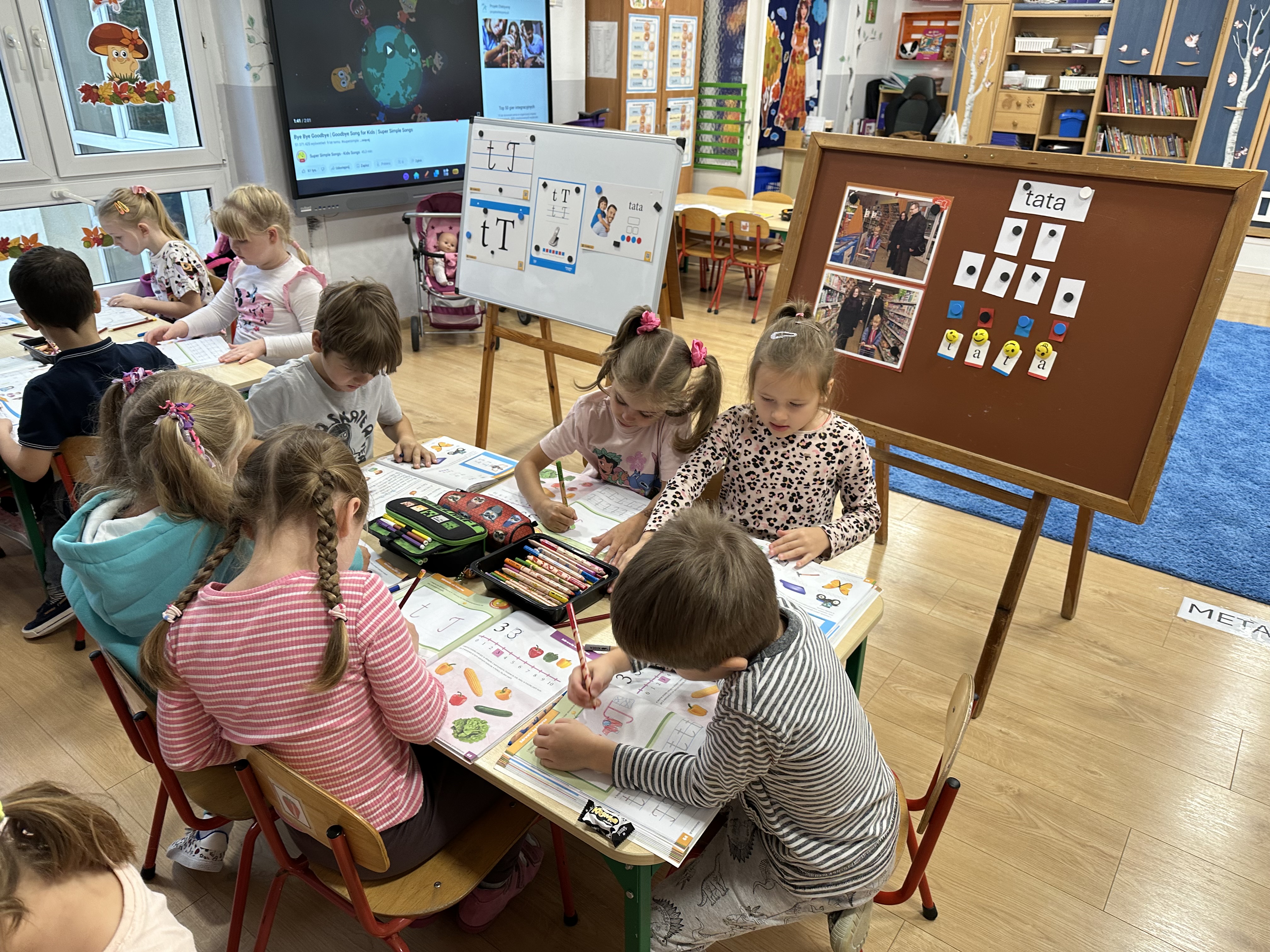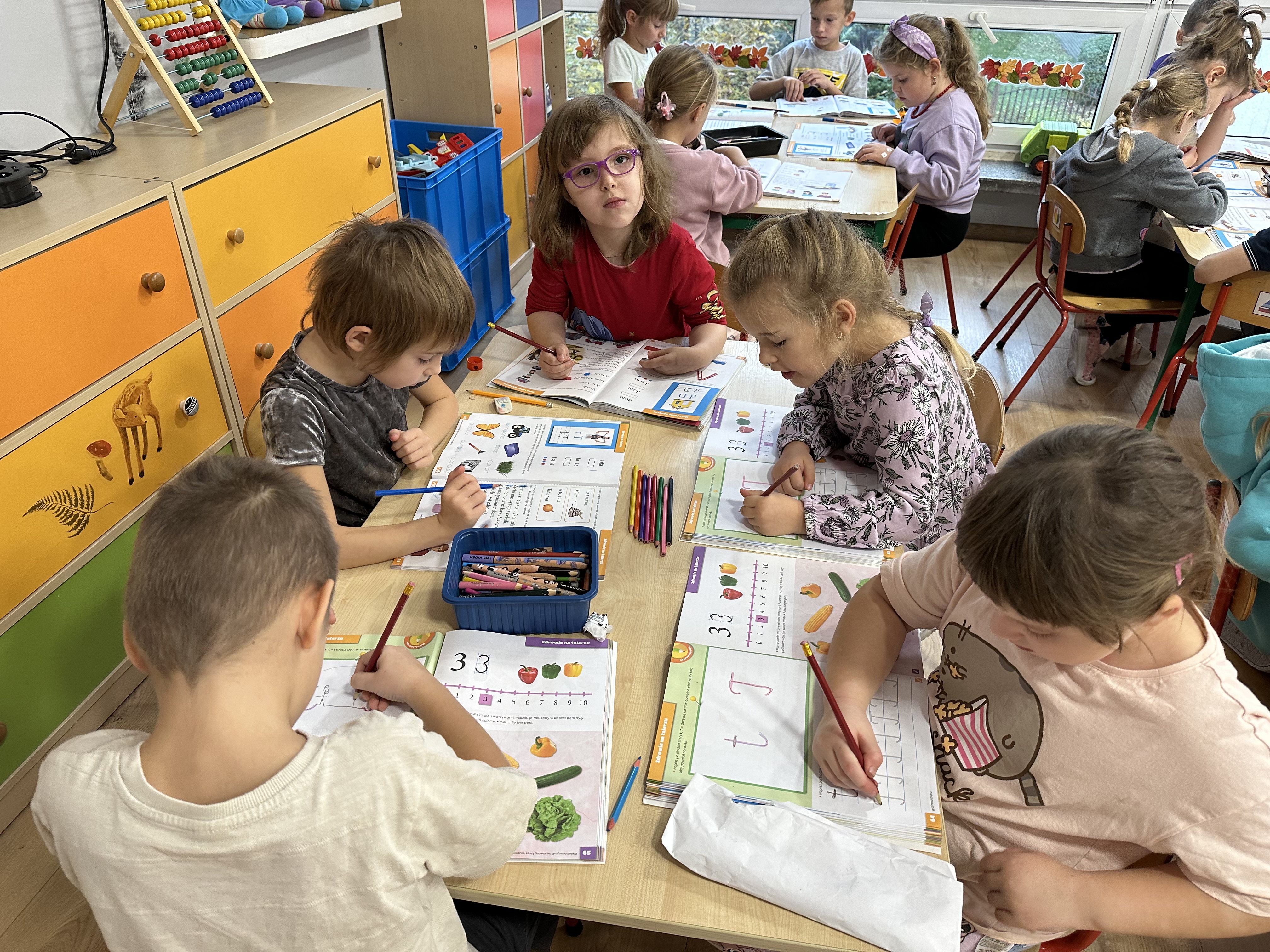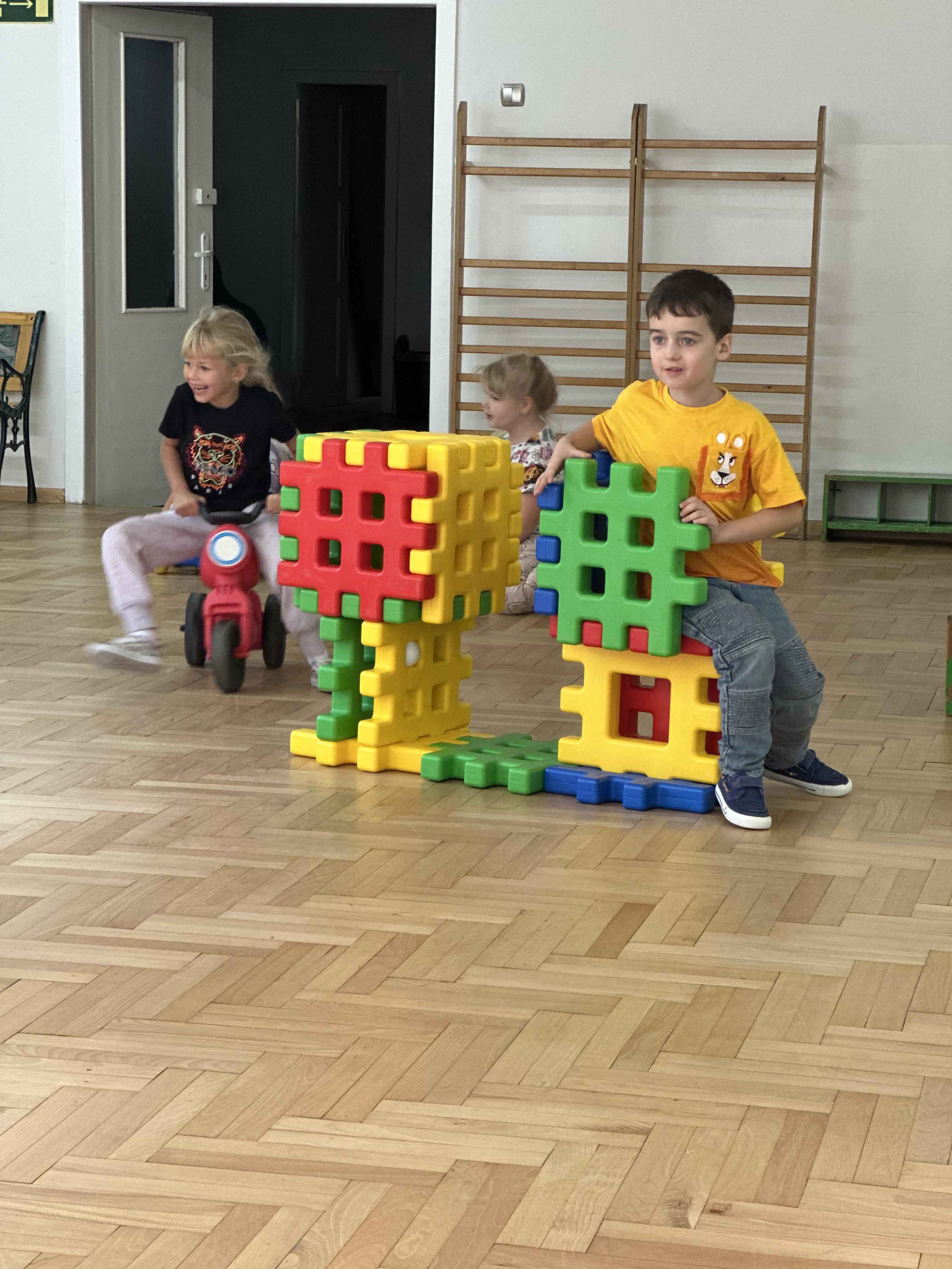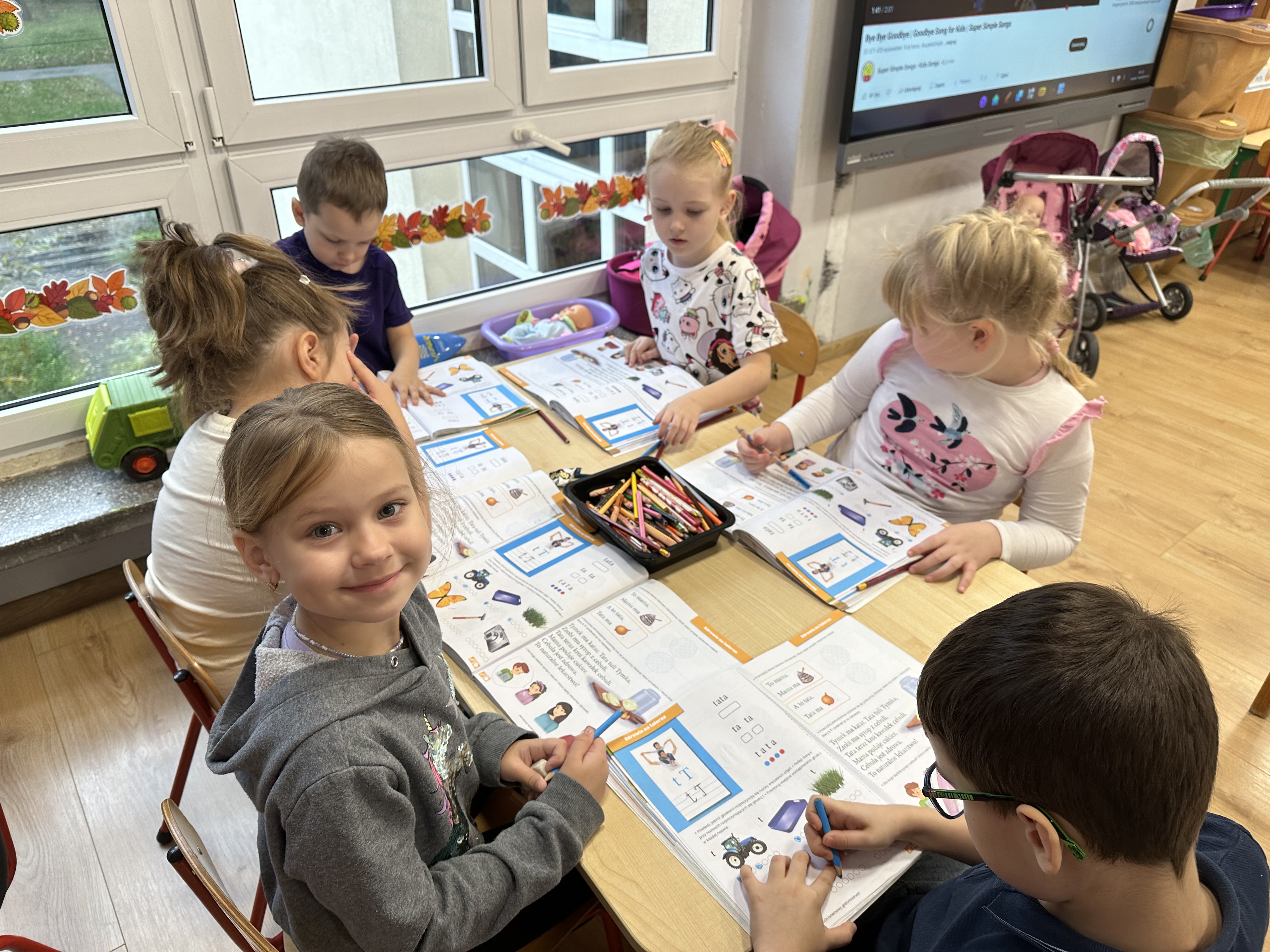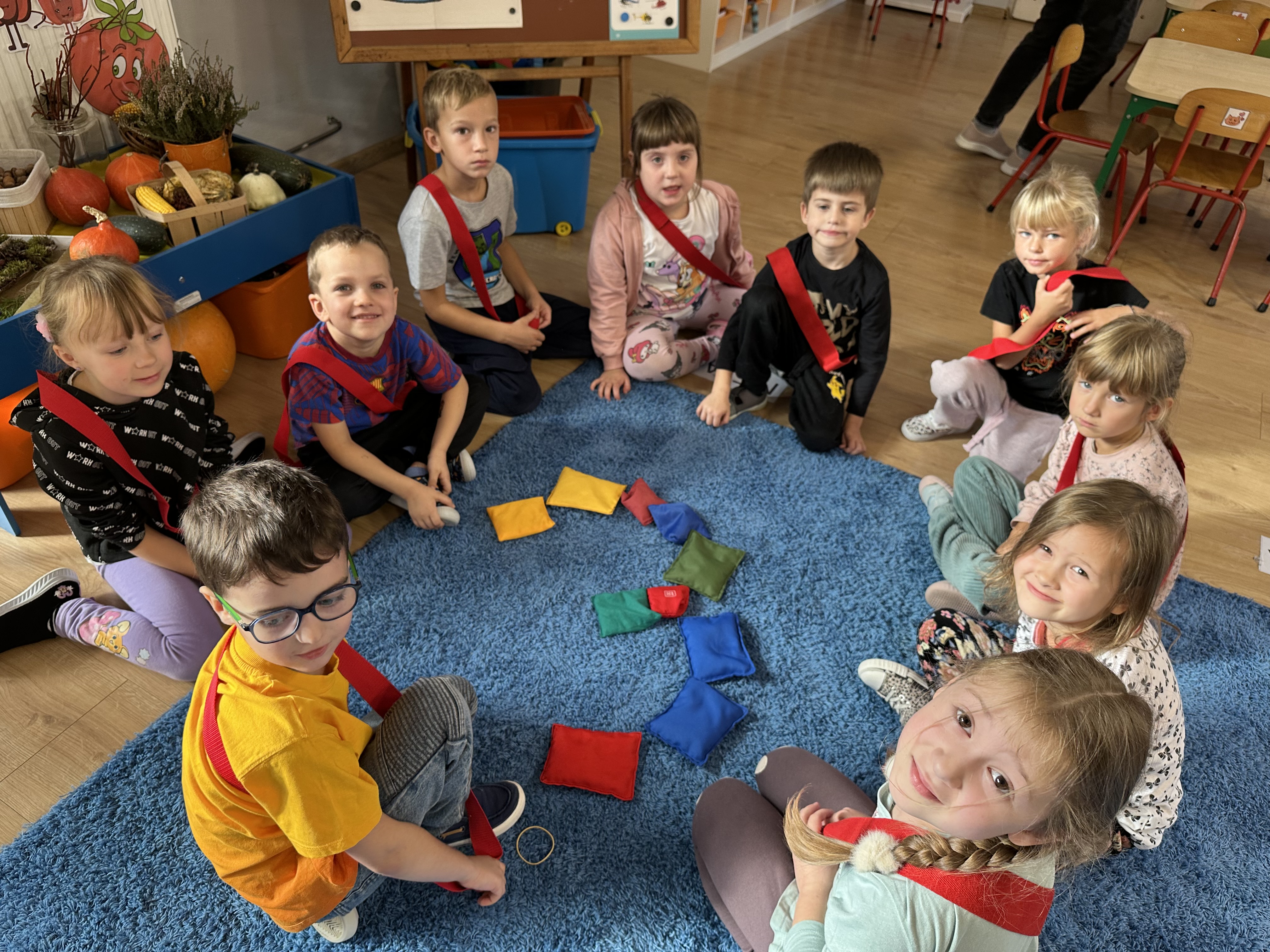 Poniedziałek był poświęcony kształtowaniu umiejętności wyrażania emocji oraz rozpoznawania uczucia smutku. Podczas porannej gimnastyki dzieci kształtowały sprawność fizyczną, wykonywały ćwiczenia rozciągające i wzmacniające mięśnie nóg. Opowiadanie Marii Pawlisz ,,Jesienne choroby” było punktem wyjścia do rozmowy o chorobach i samopoczuciu, które im towarzyszy. Dzieci dzieliły się swoimi doświadczeniami i sposobami na poprawę nastroju podczas przeziębienia. W trakcie zabawy „Lekarstwo na smutki” jedno z dzieci udawało smutne, pozostałe miały za zadanie je pocieszyć i rozweselić. Podczas zabawy dydaktycznej „W czasie choroby” inspirowanej opowiadaniem dzieci wspólnie zastanawiały się, jakie mogą być ,,lekarstwa” na smutki. Uczyły się uzasadniania swoich wyborów. Następnie poruszały się po sali do muzyki według wskazówek nauczyciela. Brały również udział w ćwiczeniach gimnastycznych, rozwijały szybkość i kształtowały mięśnie tułowia, wykonując skłony. Podczas zabawy „Tak się czuję, gdy…” uczyły się rozmawiać otwarcie o emocjach i o sytuacjach, które je powodują. We wtorek z samego rana ćwiczyły motorykę narządów mowy i wysłuchały piosenki ,,Smaczniejsze niż słodycze”. Następnie zastanawiały się nad przesłaniem utworu. Dzieci wspólnie doszły do wniosku, że warzywa i owoce są zdrowsze dla organizmu. Nauczyły się słów refrenu piosenki na pamięć. W kolejnej części dnia zapoznały się z wielką i małą literą T, t. Dzieliły słowo ,,tata” na sylaby i rytmicznie uderzały w instrument, przeliczając liczbę sylab. Podczas zabaw wymieniały dowolne słowa rozpoczynające się głoską t. Układały schemat słowa ,,tata” z kartoników i rysowały t palcem po dywanie, w powietrzu. Przy stolikach utrwalały znajomość poznanych liter, wykonując ćwiczenia. Po południu ozdobiły szablon litery T według własnego pomysłu. W środę dzieci poznały, czym są ceny i co oznacza słowo ,,cenny”. Po wysłuchaniu wiersza Barbary Lewandowskiej przedszkolaki sprawdzały umiejętność metaforycznego rozumienia sformułowań. Podczas zabawy ,,owoce jesieni” dzieci utrwalały znajomość darów jesieni i odróżniały owoce od warzyw. W czasie zabaw: „Ile warzyw dobrać?”, „Na straganie” i ,,Paski papryki” zapoznały się z liczbą 3 w aspekcie kardynalnym, porządkowym i miarowym. Nauczyły się zapisu graficznego 3 i dzieliły się spostrzeżeniami, jakie przedmioty przypominają im tę liczbę. Zakończyły dzień zabawami rozwijającymi pamięć i koncentrację oraz zabawą ruchową, integrującą grupę. W czwartek dzieci poznawały, jak wyglądają poszczególne warzywa po przekrojeniu ich na pół. Wiersz Elżbiety Śnieżowskiej-Bielak stanowił punkt wyjścia do rozmowy o grzankach i potrawach z warzyw i owoców, które jedzą dzieci. W dalszej części dnia przedszkolaki brały udział w zabawach rozwijających poczucie sprawstwa, kształtujących pamięć słuchową oraz ćwiczeniach językowych.