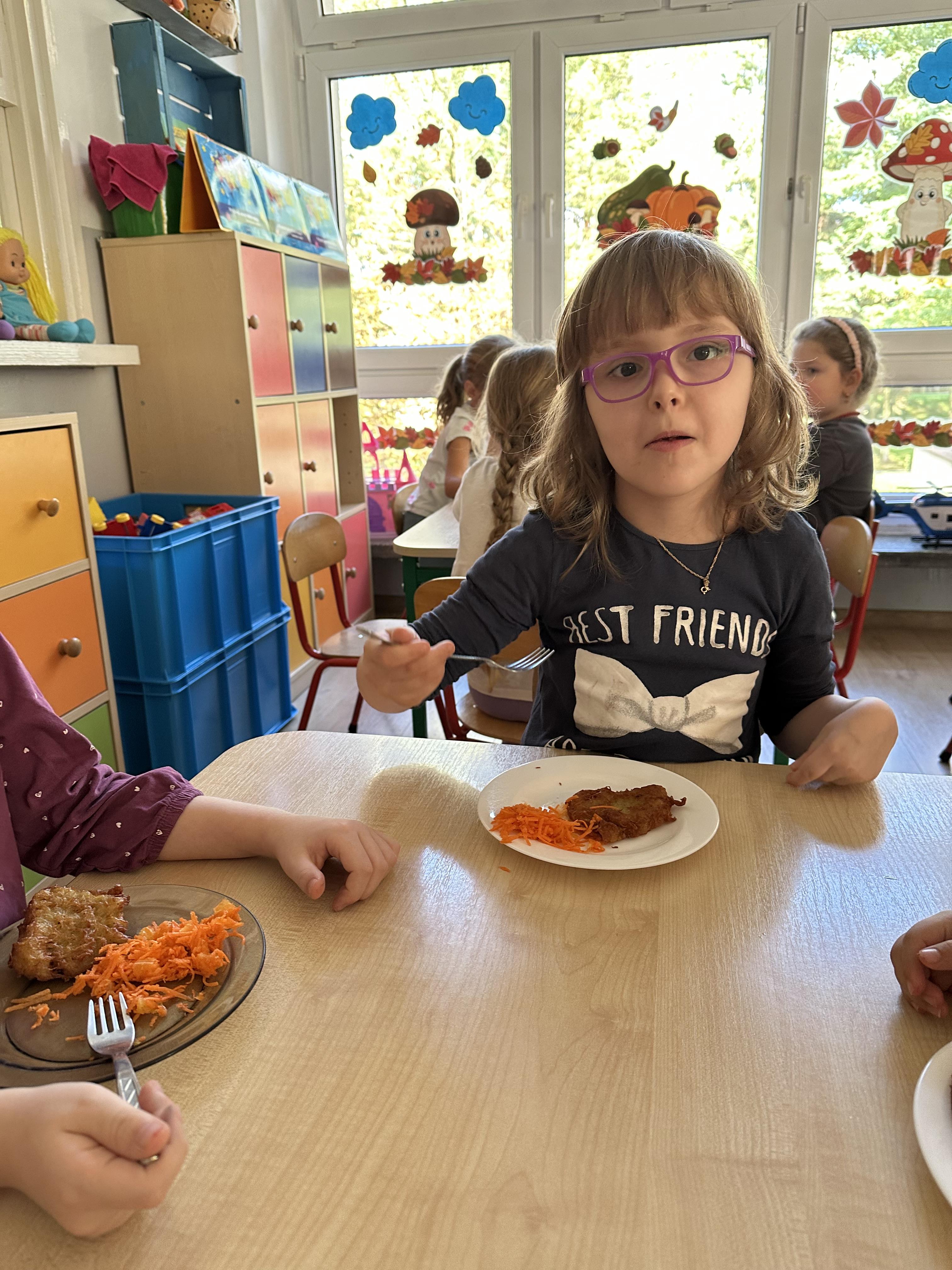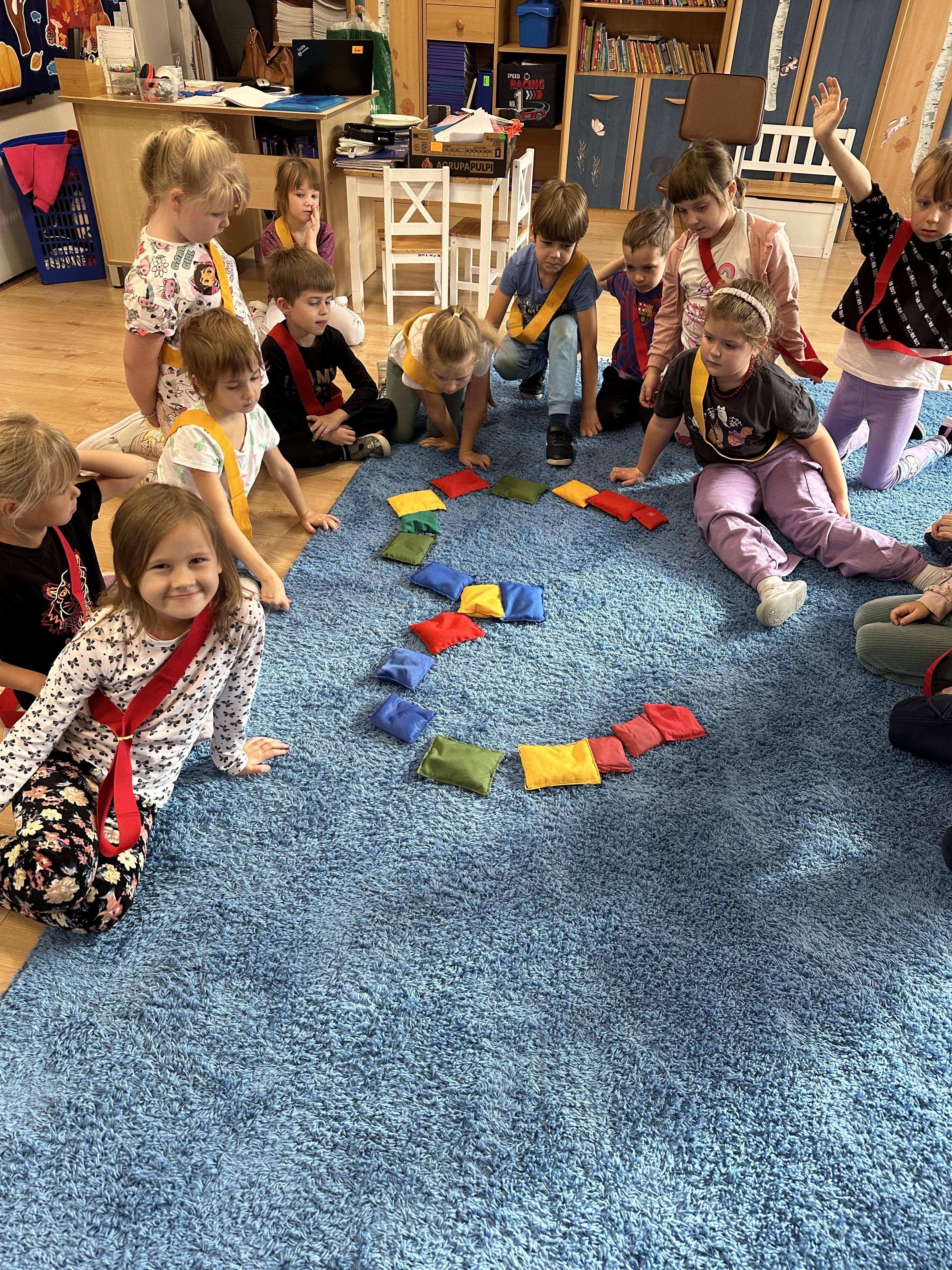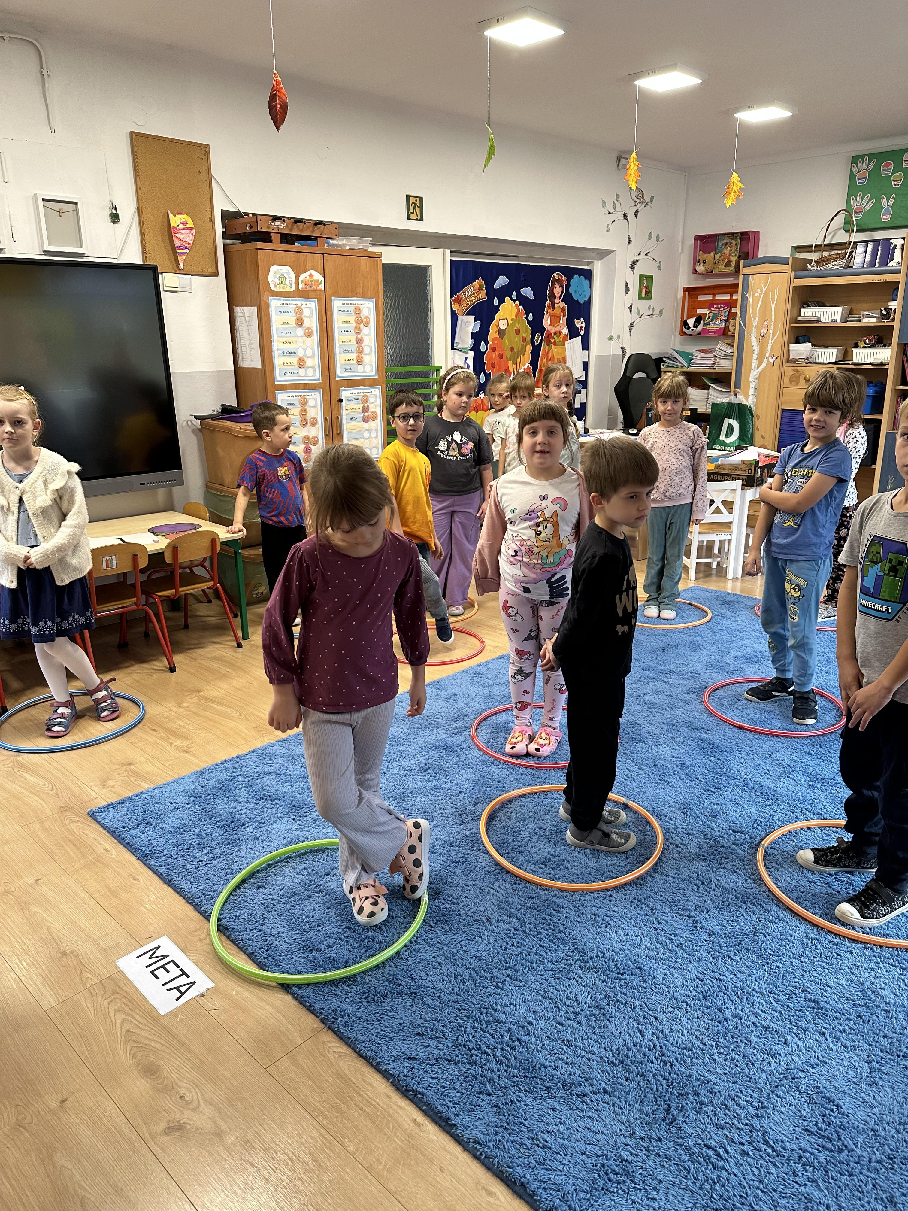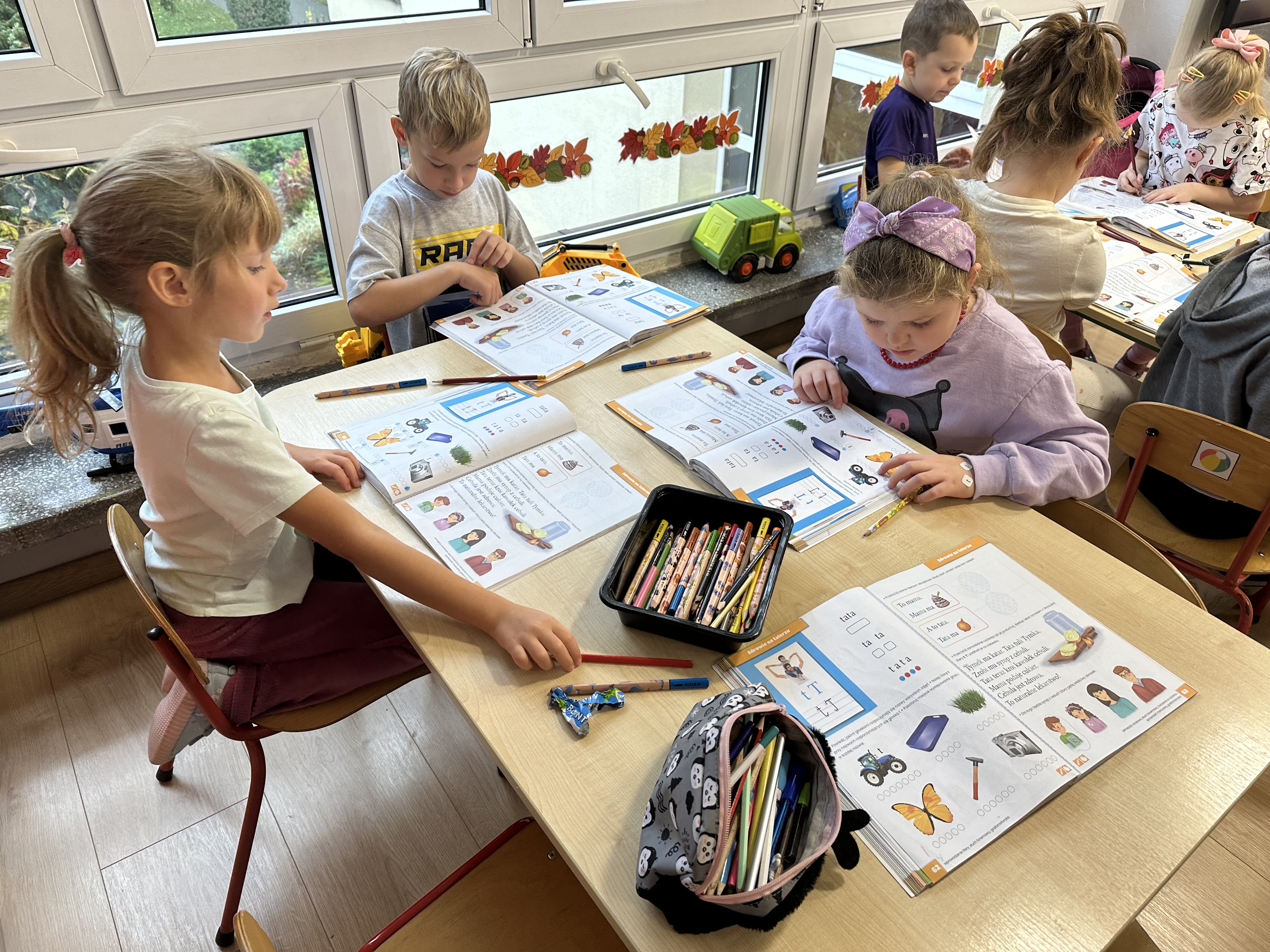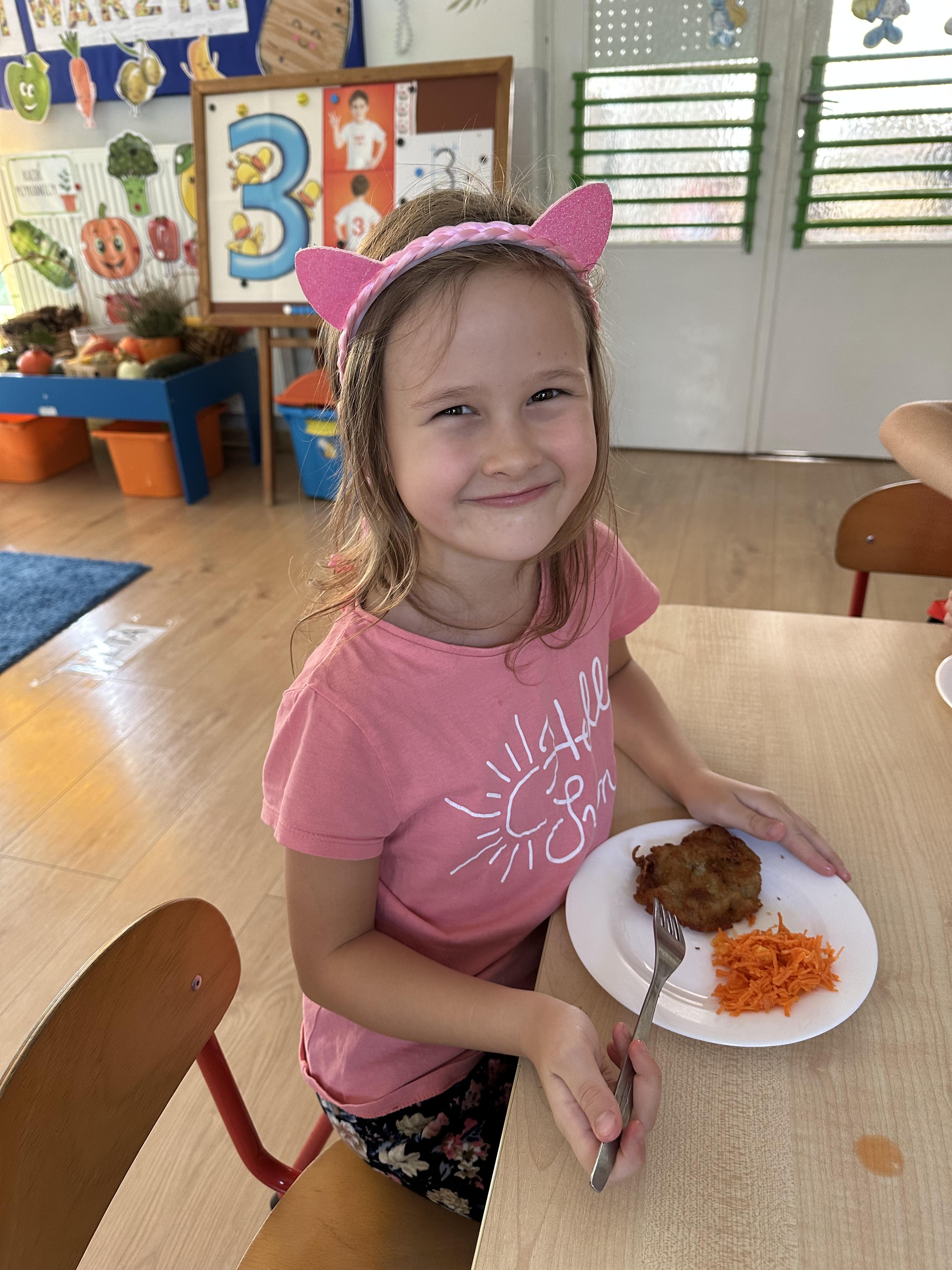 Poniedziałek był poświęcony kształtowaniu umiejętności wyrażania emocji oraz rozpoznawania uczucia smutku. Podczas porannej gimnastyki dzieci kształtowały sprawność fizyczną, wykonywały ćwiczenia rozciągające i wzmacniające mięśnie nóg. Opowiadanie Marii Pawlisz ,,Jesienne choroby” było punktem wyjścia do rozmowy o chorobach i samopoczuciu, które im towarzyszy. Dzieci dzieliły się swoimi doświadczeniami i sposobami na poprawę nastroju podczas przeziębienia. W trakcie zabawy „Lekarstwo na smutki” jedno z dzieci udawało smutne, pozostałe miały za zadanie je pocieszyć i rozweselić. Podczas zabawy dydaktycznej „W czasie choroby” inspirowanej opowiadaniem dzieci wspólnie zastanawiały się, jakie mogą być ,,lekarstwa” na smutki. Uczyły się uzasadniania swoich wyborów. Następnie poruszały się po sali do muzyki według wskazówek nauczyciela. Brały również udział w ćwiczeniach gimnastycznych, rozwijały szybkość i kształtowały mięśnie tułowia, wykonując skłony. Podczas zabawy „Tak się czuję, gdy…” uczyły się rozmawiać otwarcie o emocjach i o sytuacjach, które je powodują. We wtorek z samego rana ćwiczyły motorykę narządów mowy i wysłuchały piosenki ,,Smaczniejsze niż słodycze”. Następnie zastanawiały się nad przesłaniem utworu. Dzieci wspólnie doszły do wniosku, że warzywa i owoce są zdrowsze dla organizmu. Nauczyły się słów refrenu piosenki na pamięć. W kolejnej części dnia zapoznały się z wielką i małą literą T, t. Dzieliły słowo ,,tata” na sylaby i rytmicznie uderzały w instrument, przeliczając liczbę sylab. Podczas zabaw wymieniały dowolne słowa rozpoczynające się głoską t. Układały schemat słowa ,,tata” z kartoników i rysowały t palcem po dywanie, w powietrzu. Przy stolikach utrwalały znajomość poznanych liter, wykonując ćwiczenia. Po południu ozdobiły szablon litery T według własnego pomysłu. W środę dzieci poznały, czym są ceny i co oznacza słowo ,,cenny”. Po wysłuchaniu wiersza Barbary Lewandowskiej przedszkolaki sprawdzały umiejętność metaforycznego rozumienia sformułowań. Podczas zabawy ,,owoce jesieni” dzieci utrwalały znajomość darów jesieni i odróżniały owoce od warzyw. W czasie zabaw: „Ile warzyw dobrać?”, „Na straganie” i ,,Paski papryki” zapoznały się z liczbą 3 w aspekcie kardynalnym, porządkowym i miarowym. Nauczyły się zapisu graficznego 3 i dzieliły się spostrzeżeniami, jakie przedmioty przypominają im tę liczbę. Zakończyły dzień zabawami rozwijającymi pamięć i koncentrację oraz zabawą ruchową, integrującą grupę. W czwartek dzieci poznawały, jak wyglądają poszczególne warzywa po przekrojeniu ich na pół. Wiersz Elżbiety Śnieżowskiej-Bielak stanowił punkt wyjścia do rozmowy o grzankach i potrawach z warzyw i owoców, które jedzą dzieci. W dalszej części dnia przedszkolaki brały udział w zabawach rozwijających poczucie sprawstwa, kształtujących pamięć słuchową oraz ćwiczeniach językowych.