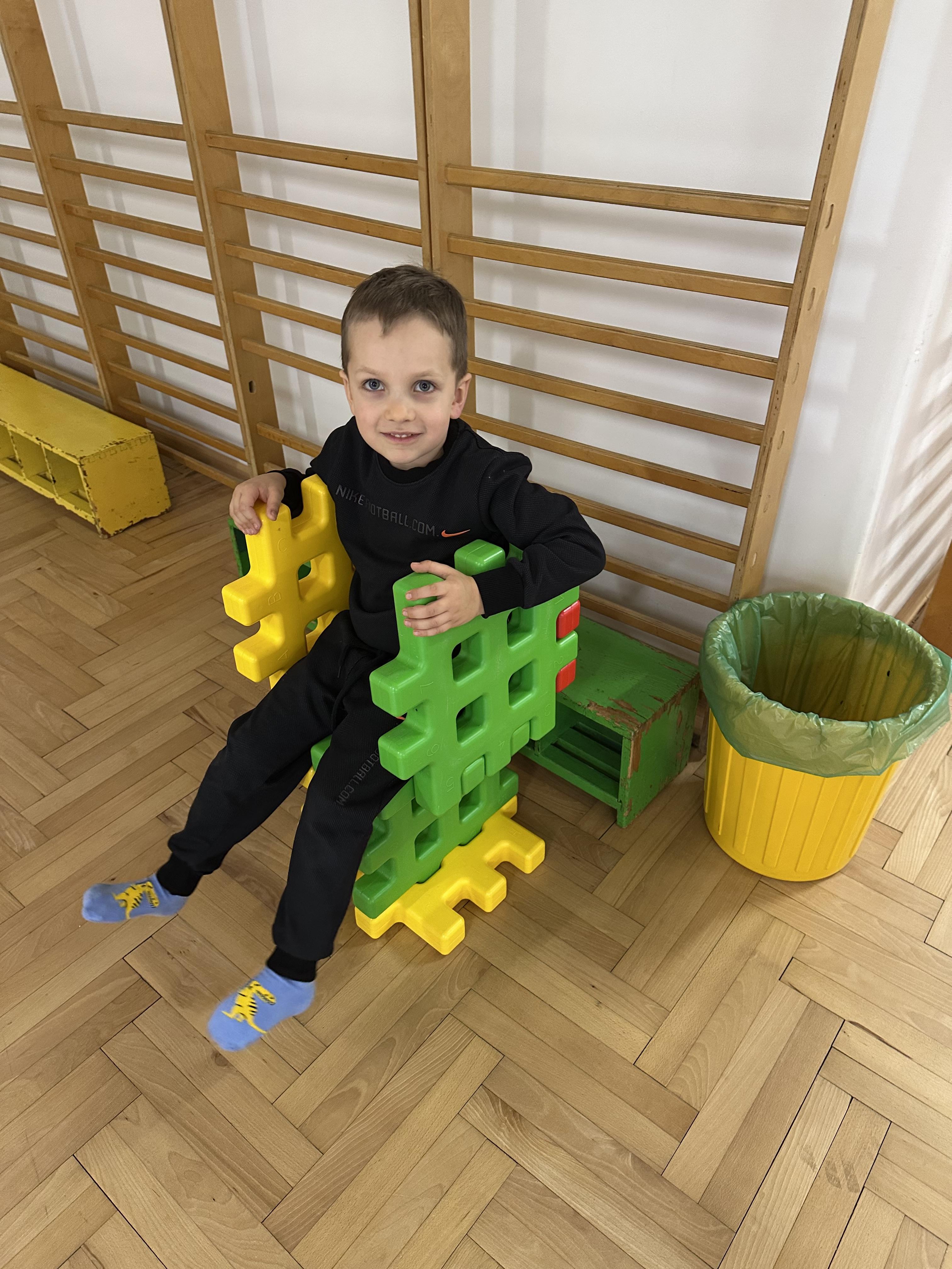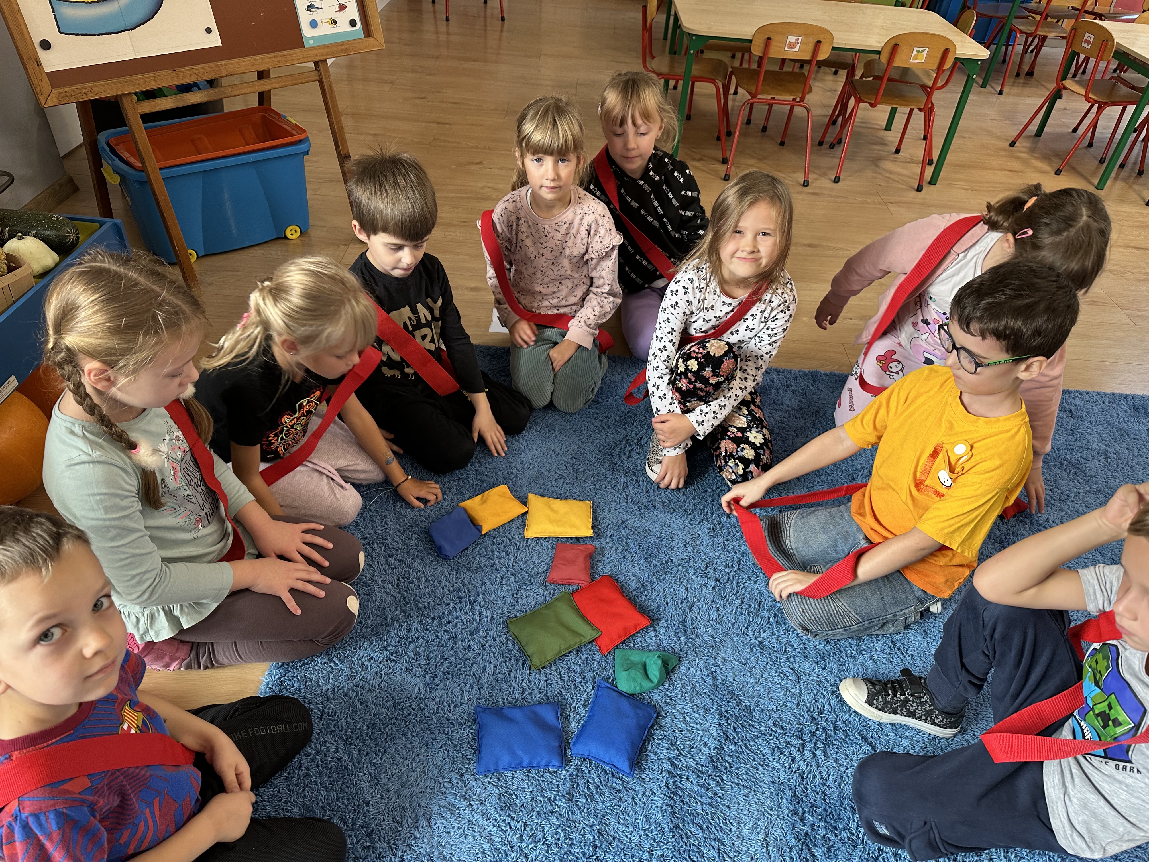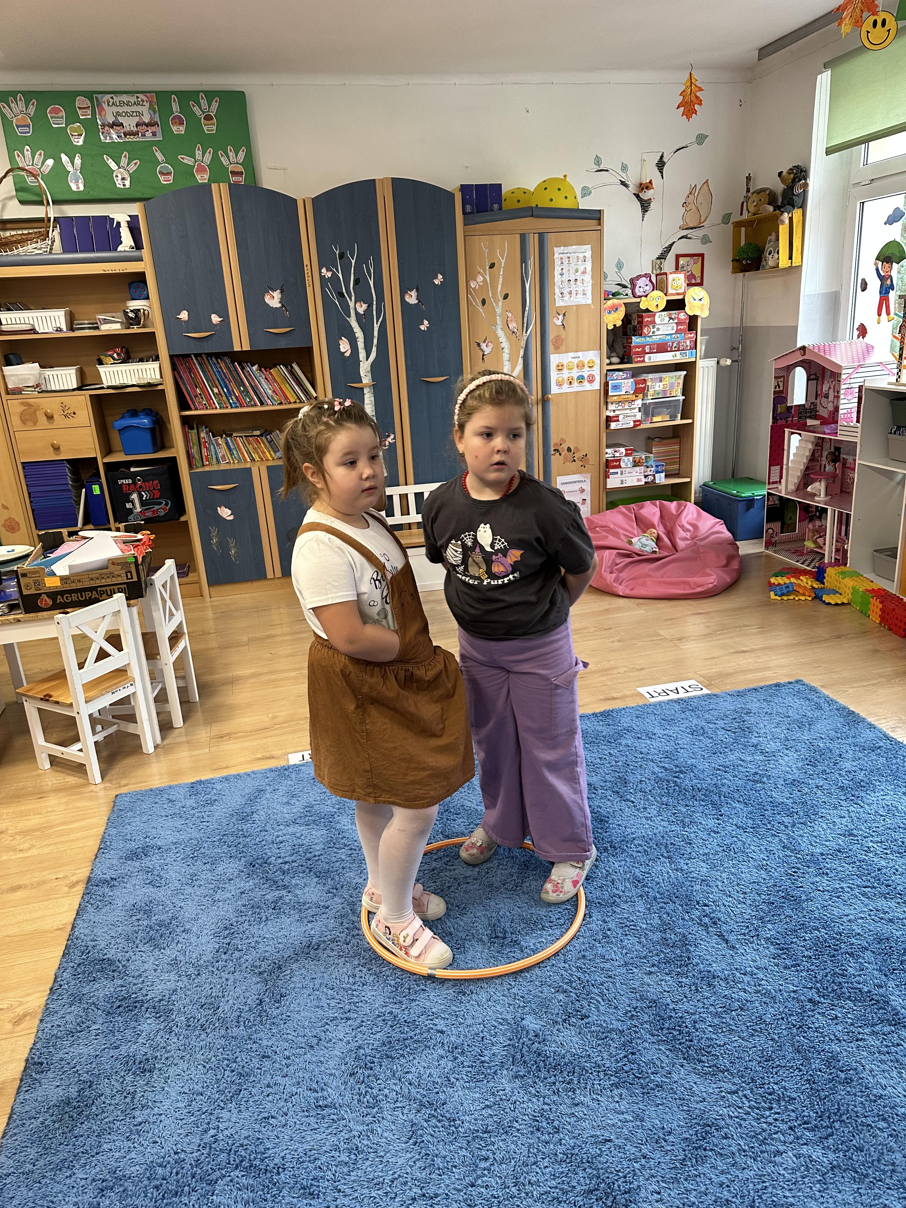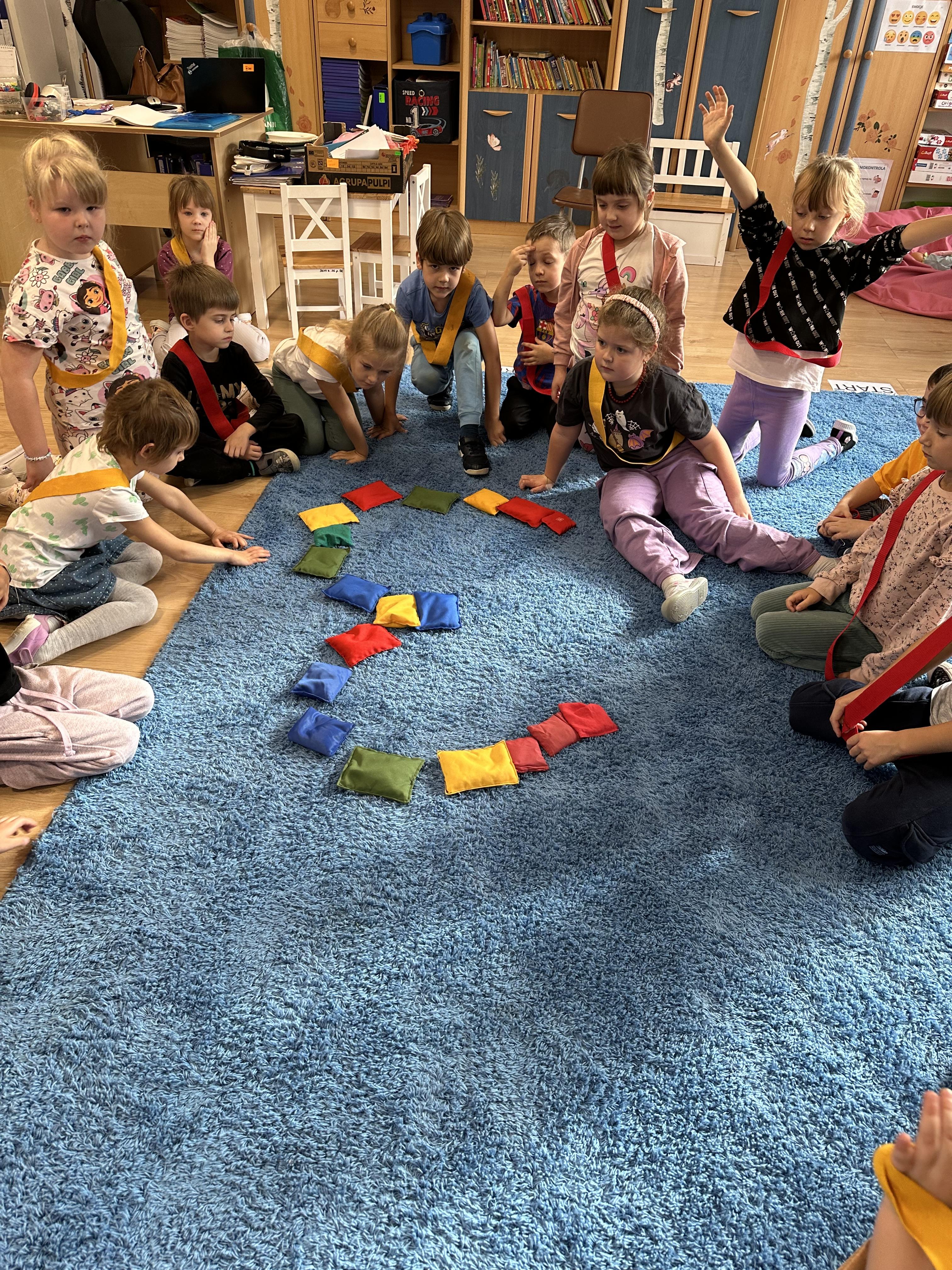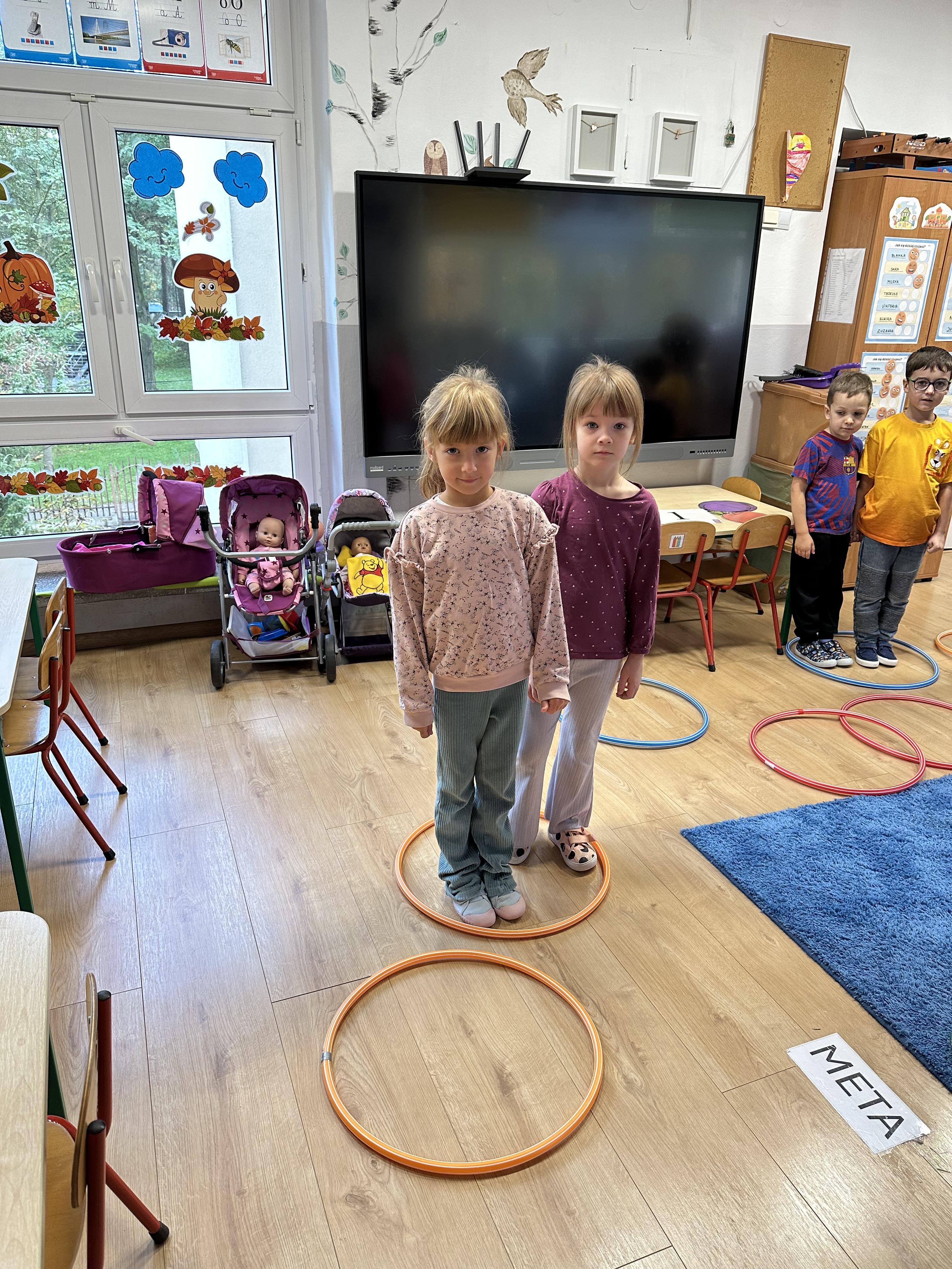 Poniedziałek był poświęcony kształtowaniu umiejętności wyrażania emocji oraz rozpoznawania uczucia smutku. Podczas porannej gimnastyki dzieci kształtowały sprawność fizyczną, wykonywały ćwiczenia rozciągające i wzmacniające mięśnie nóg. Opowiadanie Marii Pawlisz ,,Jesienne choroby” było punktem wyjścia do rozmowy o chorobach i samopoczuciu, które im towarzyszy. Dzieci dzieliły się swoimi doświadczeniami i sposobami na poprawę nastroju podczas przeziębienia. W trakcie zabawy „Lekarstwo na smutki” jedno z dzieci udawało smutne, pozostałe miały za zadanie je pocieszyć i rozweselić. Podczas zabawy dydaktycznej „W czasie choroby” inspirowanej opowiadaniem dzieci wspólnie zastanawiały się, jakie mogą być ,,lekarstwa” na smutki. Uczyły się uzasadniania swoich wyborów. Następnie poruszały się po sali do muzyki według wskazówek nauczyciela. Brały również udział w ćwiczeniach gimnastycznych, rozwijały szybkość i kształtowały mięśnie tułowia, wykonując skłony. Podczas zabawy „Tak się czuję, gdy…” uczyły się rozmawiać otwarcie o emocjach i o sytuacjach, które je powodują. We wtorek z samego rana ćwiczyły motorykę narządów mowy i wysłuchały piosenki ,,Smaczniejsze niż słodycze”. Następnie zastanawiały się nad przesłaniem utworu. Dzieci wspólnie doszły do wniosku, że warzywa i owoce są zdrowsze dla organizmu. Nauczyły się słów refrenu piosenki na pamięć. W kolejnej części dnia zapoznały się z wielką i małą literą T, t. Dzieliły słowo ,,tata” na sylaby i rytmicznie uderzały w instrument, przeliczając liczbę sylab. Podczas zabaw wymieniały dowolne słowa rozpoczynające się głoską t. Układały schemat słowa ,,tata” z kartoników i rysowały t palcem po dywanie, w powietrzu. Przy stolikach utrwalały znajomość poznanych liter, wykonując ćwiczenia. Po południu ozdobiły szablon litery T według własnego pomysłu. W środę dzieci poznały, czym są ceny i co oznacza słowo ,,cenny”. Po wysłuchaniu wiersza Barbary Lewandowskiej przedszkolaki sprawdzały umiejętność metaforycznego rozumienia sformułowań. Podczas zabawy ,,owoce jesieni” dzieci utrwalały znajomość darów jesieni i odróżniały owoce od warzyw. W czasie zabaw: „Ile warzyw dobrać?”, „Na straganie” i ,,Paski papryki” zapoznały się z liczbą 3 w aspekcie kardynalnym, porządkowym i miarowym. Nauczyły się zapisu graficznego 3 i dzieliły się spostrzeżeniami, jakie przedmioty przypominają im tę liczbę. Zakończyły dzień zabawami rozwijającymi pamięć i koncentrację oraz zabawą ruchową, integrującą grupę. W czwartek dzieci poznawały, jak wyglądają poszczególne warzywa po przekrojeniu ich na pół. Wiersz Elżbiety Śnieżowskiej-Bielak stanowił punkt wyjścia do rozmowy o grzankach i potrawach z warzyw i owoców, które jedzą dzieci. W dalszej części dnia przedszkolaki brały udział w zabawach rozwijających poczucie sprawstwa, kształtujących pamięć słuchową oraz ćwiczeniach językowych.