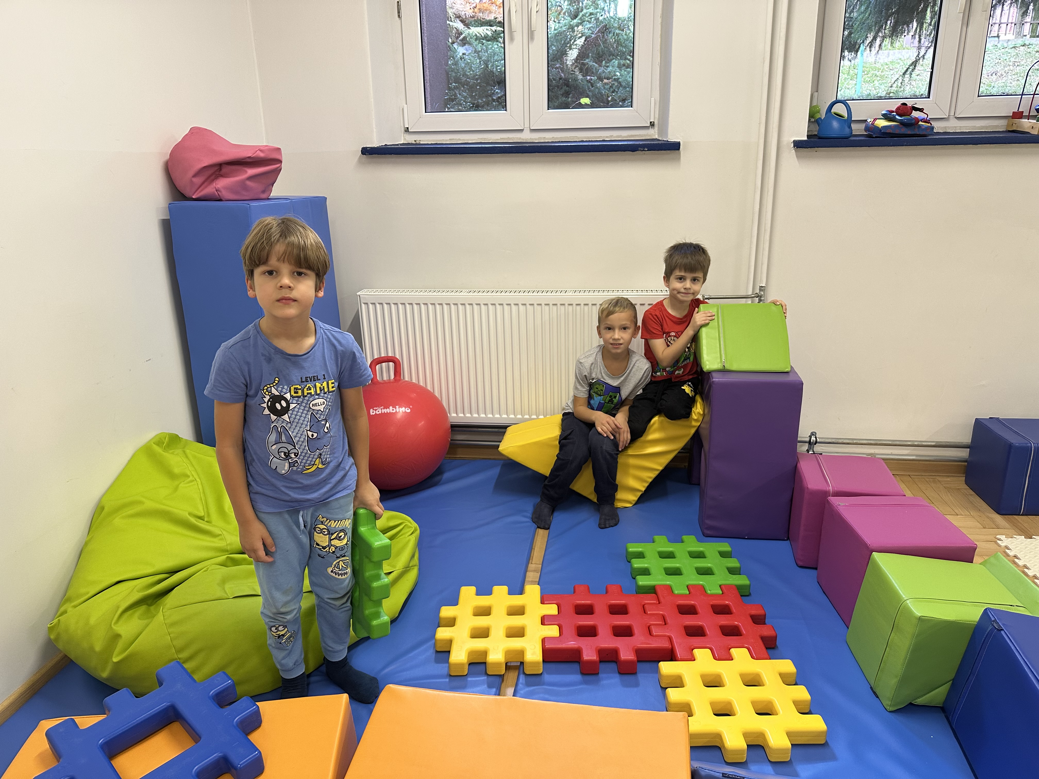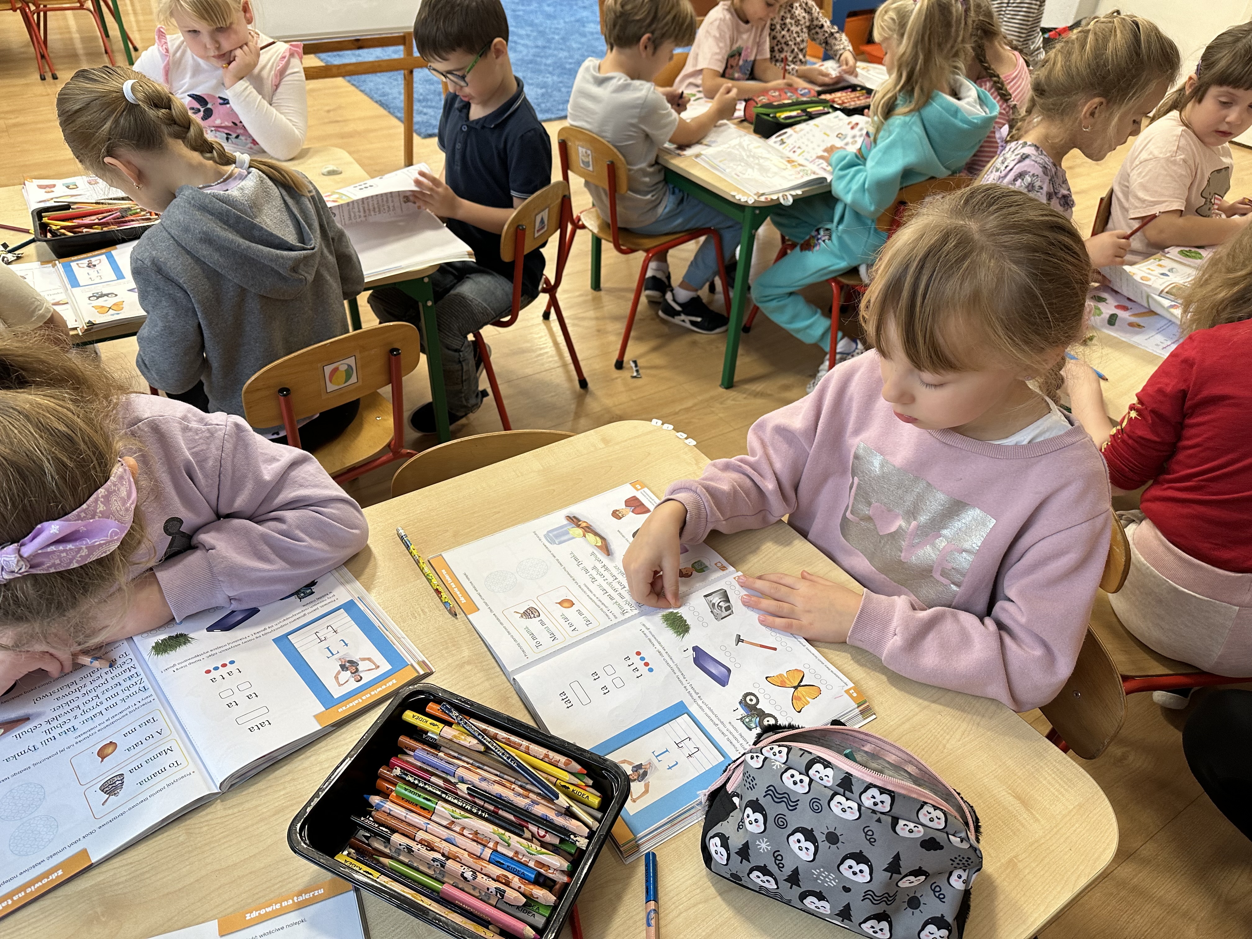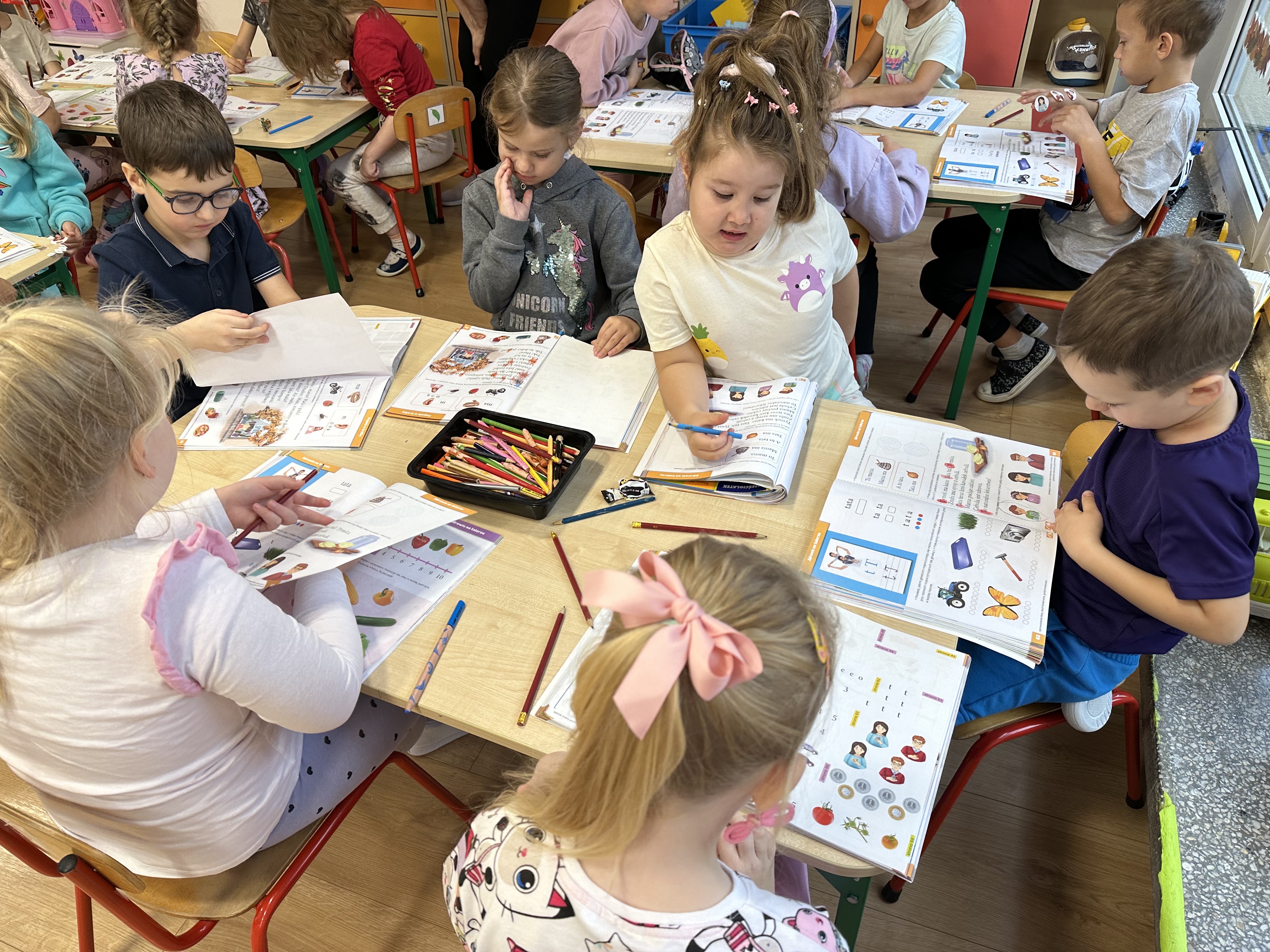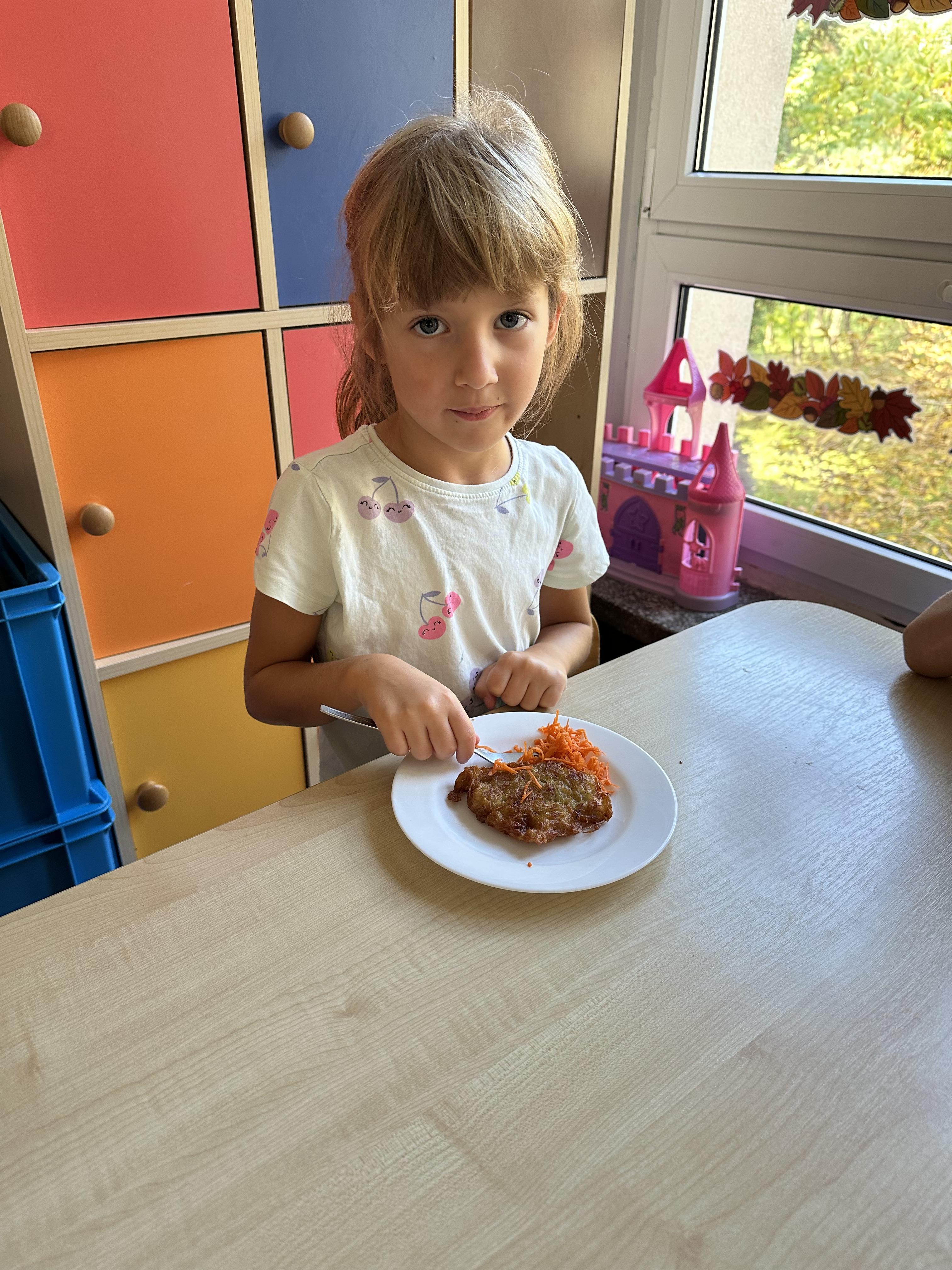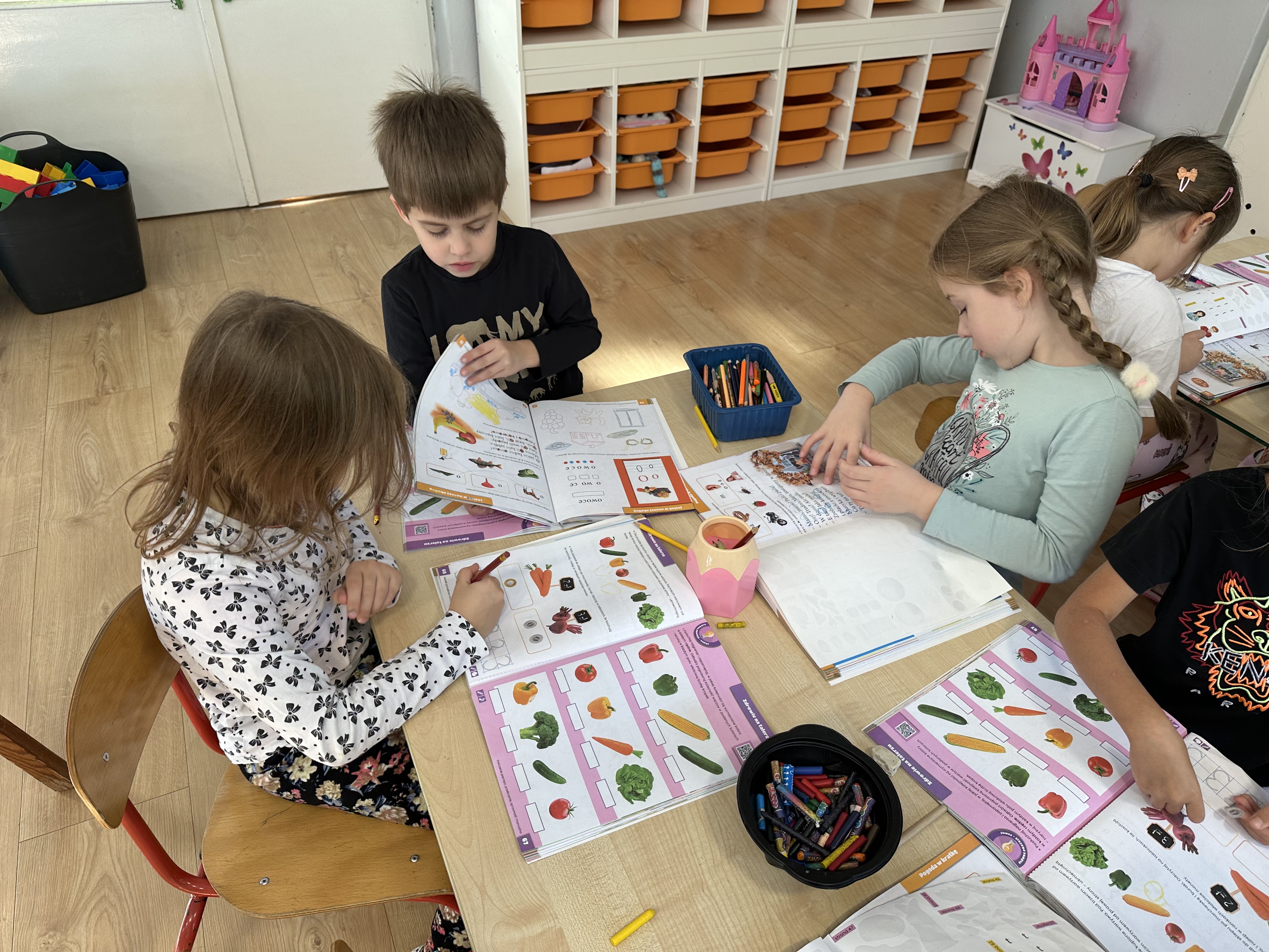 Poniedziałek był poświęcony kształtowaniu umiejętności wyrażania emocji oraz rozpoznawania uczucia smutku. Podczas porannej gimnastyki dzieci kształtowały sprawność fizyczną, wykonywały ćwiczenia rozciągające i wzmacniające mięśnie nóg. Opowiadanie Marii Pawlisz ,,Jesienne choroby” było punktem wyjścia do rozmowy o chorobach i samopoczuciu, które im towarzyszy. Dzieci dzieliły się swoimi doświadczeniami i sposobami na poprawę nastroju podczas przeziębienia. W trakcie zabawy „Lekarstwo na smutki” jedno z dzieci udawało smutne, pozostałe miały za zadanie je pocieszyć i rozweselić. Podczas zabawy dydaktycznej „W czasie choroby” inspirowanej opowiadaniem dzieci wspólnie zastanawiały się, jakie mogą być ,,lekarstwa” na smutki. Uczyły się uzasadniania swoich wyborów. Następnie poruszały się po sali do muzyki według wskazówek nauczyciela. Brały również udział w ćwiczeniach gimnastycznych, rozwijały szybkość i kształtowały mięśnie tułowia, wykonując skłony. Podczas zabawy „Tak się czuję, gdy…” uczyły się rozmawiać otwarcie o emocjach i o sytuacjach, które je powodują. We wtorek z samego rana ćwiczyły motorykę narządów mowy i wysłuchały piosenki ,,Smaczniejsze niż słodycze”. Następnie zastanawiały się nad przesłaniem utworu. Dzieci wspólnie doszły do wniosku, że warzywa i owoce są zdrowsze dla organizmu. Nauczyły się słów refrenu piosenki na pamięć. W kolejnej części dnia zapoznały się z wielką i małą literą T, t. Dzieliły słowo ,,tata” na sylaby i rytmicznie uderzały w instrument, przeliczając liczbę sylab. Podczas zabaw wymieniały dowolne słowa rozpoczynające się głoską t. Układały schemat słowa ,,tata” z kartoników i rysowały t palcem po dywanie, w powietrzu. Przy stolikach utrwalały znajomość poznanych liter, wykonując ćwiczenia. Po południu ozdobiły szablon litery T według własnego pomysłu. W środę dzieci poznały, czym są ceny i co oznacza słowo ,,cenny”. Po wysłuchaniu wiersza Barbary Lewandowskiej przedszkolaki sprawdzały umiejętność metaforycznego rozumienia sformułowań. Podczas zabawy ,,owoce jesieni” dzieci utrwalały znajomość darów jesieni i odróżniały owoce od warzyw. W czasie zabaw: „Ile warzyw dobrać?”, „Na straganie” i ,,Paski papryki” zapoznały się z liczbą 3 w aspekcie kardynalnym, porządkowym i miarowym. Nauczyły się zapisu graficznego 3 i dzieliły się spostrzeżeniami, jakie przedmioty przypominają im tę liczbę. Zakończyły dzień zabawami rozwijającymi pamięć i koncentrację oraz zabawą ruchową, integrującą grupę. W czwartek dzieci poznawały, jak wyglądają poszczególne warzywa po przekrojeniu ich na pół. Wiersz Elżbiety Śnieżowskiej-Bielak stanowił punkt wyjścia do rozmowy o grzankach i potrawach z warzyw i owoców, które jedzą dzieci. W dalszej części dnia przedszkolaki brały udział w zabawach rozwijających poczucie sprawstwa, kształtujących pamięć słuchową oraz ćwiczeniach językowych.