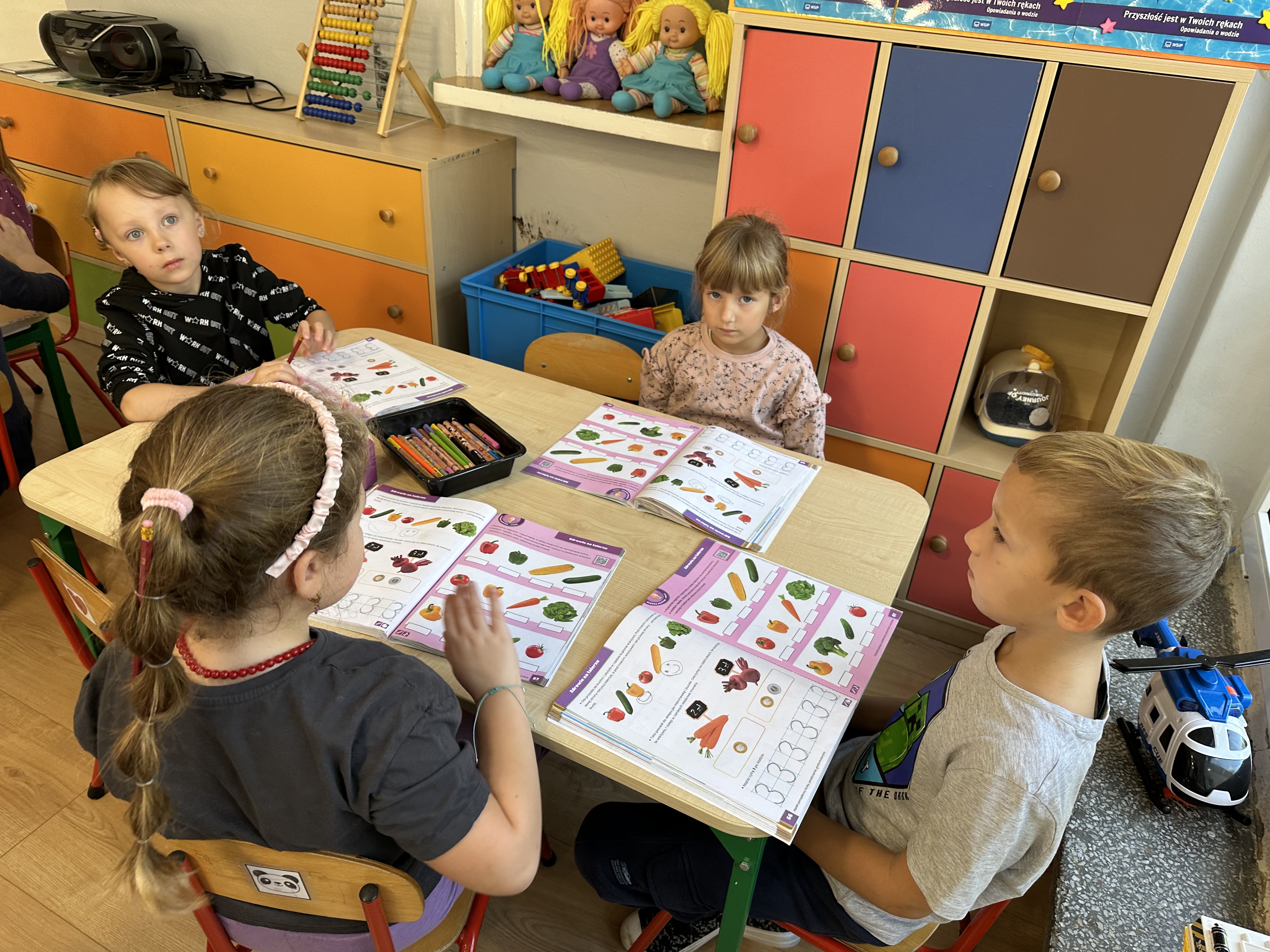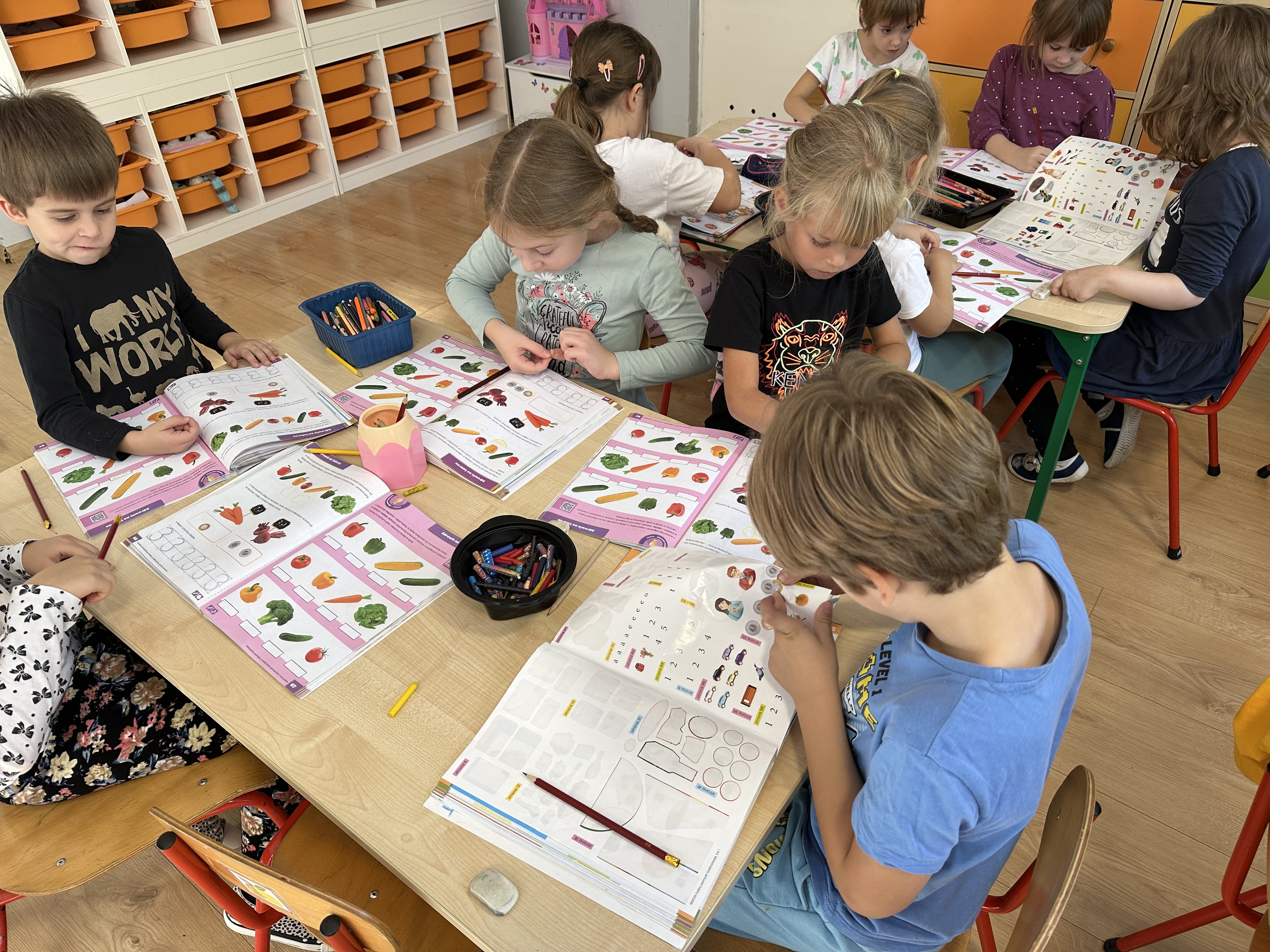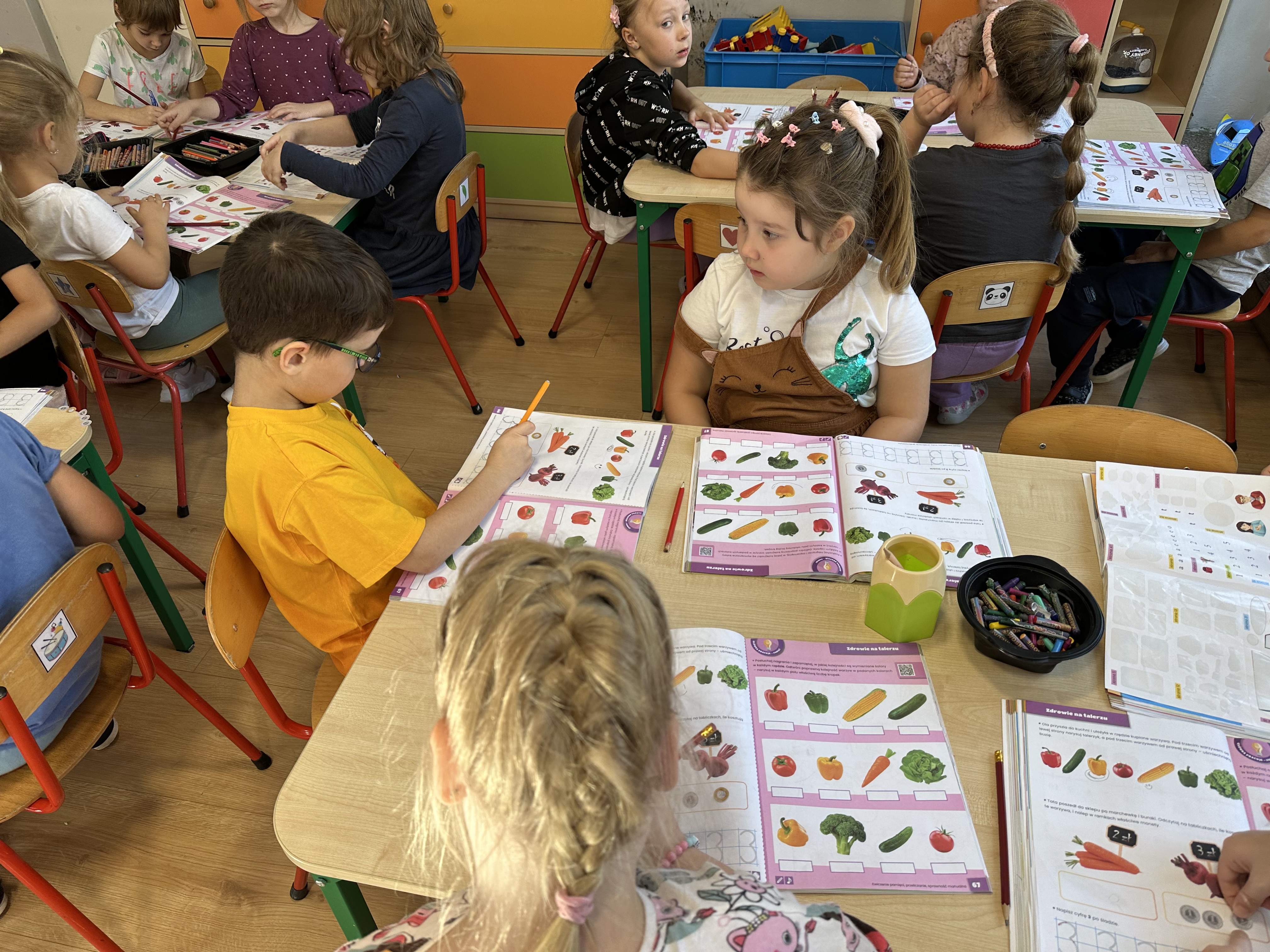 W siódmym tygodniu dzieci kształtowały umiejętność rozmawiania o emocjach, zwłaszcza uczuciu smutku. Dzieliły się pomysłami na rozweselenie się i poprawę nastroju. Zapoznały się z zasadami zdrowego odżywiania. Dowiedziały się, w jakich produktach znajdują się witaminy, a których należy unikać, ponieważ są niezdrowe. Poranki umilała dzieciom powitanka ,,Zdrowie na talerzu”, do której wspólnie i zgodnie tańczyły.