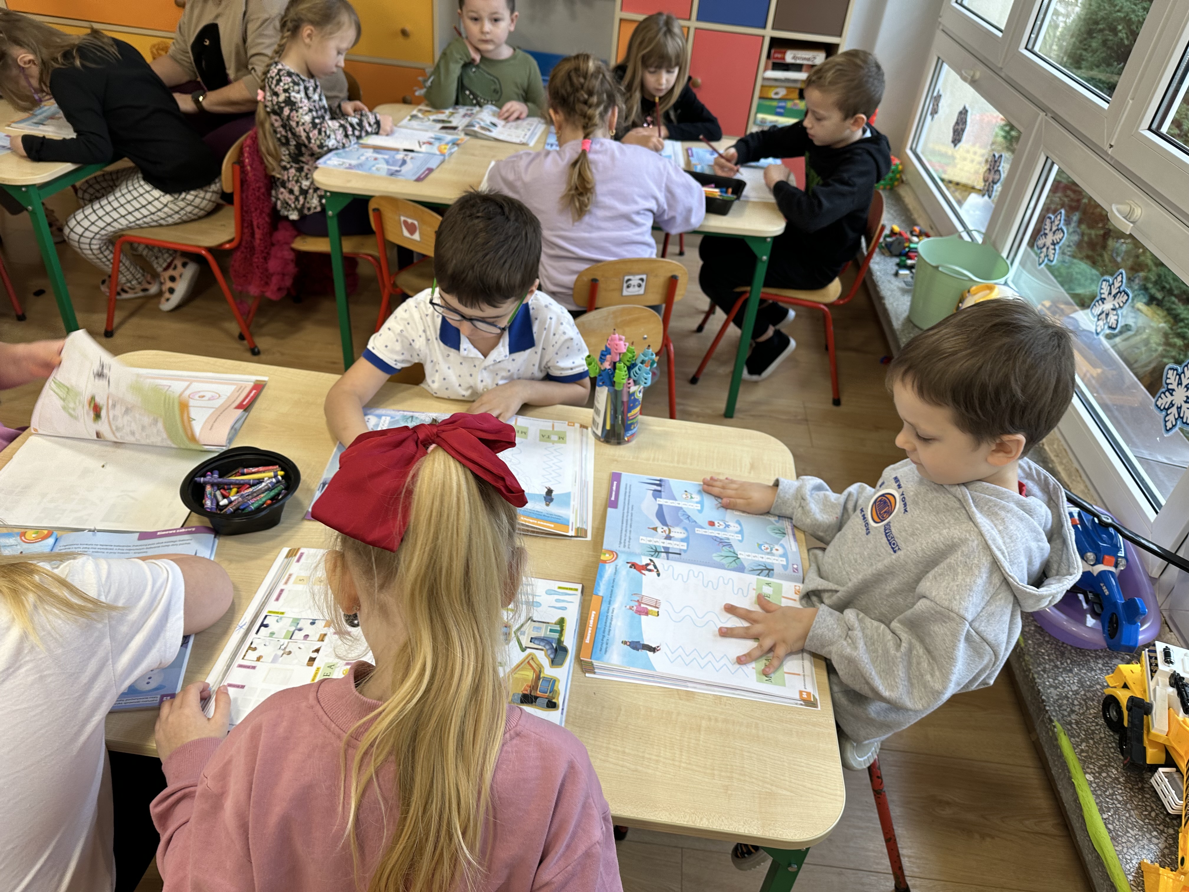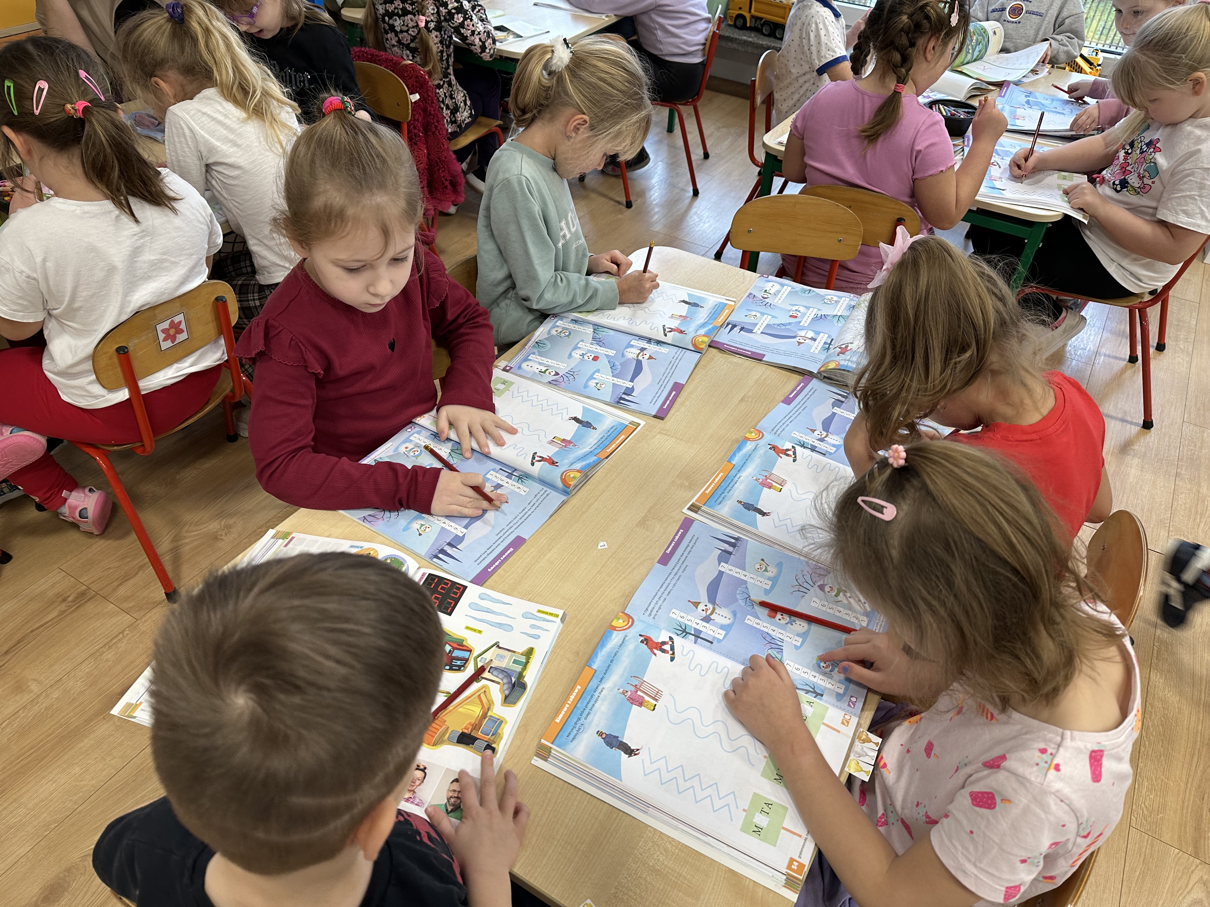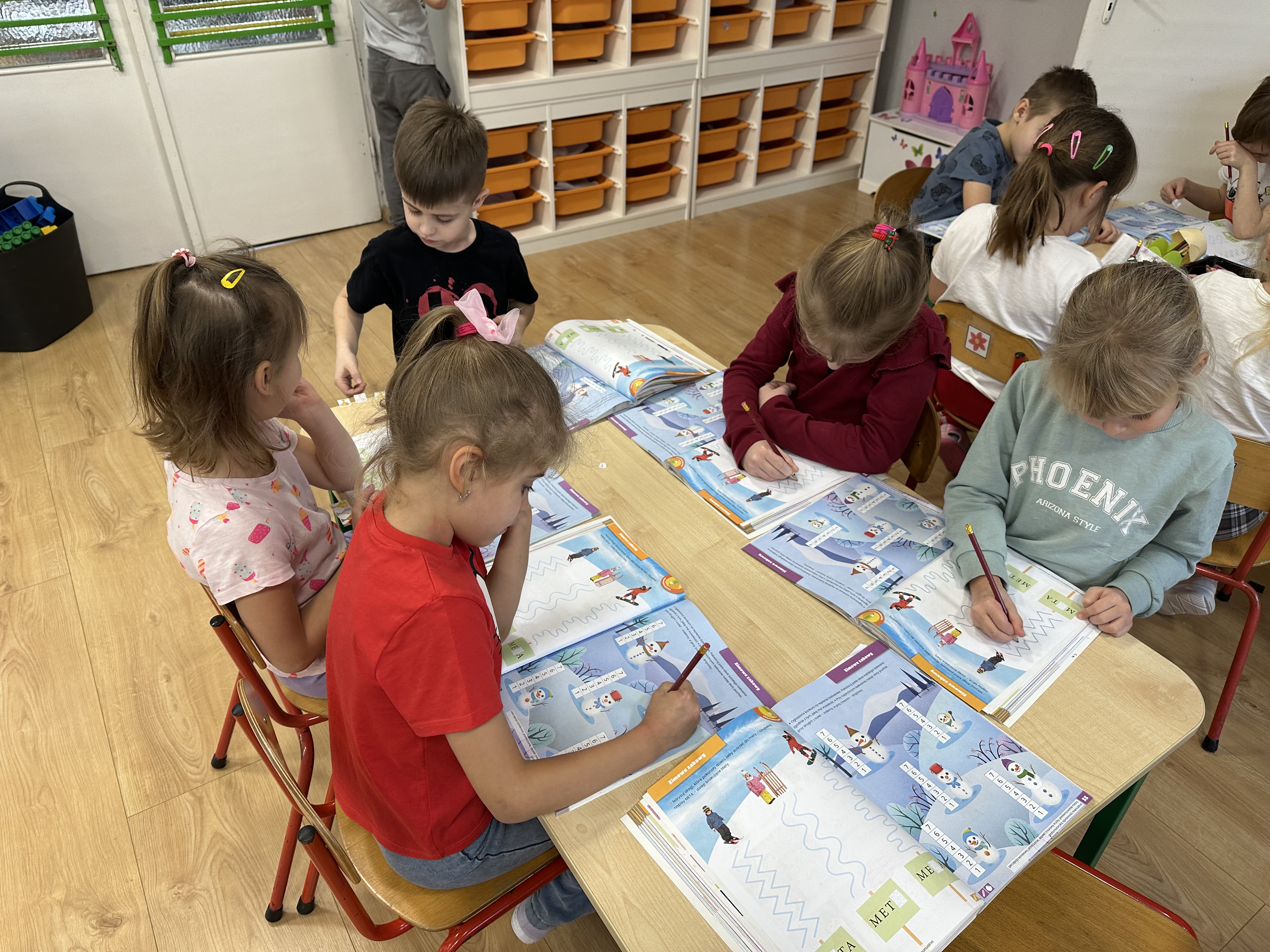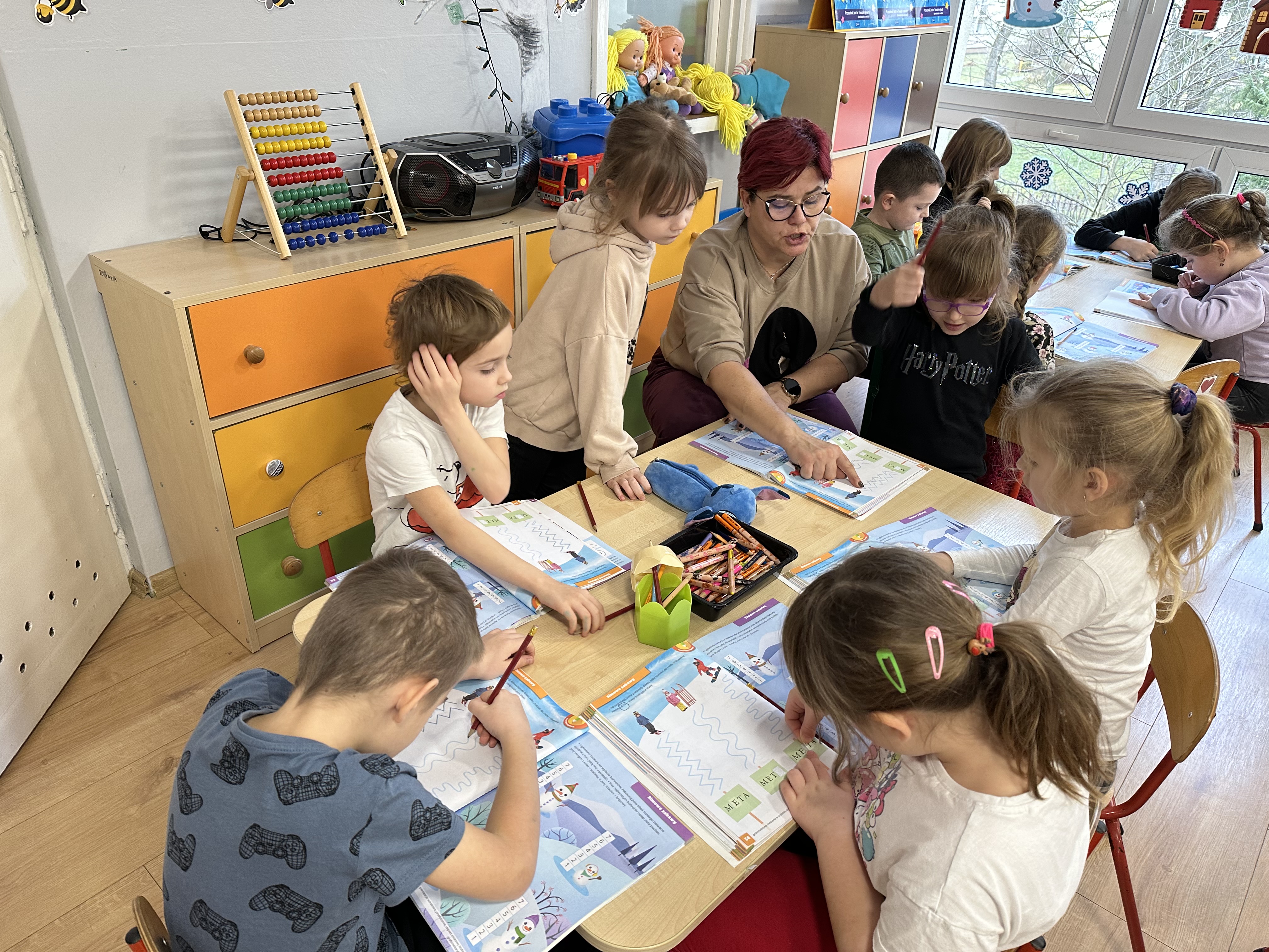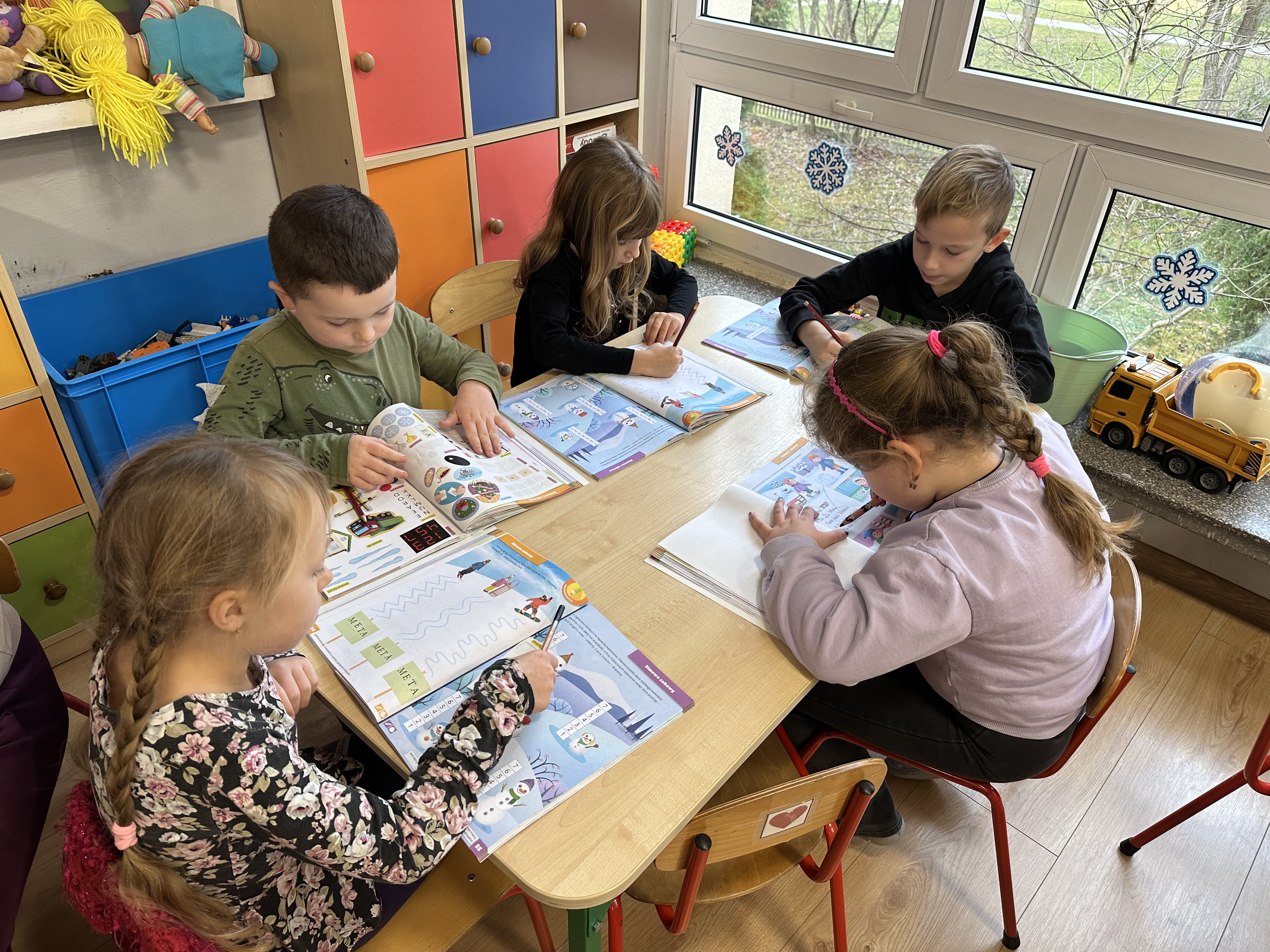 W poniedziałek przedszkolaki wysłuchały opowiadania Marii Pawlisz ,,Za ciasne łyżwy” i rozmawiały na temat jego treści. Miały możliwość podzielić się swoimi doświadczeniami związanymi z początkami nauki wybranego sportu. Doszły do wniosku, że nie można się poddawać, ponieważ wszystko na początku wydaje się trudne. Dzieci rozwijały wyczucie rytmu podczas zabawy ruchowej do muzyki, prawidłowo reagowały na hasło nauczyciela, dzieliły słowo ,,lodowisko” na sylaby, tworzyły z liter podpisy, przełamywały nieśmiałość podczas wypowiedzi na forum grupy dotyczącej sportów zimowych, kształtowały umiejętność współpracy w zespole podczas rzucania do celu. W trakcie zabawy „Który to obrazek?” ćwiczyły umiejętność orientacji w przestrzeni, odróżniały prawą stronę od lewej i odnajdywały głoskę s w nagłosie. Wtorek dzieci zaczęły zabawą logopedyczną rozwijającą poprawną artykulację i motorykę narządów mowy. Po wysłuchaniu opowiadania ,,Dwa medale” rozmawiały na temat postawy fair play, podawały różne jej przykłady w dziedzinach sportu oraz podczas zabaw ruchowych w przedszkolu. W trakcie zajęć dydaktycznych poznały ciekawostki o sportach zimowych, samodzielnie tworzyły zdania z wylosowanym słowem związanym z tematem, poznały nowe zwroty w języku angielskim. Zdobyte wiadomości i umiejętności wykorzystały, wykonując zadania w kartach pracy. Dzień skończyły wykonaniem pracy plastyczno-technicznej. W środę rozwijały umiejętność logicznego myślenia i wnioskowania. Podczas zabawy „Narciarz na trasie” kształtowały umiejętność odkodowywania informacji. Przedszkolaki brały aktywny udział w zabawach orientacyjno-porządkowych, odróżniały prawą stronę od lewej, przeliczały do 6 i rozwijały swoje kompetencje matematyczne, kształtowały równowagę i współpracę w zespole, wykonywały ćwiczenia według kodu. W trakcie zabaw przy stolikach sprawdzały swoją wiedzę, natomiast na dworze ćwiczyły duże partie mięśniowe oraz wzmacniały kondycję fizyczną, bawiąc się w berka. W czwartkowy poranek przedszkolaki układały z liter podpisy do obrazka oraz dzieliły na sylaby utworzone słowa. Po wysłuchaniu wiersza Magdaleny Witkiewicz sprawdzały, ile z niego zapamiętały, odpowiadając na pytania nauczyciela. W czasie zabawy „Wyprawa pana Bałwana” pilnowały przestrzegania reguł oraz uczyły się przegrywania. Na koniec dnia stworzyły gwiazdy z papierowych kół. W piątek wykonywały ćwiczenia do muzyki, rozwijały poczucie rytmu i ekspresję ruchów, kształtowały orientację w przestrzeni, uczyły się współpracy w zespole i uwrażliwiały się na formę utworu. W zabawie „Pływające kolory” sześciolatki rozwijały wrażliwość sensoryczną podczas aktywności z lodem, malowały farbami na powierzchni lodu i obserwowały efekty wizualne. Wspólnie odnajdywały na mapie: Grenlandię, Arktykę, Antarktydę i odczytywały ich nazwy, następnie porównywały, jak daleko od tych krain leży Polska. Porównywały także różne typy domów w zależności od szerokości geograficznej. W czasie indywidualnej pracy przy stolikach dzieci odczuwały radość podczas aktywności plastyczno-technicznych – wykonały śnieżynkę zgodnie z instrukcją. Dzień zakończyły zabawą matematyczną z elementami rywalizacji.