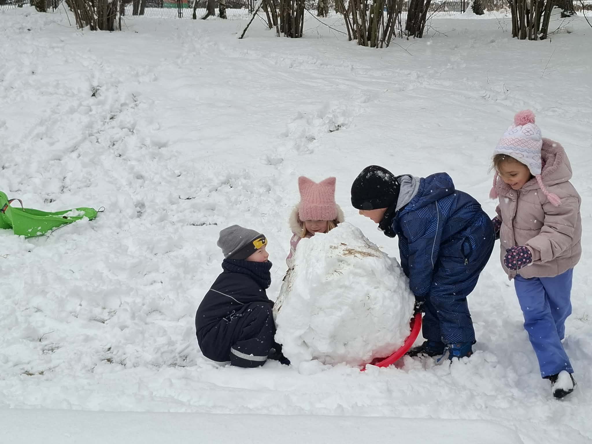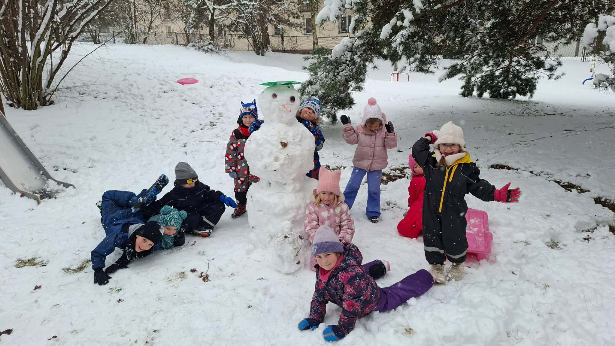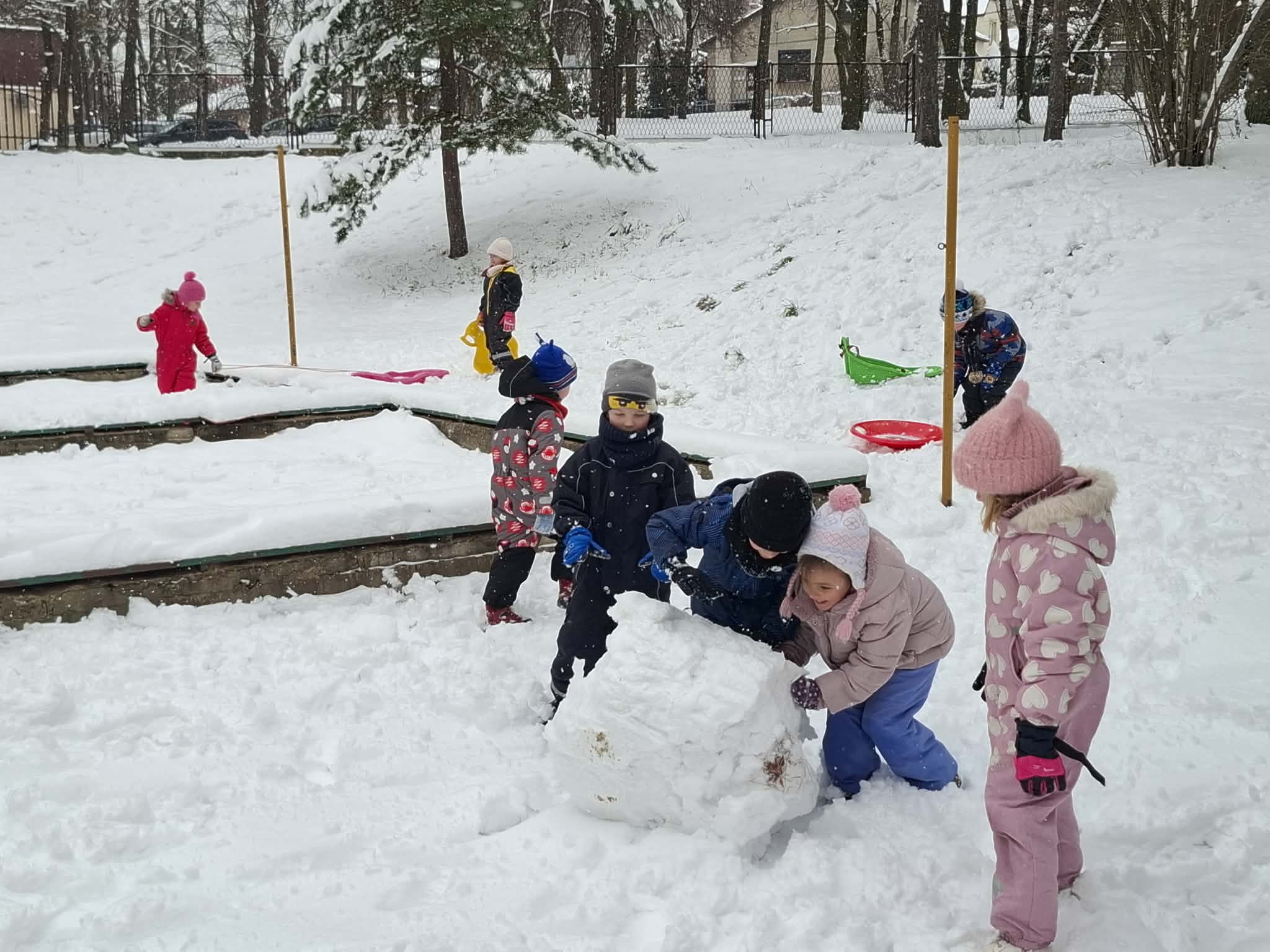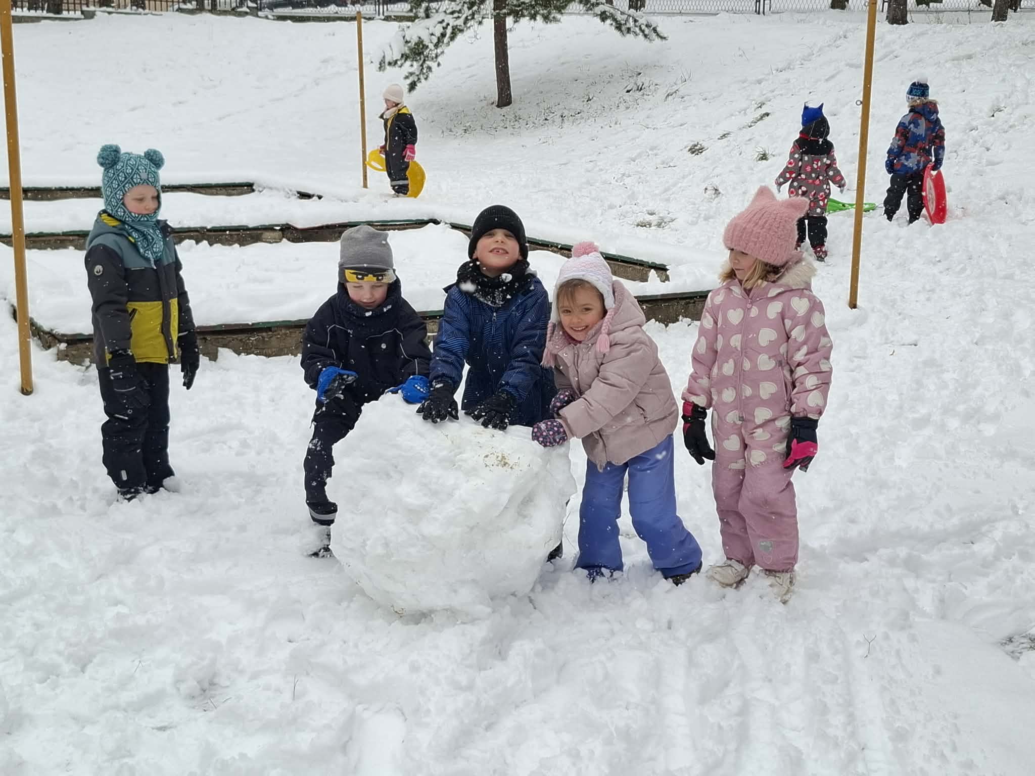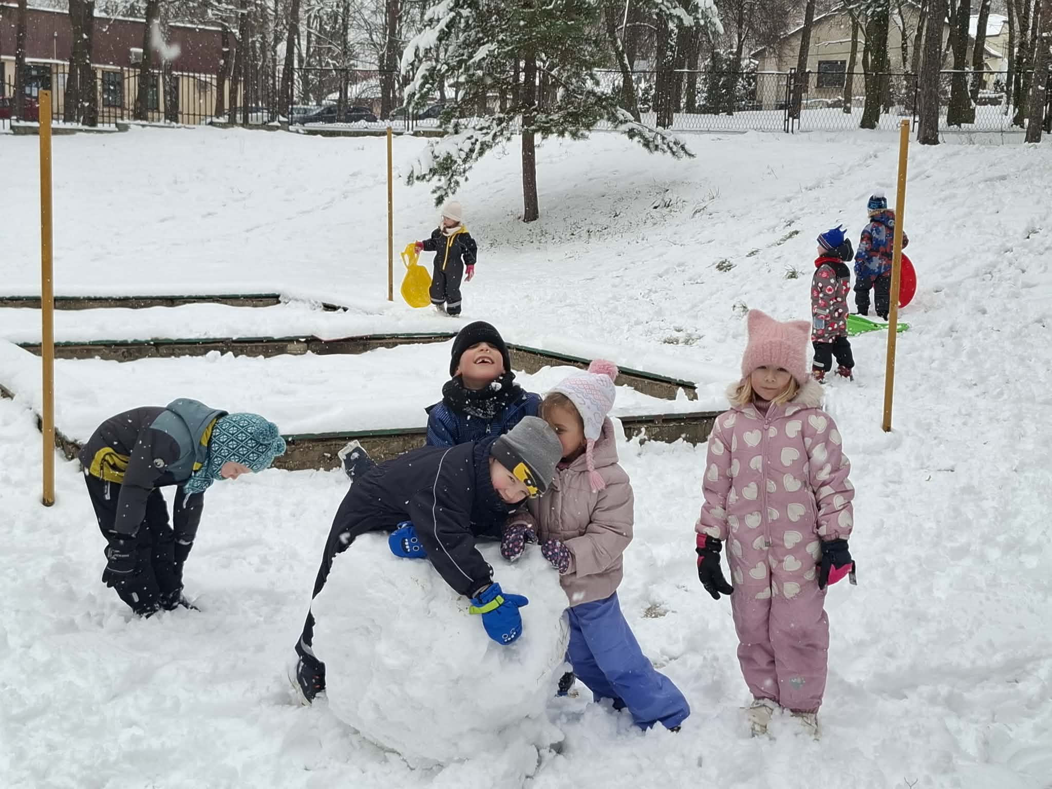 Podczas wspólnych zabaw na świeżym powietrzu lepiliśmy bałwana. Dzieci chętnie rzucały się śnieżkami, ćwicząc przy tym celność i współpracę w grupie. Najwięcej emocji wzbudziły jednak zjazdy na ślizgach z górki – było dużo śmiechu, radości i pozytywnej energii.