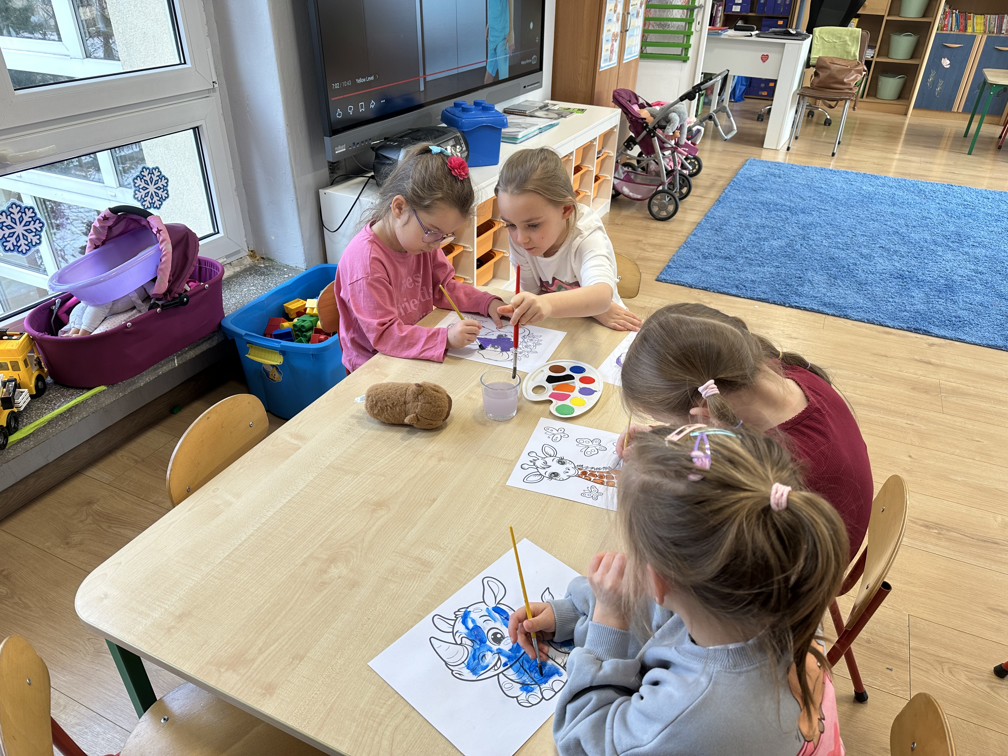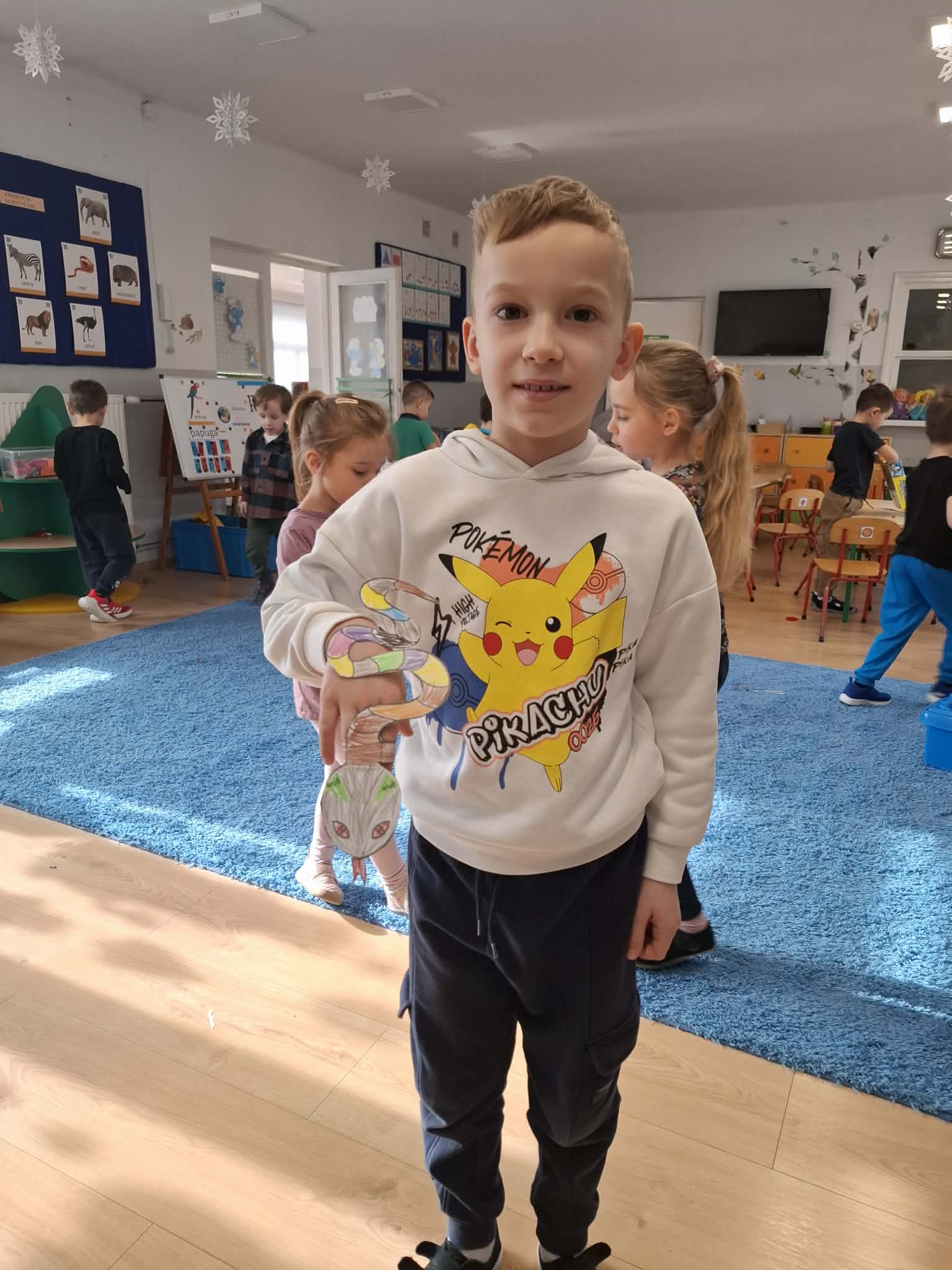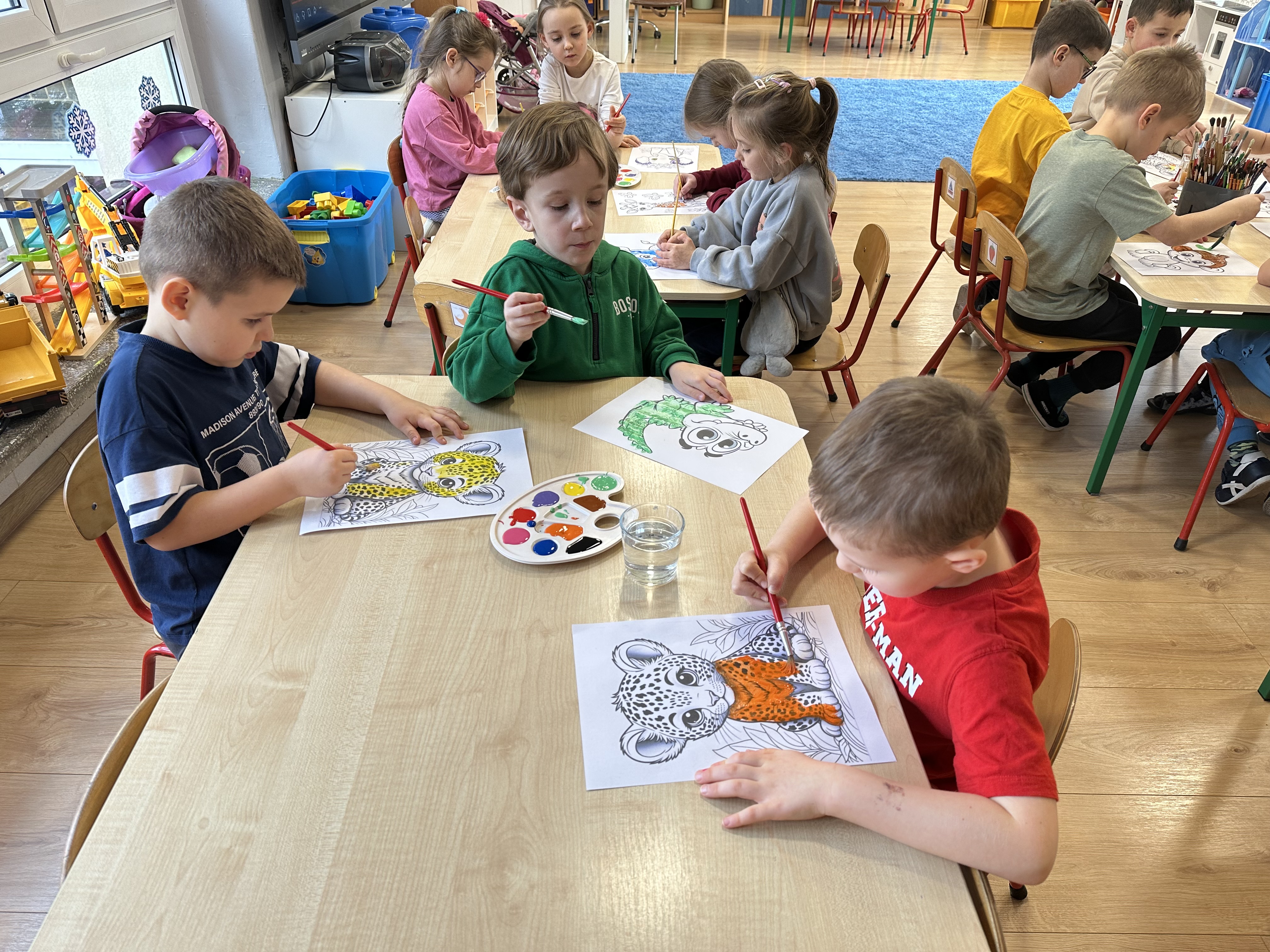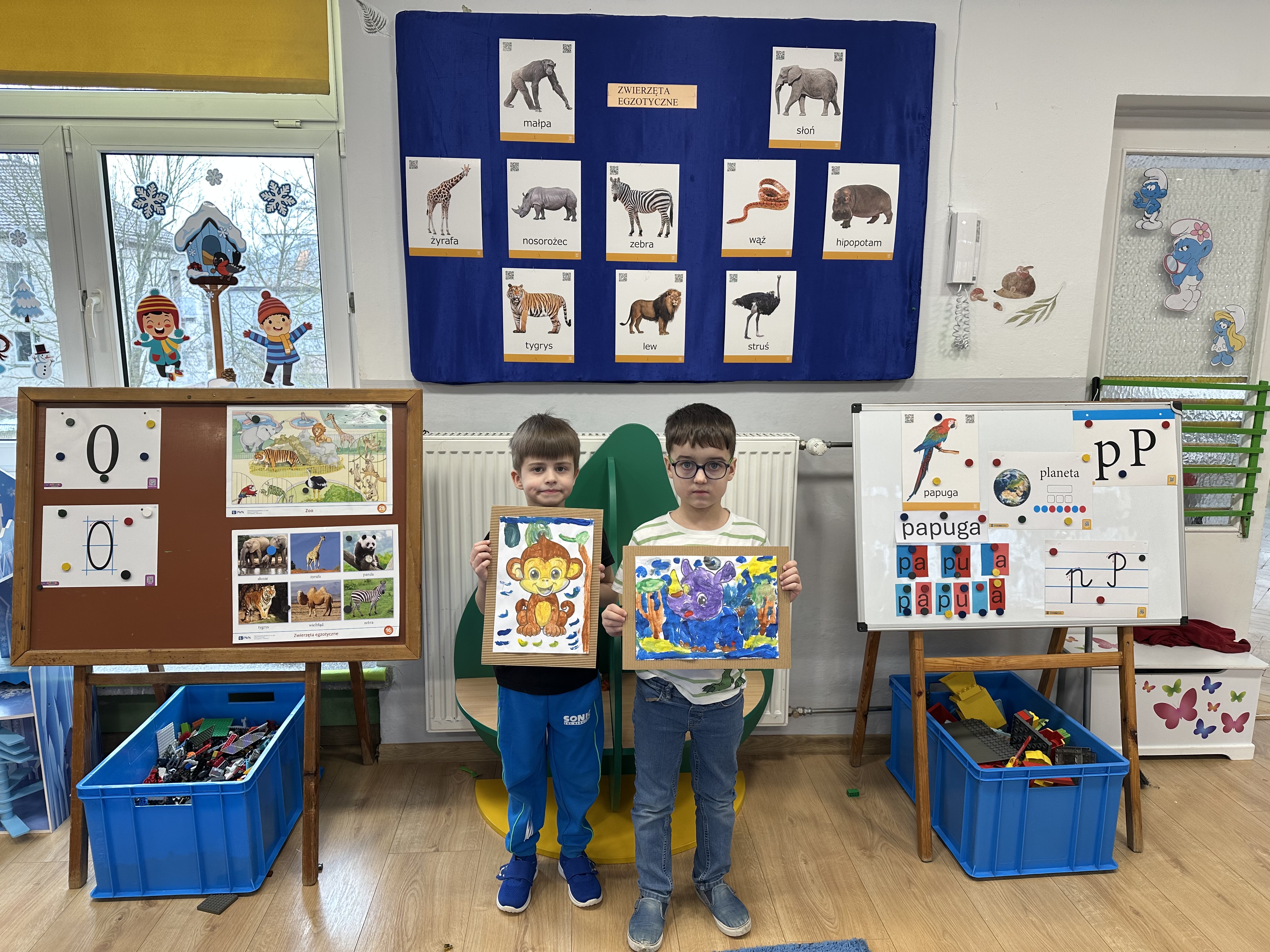 W minionym tygodniu podczas zajęć dzieci nie tylko rozmawiały o zwierzętach egzotycznych, lecz także rozwijały umiejętności nazywania i rozpoznawania emocji. Dodatkowo nauczyły się nowej powitanki pt. ,,Zwierzęta egzotyczne”, którą każdego poranka ilustrowały ruchem.