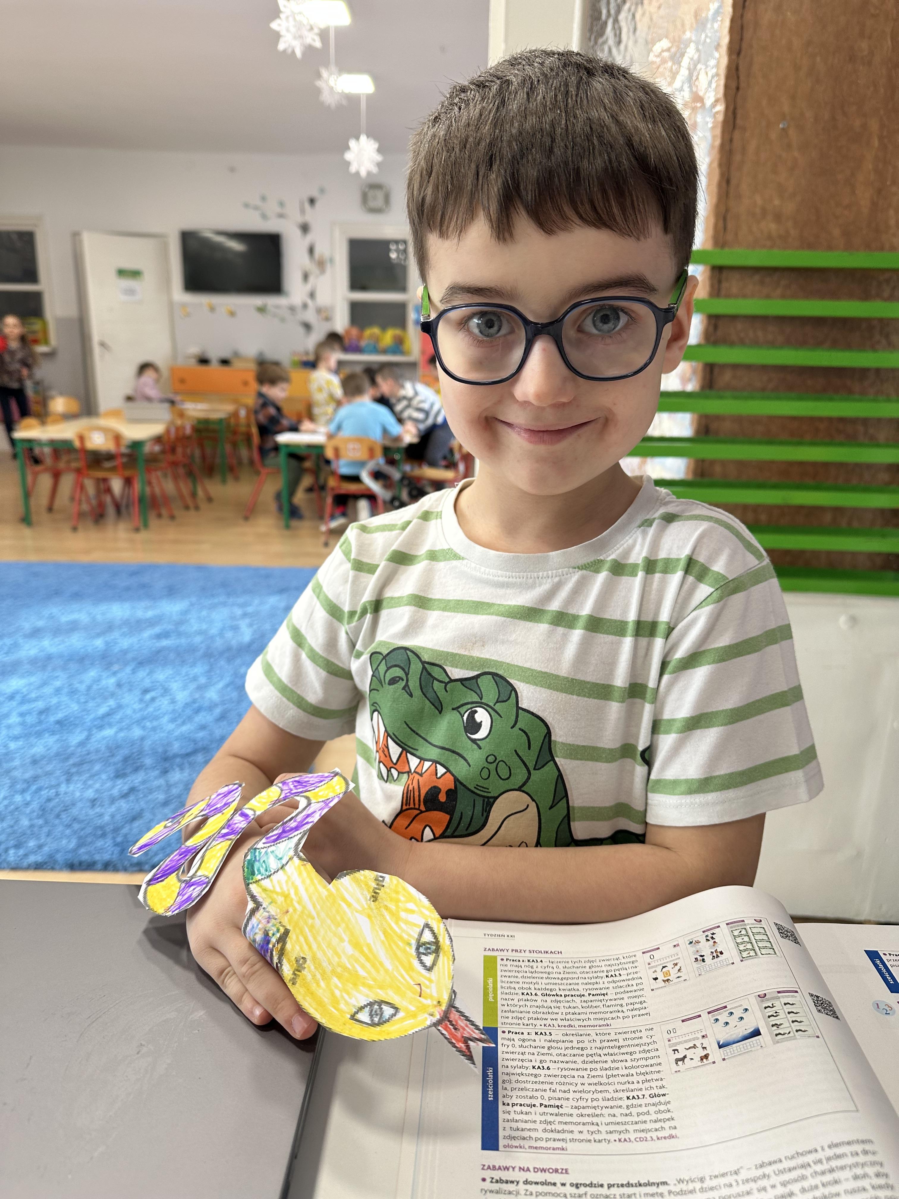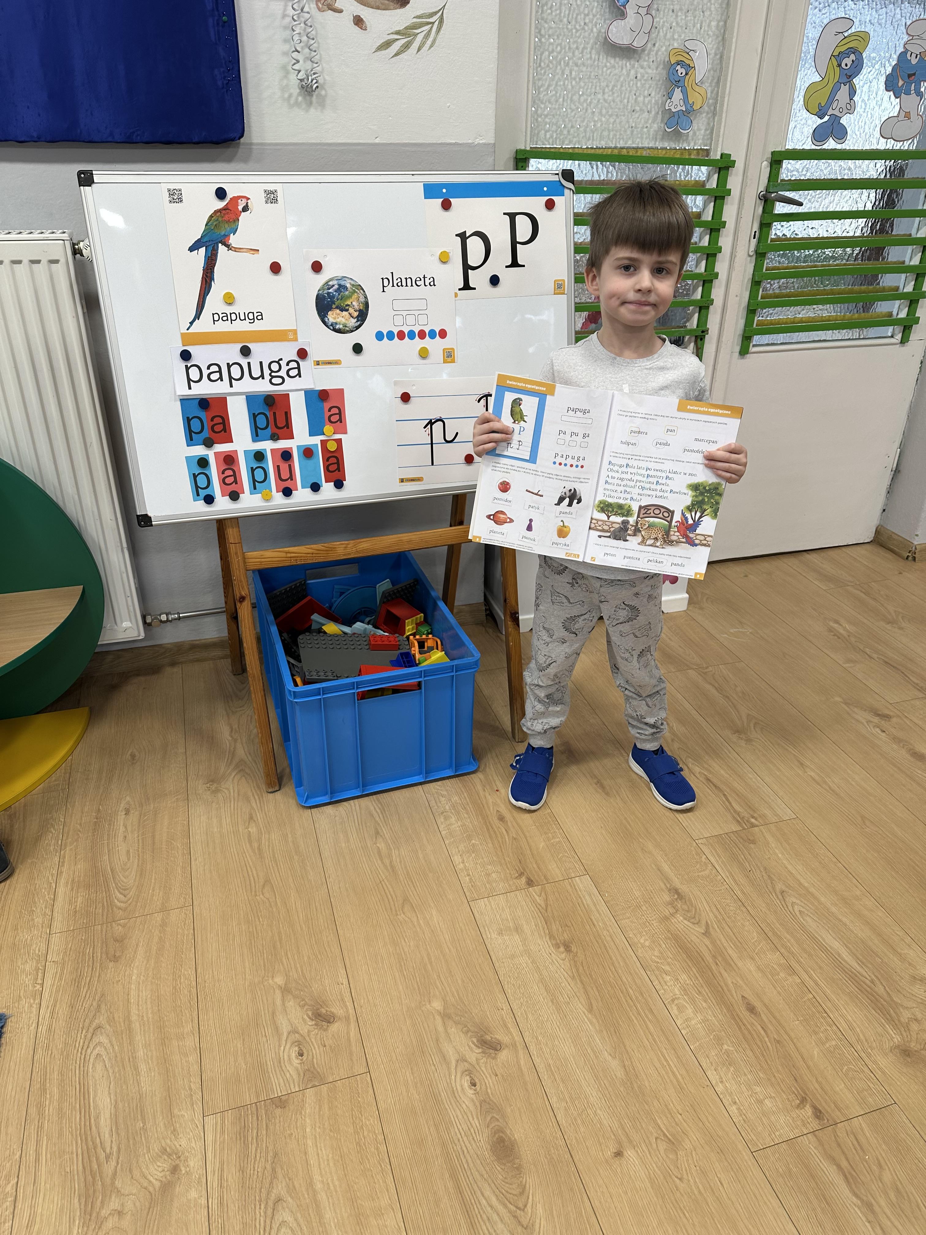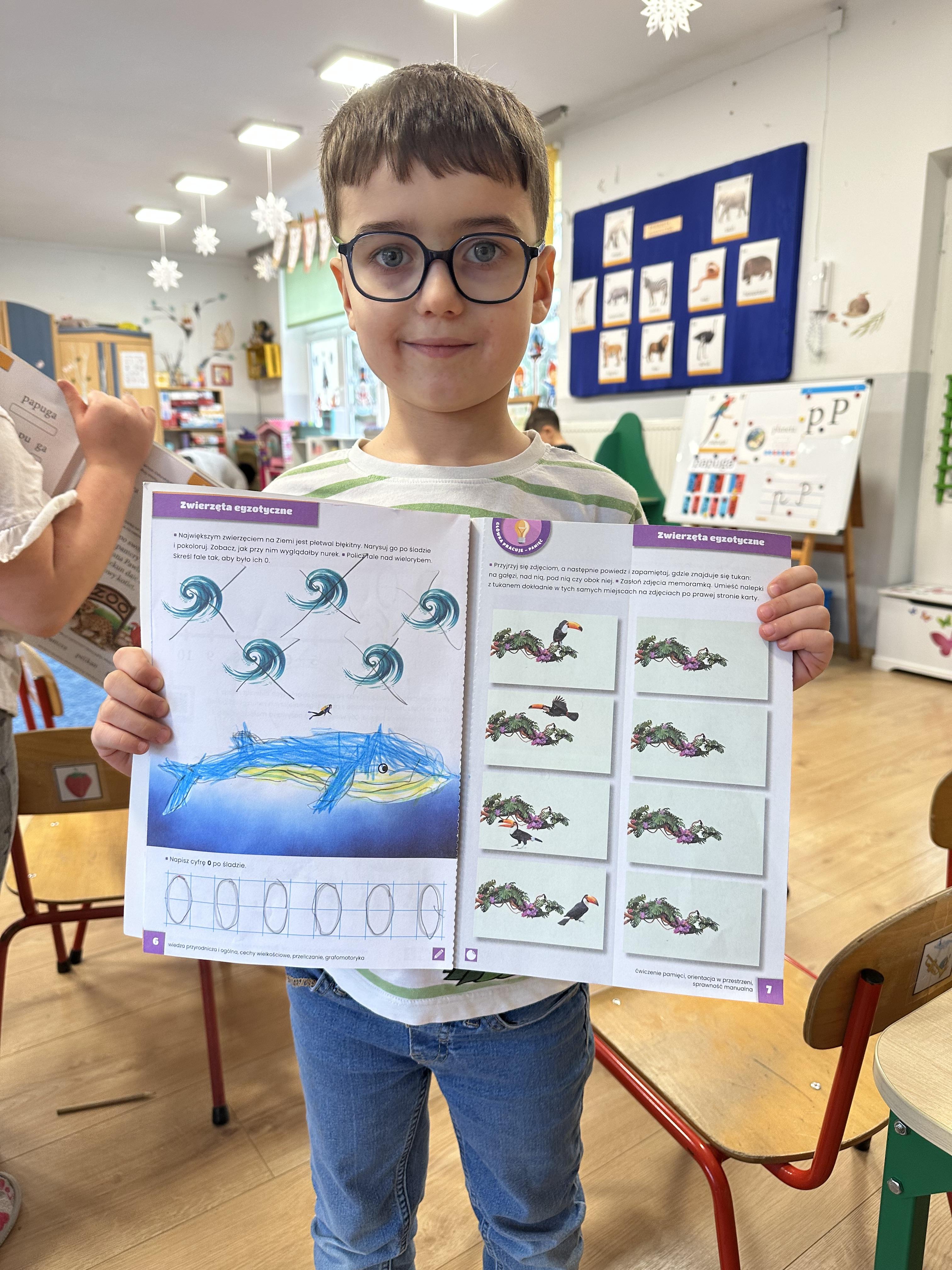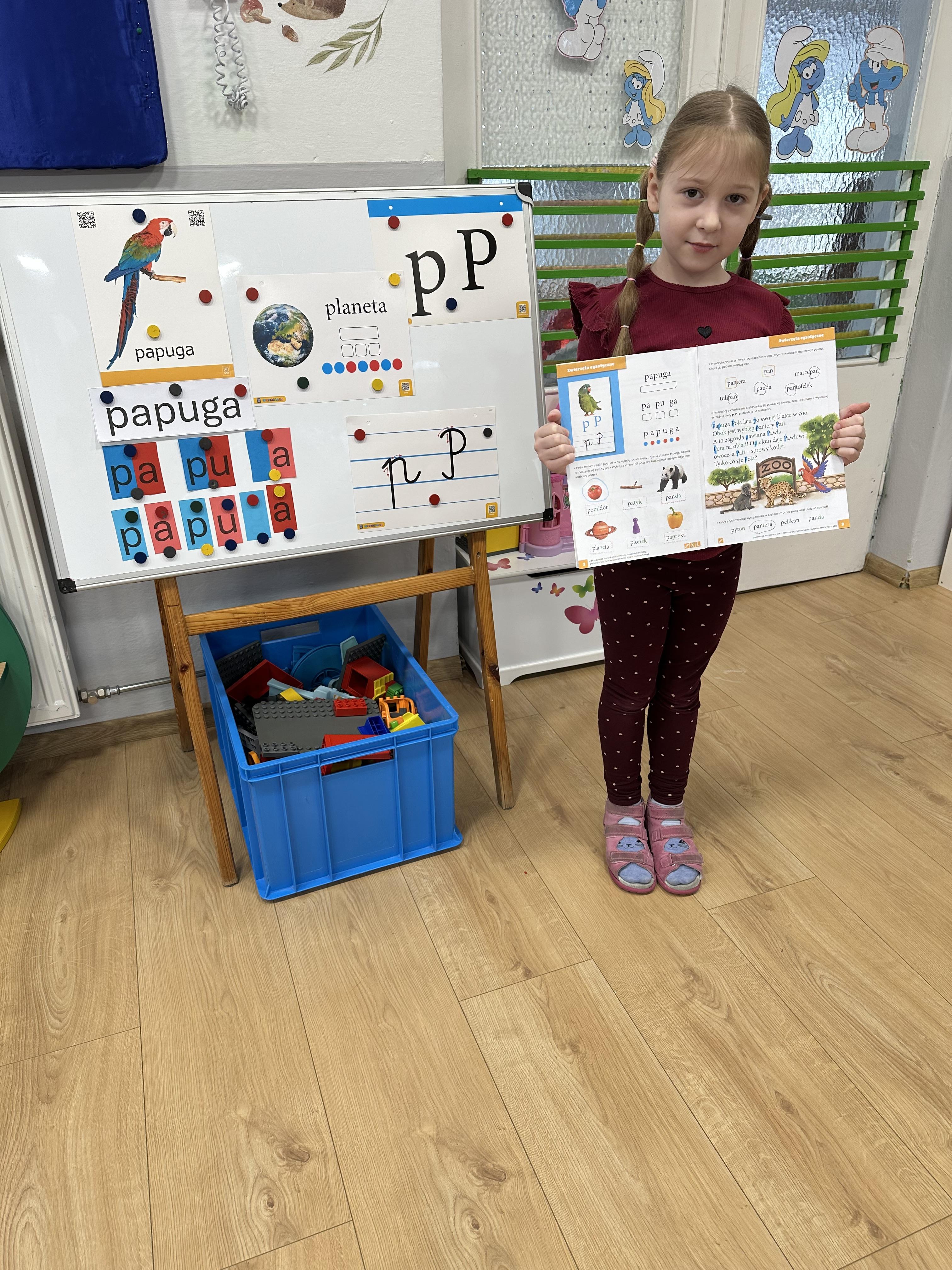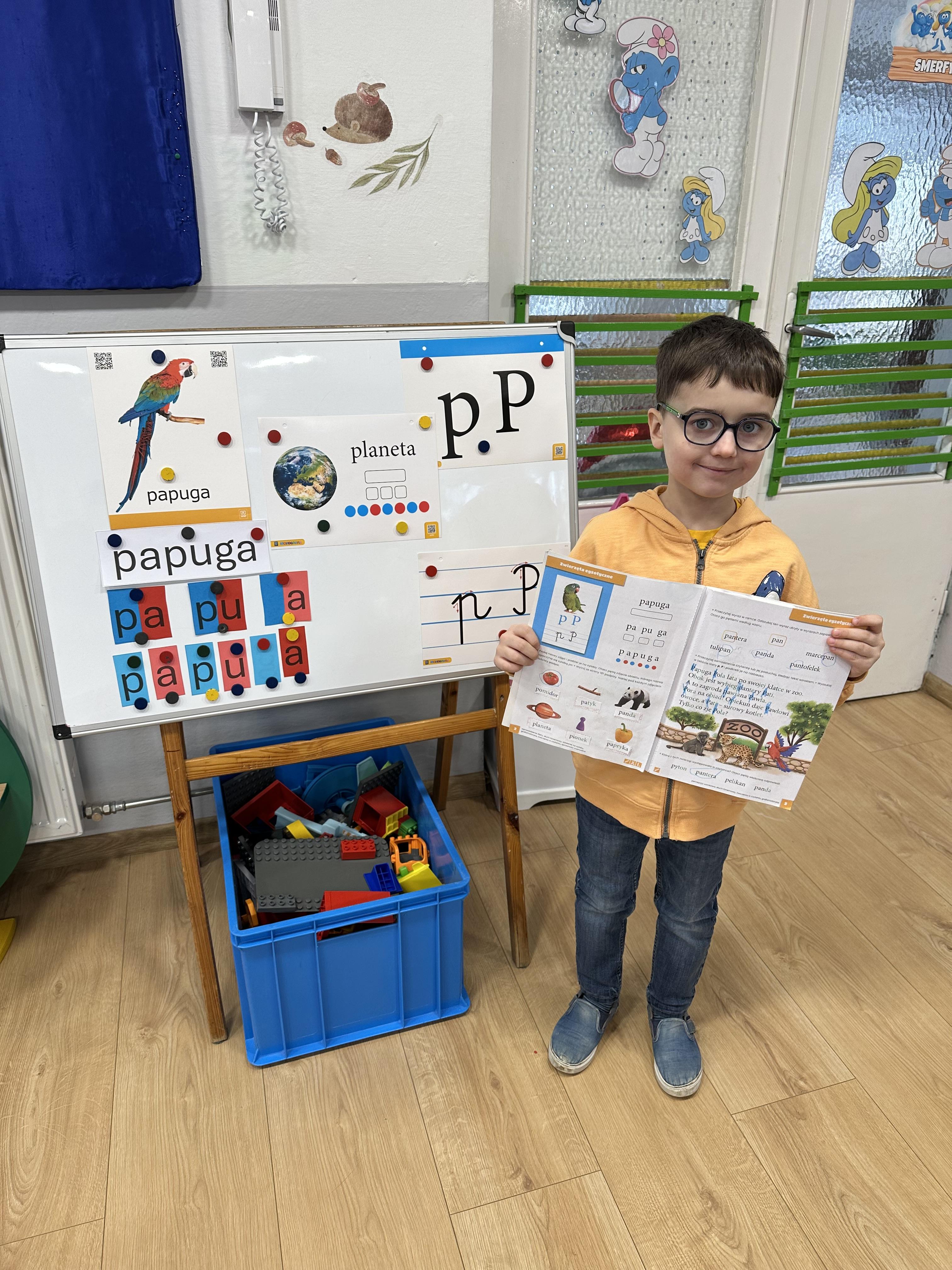 a także brały udział w ćwiczeniach uspakajających. Następnie wysłuchały opowiadania Marii Pawlisz ,,Piękne czy straszne?”, które stało się wstępem do rozmowy o emocjach. Sześciolatki podzieliły się swoimi doświadczeniami z nietypowymi gatunkami zwierząt i wymieniały się sposobami na radzenie sobie ze strachem czy odrazą. W trakcie zabawy „Boję się... Brzydzi mnie... Zachwyca mnie…” kształtowały umiejętność rozpoznawania i nazywania emocji. Podczas zajęć dydaktycznych poszerzyły wiedzę na temat zwierząt egzotycznych, rozwijały umiejętność kodowania, przypominały sobie figury geometryczne i ich właściwości. Dodatkowo w trakcie zabawy „Układamy nazwy zwierząt” doskonaliły analizę i syntezę głoskową. We wtorek dzieci zapoznały się z nową literą „p” małą i wielką, drukowaną i pisaną, poszerzały swoje kompetencje językowe, wyróżniały głoskę p w nagłosie, wymieniały różne słowa rozpoczynające się na tę głoskę, układały schemat graficzny słowa ,,papuga”, odróżniały litery „p”, „b” od „d”, rysowały głoskę p na plecach jednego z rówieśników. Ponadto wiedzę zdobytą z całego dnia przedszkolaki wykorzystały podczas pracy przy stolikach. Co więcej, podawały nazwy zdjęć i dzieliły je na sylaby, zaznaczały głoski p w słowach, samodzielnie czytały lub słuchały tekstu, ćwiczyły ruchy dłoni, rysowały po śladzie. W środę sześciolatki rozpoczęły dzień od zabawy przyrodniczej, rozróżniały gatunki zwierząt i odpowiadały na pytania nauczyciela. Poznały ciekawostki o małpach, sposobie ich komunikacji, miejsc życia i liczebności. Następnie poznały cyfrę 0 w trzech aspektach. Podczas ruchowych zabaw tematycznych dzieci poszerzyły swoje matematyczne umiejętności, które wykorzystały później w pracy przy stolikach. W czwartek podczas zabaw „Gdzie spotkamy te zwierzęta?” i „Pożywienie dla zwierzaka” przedszkolaki pogłębiały swoją ciekawość poznawczą