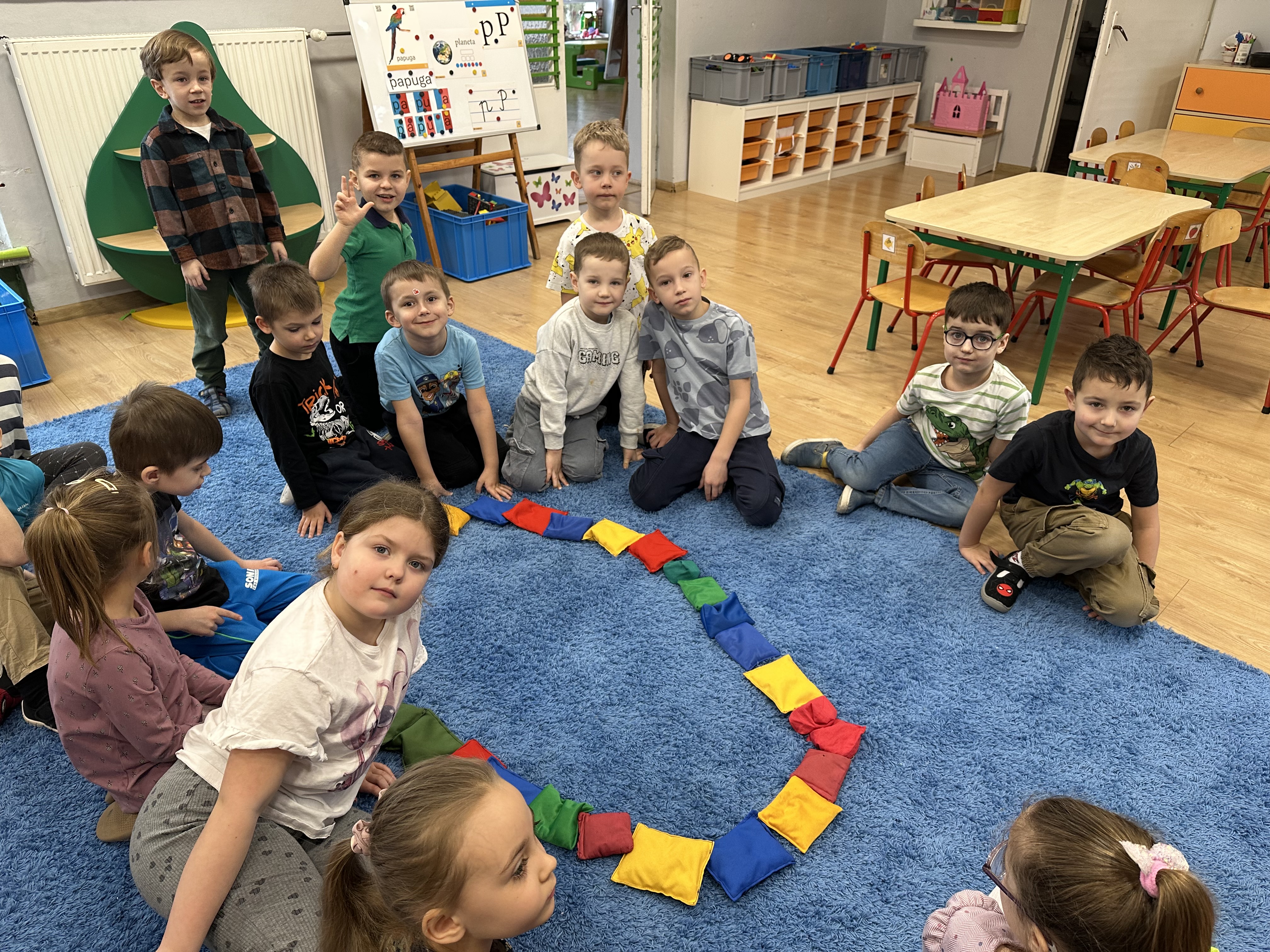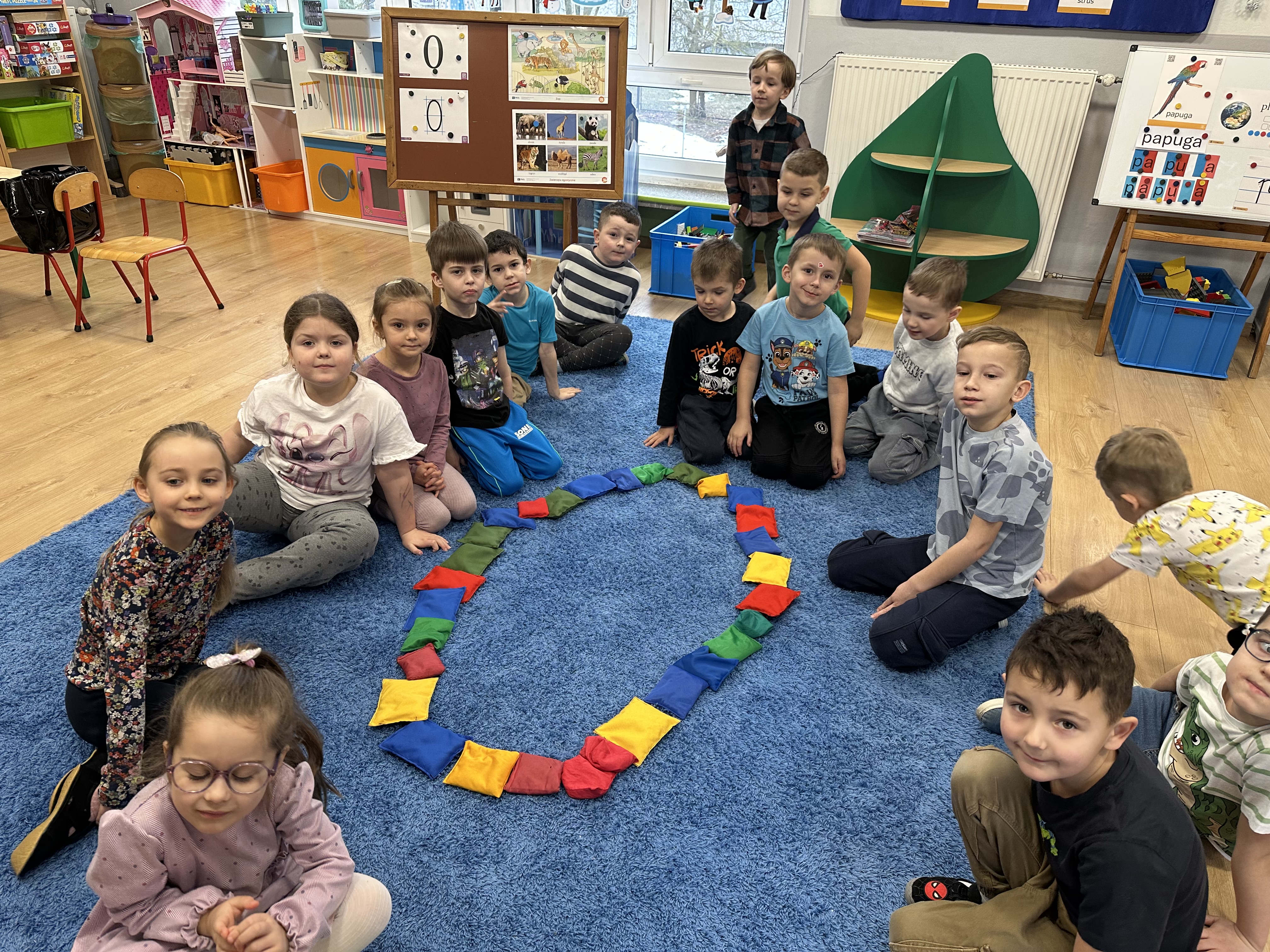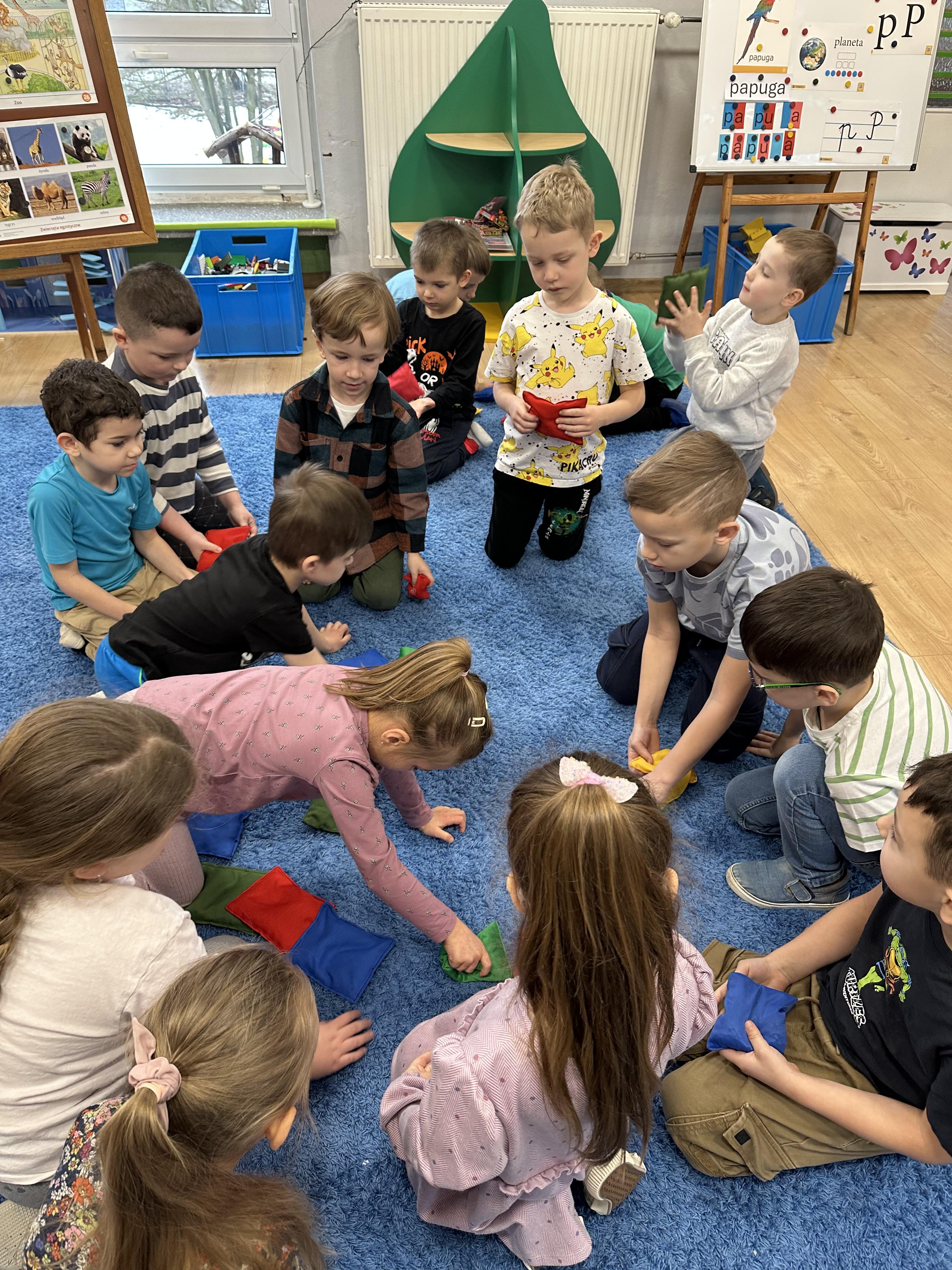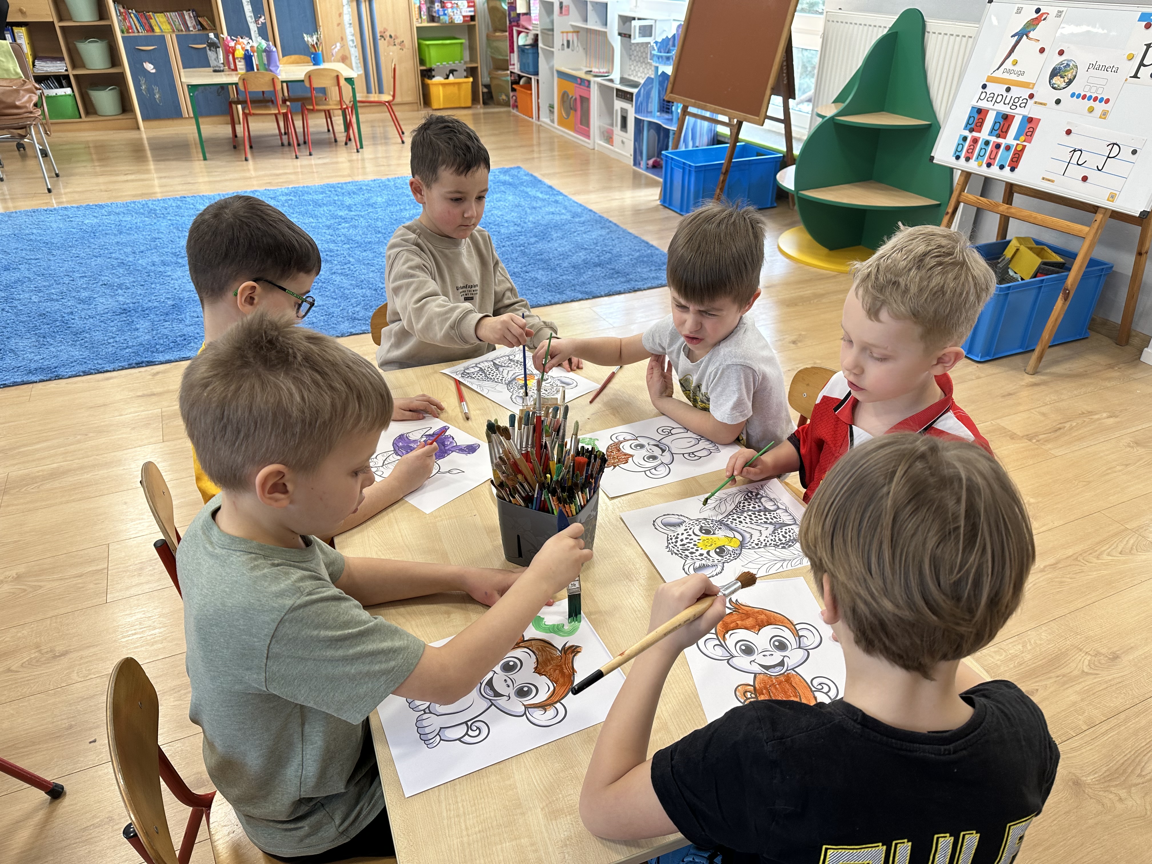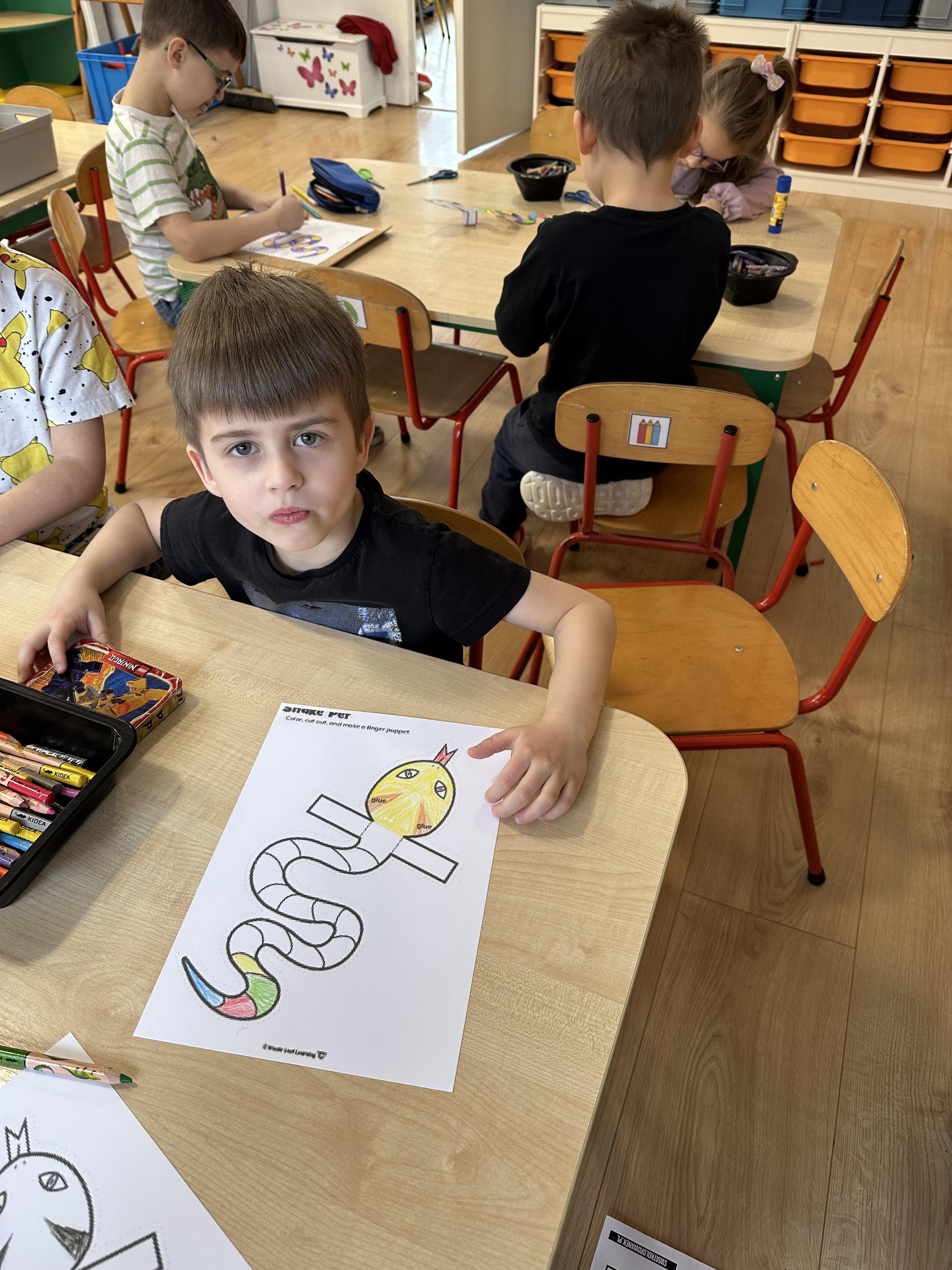 a także brały udział w ćwiczeniach uspakajających. Następnie wysłuchały opowiadania Marii Pawlisz ,,Piękne czy straszne?”, które stało się wstępem do rozmowy o emocjach. Sześciolatki podzieliły się swoimi doświadczeniami z nietypowymi gatunkami zwierząt i wymieniały się sposobami na radzenie sobie ze strachem czy odrazą. W trakcie zabawy „Boję się... Brzydzi mnie... Zachwyca mnie…” kształtowały umiejętność rozpoznawania i nazywania emocji. Podczas zajęć dydaktycznych poszerzyły wiedzę na temat zwierząt egzotycznych, rozwijały umiejętność kodowania, przypominały sobie figury geometryczne i ich właściwości. Dodatkowo w trakcie zabawy „Układamy nazwy zwierząt” doskonaliły analizę i syntezę głoskową. We wtorek dzieci zapoznały się z nową literą „p” małą i wielką, drukowaną i pisaną, poszerzały swoje kompetencje językowe, wyróżniały głoskę p w nagłosie, wymieniały różne słowa rozpoczynające się na tę głoskę, układały schemat graficzny słowa ,,papuga”, odróżniały litery „p”, „b” od „d”, rysowały głoskę p na plecach jednego z rówieśników. Ponadto wiedzę zdobytą z całego dnia przedszkolaki wykorzystały podczas pracy przy stolikach. Co więcej, podawały nazwy zdjęć i dzieliły je na sylaby, zaznaczały głoski p w słowach, samodzielnie czytały lub słuchały tekstu, ćwiczyły ruchy dłoni, rysowały po śladzie. W środę sześciolatki rozpoczęły dzień od zabawy przyrodniczej, rozróżniały gatunki zwierząt i odpowiadały na pytania nauczyciela. Poznały ciekawostki o małpach, sposobie ich komunikacji, miejsc życia i liczebności. Następnie poznały cyfrę 0 w trzech aspektach. Podczas ruchowych zabaw tematycznych dzieci poszerzyły swoje matematyczne umiejętności, które wykorzystały później w pracy przy stolikach. W czwartek podczas zabaw „Gdzie spotkamy te zwierzęta?” i „Pożywienie dla zwierzaka” przedszkolaki pogłębiały swoją ciekawość poznawczą