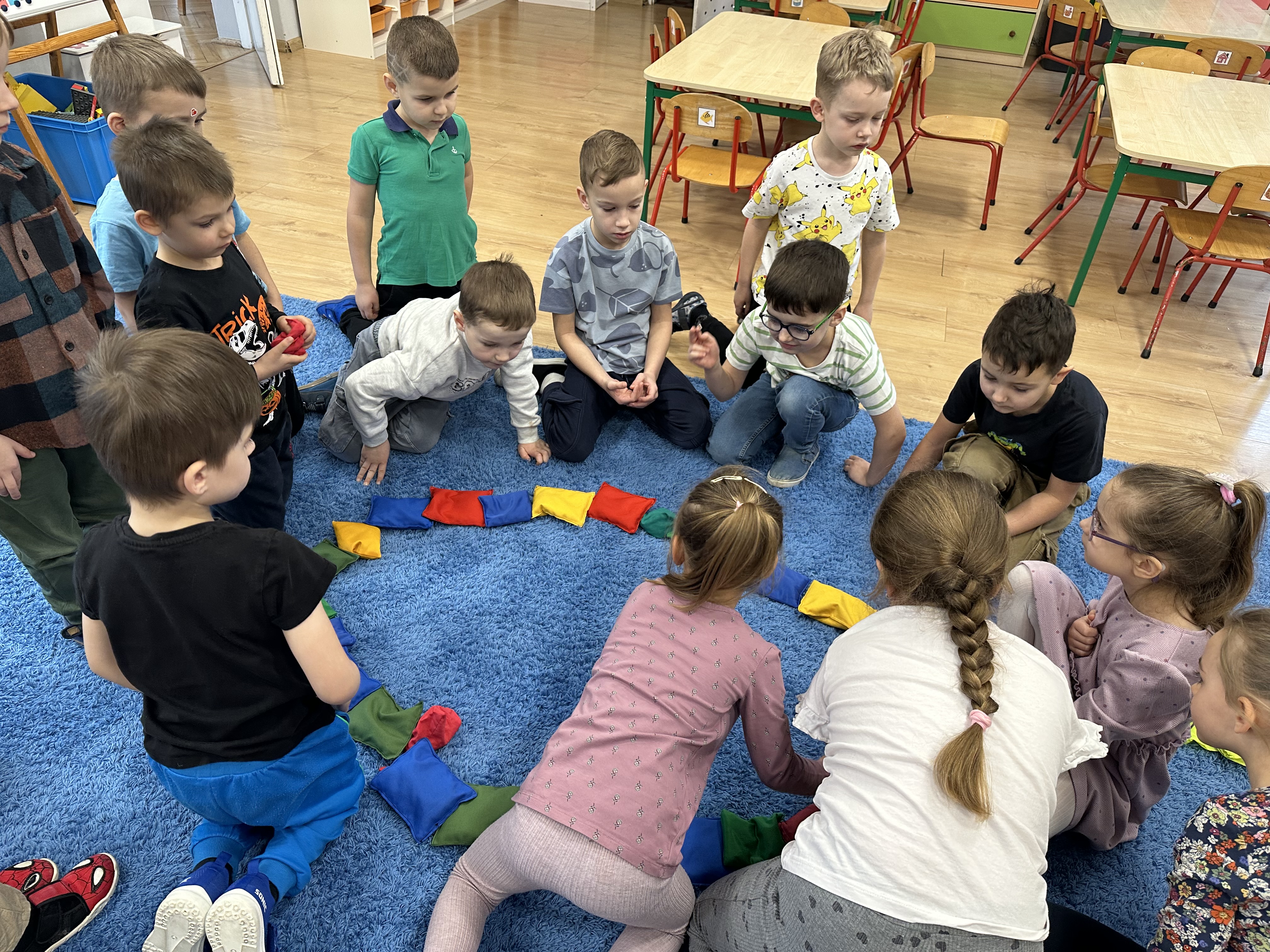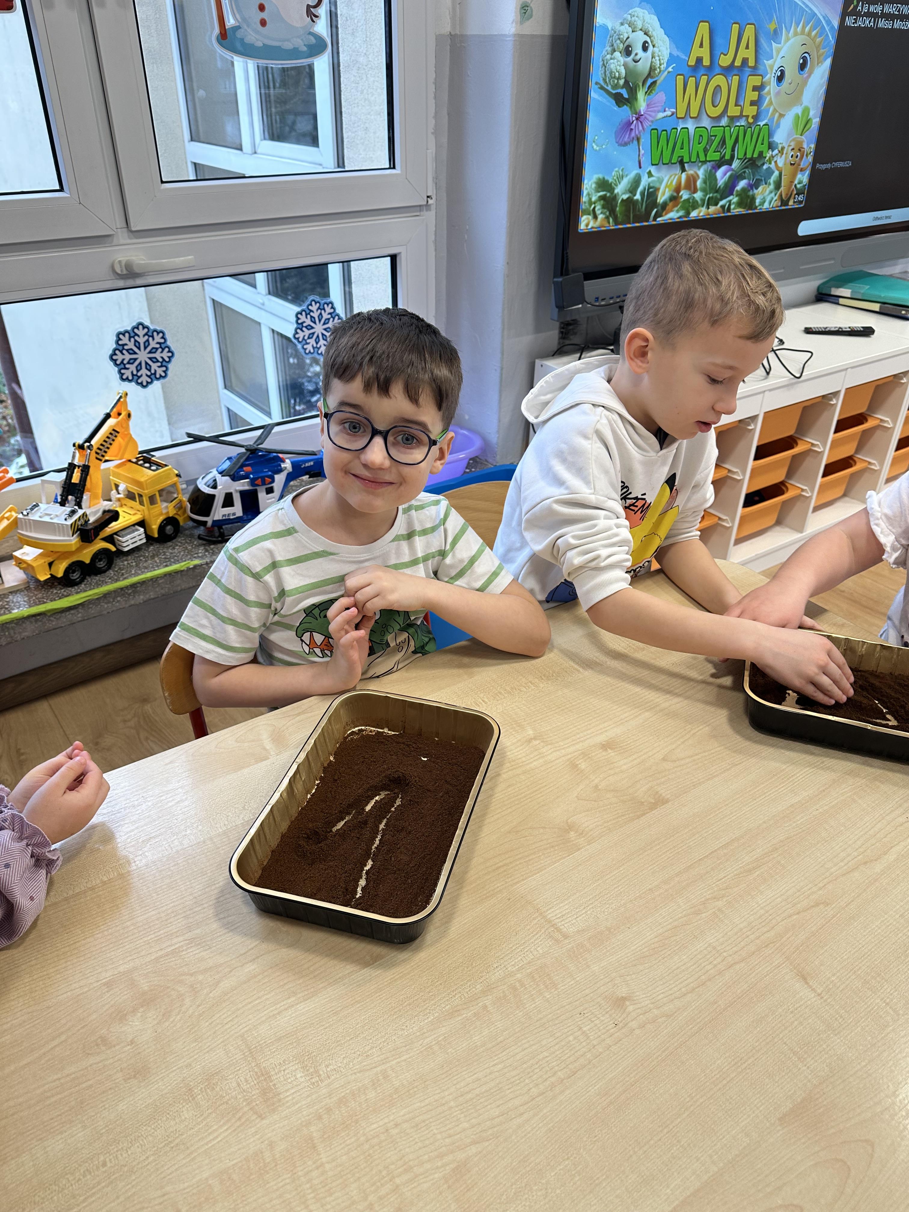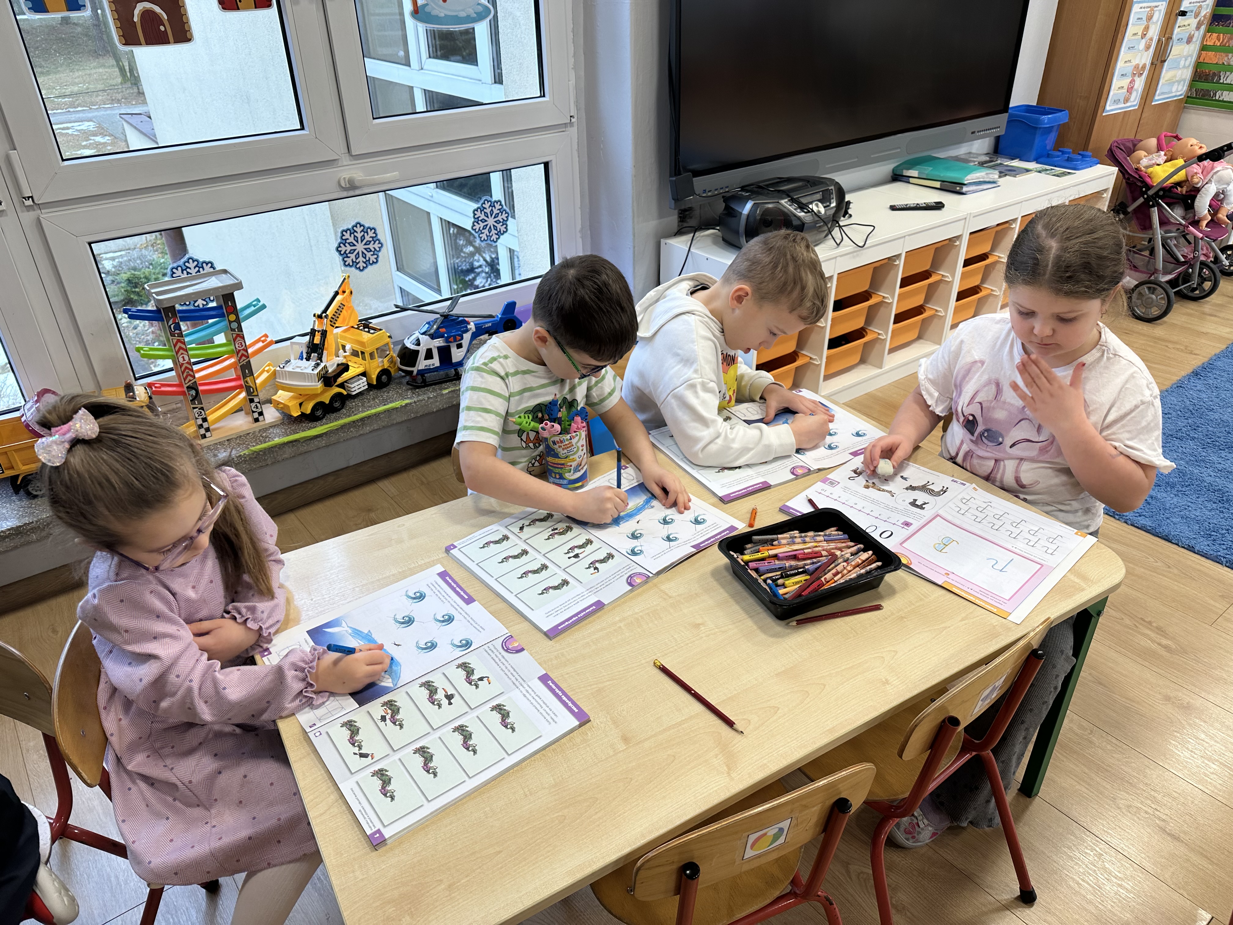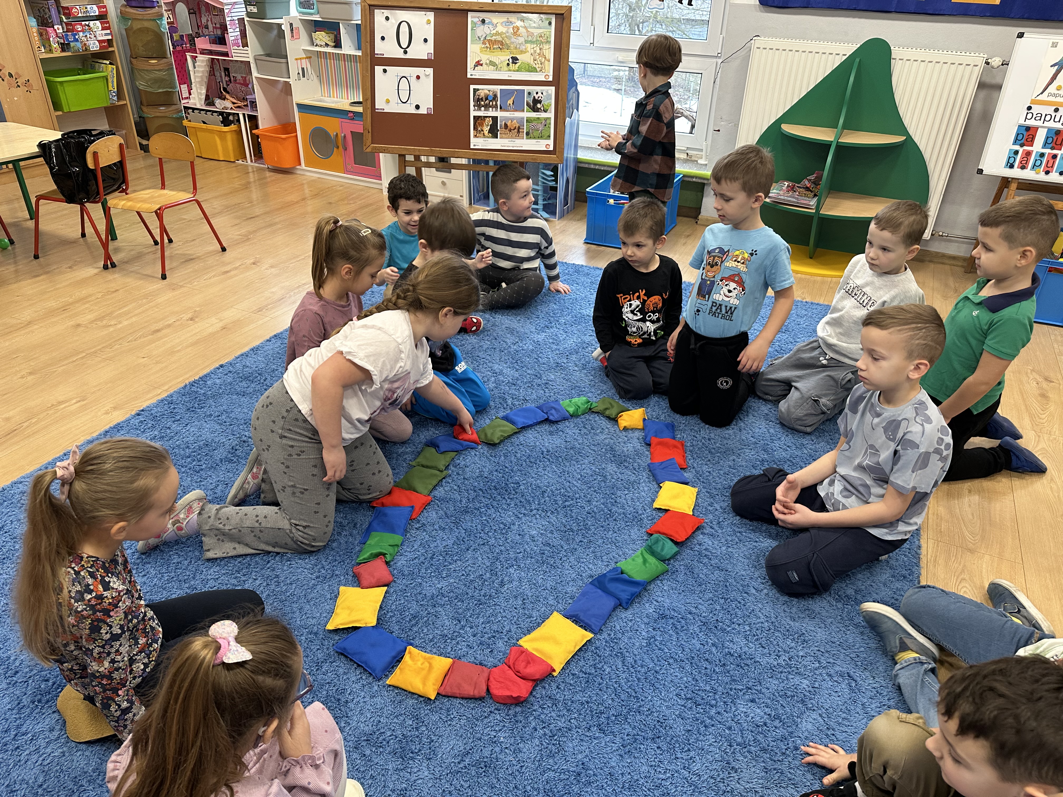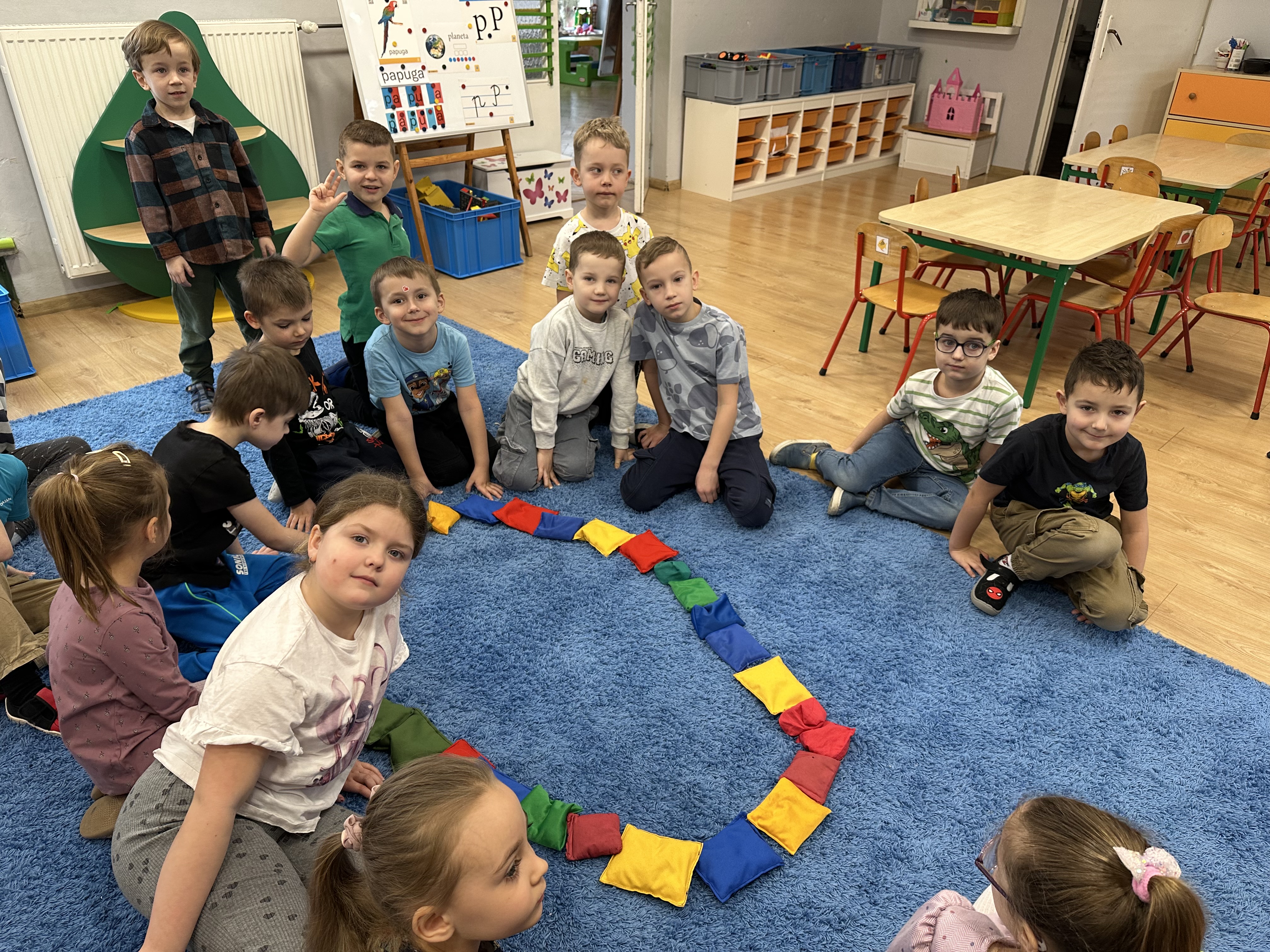 a także brały udział w ćwiczeniach uspakajających. Następnie wysłuchały opowiadania Marii Pawlisz ,,Piękne czy straszne?”, które stało się wstępem do rozmowy o emocjach. Sześciolatki podzieliły się swoimi doświadczeniami z nietypowymi gatunkami zwierząt i wymieniały się sposobami na radzenie sobie ze strachem czy odrazą. W trakcie zabawy „Boję się... Brzydzi mnie... Zachwyca mnie…” kształtowały umiejętność rozpoznawania i nazywania emocji. Podczas zajęć dydaktycznych poszerzyły wiedzę na temat zwierząt egzotycznych, rozwijały umiejętność kodowania, przypominały sobie figury geometryczne i ich właściwości. Dodatkowo w trakcie zabawy „Układamy nazwy zwierząt” doskonaliły analizę i syntezę głoskową. We wtorek dzieci zapoznały się z nową literą „p” małą i wielką, drukowaną i pisaną, poszerzały swoje kompetencje językowe, wyróżniały głoskę p w nagłosie, wymieniały różne słowa rozpoczynające się na tę głoskę, układały schemat graficzny słowa ,,papuga”, odróżniały litery „p”, „b” od „d”, rysowały głoskę p na plecach jednego z rówieśników. Ponadto wiedzę zdobytą z całego dnia przedszkolaki wykorzystały podczas pracy przy stolikach. Co więcej, podawały nazwy zdjęć i dzieliły je na sylaby, zaznaczały głoski p w słowach, samodzielnie czytały lub słuchały tekstu, ćwiczyły ruchy dłoni, rysowały po śladzie. W środę sześciolatki rozpoczęły dzień od zabawy przyrodniczej, rozróżniały gatunki zwierząt i odpowiadały na pytania nauczyciela. Poznały ciekawostki o małpach, sposobie ich komunikacji, miejsc życia i liczebności. Następnie poznały cyfrę 0 w trzech aspektach. Podczas ruchowych zabaw tematycznych dzieci poszerzyły swoje matematyczne umiejętności, które wykorzystały później w pracy przy stolikach. W czwartek podczas zabaw „Gdzie spotkamy te zwierzęta?” i „Pożywienie dla zwierzaka” przedszkolaki pogłębiały swoją ciekawość poznawczą
