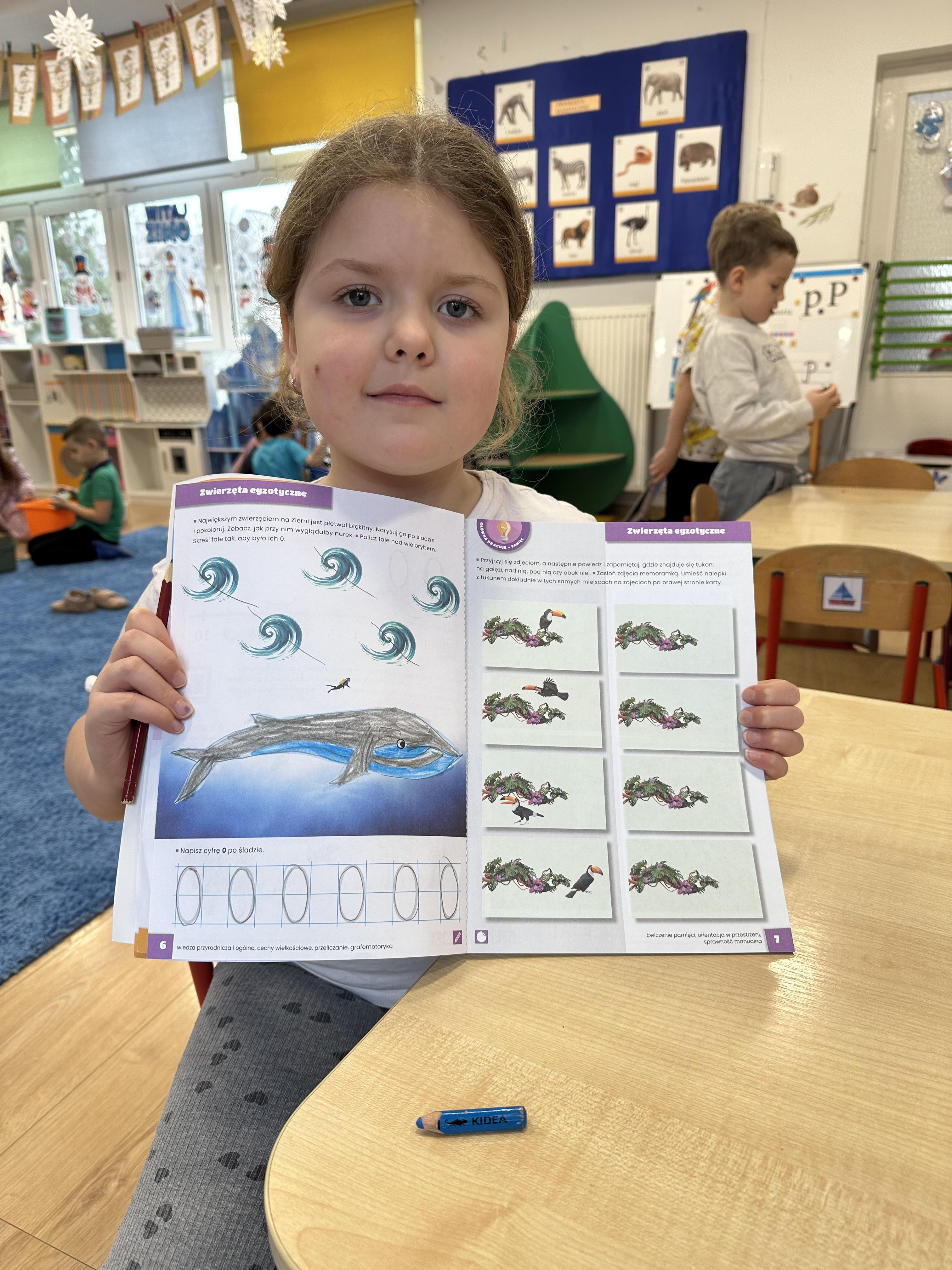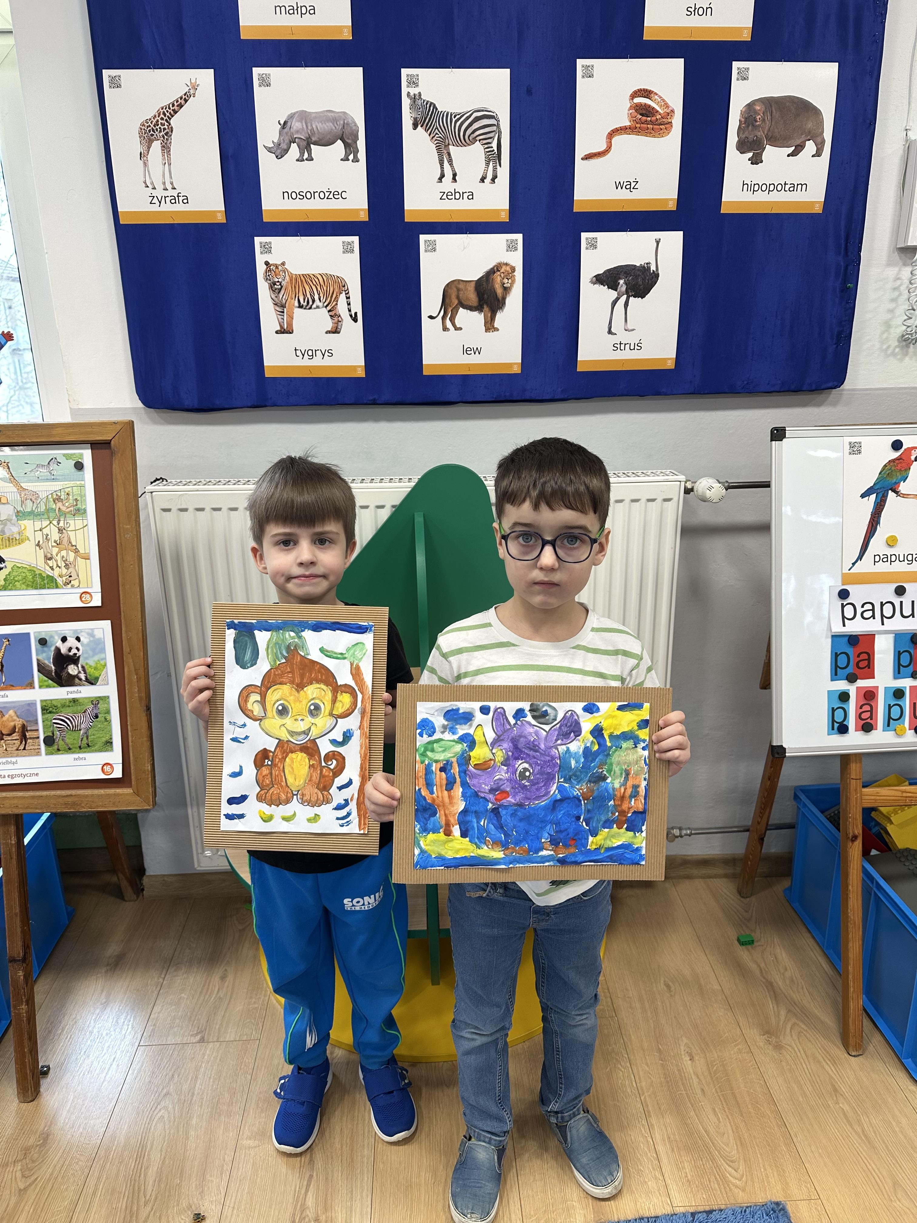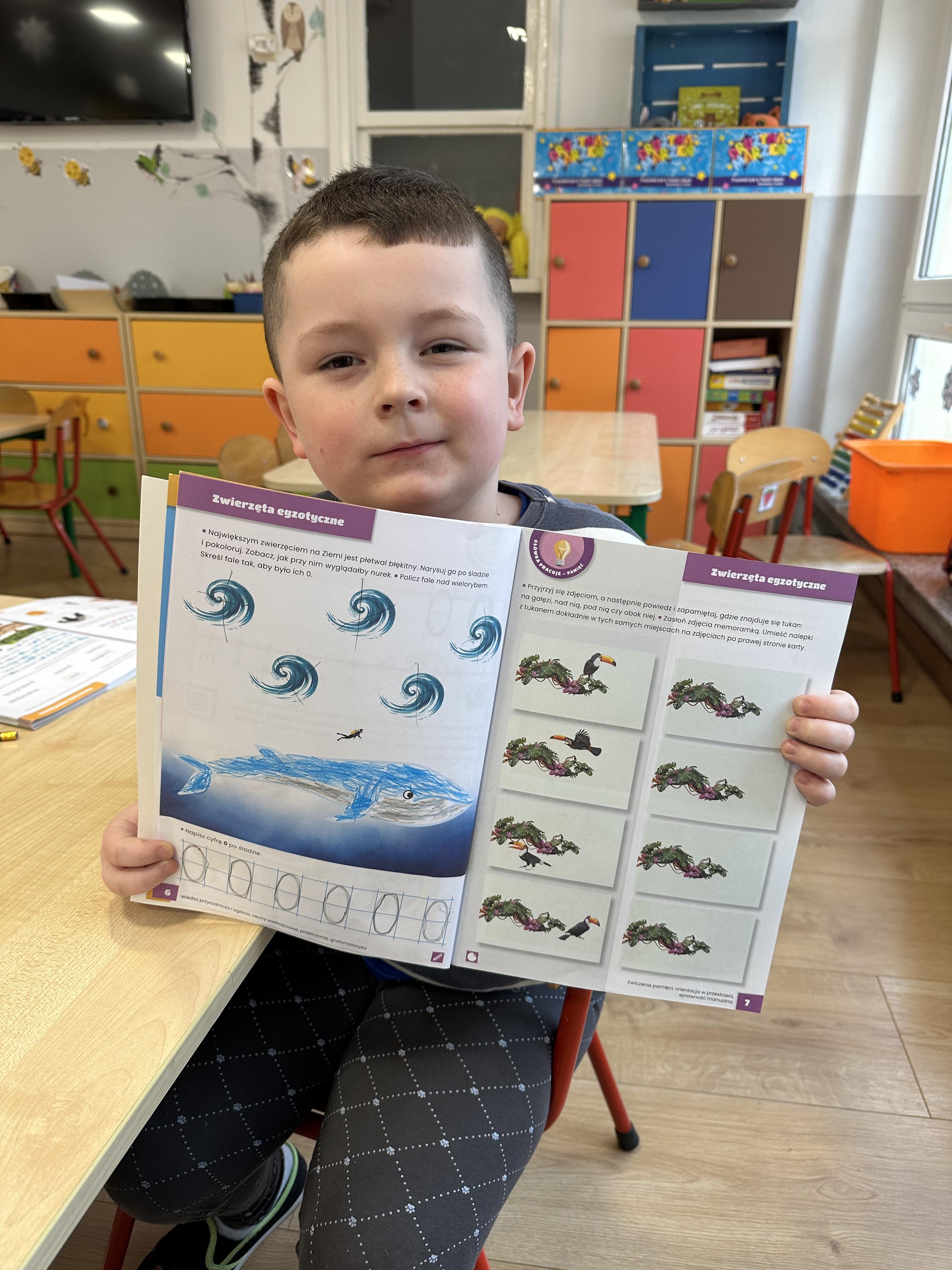 i rozwijały wiedzę na temat miejsc występowania zwierząt egzotycznych na świecie. W trakcie zabawy „Orka” zaznajomiły się z ciekawostkami dotyczącymi tego zwierzęcia. Piątek służył utrwaleniu wiedzy w działaniach muzyczno-plastyczno-ruchowych. Dzieci nie tylko utrwalały znajomość wcześniej poznanej piosenki, lecz także rozwiązywały zagadki językowe, doskonaliły umiejętność kodowania i poznały związki frazeologiczne związane ze zwierzętami.