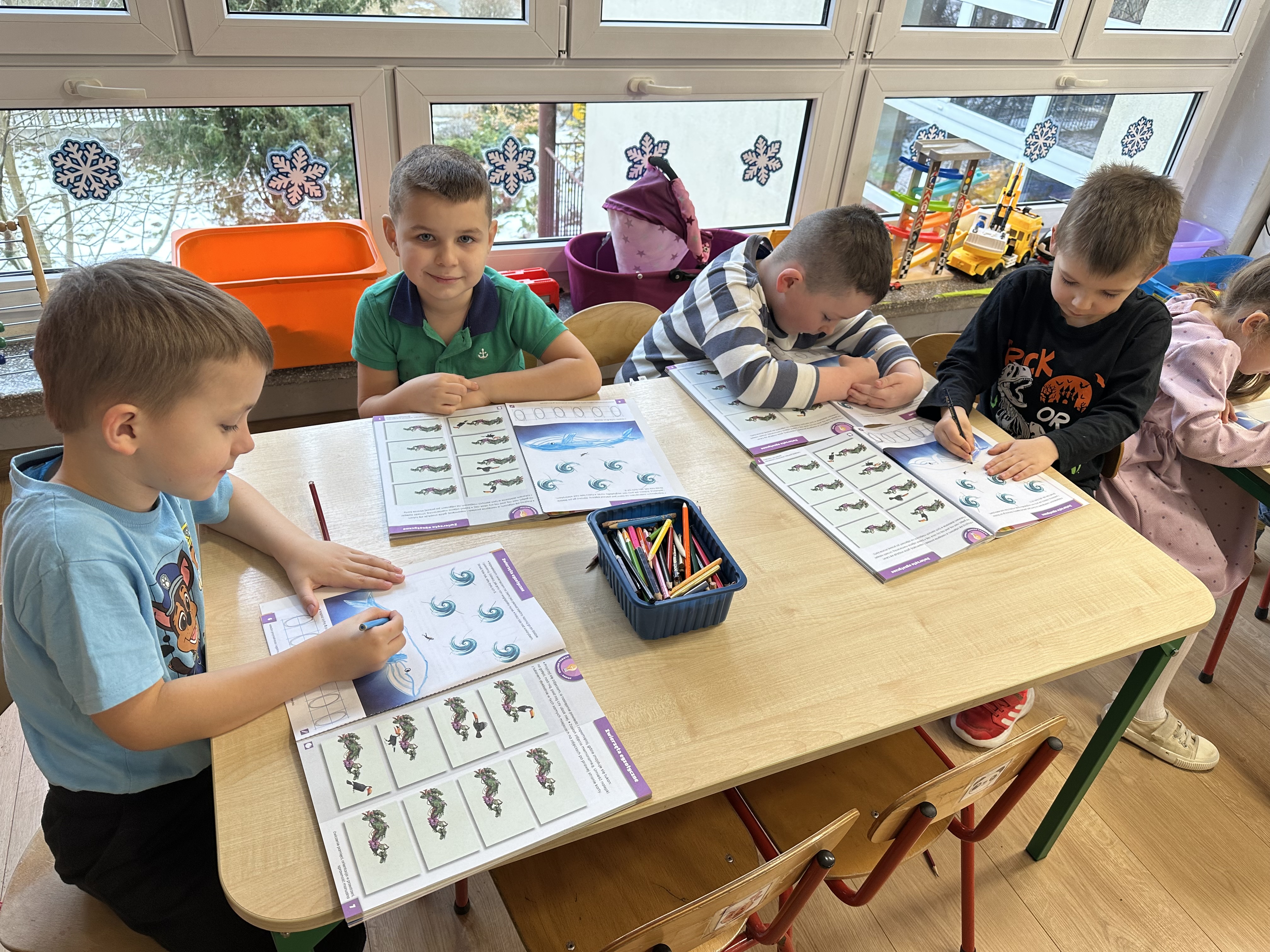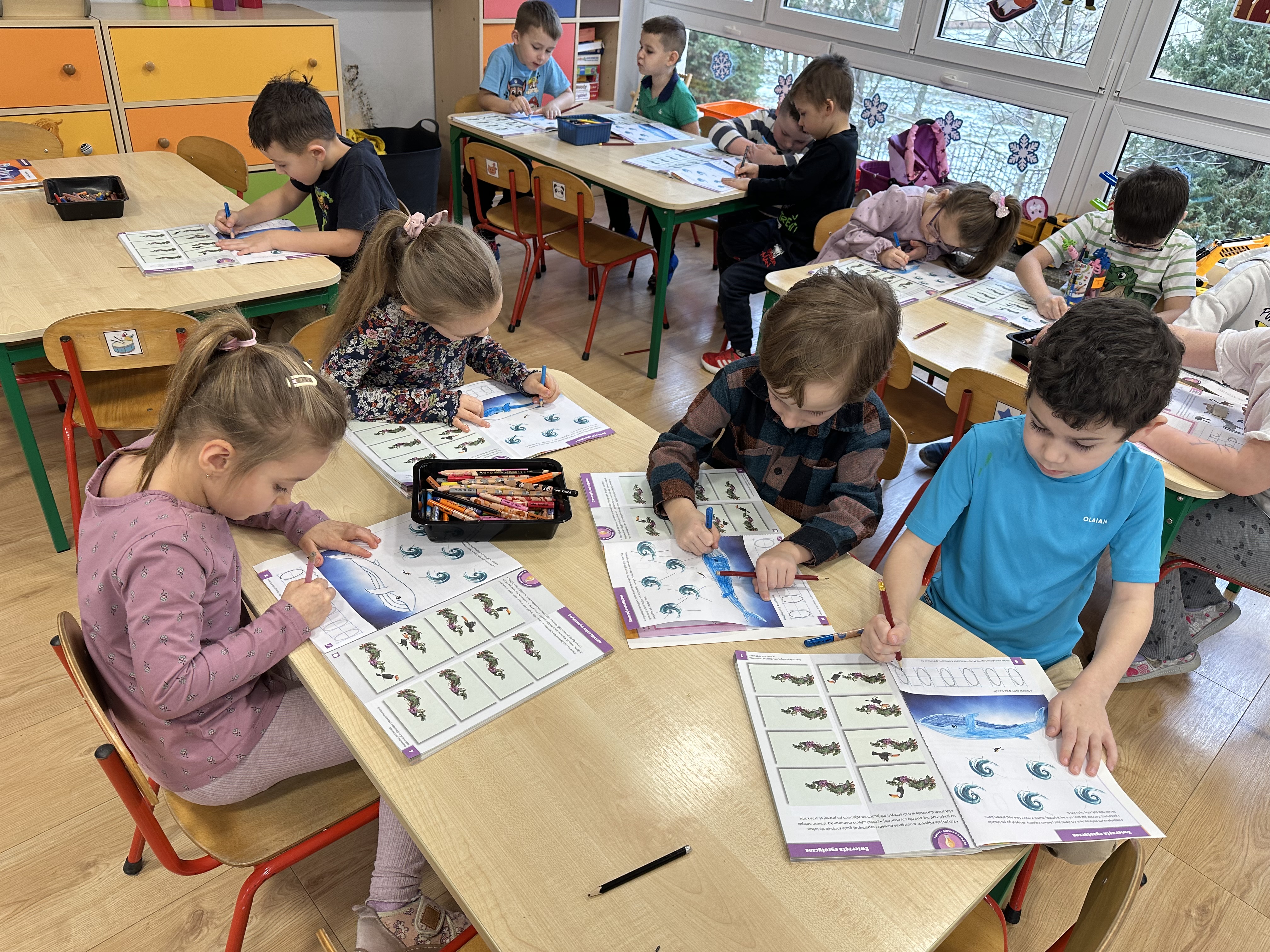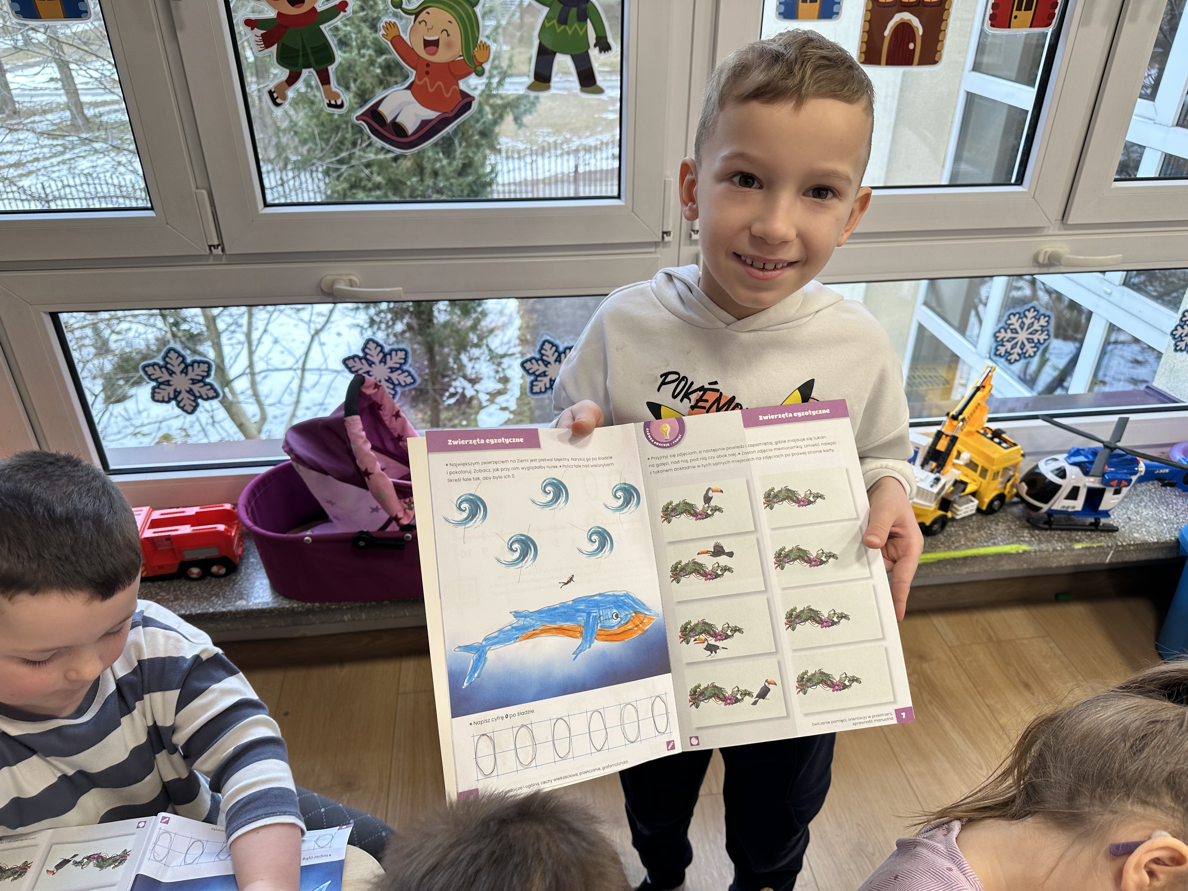 i rozwijały wiedzę na temat miejsc występowania zwierząt egzotycznych na świecie. W trakcie zabawy „Orka” zaznajomiły się z ciekawostkami dotyczącymi tego zwierzęcia. Piątek służył utrwaleniu wiedzy w działaniach muzyczno-plastyczno-ruchowych. Dzieci nie tylko utrwalały znajomość wcześniej poznanej piosenki, lecz także rozwiązywały zagadki językowe, doskonaliły umiejętność kodowania i poznały związki frazeologiczne związane ze zwierzętami.