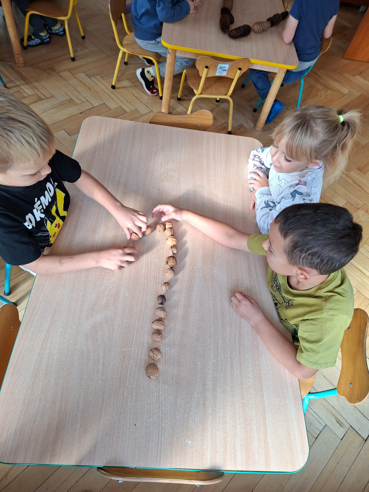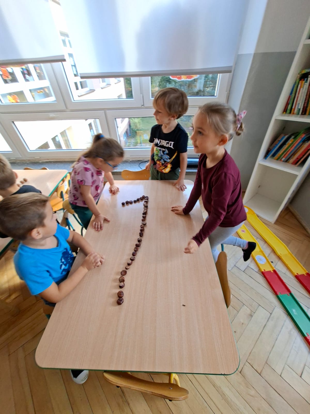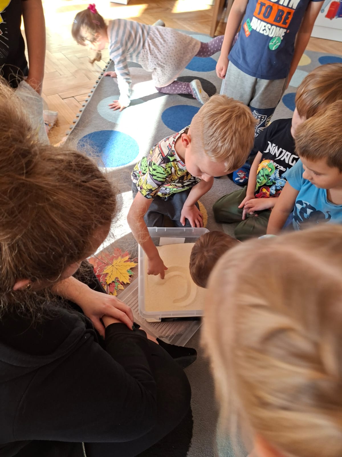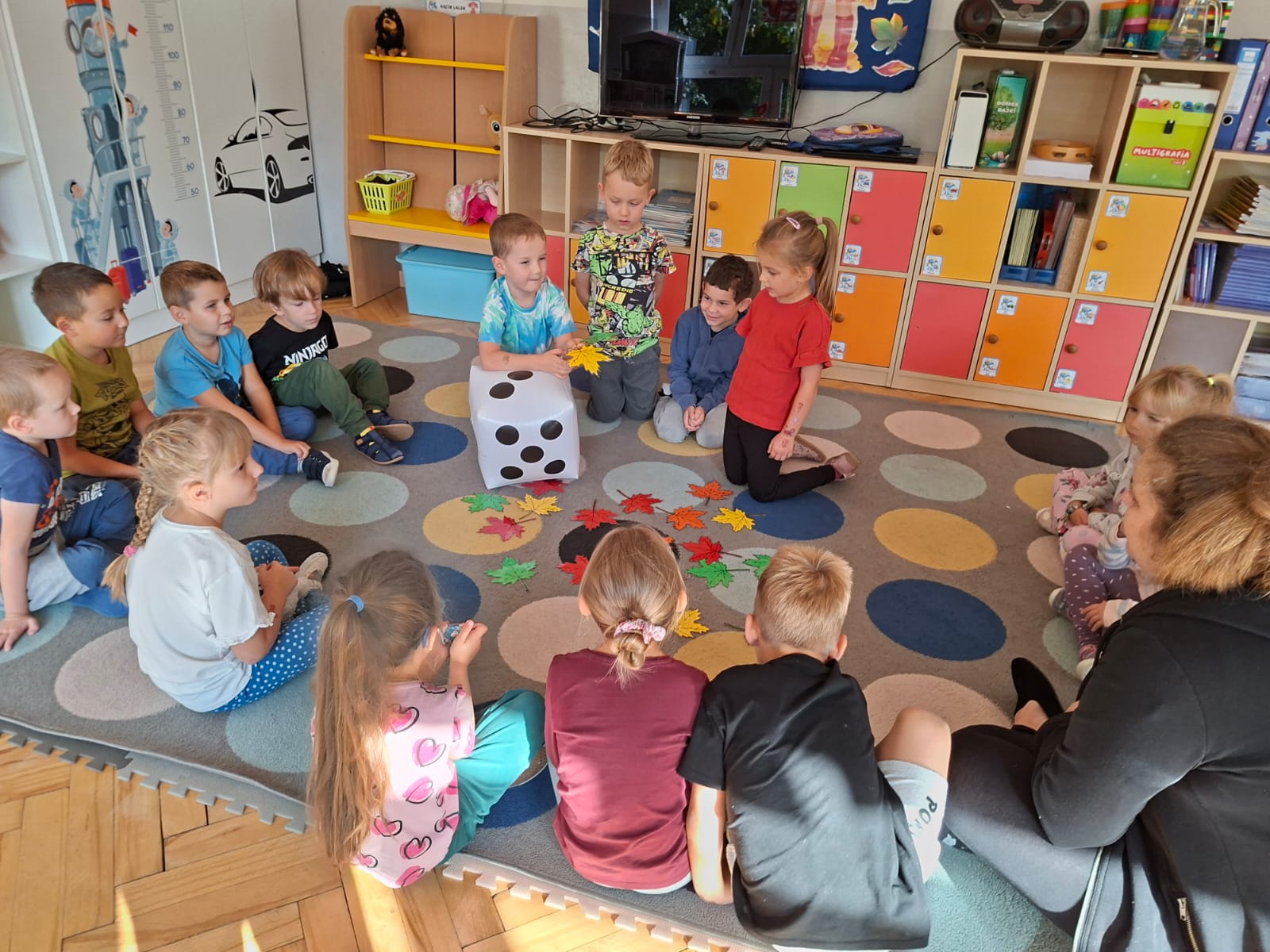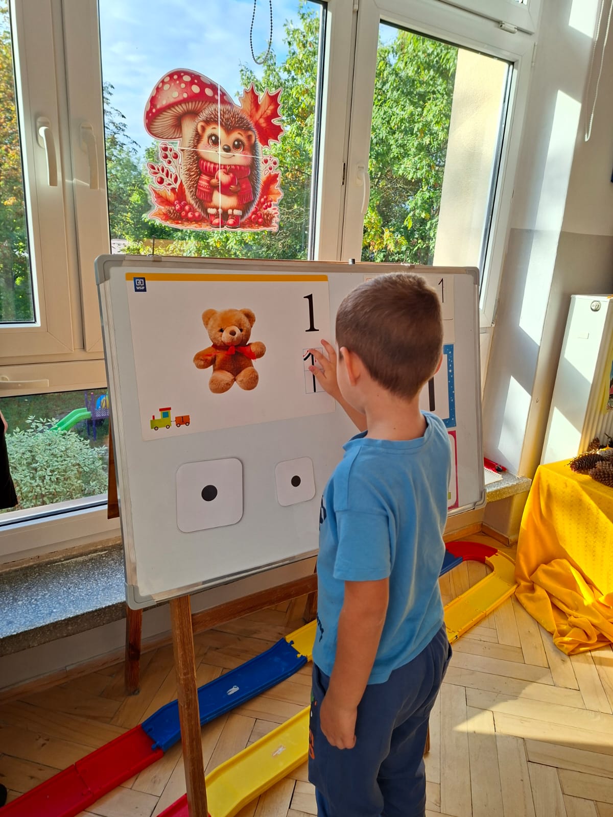 W tym tygodniu poznaliśmy literkę A, a ( pisaną i drukowaną) oraz cyferkę 1 wykonując z nimi ćwiczenia grafomotoryczne, zadania w naszych książkach, utrwalając je poprzez układanie z darów jesieni oraz pisząc w kaszy manny. Przeliczaliśmy również liście, rzucając kostką.