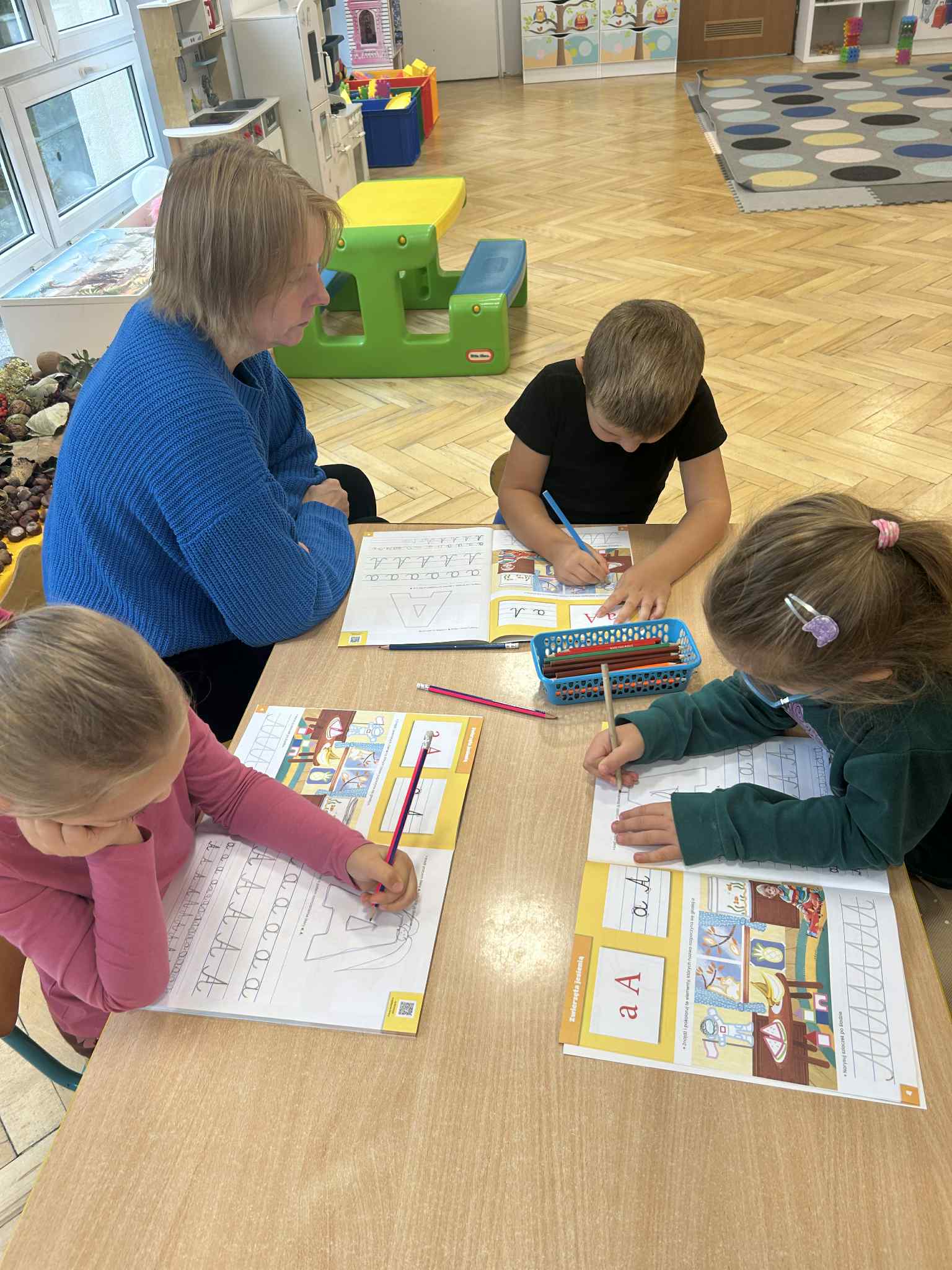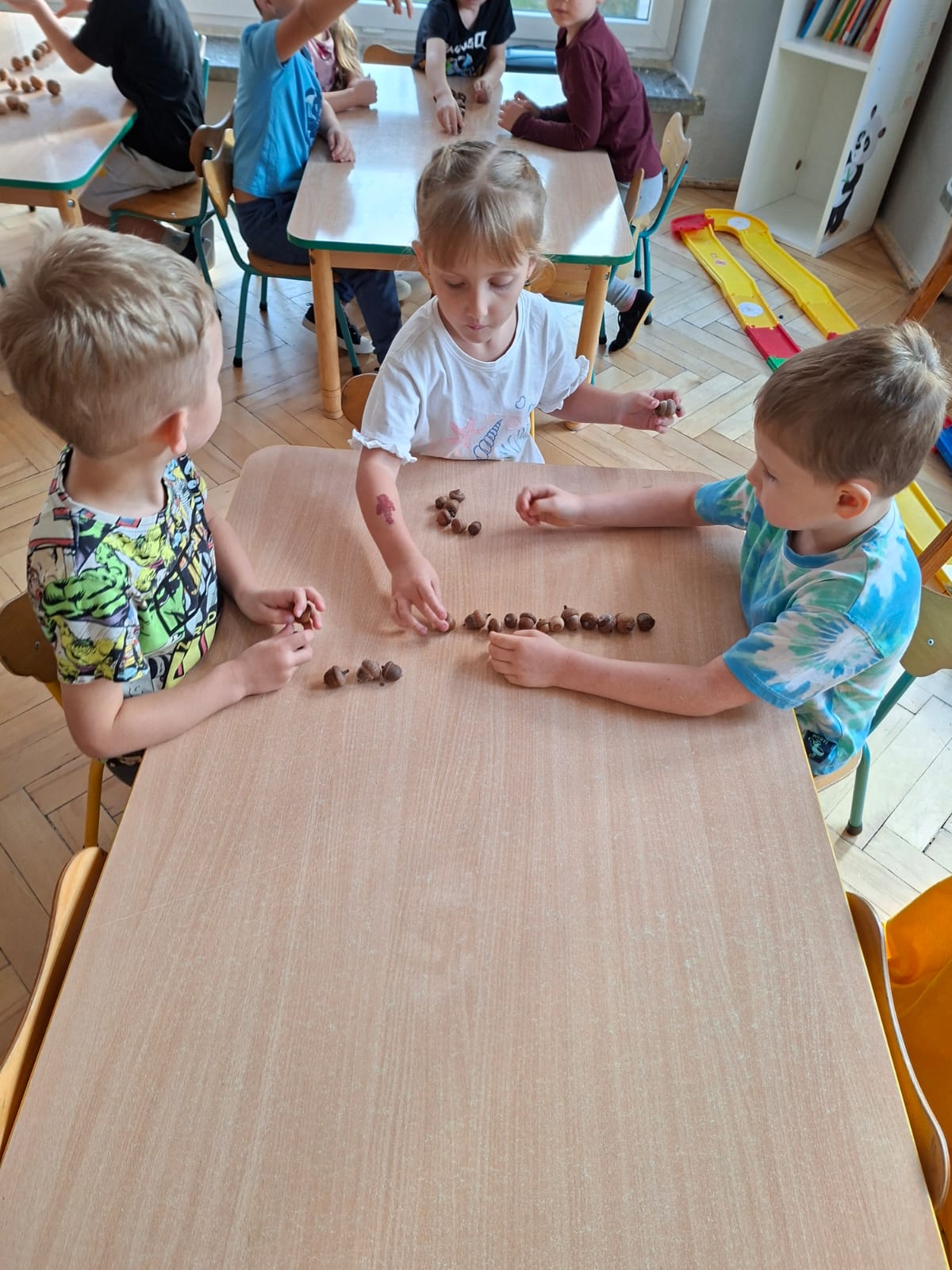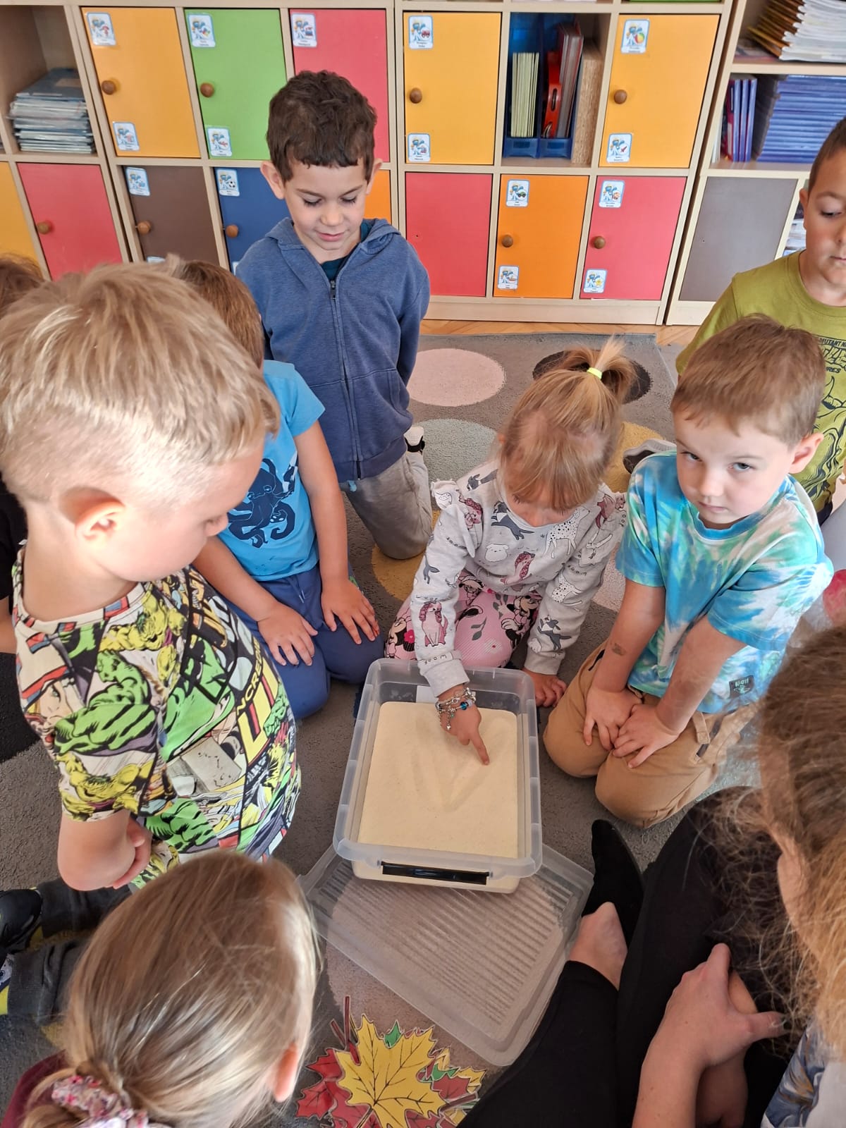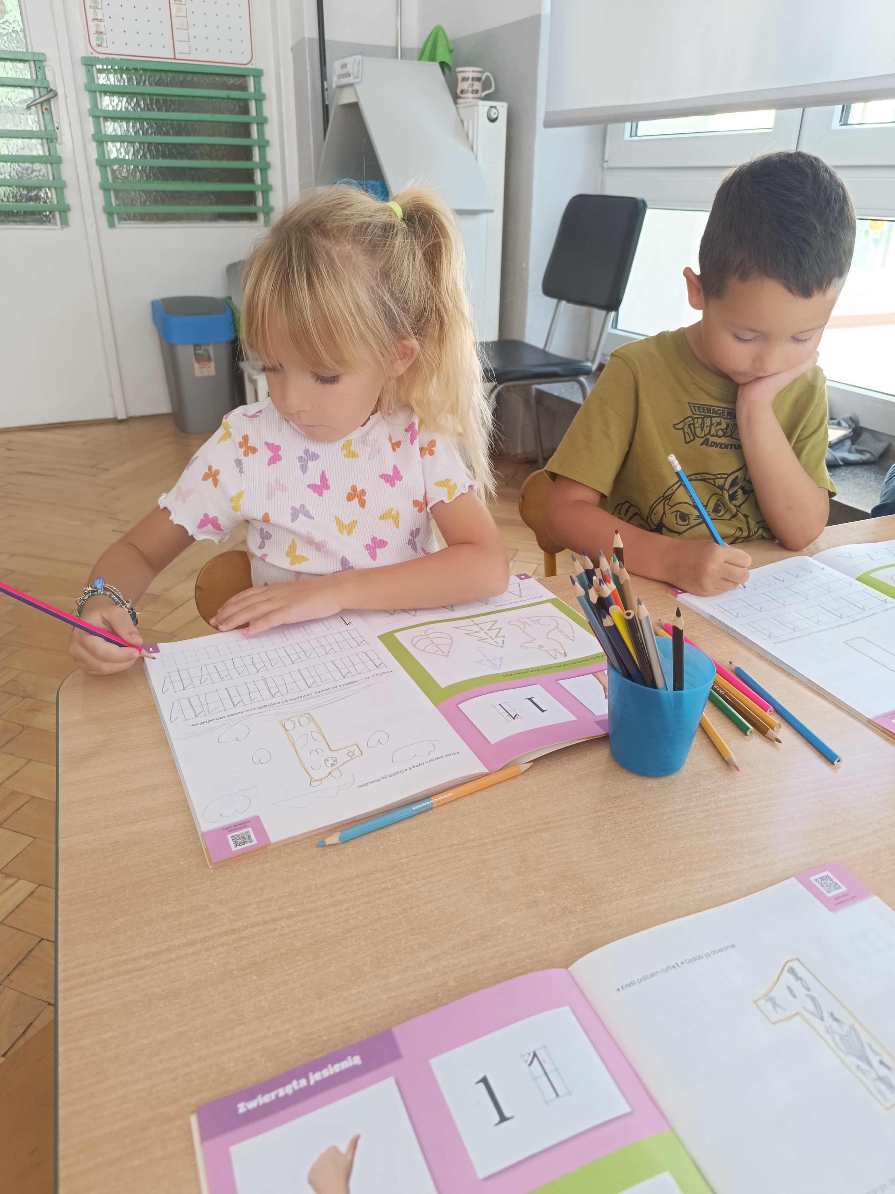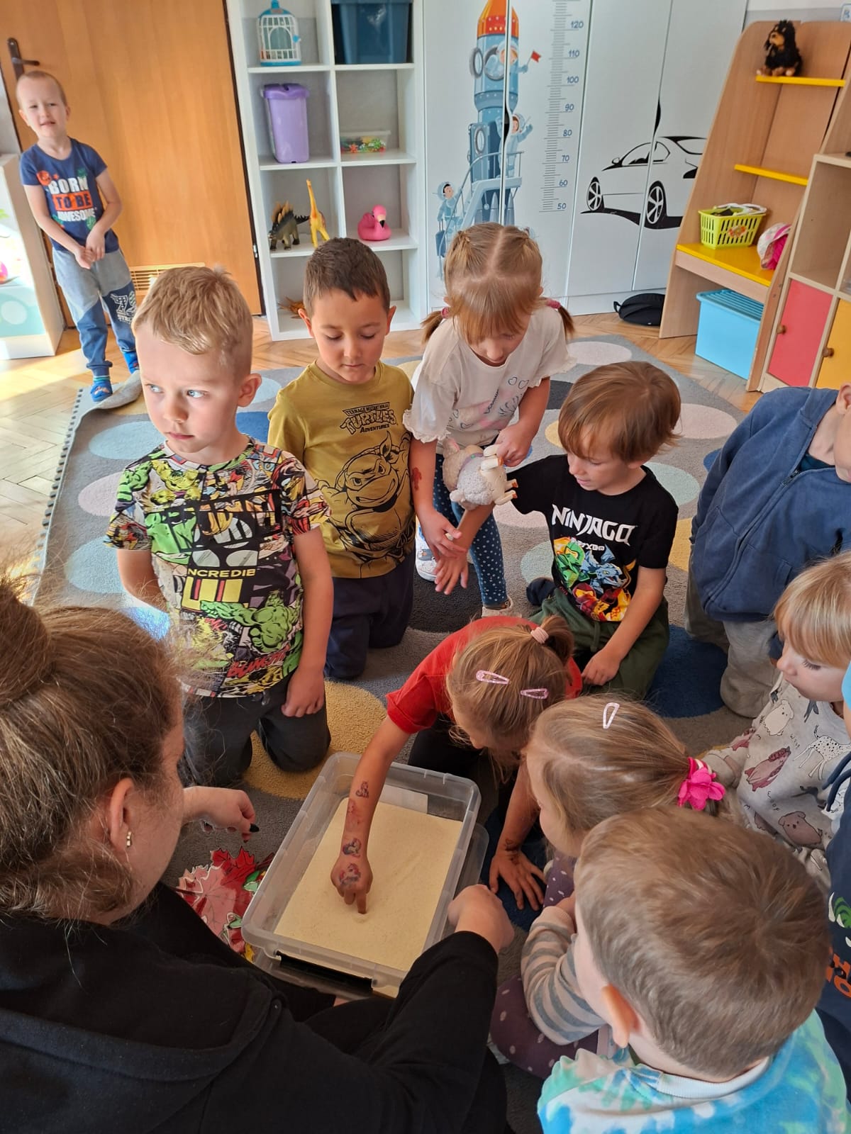 W tym tygodniu poznaliśmy literkę A, a ( pisaną i drukowaną) oraz cyferkę 1 wykonując z nimi ćwiczenia grafomotoryczne, zadania w naszych książkach, utrwalając je poprzez układanie z darów jesieni oraz pisząc w kaszy manny. Przeliczaliśmy również liście, rzucając kostką.