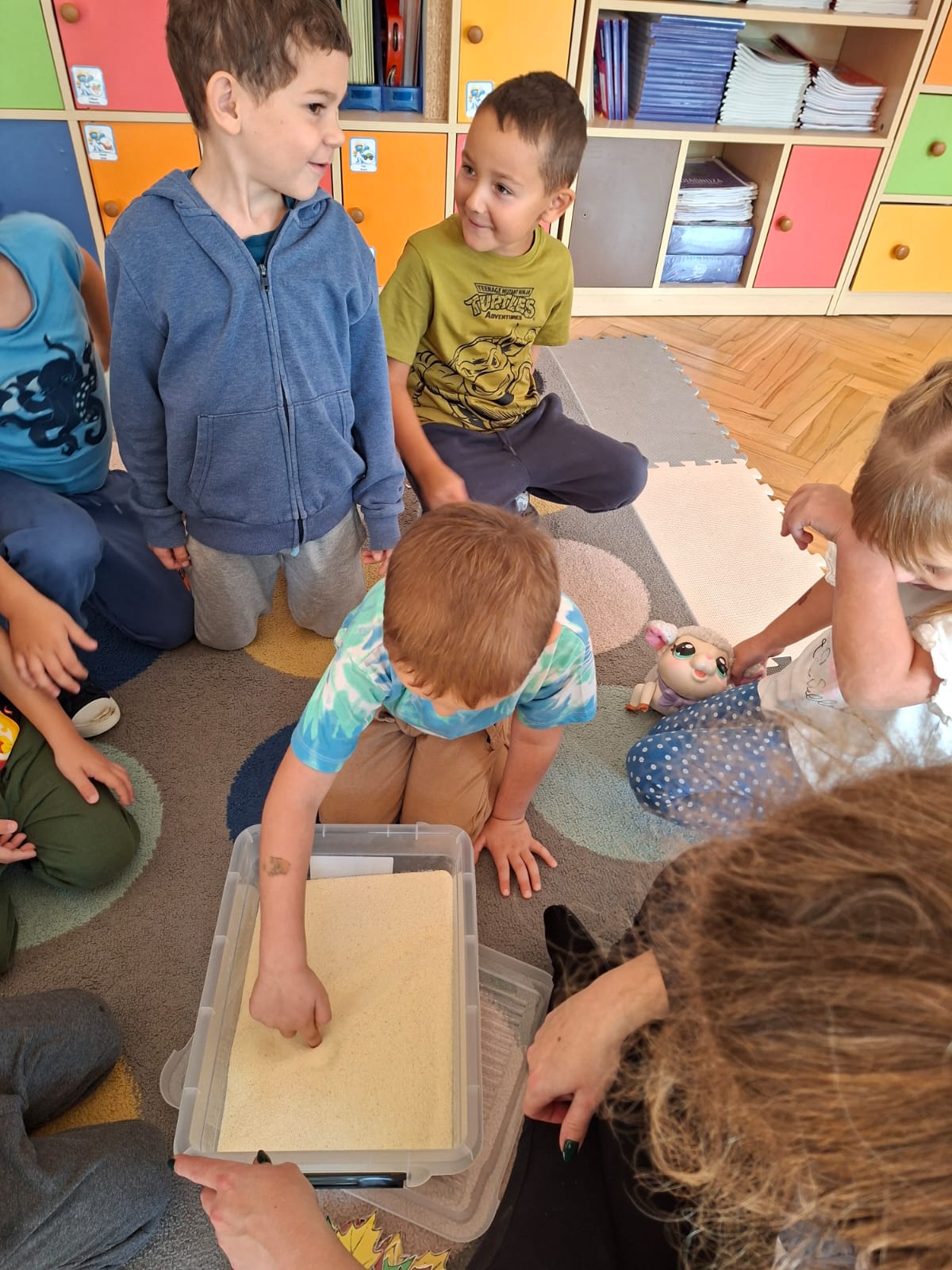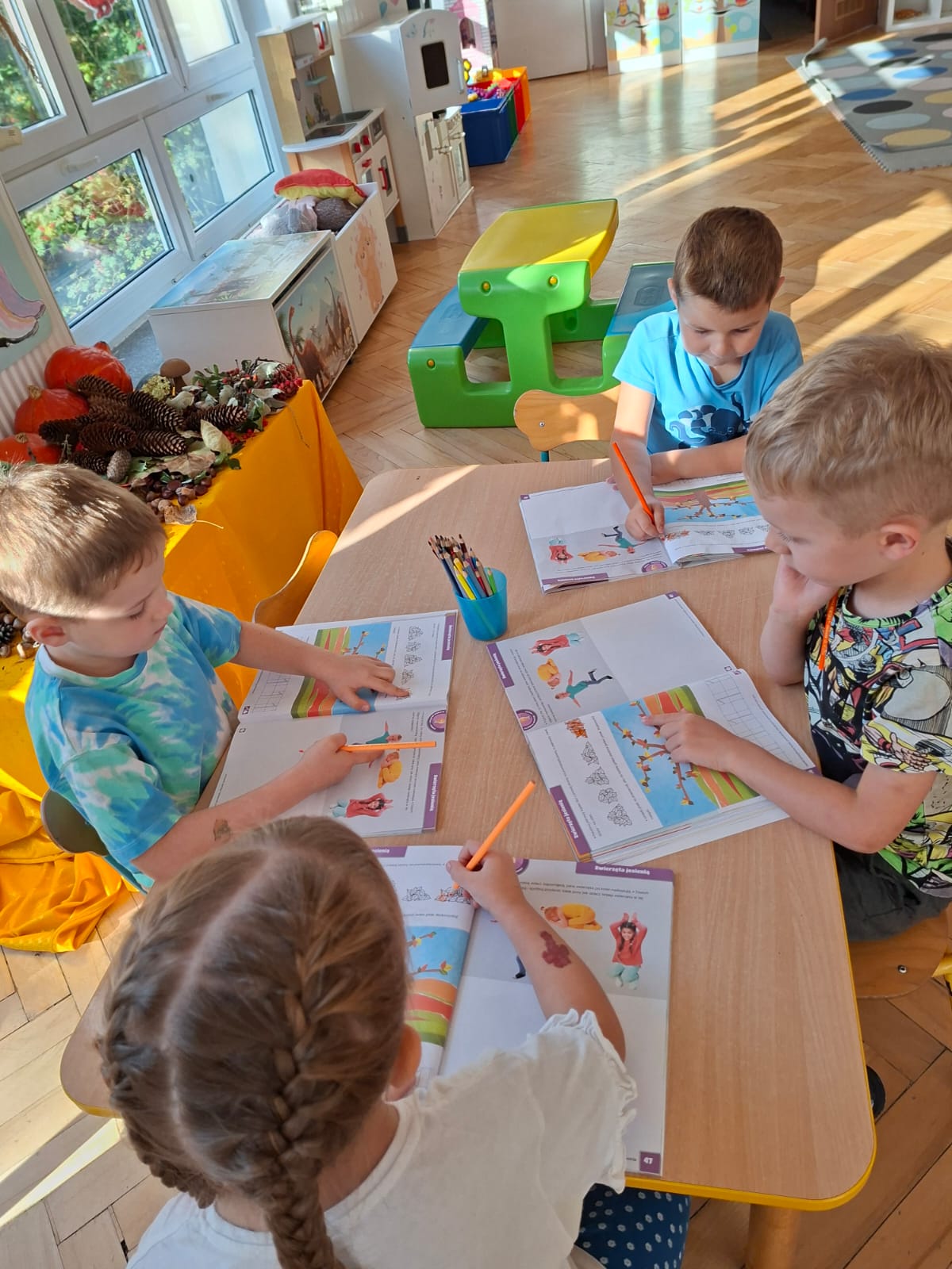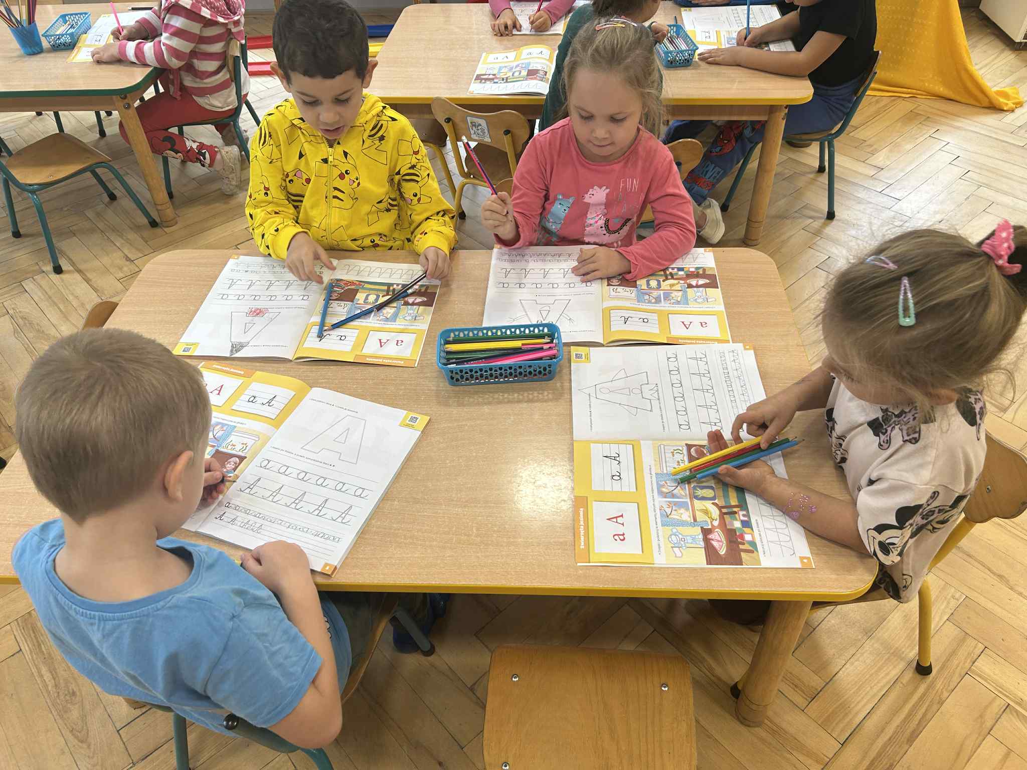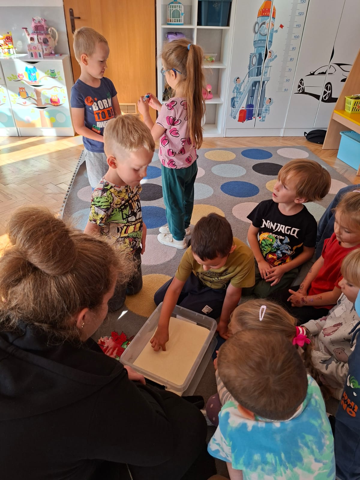 W tym tygodniu poznaliśmy literkę A, a ( pisaną i drukowaną) oraz cyferkę 1 wykonując z nimi ćwiczenia grafomotoryczne, zadania w naszych książkach, utrwalając je poprzez układanie z darów jesieni oraz pisząc w kaszy manny. Przeliczaliśmy również liście, rzucając kostką.