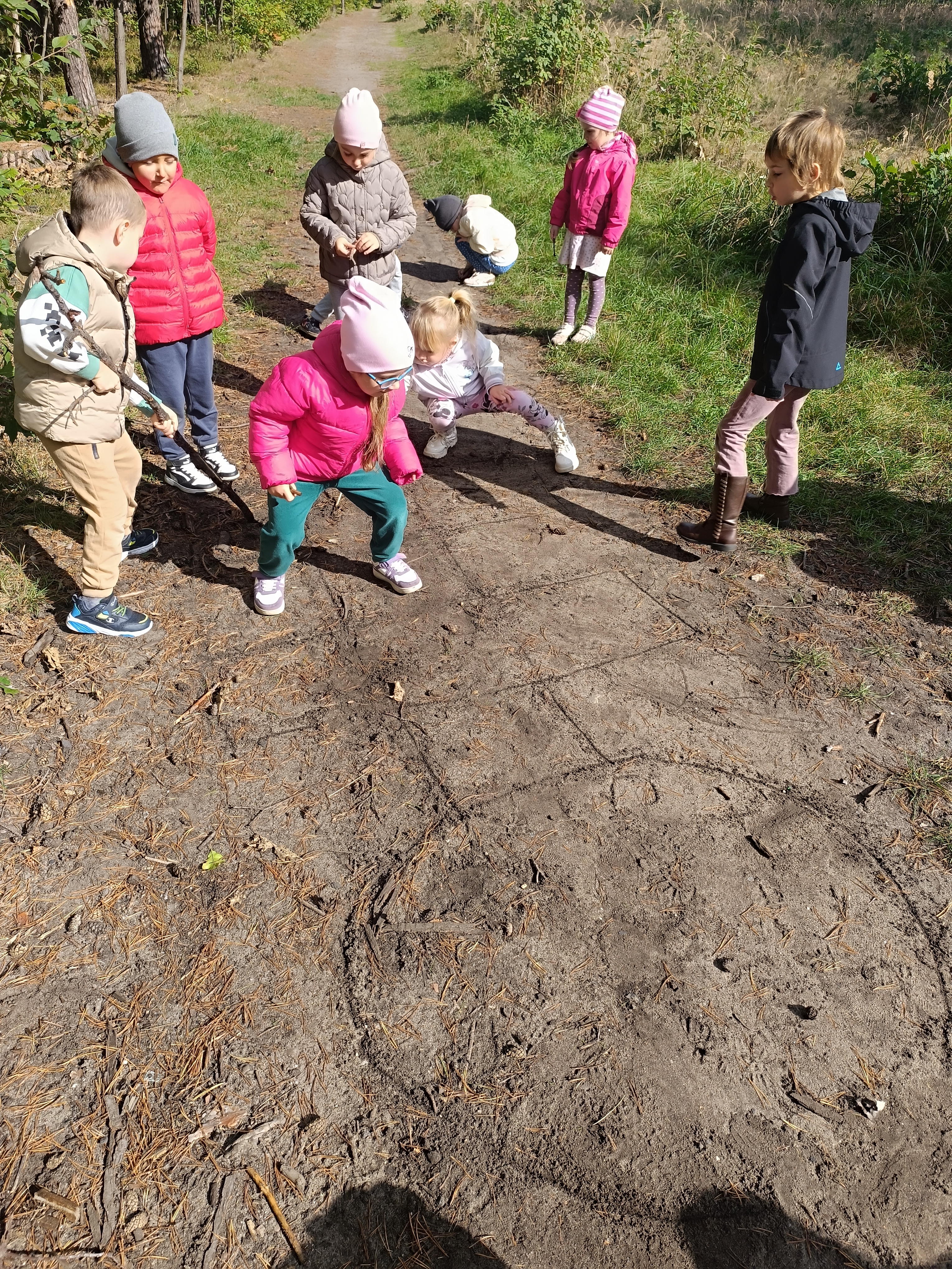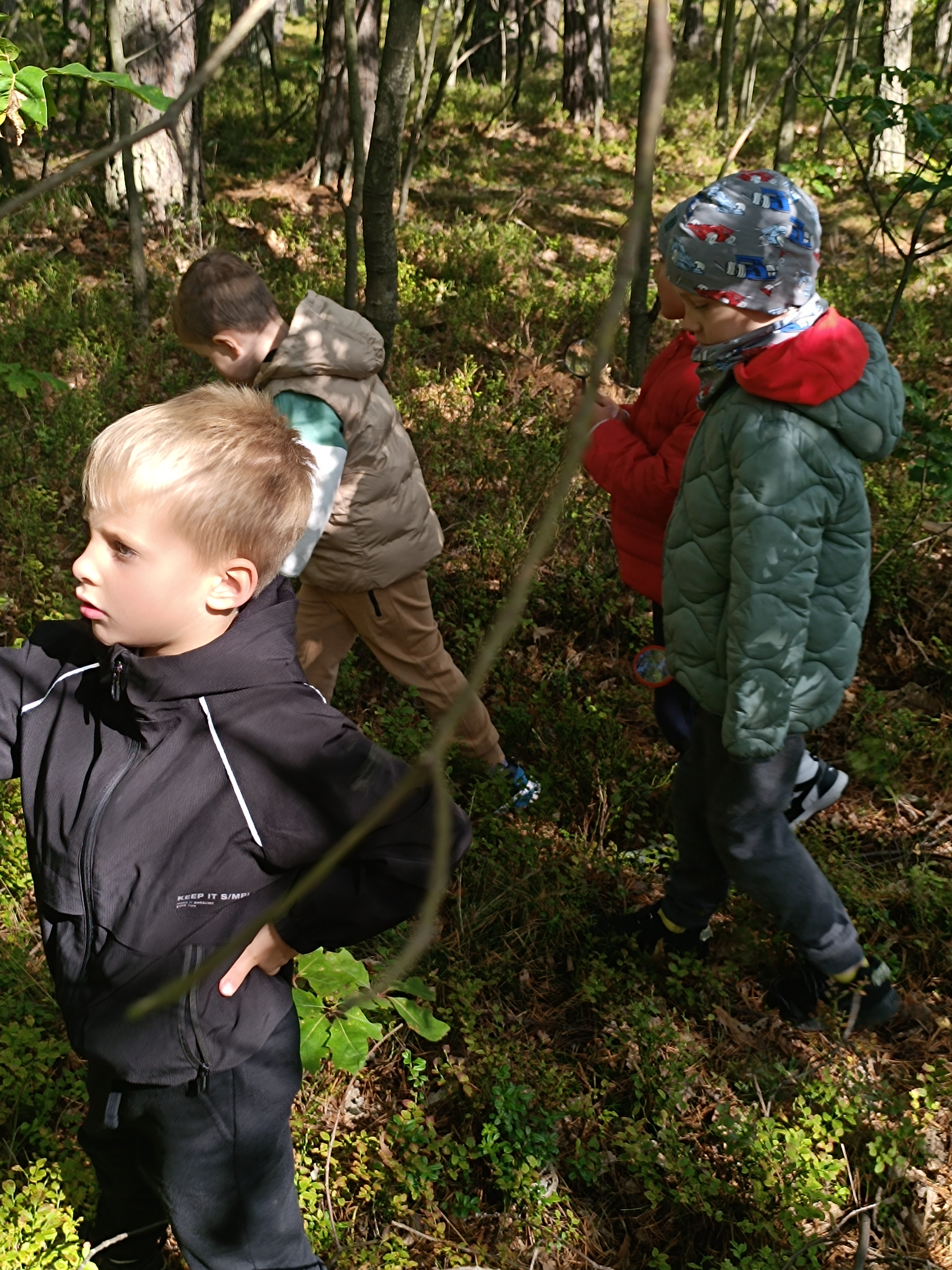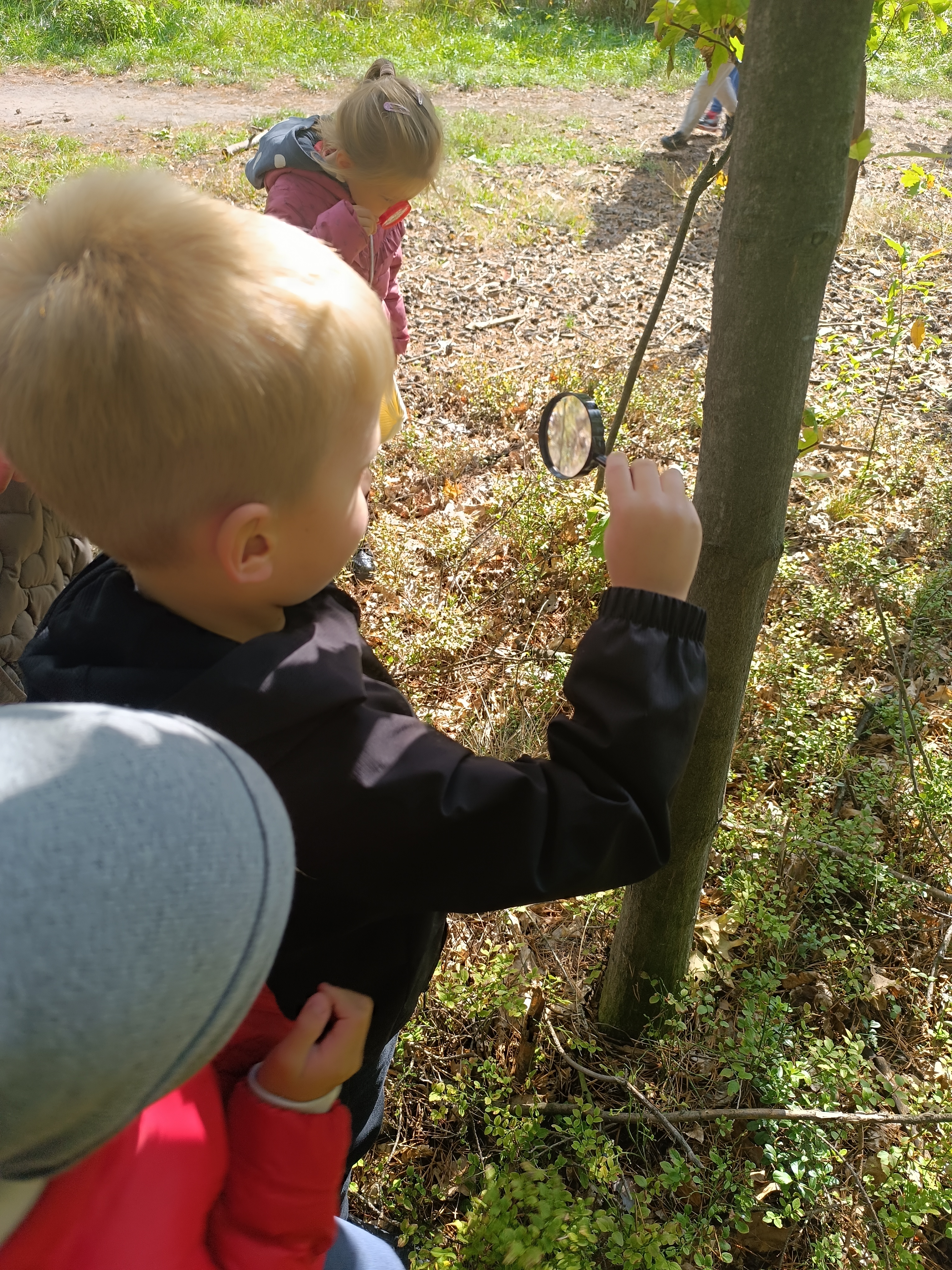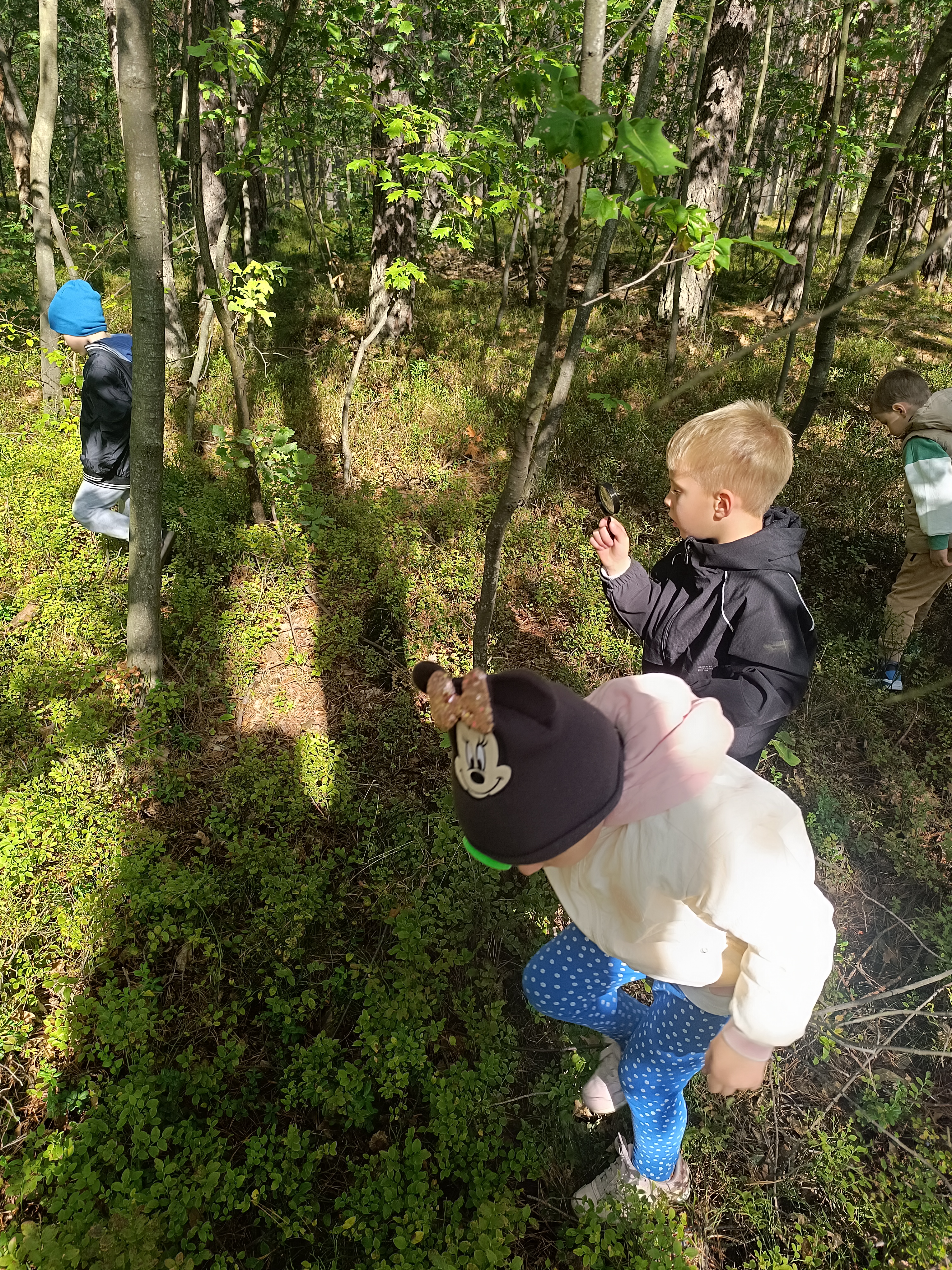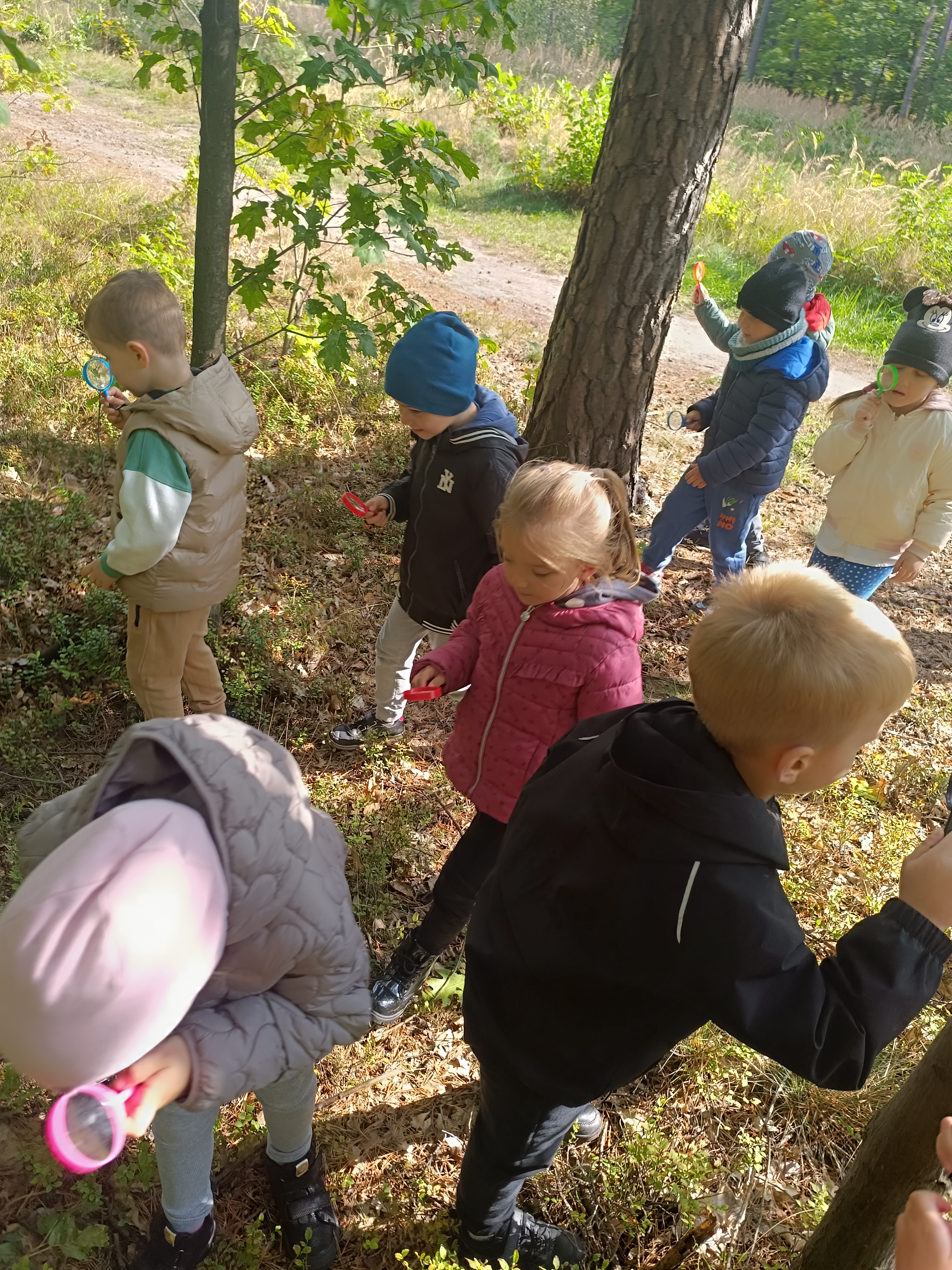 W tym tygodniu nie zabrakło wyjść na spacery do lasu i na plac zabaw. Idąc na spacer do lasu wzięliśmy z sobą lupy, obserwując z bliska liście, kore drzew, szyszki.