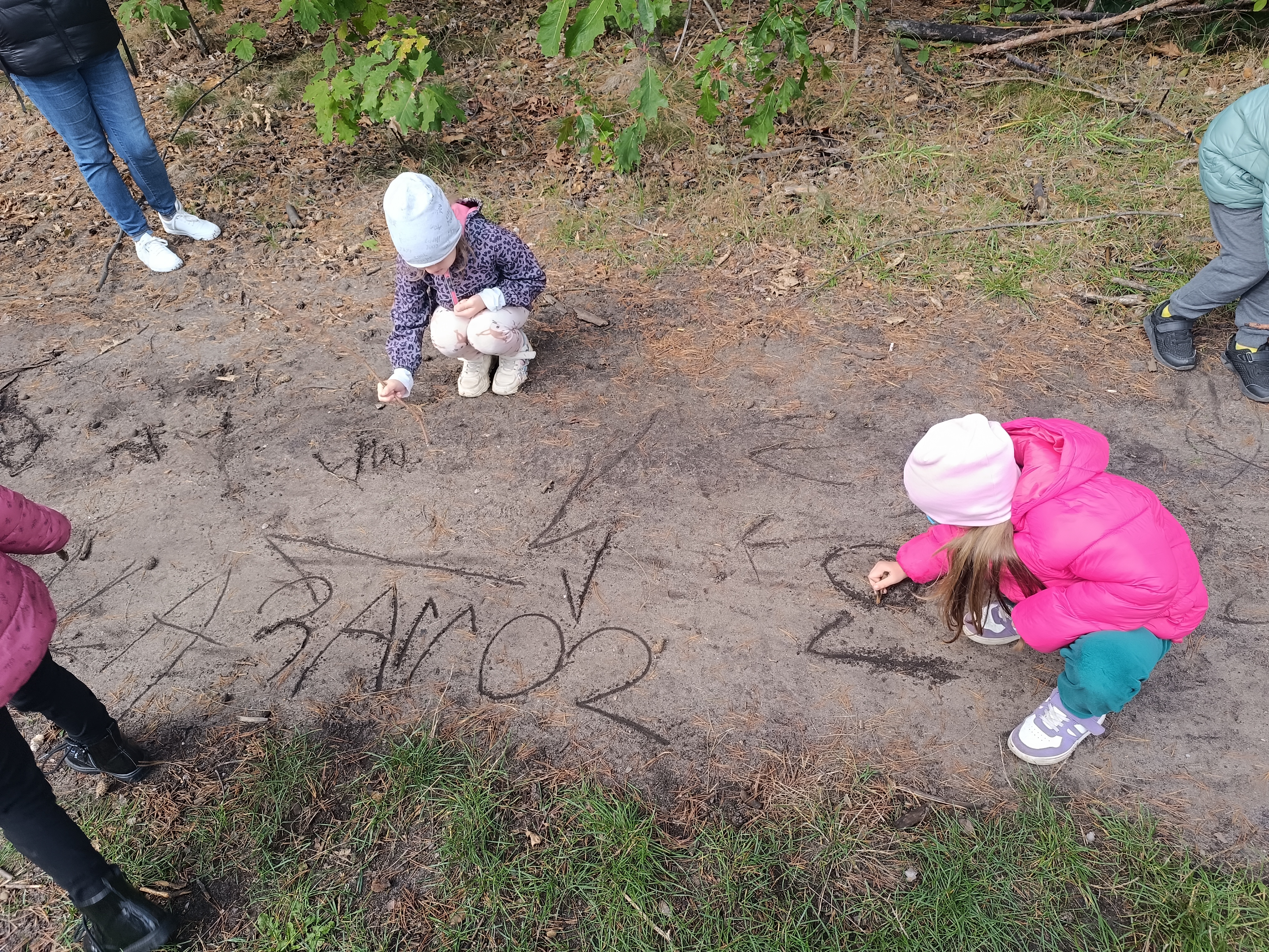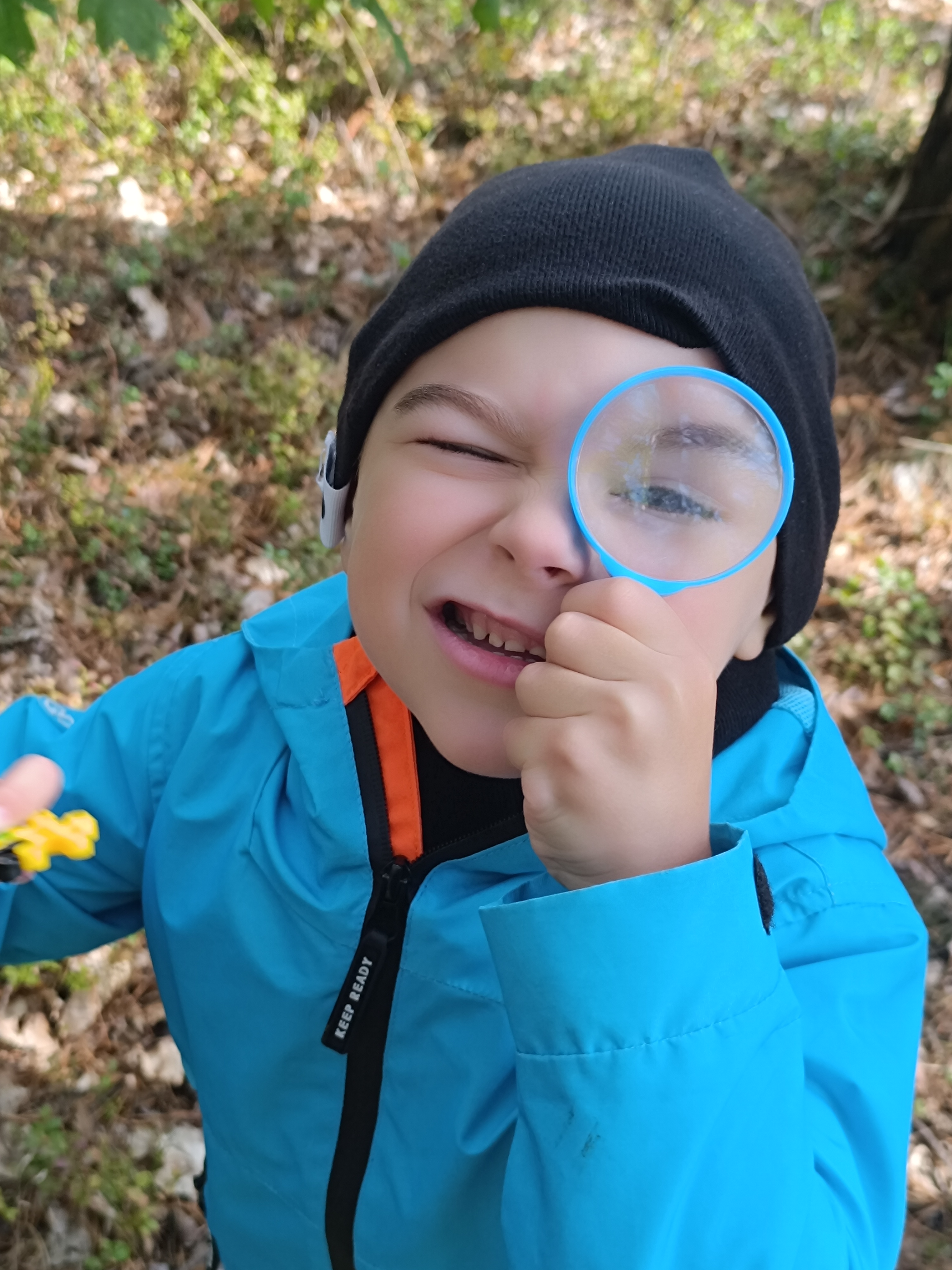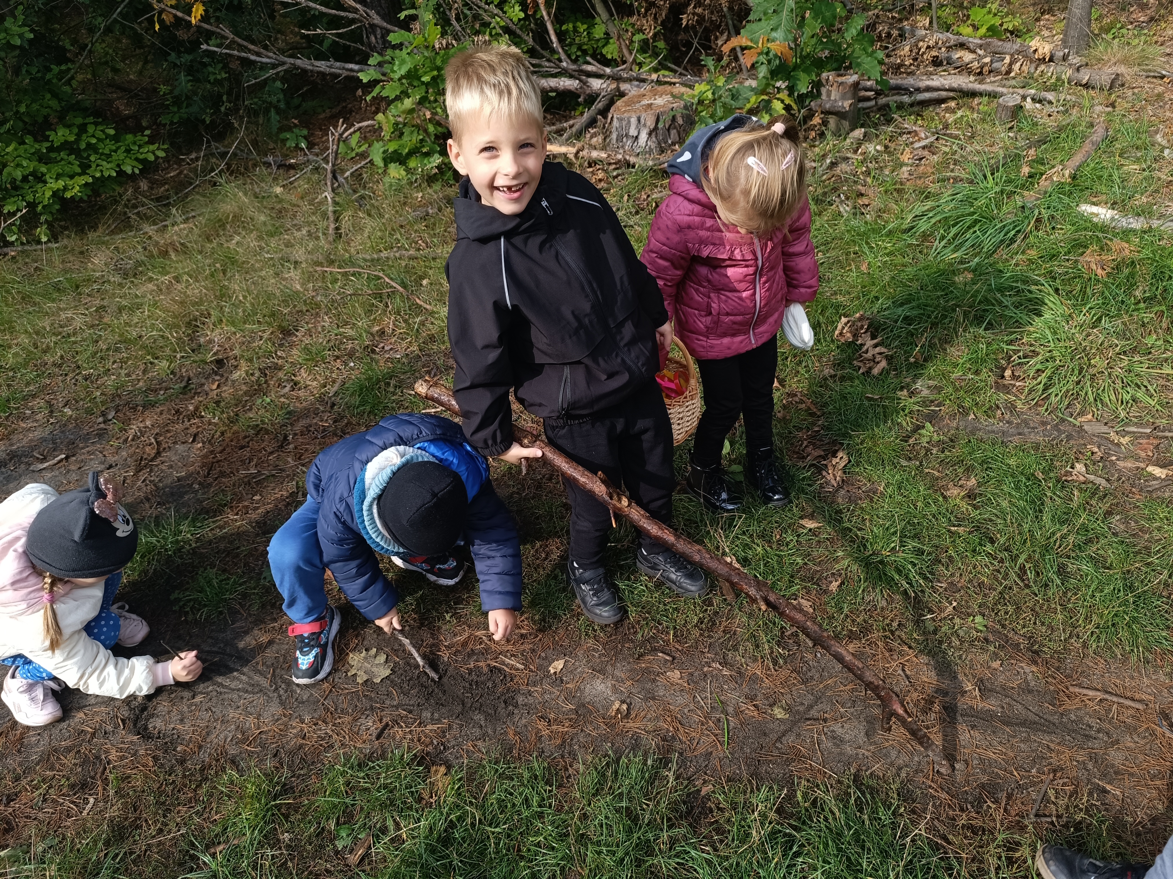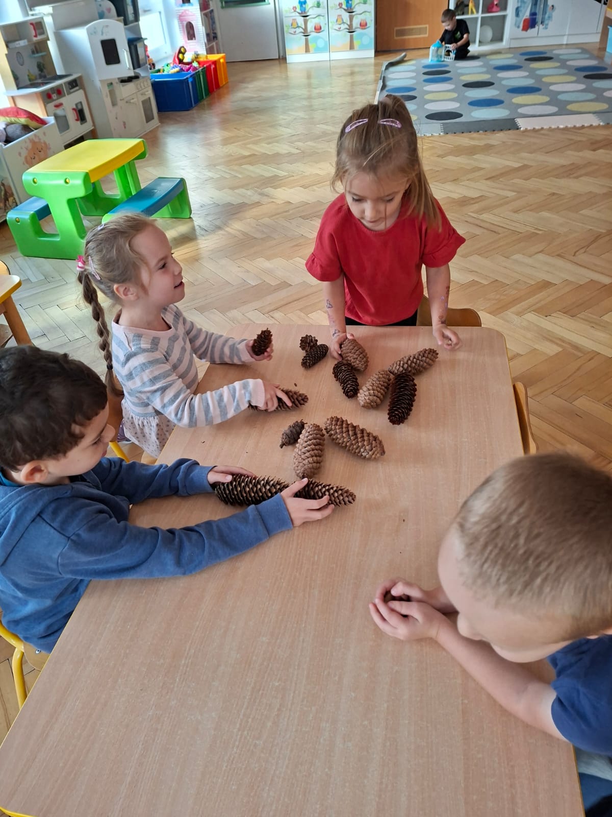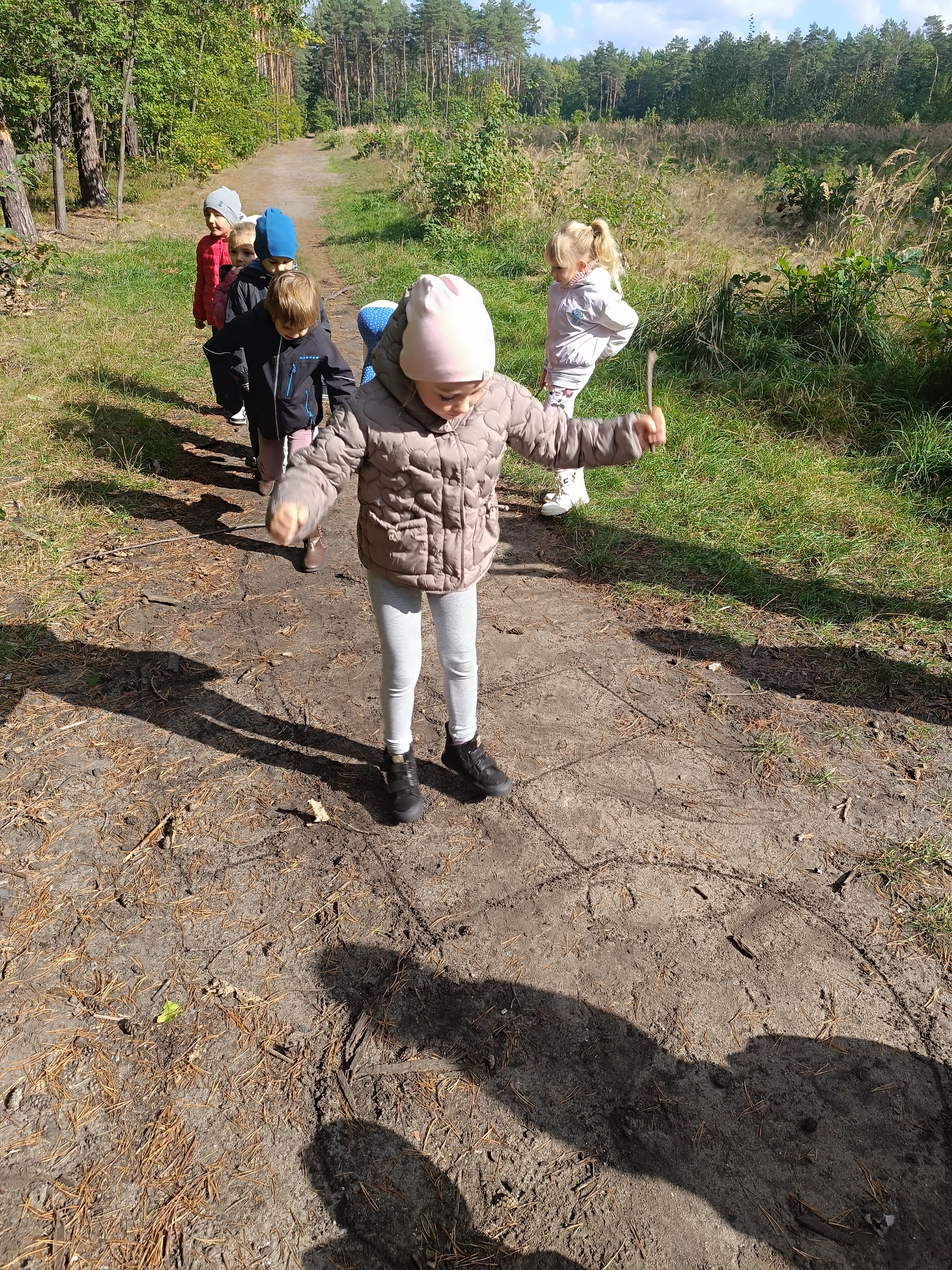 W tym tygodniu nie zabrakło wyjść na spacery do lasu i na plac zabaw. Idąc na spacer do lasu wzięliśmy z sobą lupy, obserwując z bliska liście, kore drzew, szyszki.