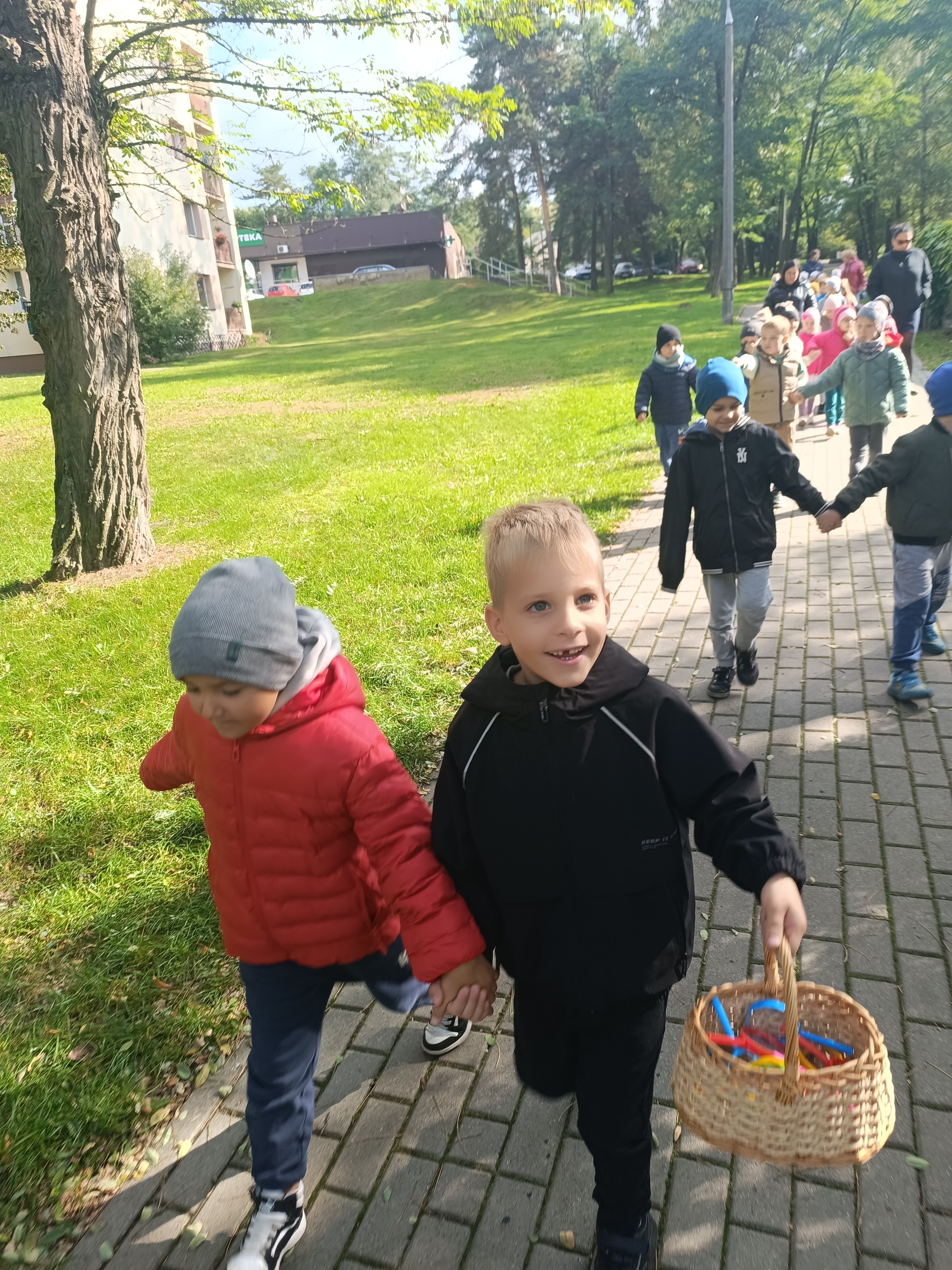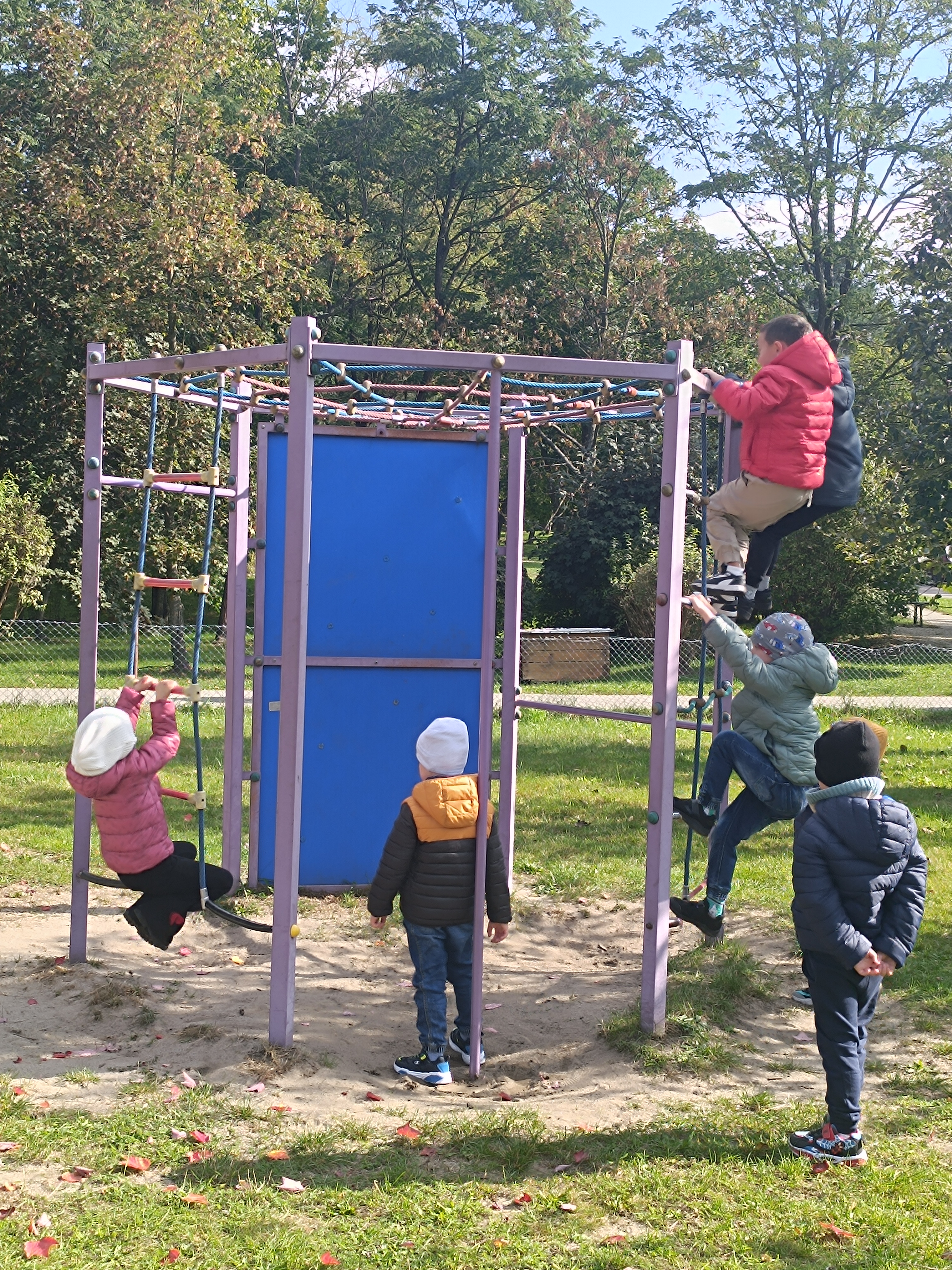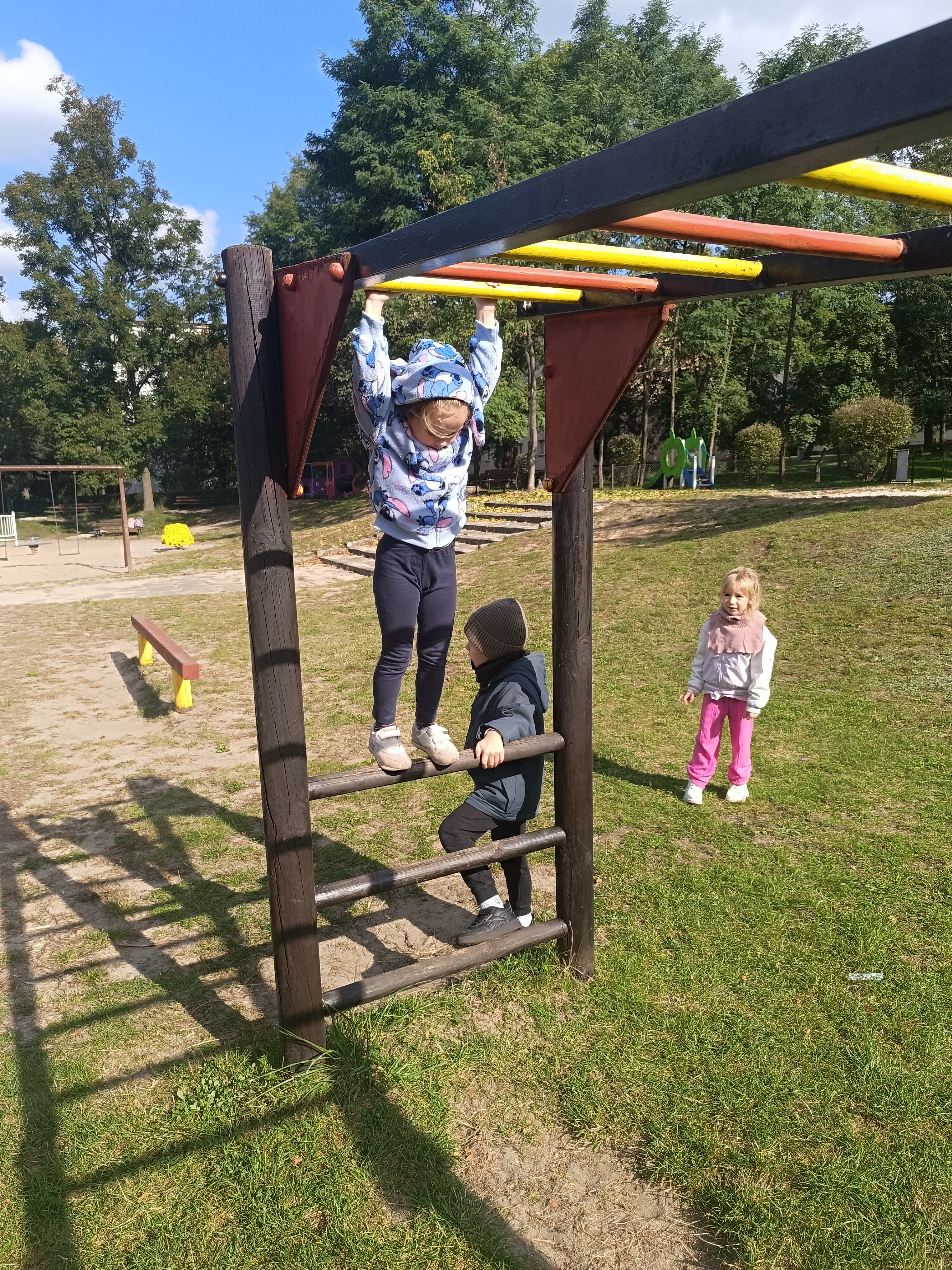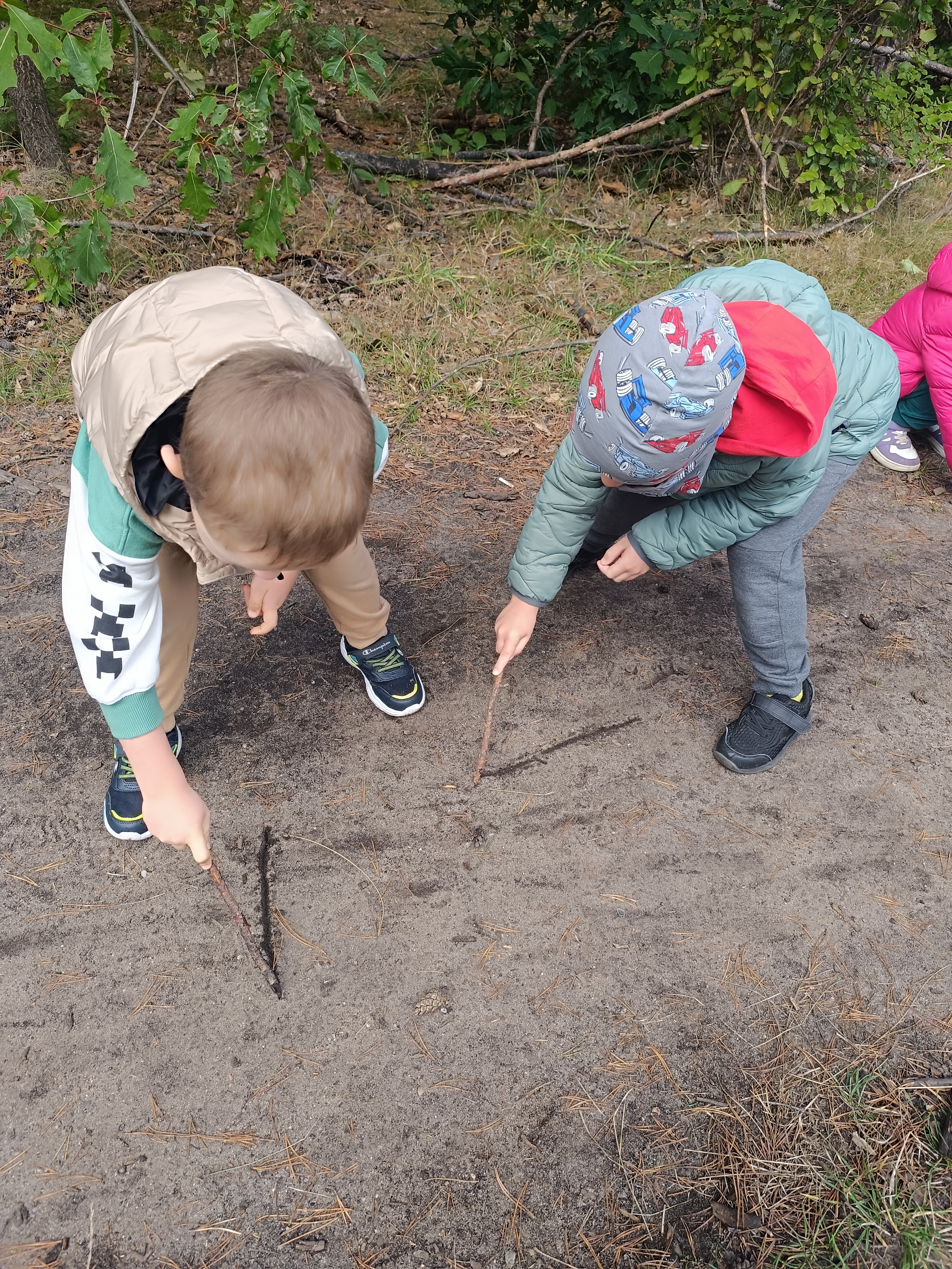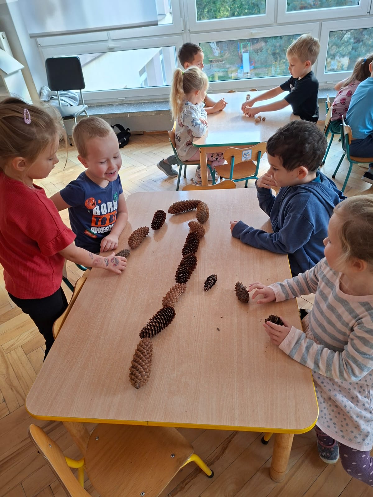 W tym tygodniu nie zabrakło wyjść na spacery do lasu i na plac zabaw. Idąc na spacer do lasu wzięliśmy z sobą lupy, obserwując z bliska liście, kore drzew, szyszki.